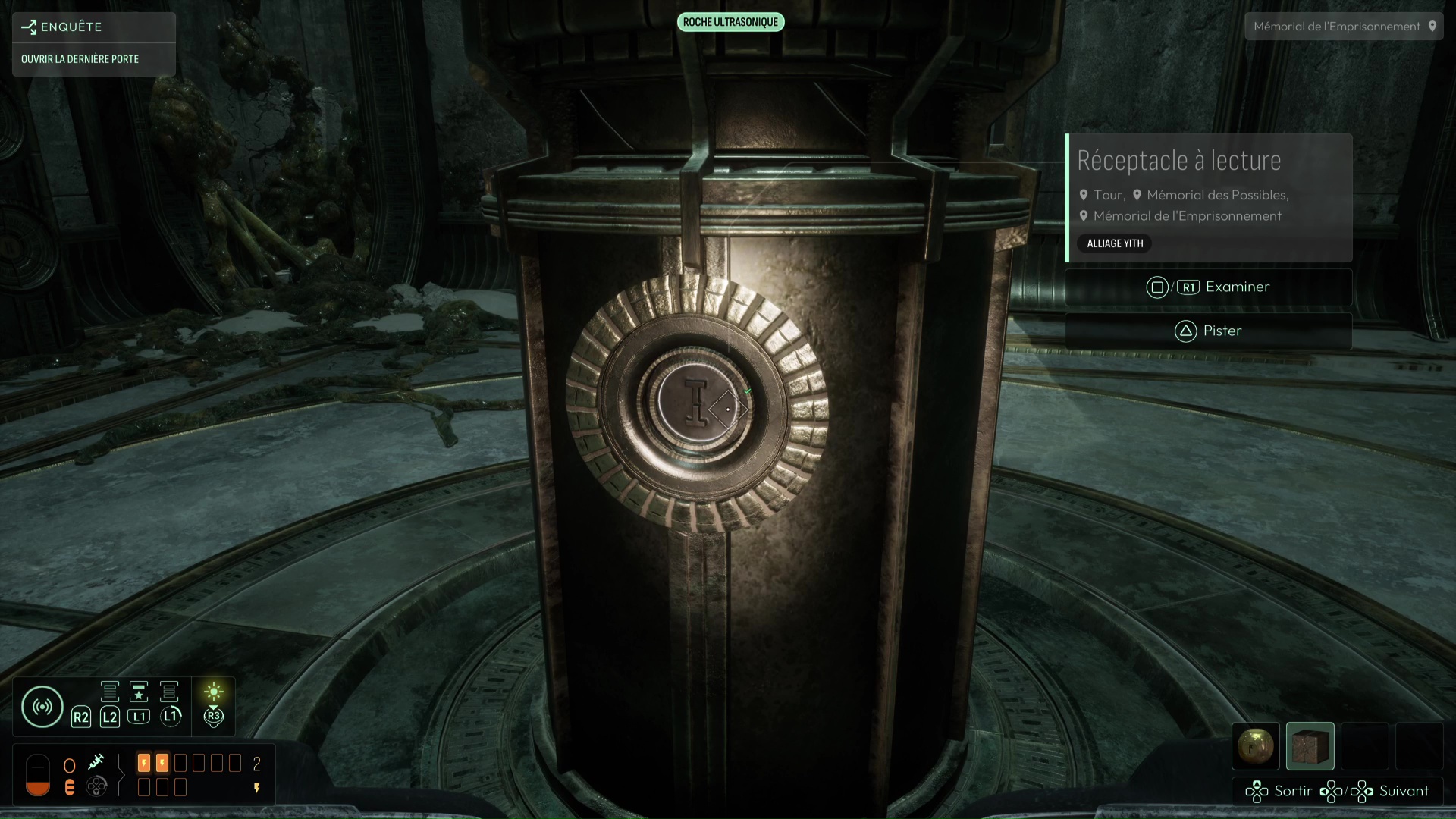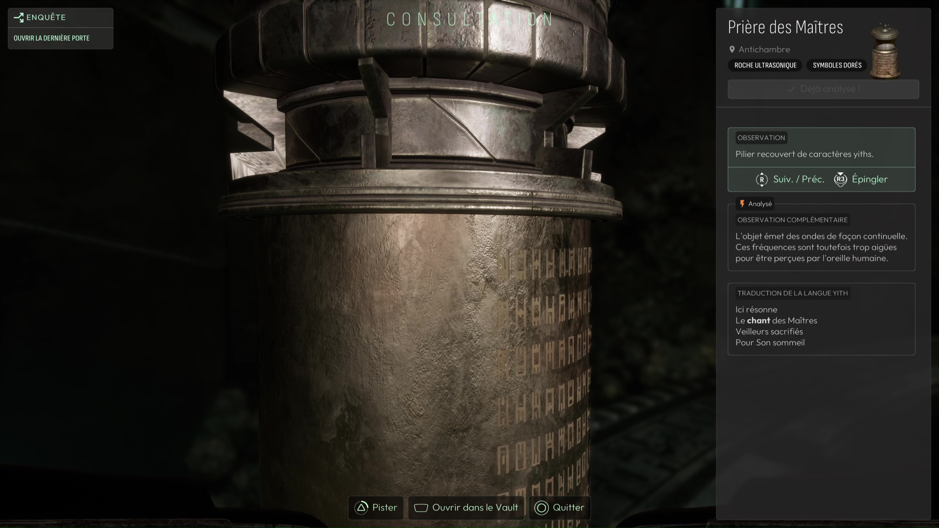 Examinez tous les indices de cette vision « Reconstitution : L’Emprisonnement » grâce à vos différentes fréquences, et notamment l’une des stèles qui vous permet de débloquer l’interrogation « Comment déverrouiller la porte ? ». Récupérez l’Étoile de Shamash pour retourner dans le monde réel, puis remontez au niveau des Prières pour emprunter le second escalier descendant afin de retrouver une nouvelle pièce (Mémorial des Possibles) vous proposant, grâce à son pilier central, d’assister à une autre vision du passé des Yith.