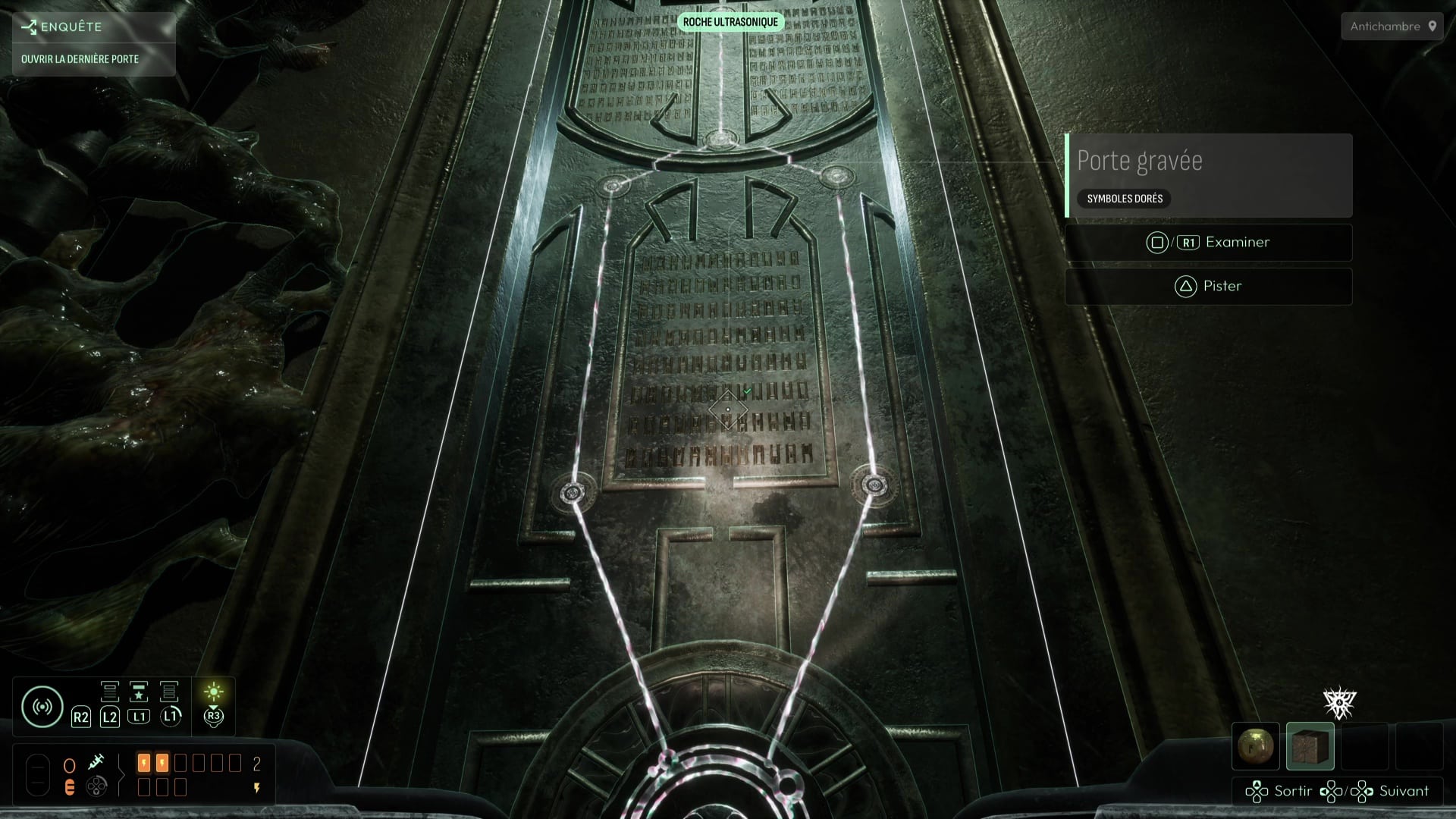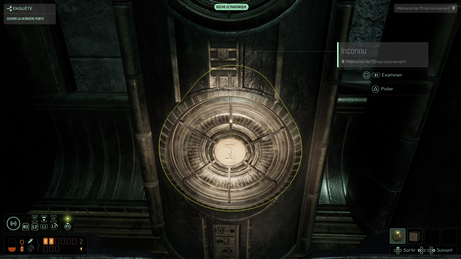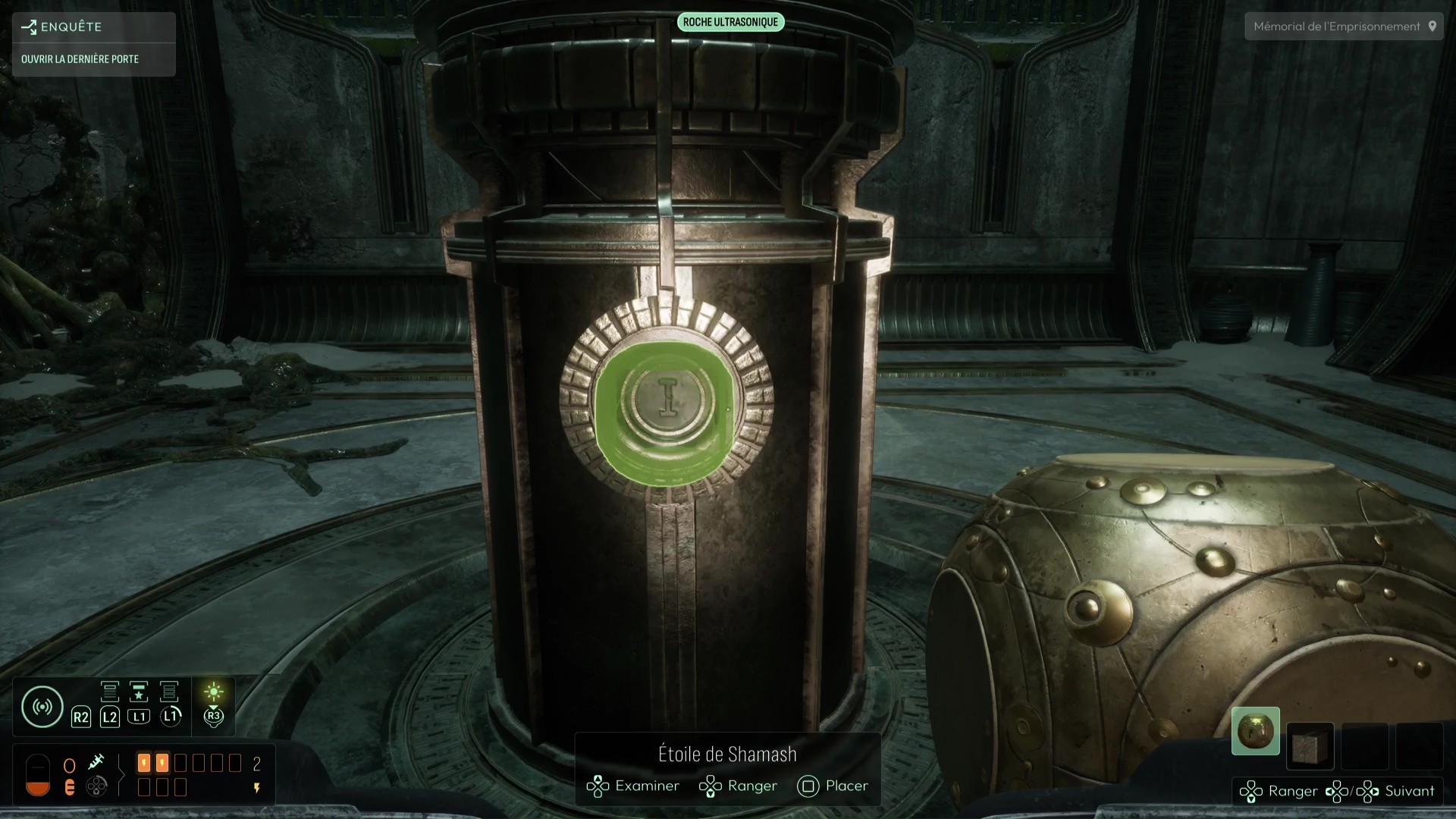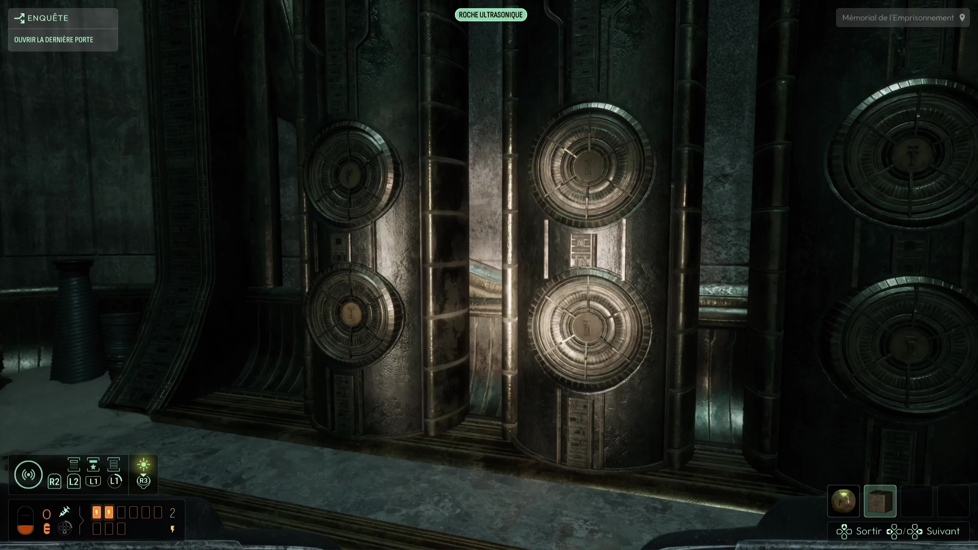 Cependant, la porte est fermée. En l’analysant, celle-ci vous parle d’un « chant » qui pourrait l’ouvrir. Si vous avez bien lu tout ce que vous disaient les Prières de l’étage supérieur, vous avez pu constater que la « Prière des Maîtres » mentionnait ce même chant et que son analyse vous a permis de débloquer la fréquence « Roche ultrasonique » sur votre sonar. Utilisez votre sonar à proximité de la porte en équipant cette fréquence pour ouvrir cette salle, le Mémorial de l’Emprisonnement. Vous repérez dans cette salle un pilier central mais également de nombreux réceptacles aux différentes gravures que vous pourrez appliquer à volonté sur toutes les faces de l’Étoile de Shamash en fin d’enquête.