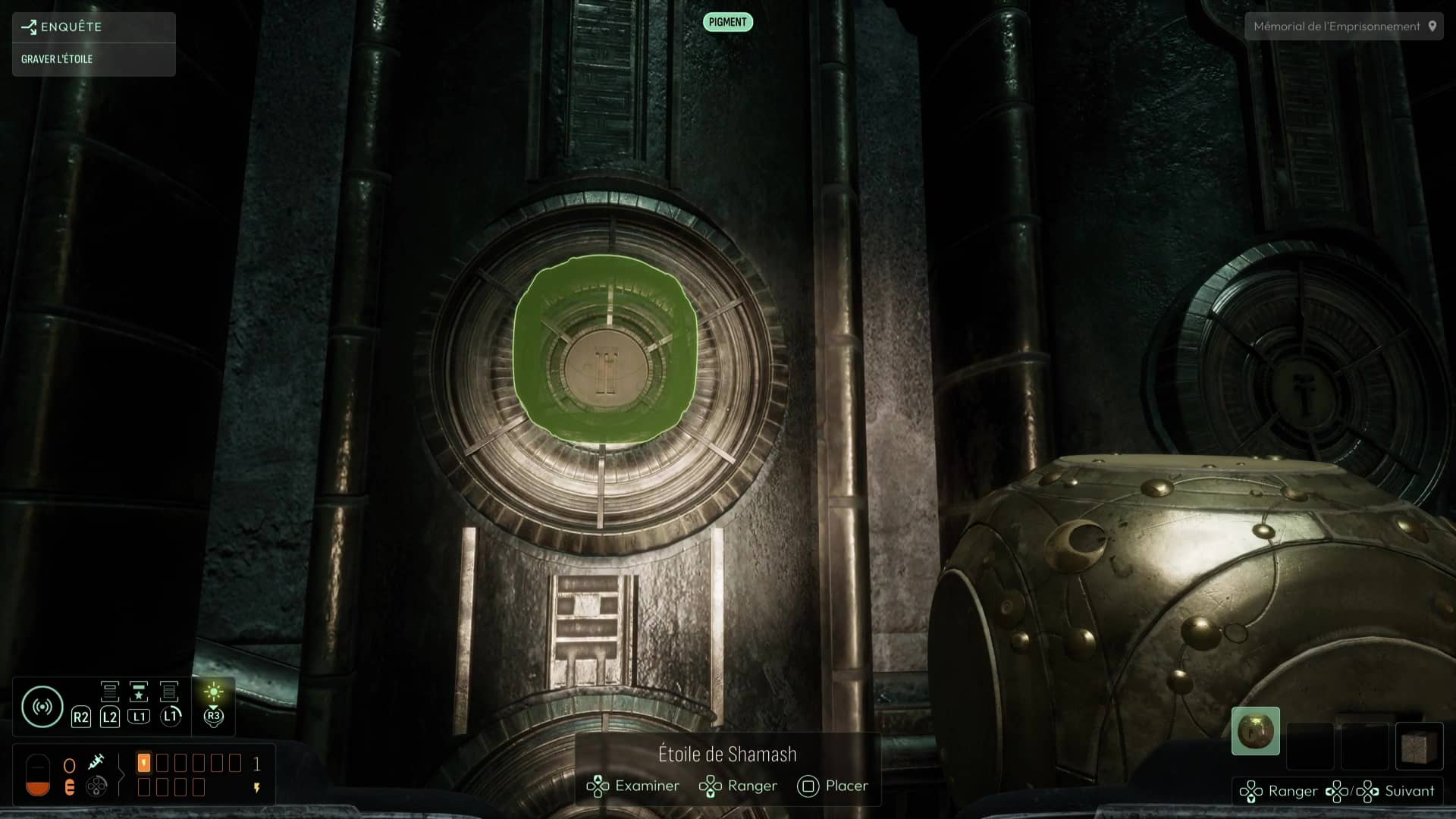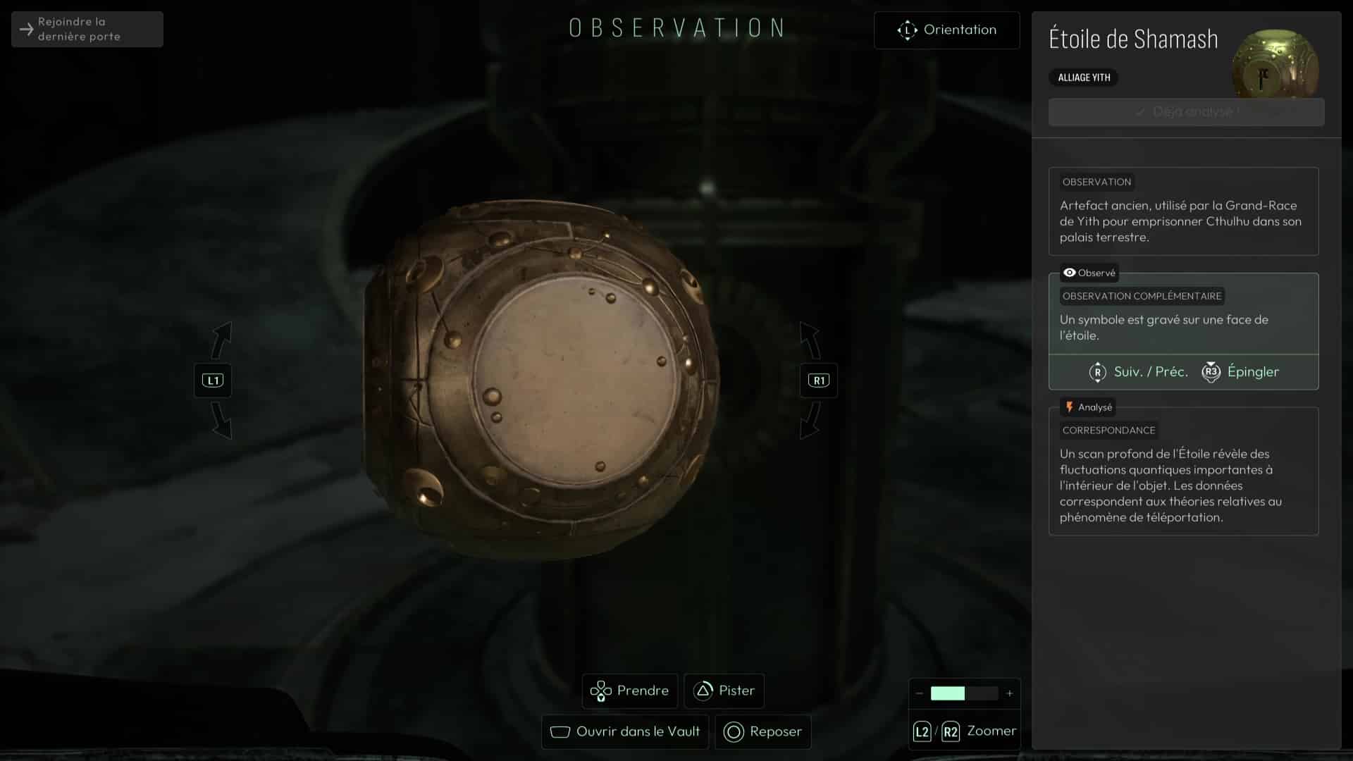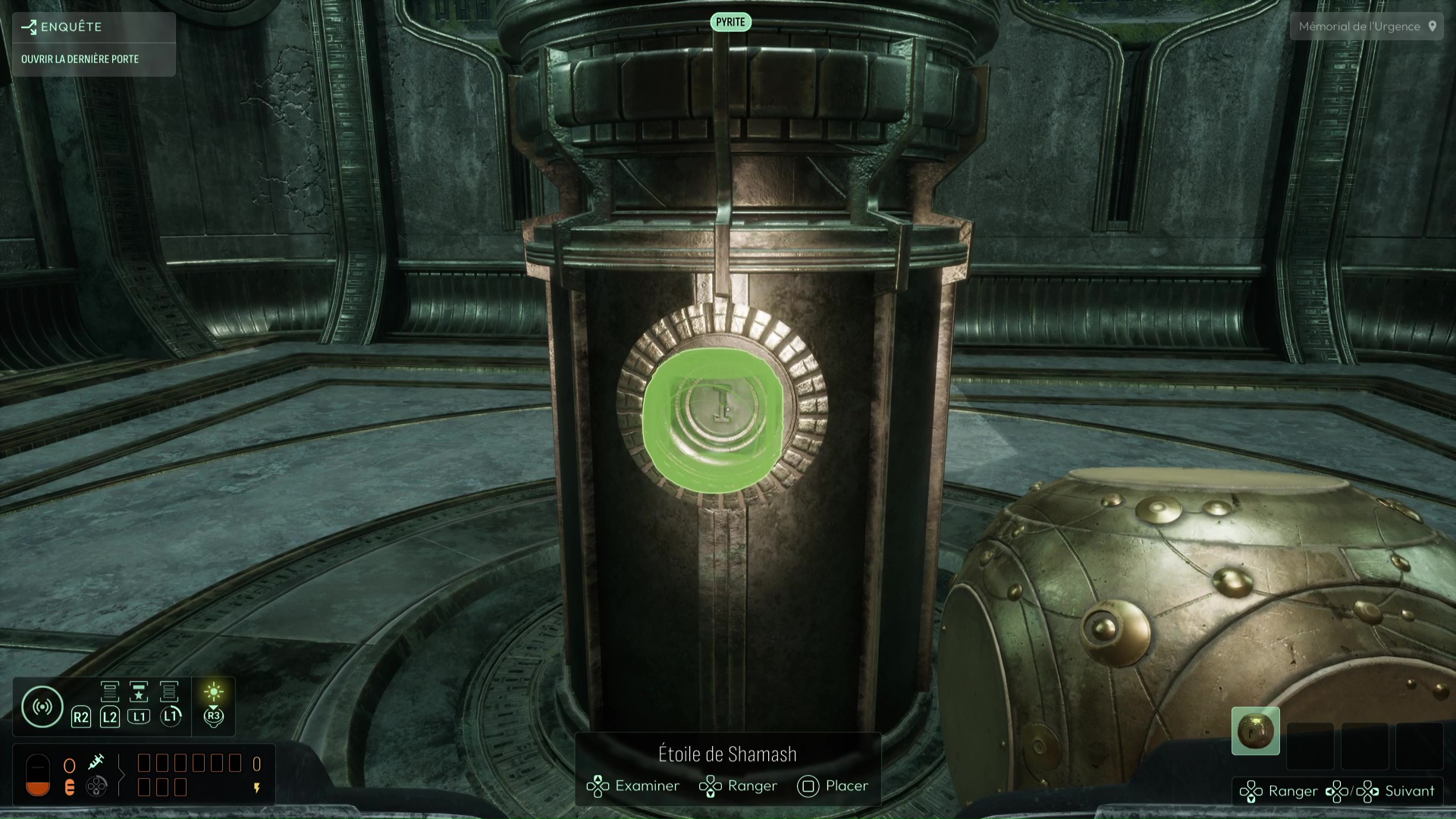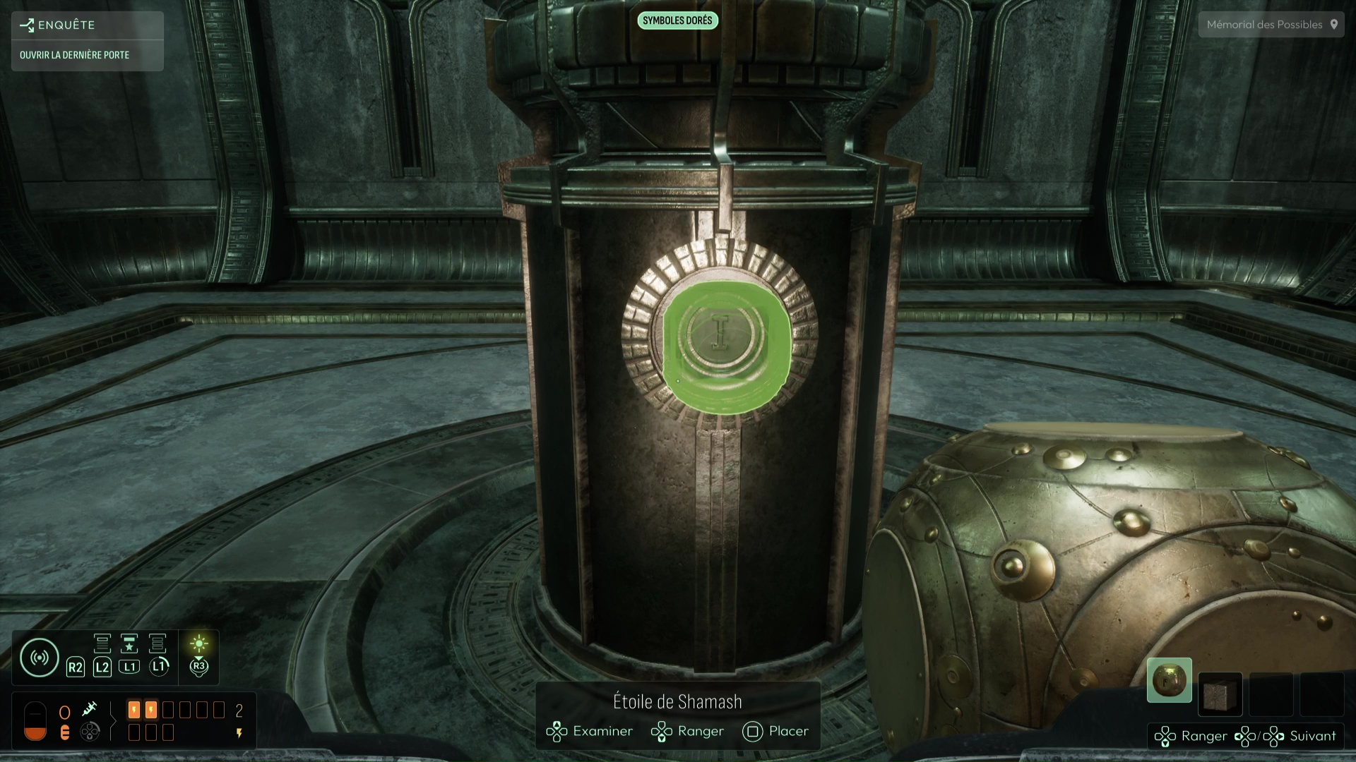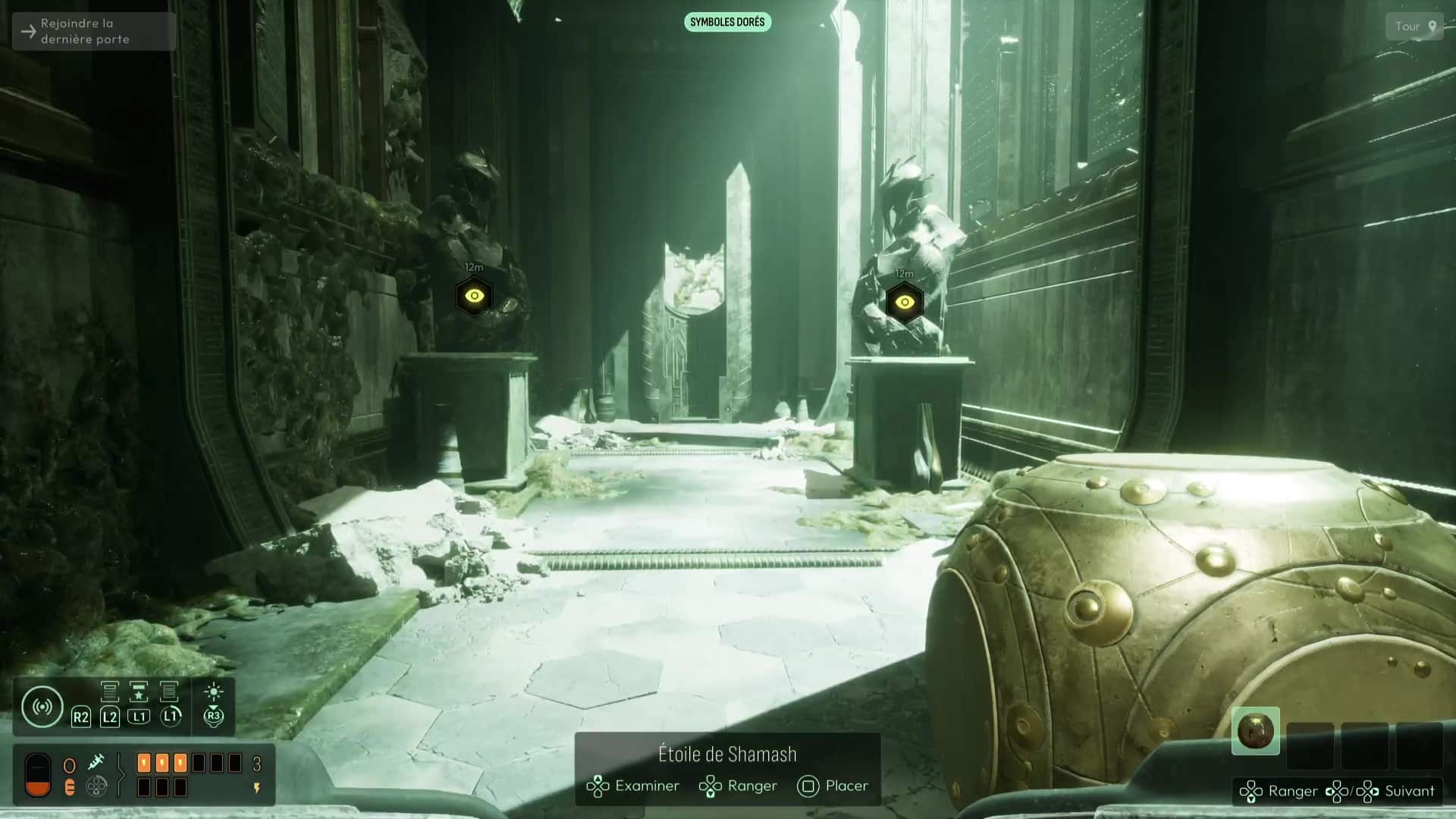 Au commencement du chapitre, inspectez les différents éléments de la pièce puis repérez la présence d’un réceptacle sur le côté du pilier central. Équipez-vous de votre Étoile de Shamash puis faites-la tourner (dans le menu Analyser) pour que ses gravures correspondent à celles du pilier, avant de la reprendre en main. Le jeu gardera en mémoire ce mouvement et donc la face que vous avez voulu exposer, élément capital de la suite des intrigues à venir. Cela devrait suffire à alimenter le pilier et ainsi débloquer la porte derrière vous. Récupérez l’Étoile de Shamash et suivez le seul chemin possible jusqu’à la salle de la Dernière Porte.