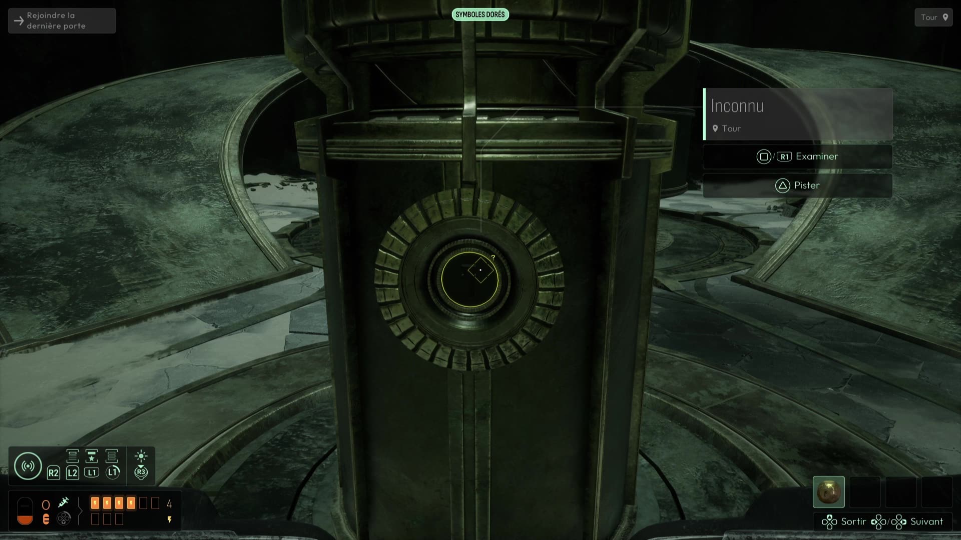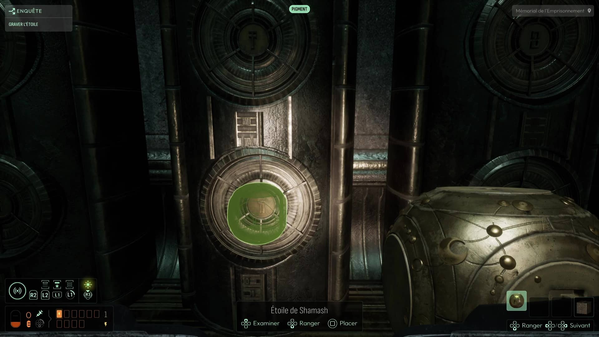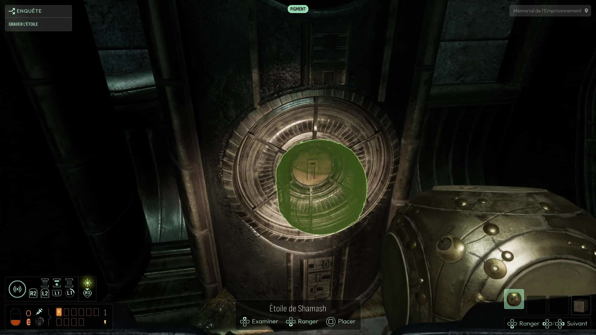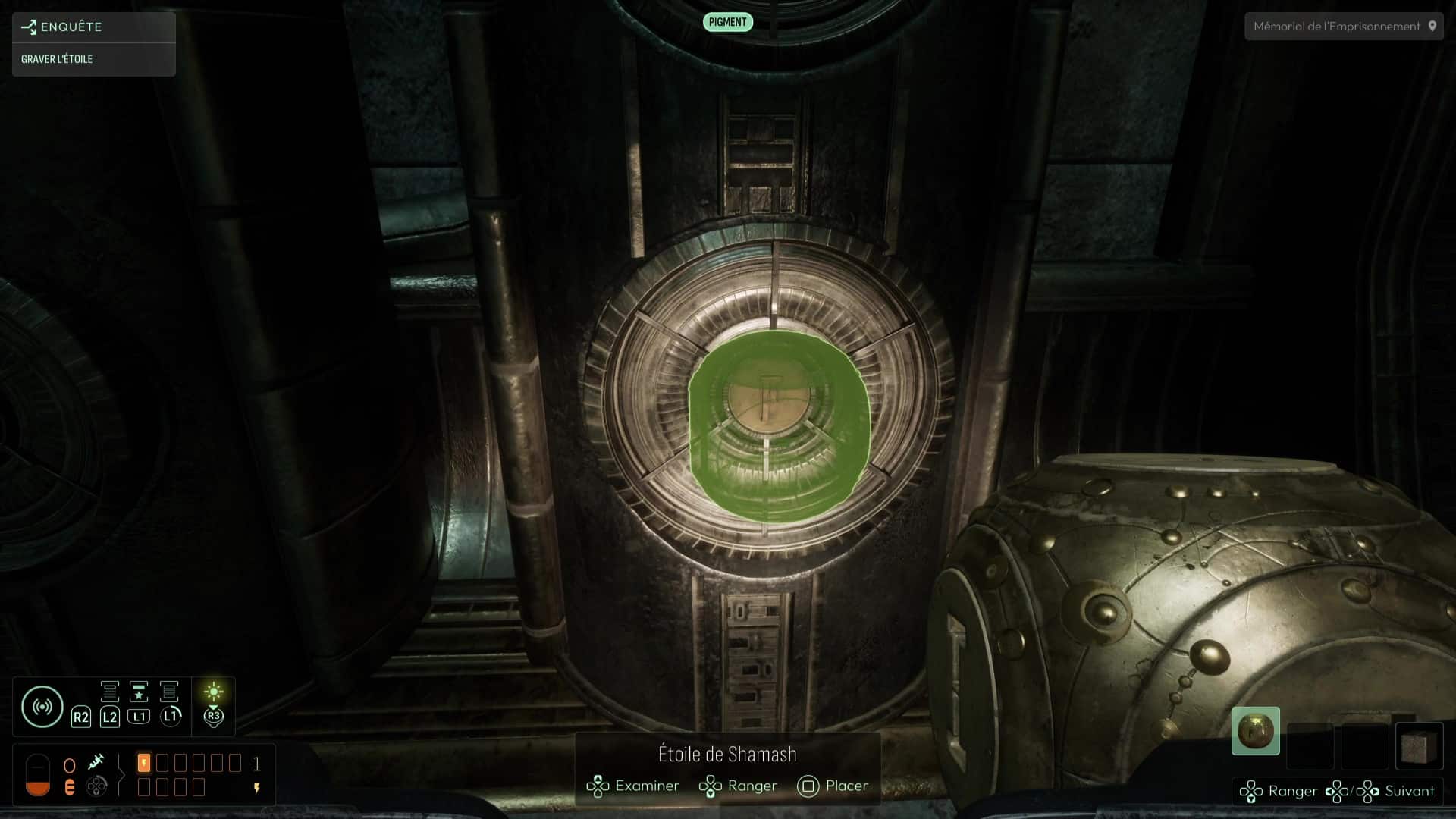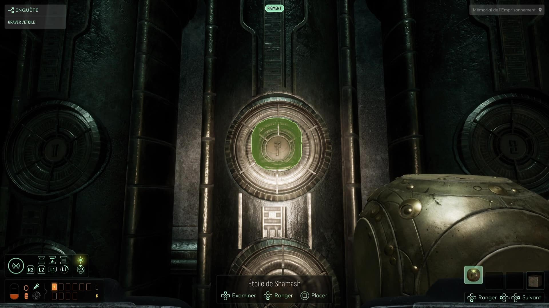 Au commencement du chapitre, inspectez les différents éléments de la pièce puis repérez la présence d’un réceptacle sur le côté du pilier central. Équipez-vous de votre Étoile de Shamash puis faites-la tourner (dans le menu Analyser) pour que ses gravures correspondent à celles du pilier, avant de la reprendre en main. Le jeu gardera en mémoire ce mouvement et donc la face que vous avez voulu exposer, élément capital de la suite des intrigues à venir. Cela devrait suffire à alimenter le pilier et ainsi débloquer la porte derrière vous. Récupérez l’Étoile de Shamash et suivez le seul chemin possible jusqu’à la salle de la Dernière Porte.