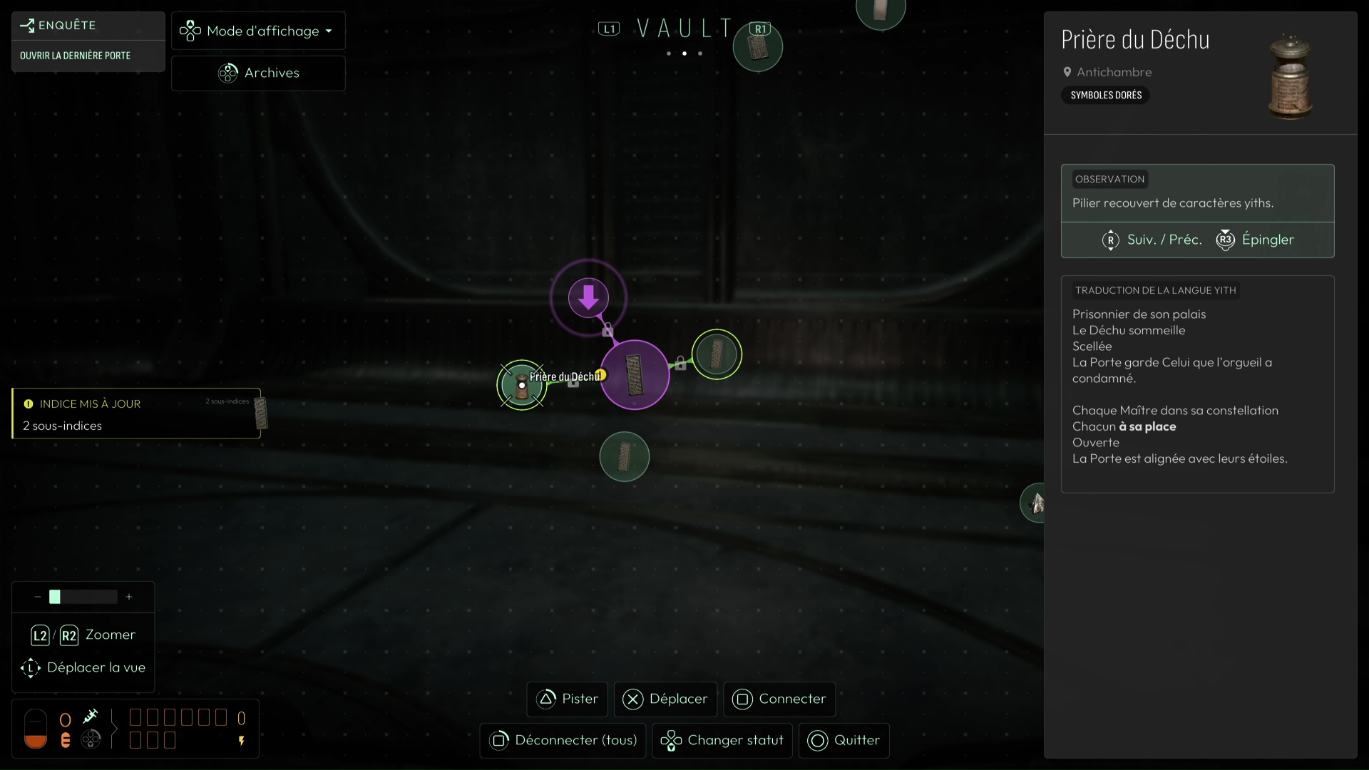 Continuez d’explorer, notamment le Mémorial de l’Urgence qui vous mènera dans une nouvelle reconstitution du passé des Yith, « Reconstitution : L’Urgence ». Vous trouverez une nouvelle carte (Fresque recouverte de symboles), permettant de débloquer une nouvelle interrogation primordiale.
