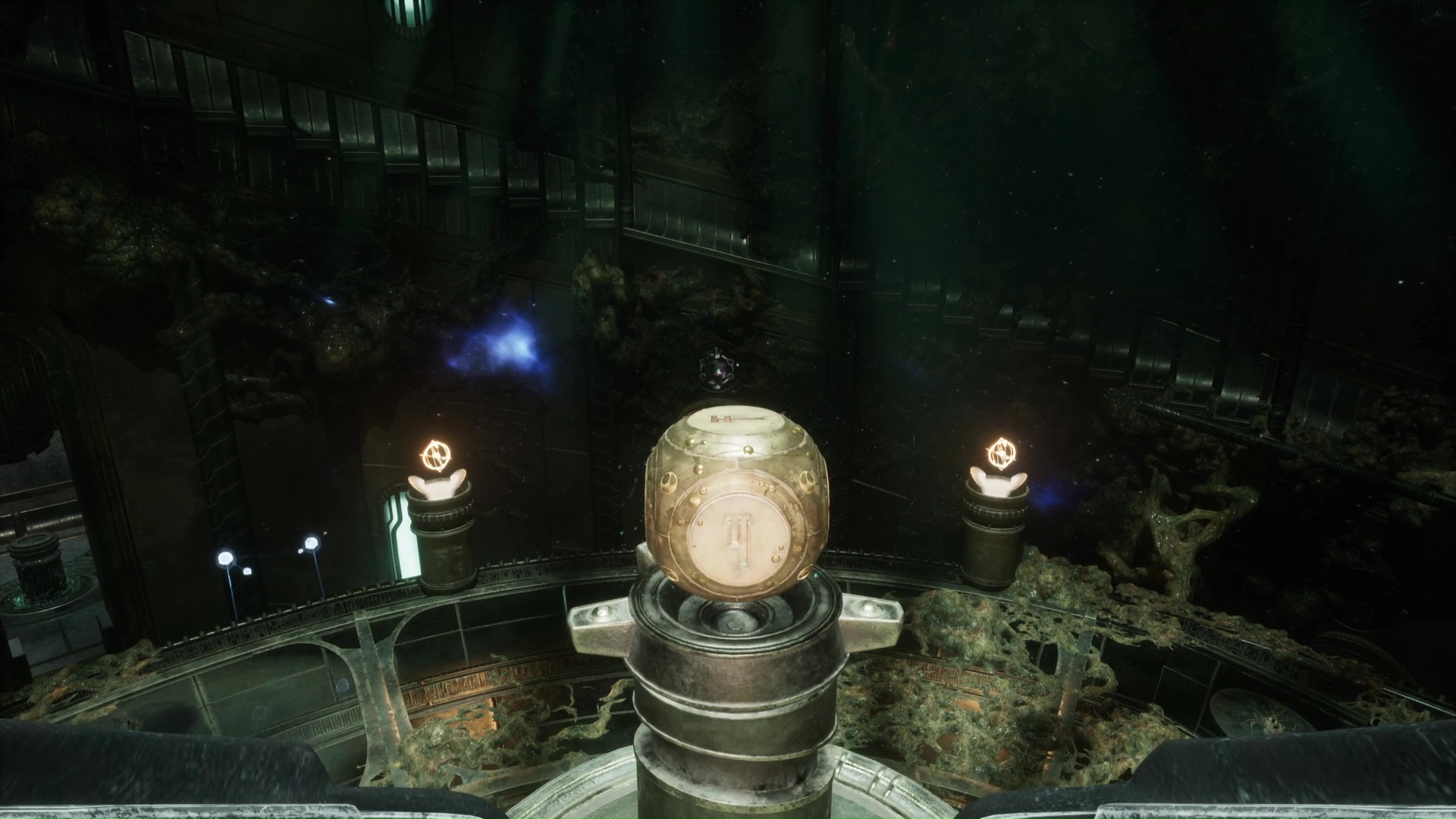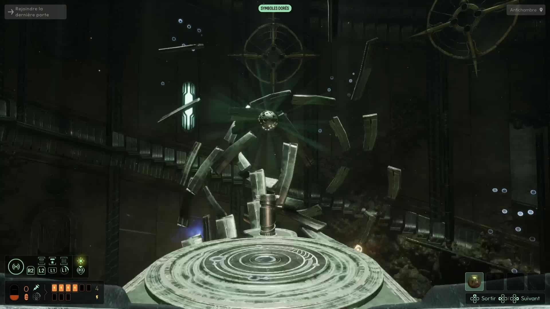 Cette mystérieuse pièce contient huit téléporteurs distincts. C’est d’ici que vous pourrez passer de salle en salle pour décortiquer tous les indices et récupérer le maximum d’informations. Il n’y a pas d’ordre précis pour effectuer cette opération, mais veillez à toutes les visiter pour tout ramasser. Sur la gauche du squelette, le deuxième téléporteur en partant de la droite vous mènera au Mémorial du Bâtisseur que vous avez pu apercevoir comme bloqué par de la sève extradimensionnelle depuis les escaliers. Ici, vous pourrez retrouver la trace de la fréquence « électrum » déjà utilisée dans un chapitre précédent et permettant de transformer les cubes métalliques en sphères. Curieusement, vous avez constaté la présence des mêmes plaques métalliques au sol au niveau des Prières, retenez cette information, elle sera importante pour votre choix en fin de chapitre.