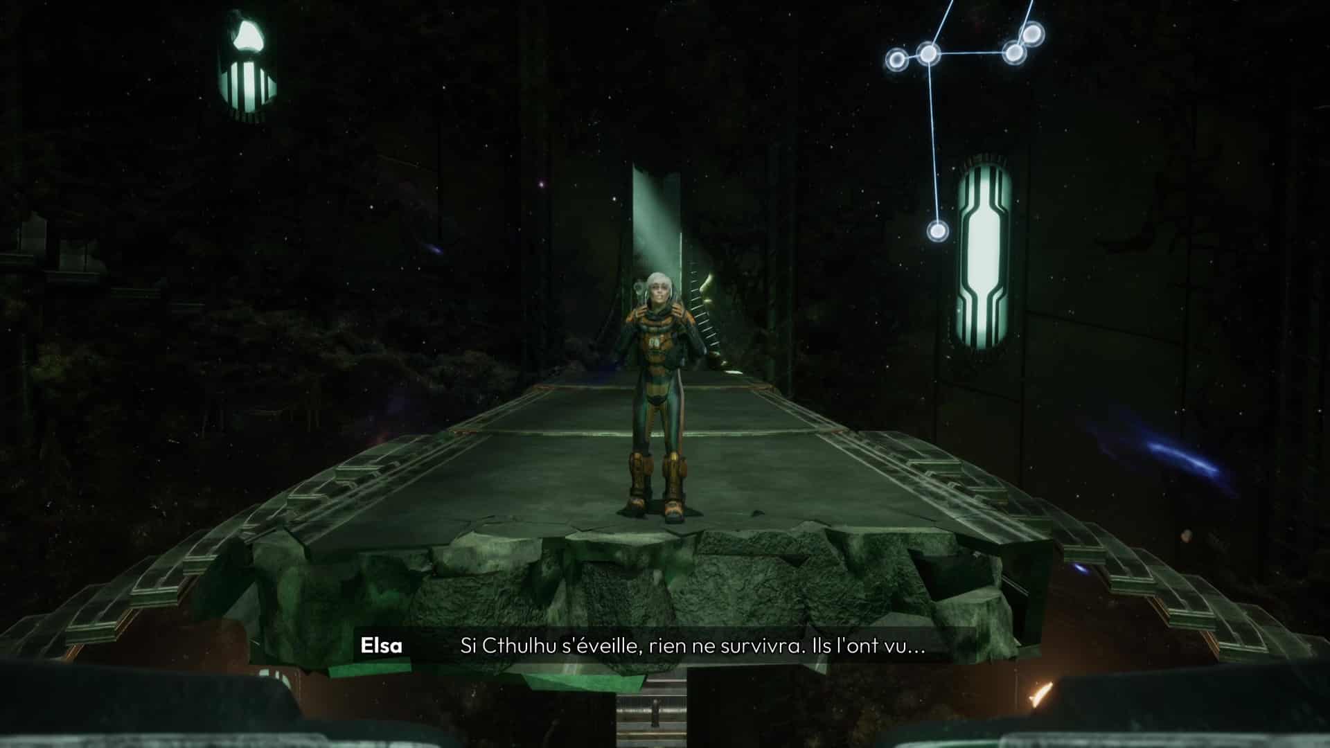 Puis, montez au niveau du piédestal pour poser l’Étoile de Shamash. Orientez-la dans le bon sens pour que ses faces correspondent aux points cardinaux de la salle (remarquez les constellations projetées sur les murs et celles indiquées dans votre inventaire), la face de Thultris doit être face à vous (le pont s’interrompant sur son pied gauche). Dans les deux cas, profitez de la cinématique clôturant ce chapitre et vous ramenant Elsa avant un ultime plongeon vers le Chapitre 7 : Le Cœur. Pour plus d’informations sur Cthulhu: The Cosmic Abyss, rendez-vous sur notre guide complet.