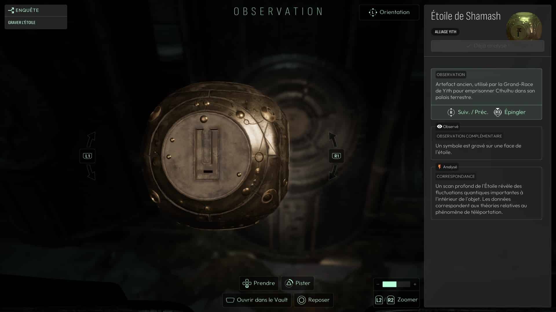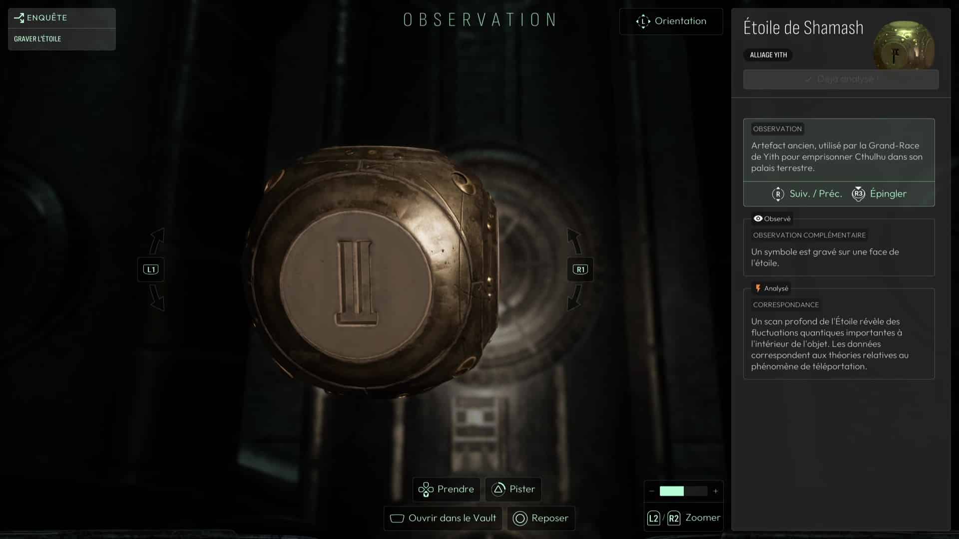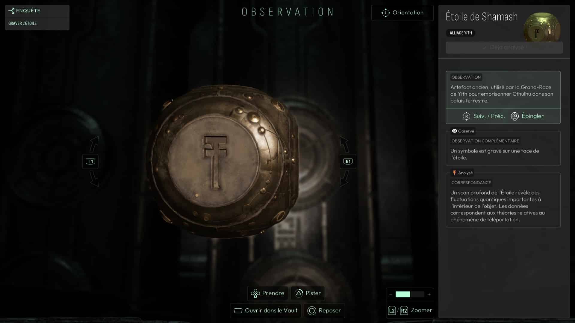 Le pilier central contient un symbole (sorte de I majuscule). Repérez ce symbole sur les murs avoisinants (en bas à gauche du mur de gauche en entrant) puis positionnez l’Étoile de Shamash dessus pour que le symbole se grave. Récupérez ensuite l’Étoile de Shamash dans votre inventaire. Placez-la ensuite sur le réceptacle du pilier central pour vous téléporter dans une réalité alternative en compagnie des Yith.