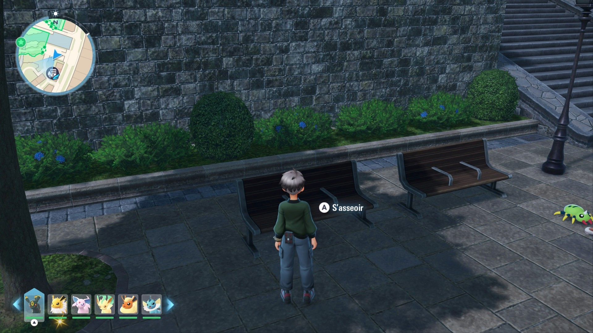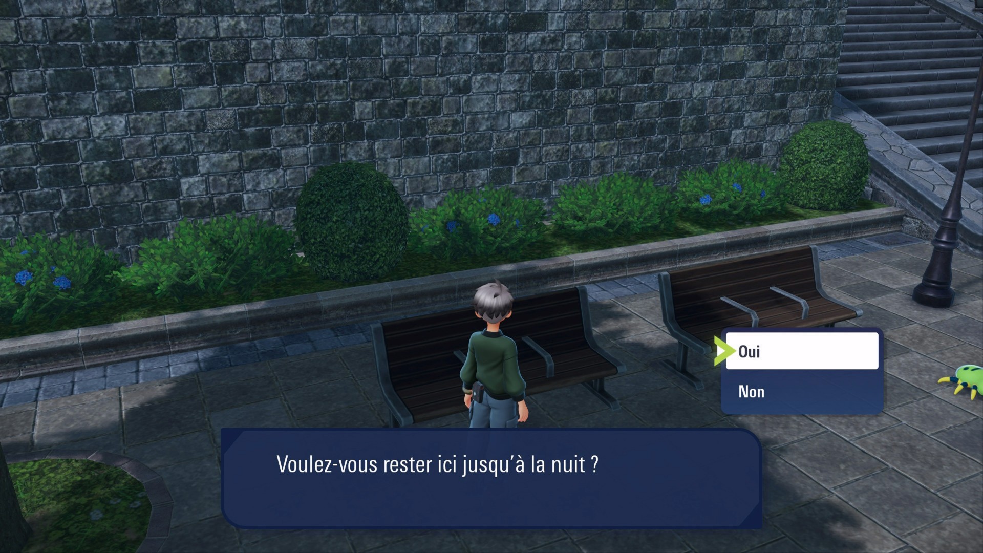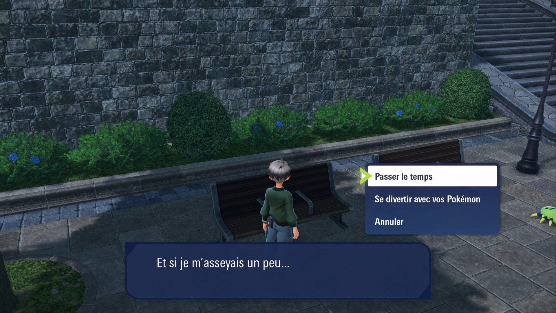 Pour savoir combien de temps il vous reste, il vous suffit d’observer la jauge autour de la mini-carte. De plus, le jeu vous prévient avec plusieurs alertes que le jour ou la nuit est sur le point d’arriver. Toutefois, il arrive que l’on veuille que la nuit ou le jour tombe immédiatement. Certains Pokémon n’apparaissent que de nuit ou de jour dans les zones sauvages. Pour ne pas attendre bêtement, il vous suffit d’interagir avec n’importe quel banc libre du jeu (il ne doit pas être occupé par un PNJ) et de passer le temps.