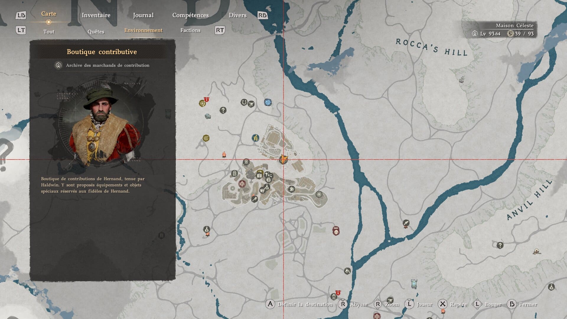 Chaque ville dispose d’une boutique de contribution dont les objets peuvent uniquement s’acheter via les points que vous obtiendrez de cette manière. On parle d’équipements uniques, qui valent le détour, surtout en début de partie. Si vous cherchez la boutique de Hernand, elle est localisée à l’endroit ci-dessus sur la carte, dans le château.