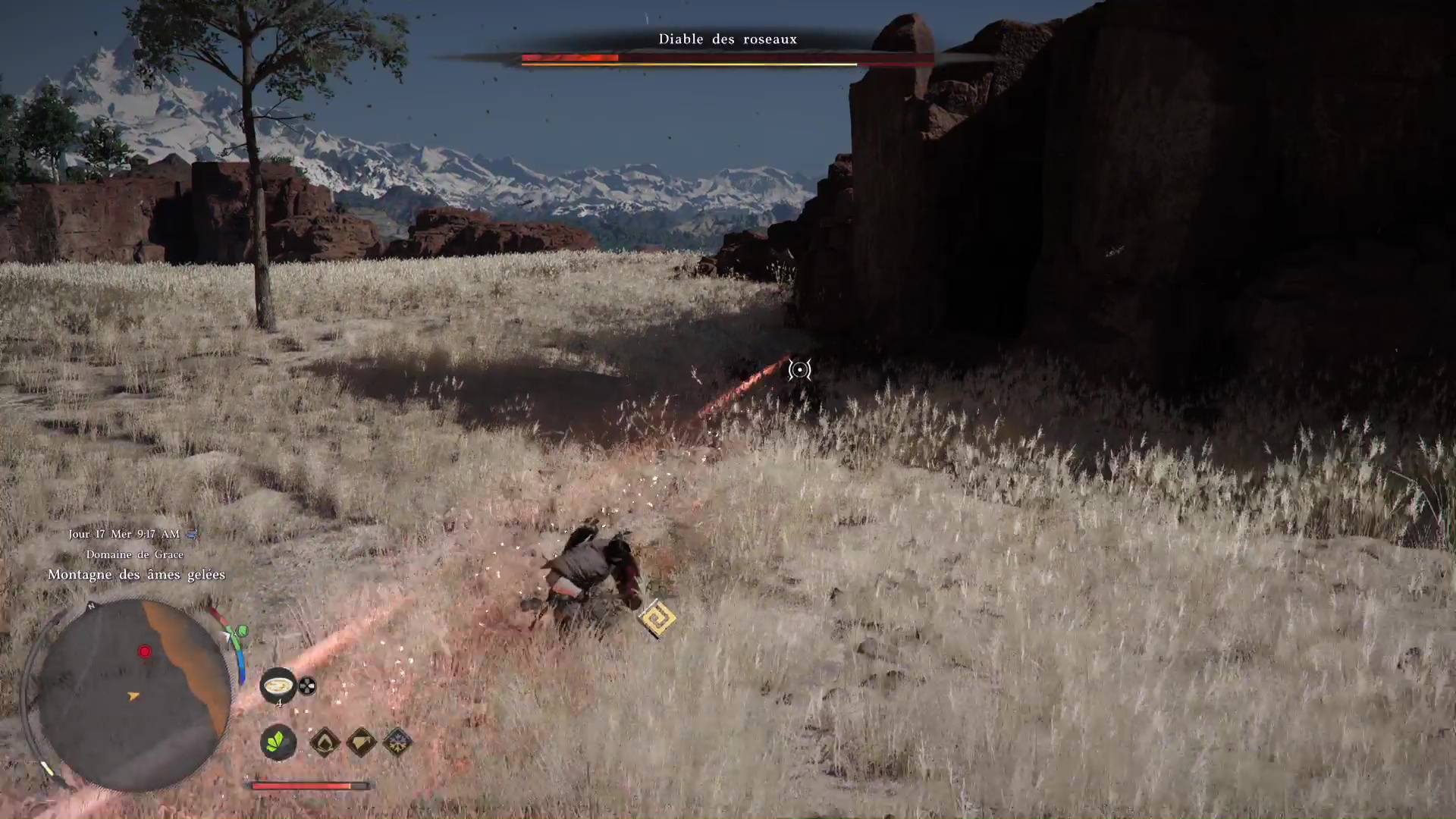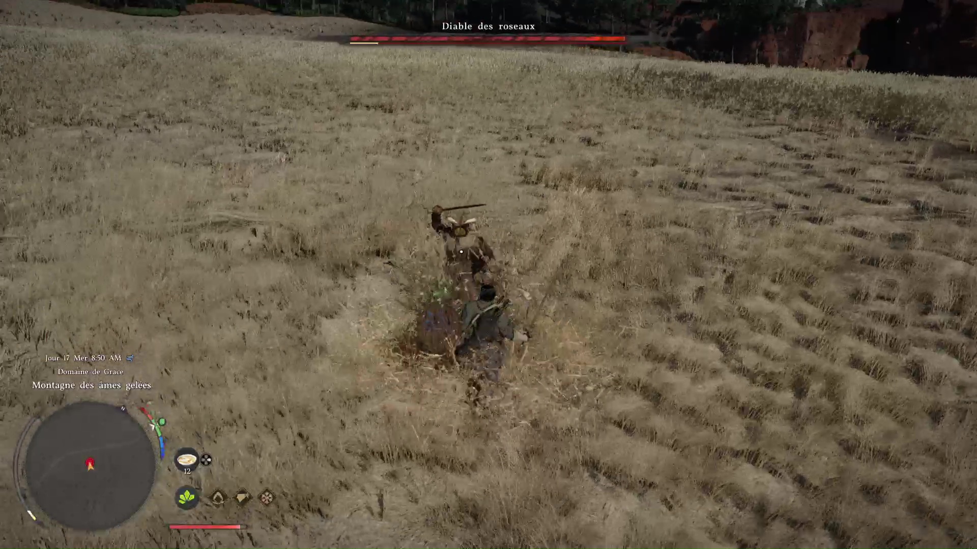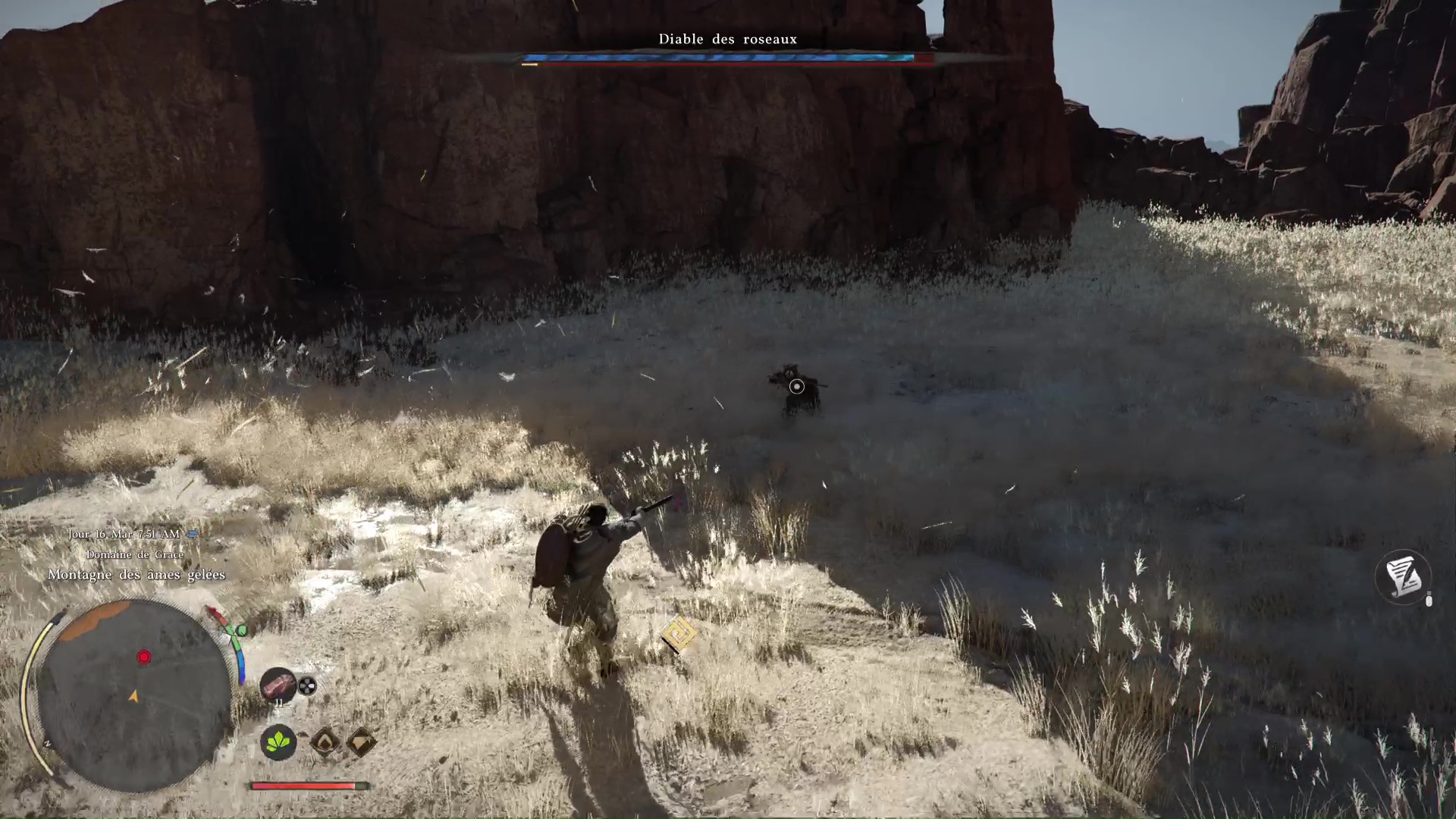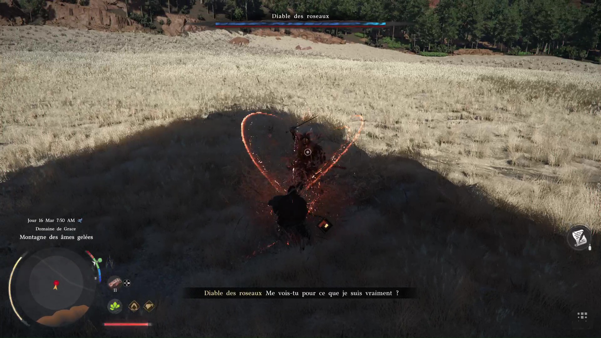 Ne perdez donc pas trop de temps avec les sbires, gardez un œil sur leurs attaques, et particulièrement le gros balourd au début de l’ascension, mais surveillez surtout le Diable des roseaux. Bloquez les attaques successives et, si possible, effectuez des parades parfaites si vous les maîtrisez. Vous pourrez ainsi stopper net le boss et le frapper suffisamment pour qu’il disparaisse.