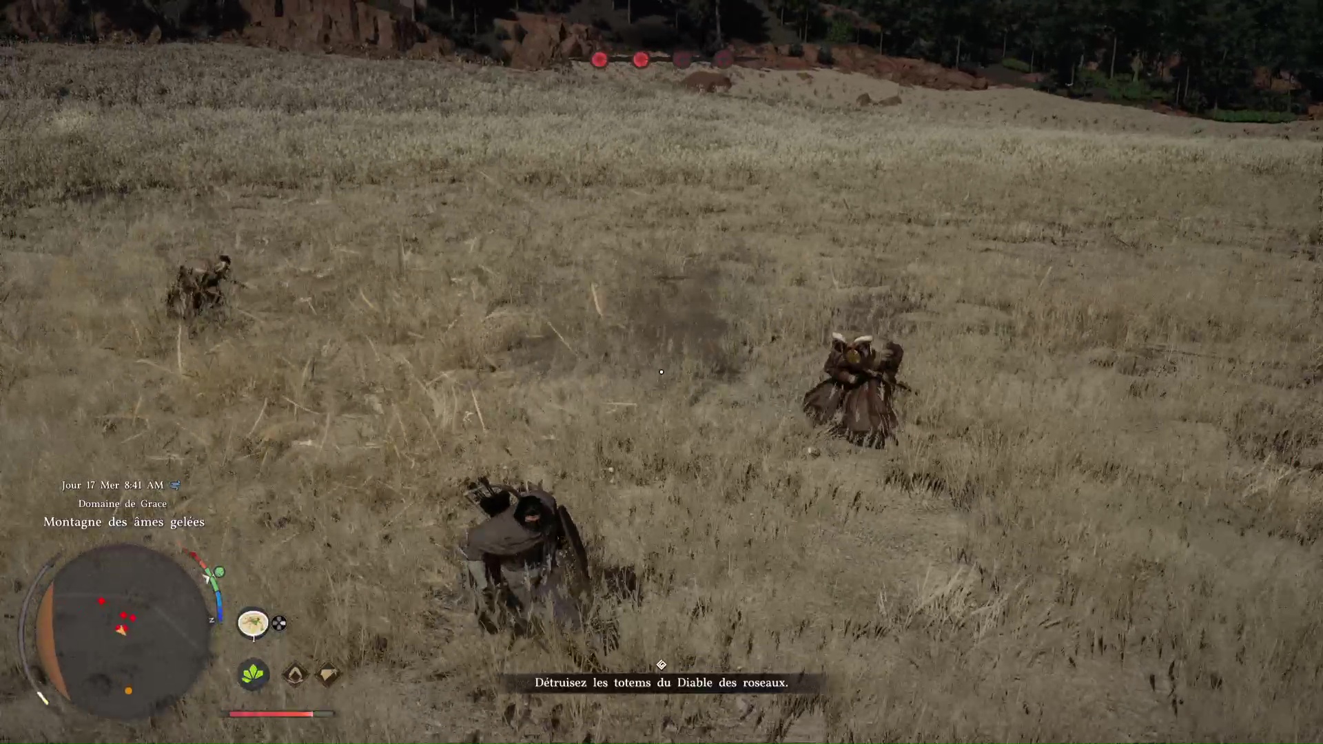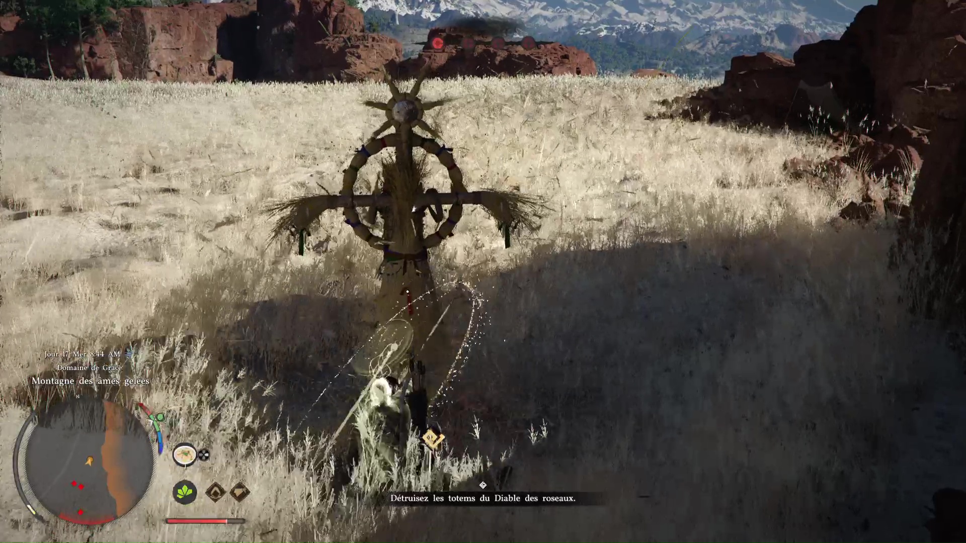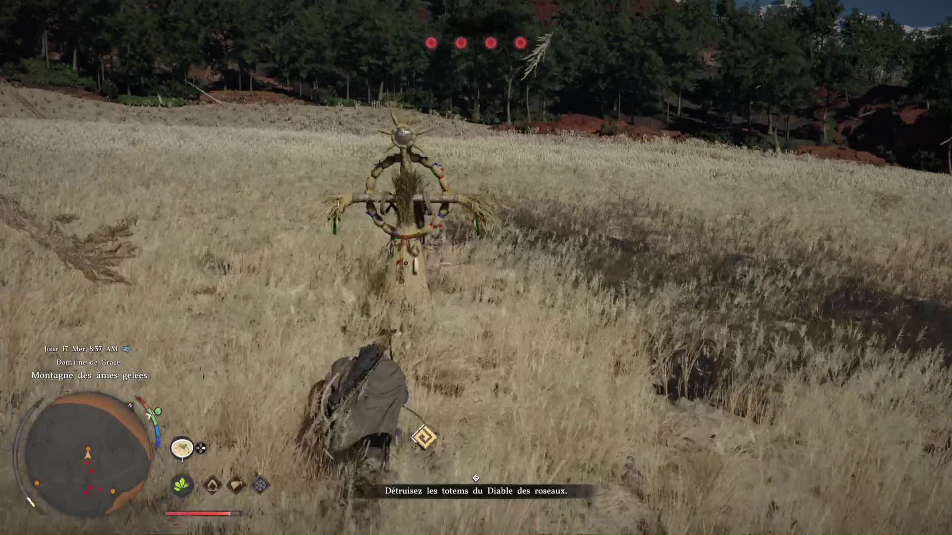 Une fois que la barre bleue du Diable des roseaux arrive à zéro, vous entrez dans une phase intermédiaire où il faut détruire des totems. Il y en a quatre et vous devez les détruire tout en faisant attention au Diable et au clone qu’il invoque. Gardez-les dans un coin de l’œil, mais chassez les totems au plus vite.