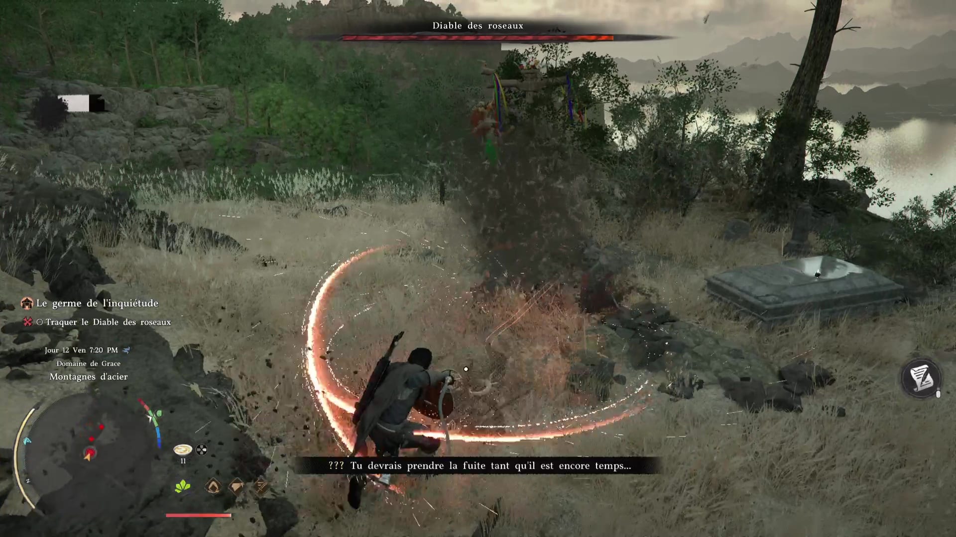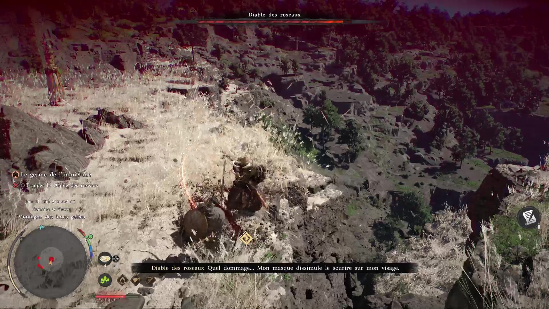 Tout commence à partir de la sous-quête « La germe de l’inquiétude », durant le chapitre III de Crimson Desert. Vous devez quitter la cabane et pister le Diable des roseaux avec la lanterne. Si on vous en parle aussi tôt alors que le vrai combat se situe plus loin, c’est parce que le bougre vous attaquera à plusieurs reprises sur le chemin qui mène à son arène.