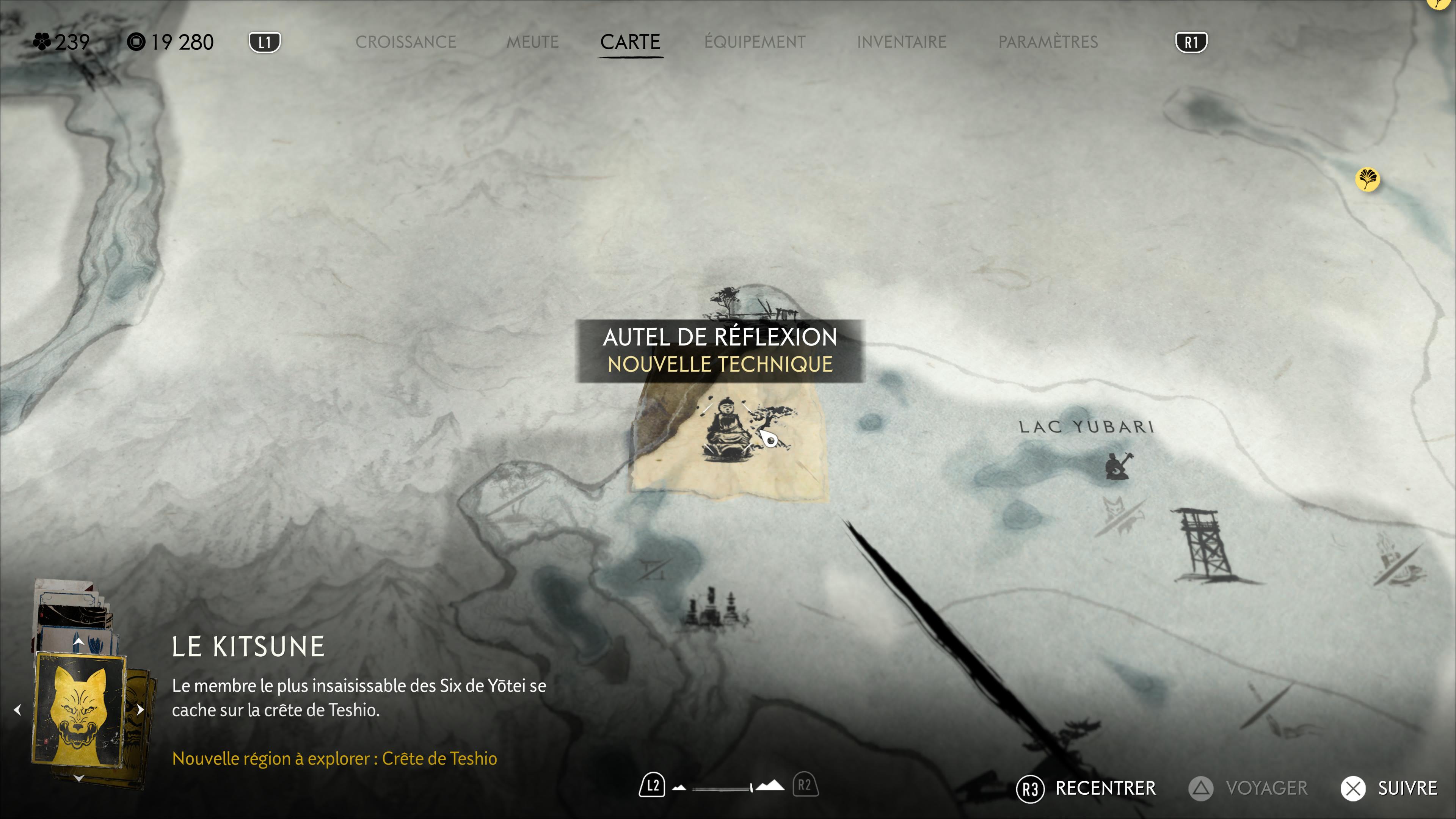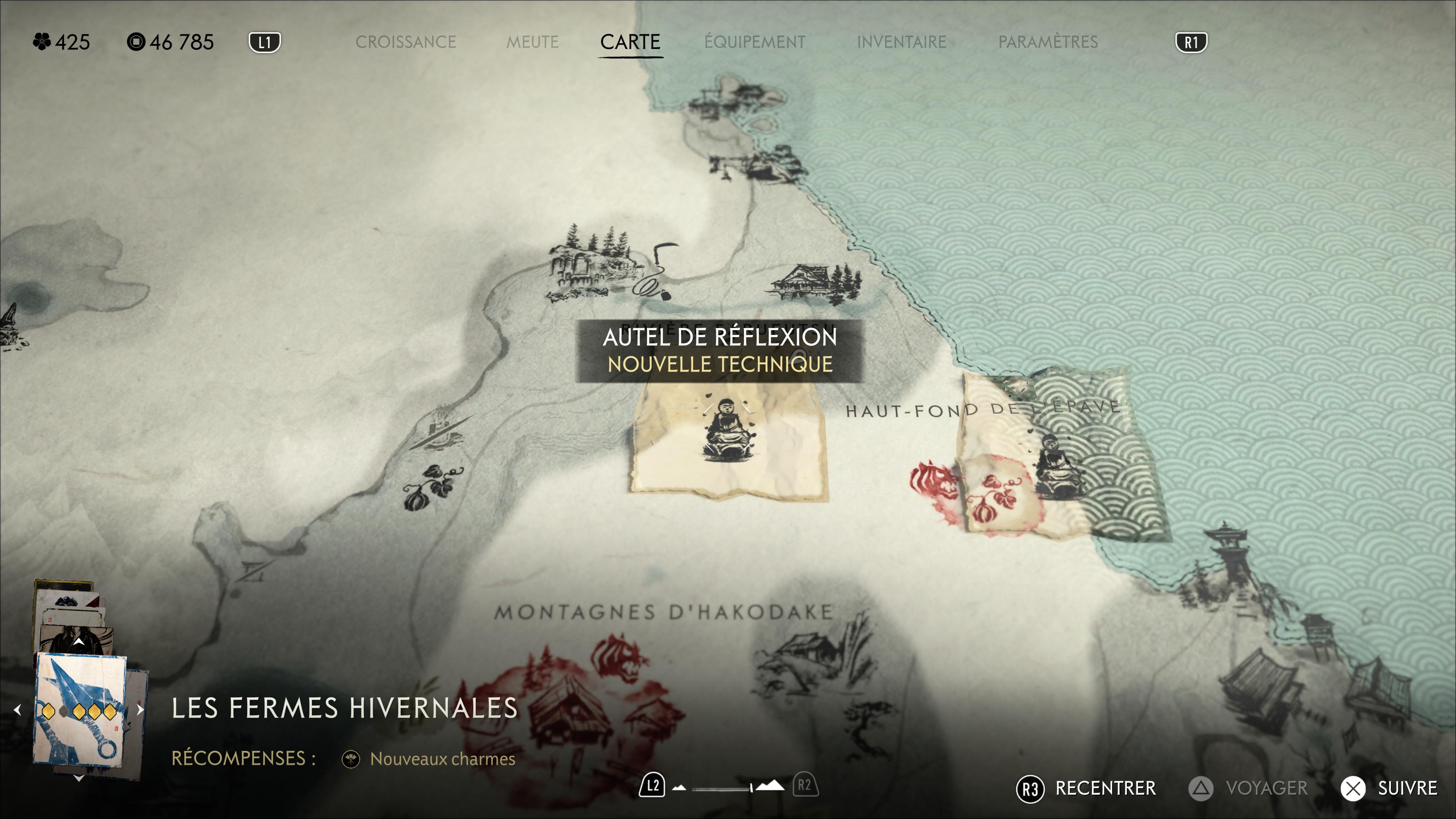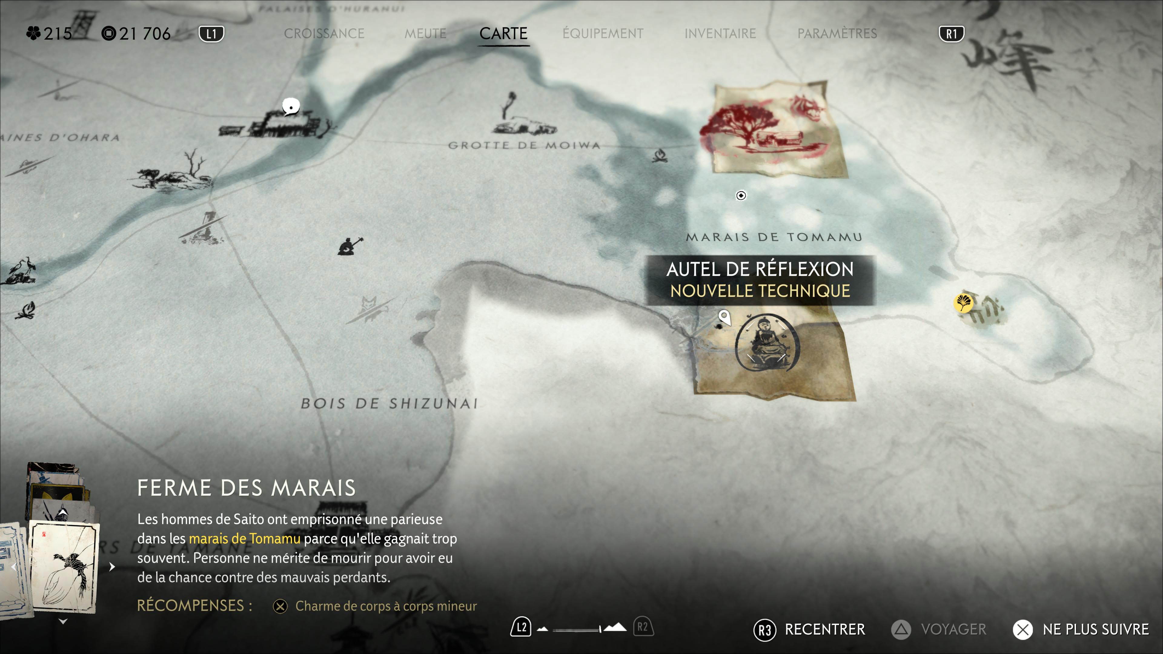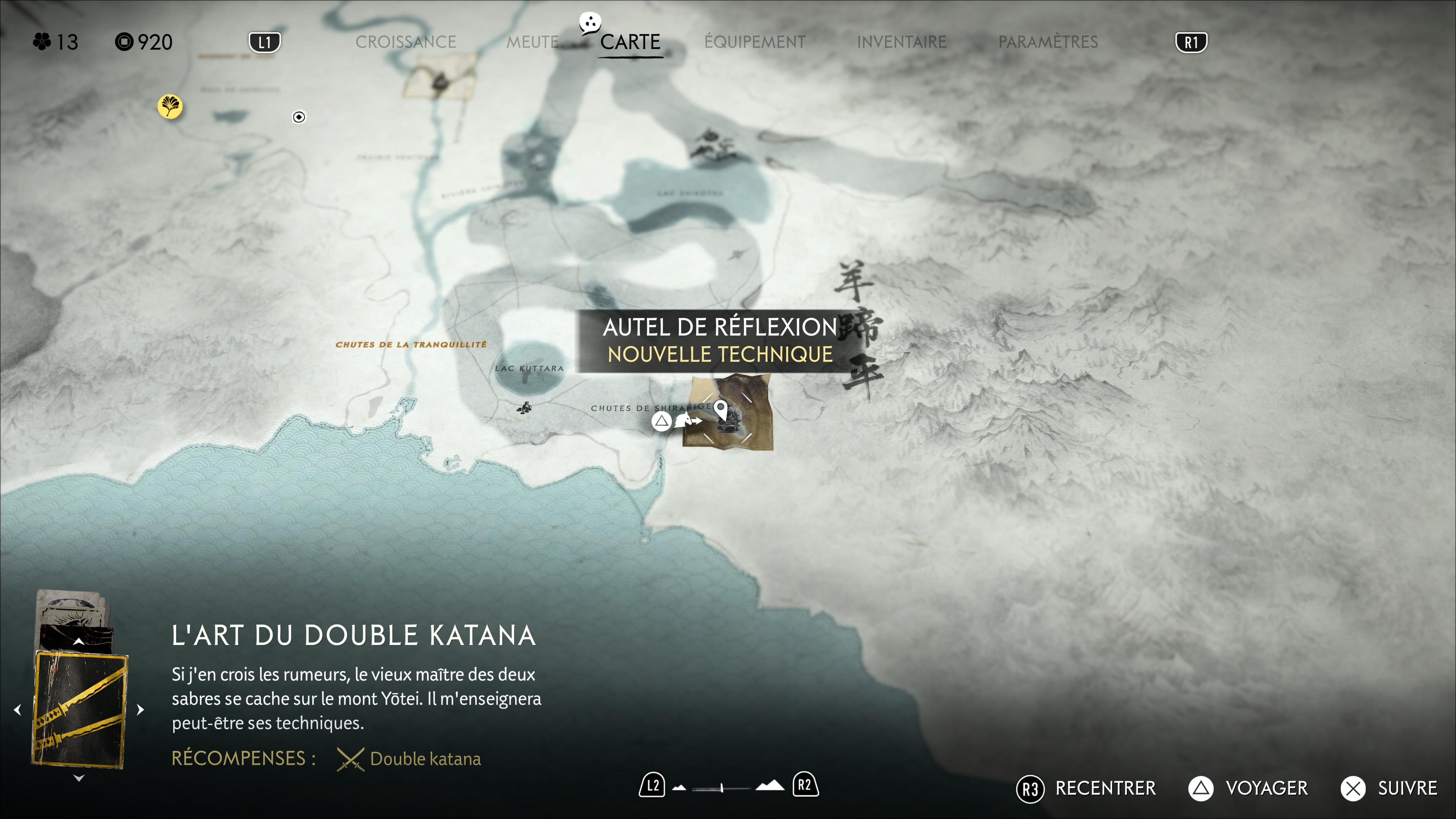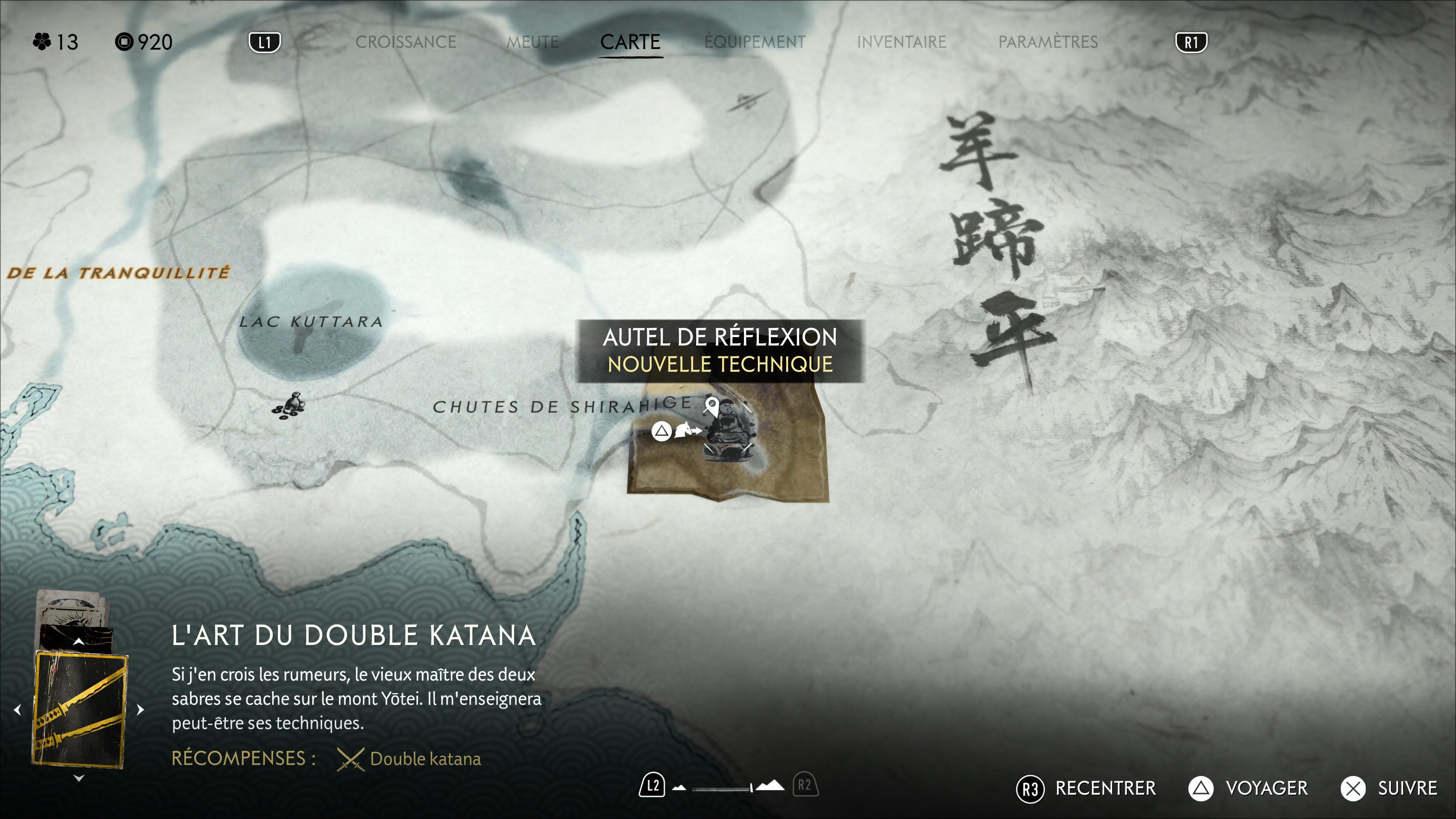 Cachés derrière une cascade, érigés au sommet d’une colline, ou bien en récompense d’un camp des Six de Yōtei libéré, les autels de réflexion sont nombreux et très utiles. À chaque fois que vous vous inclinez devant en glissant votre doigt vers le bas du pavé tactile de la DualSense, vous avez la possibilité de débloquer une compétence de votre choix.