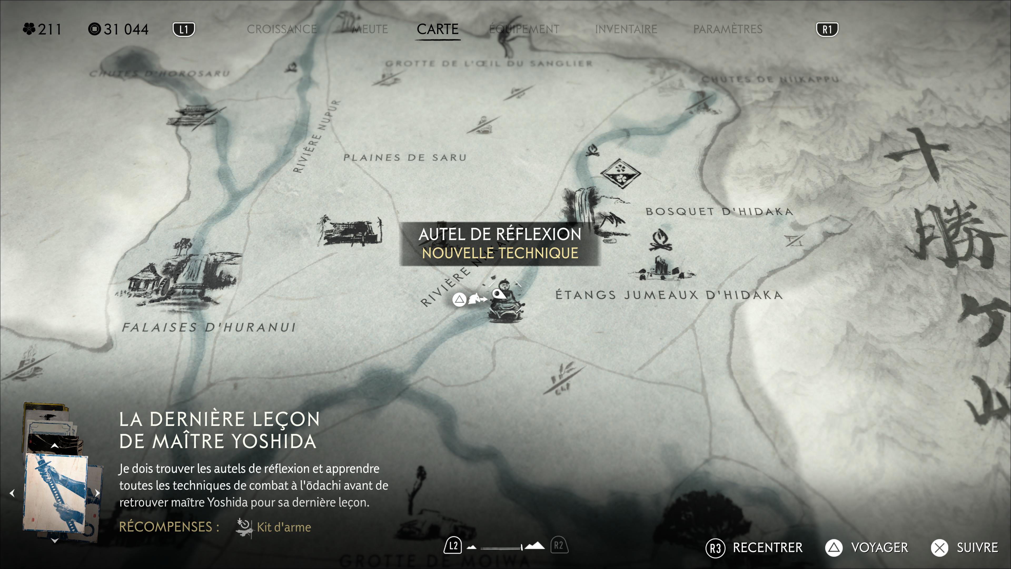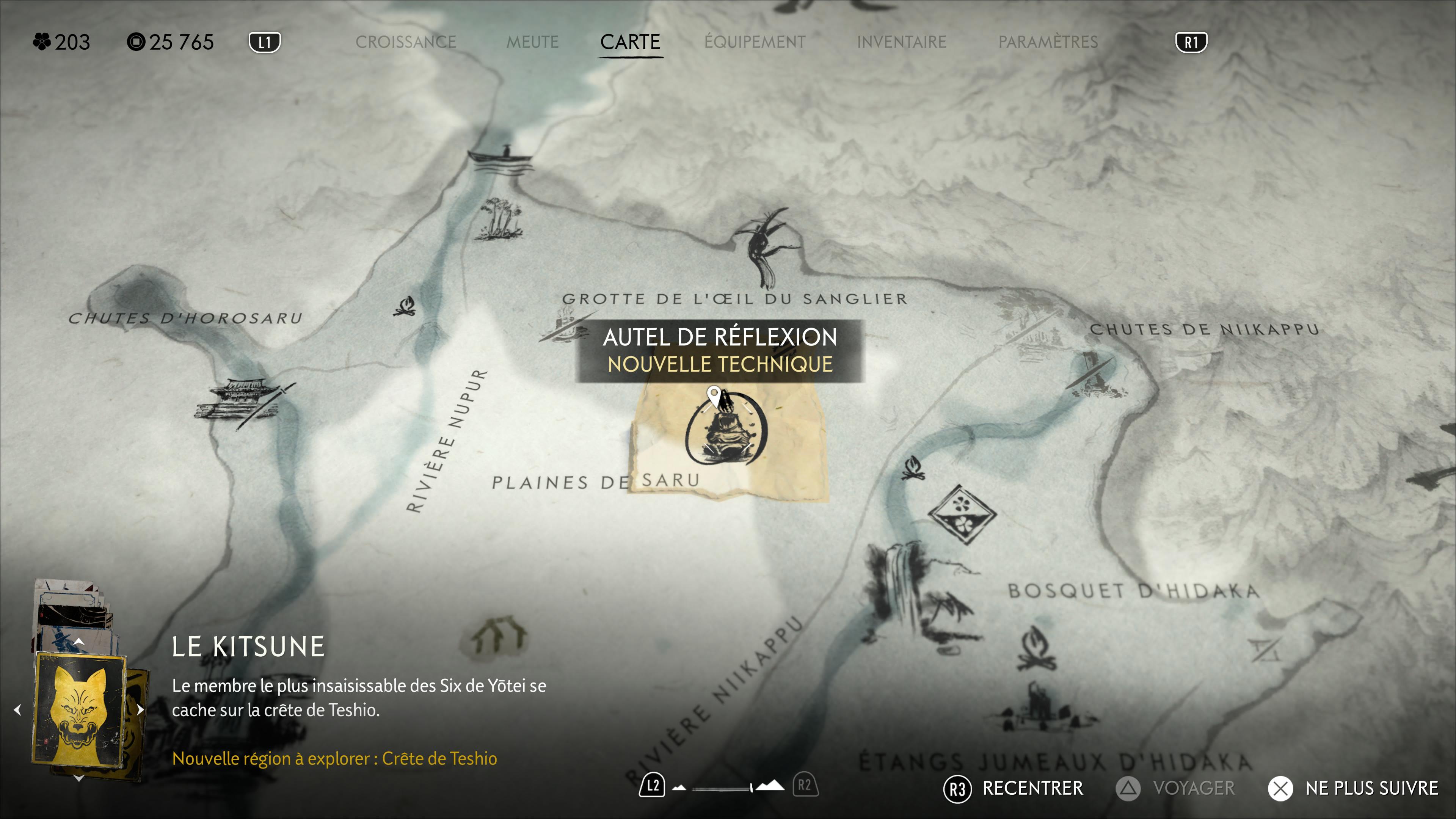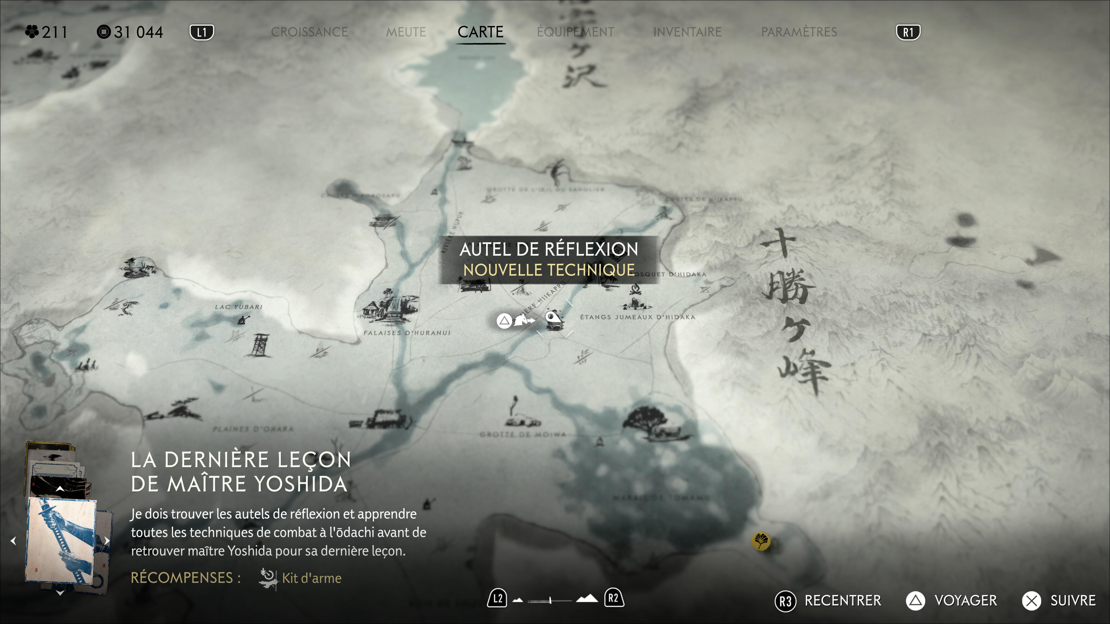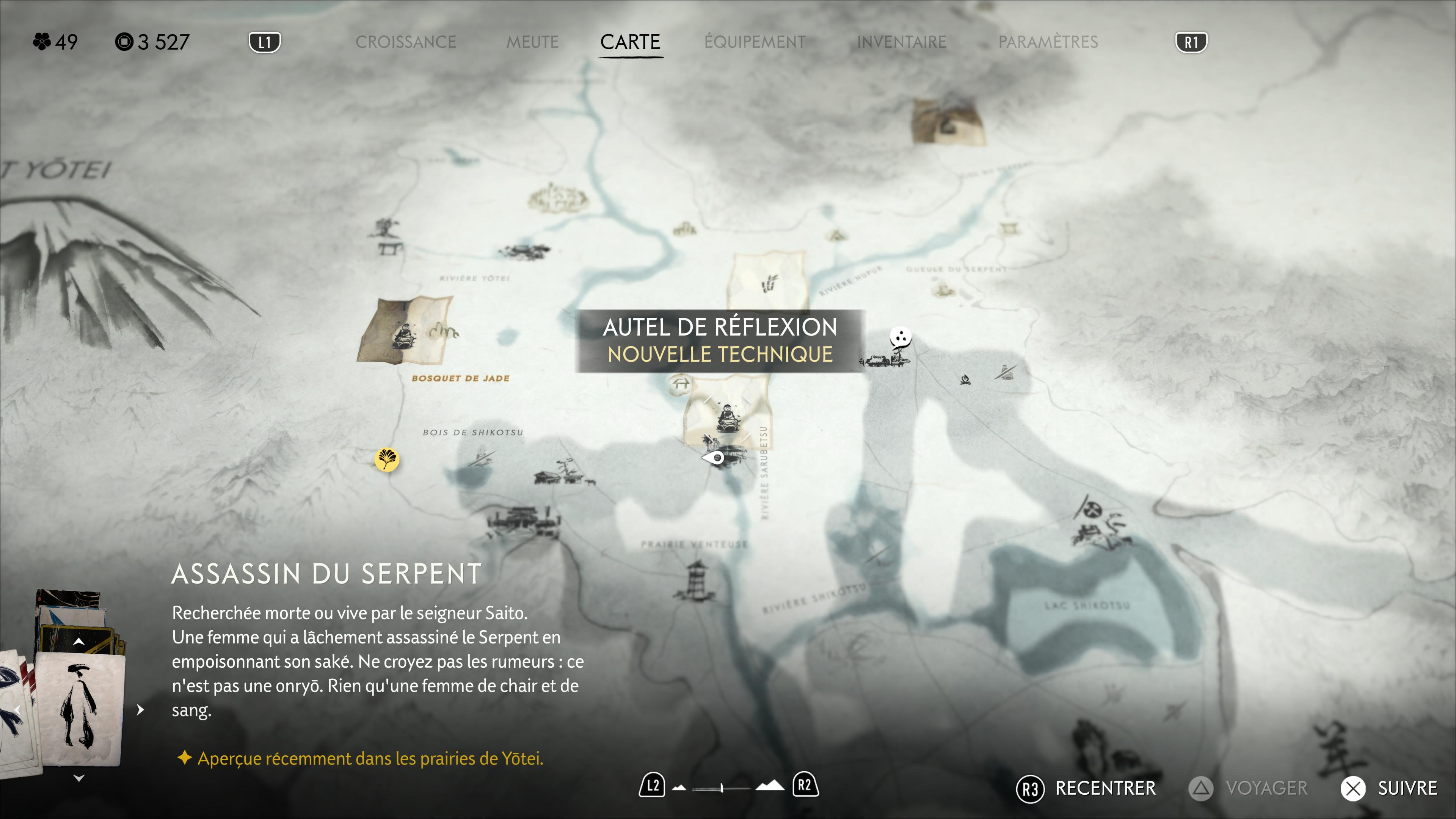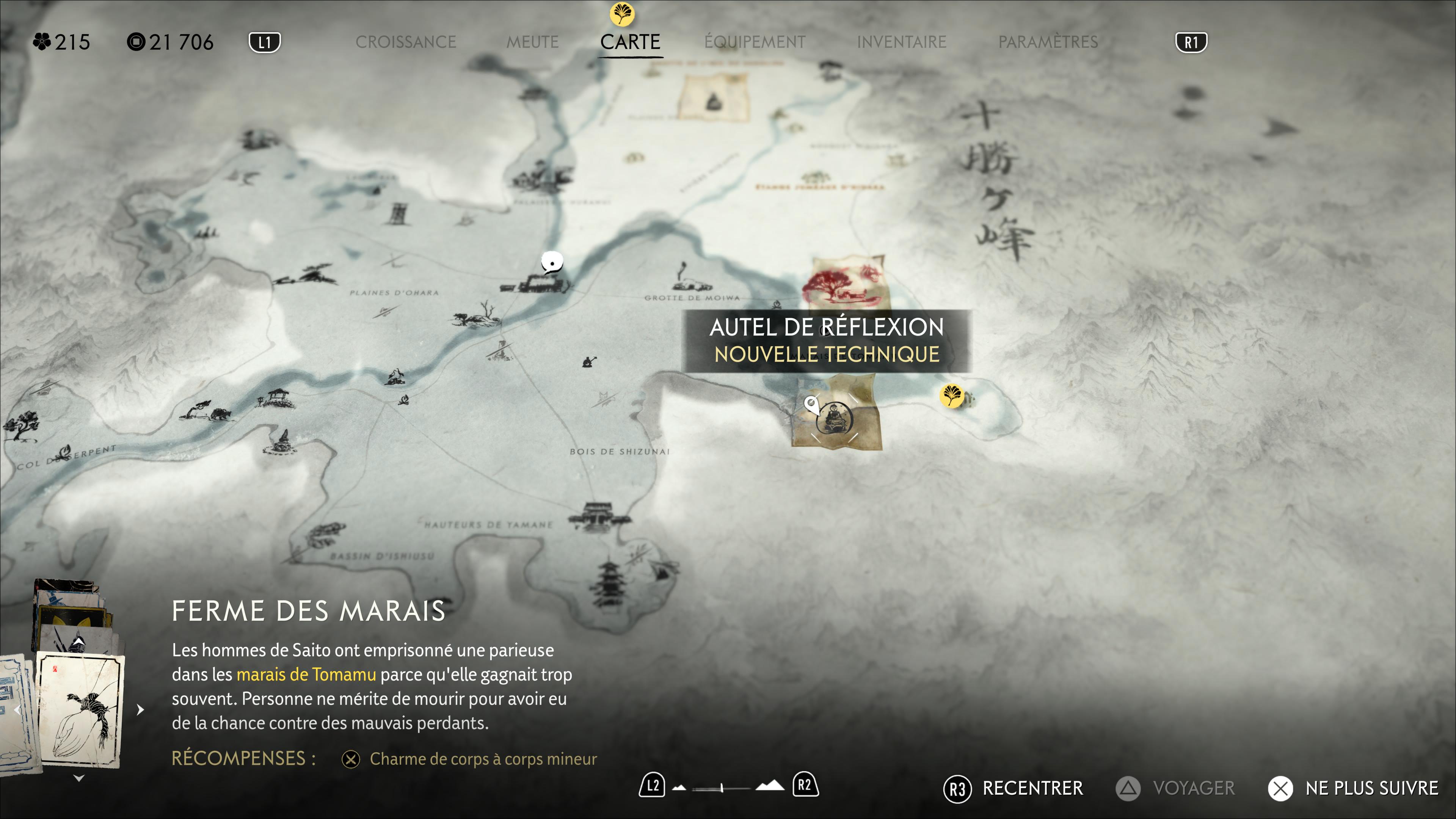 Cachés derrière une cascade, érigés au sommet d’une colline, ou bien en récompense d’un camp des Six de Yōtei libéré, les autels de réflexion sont nombreux et très utiles. À chaque fois que vous vous inclinez devant en glissant votre doigt vers le bas du pavé tactile de la DualSense, vous avez la possibilité de débloquer une compétence de votre choix.