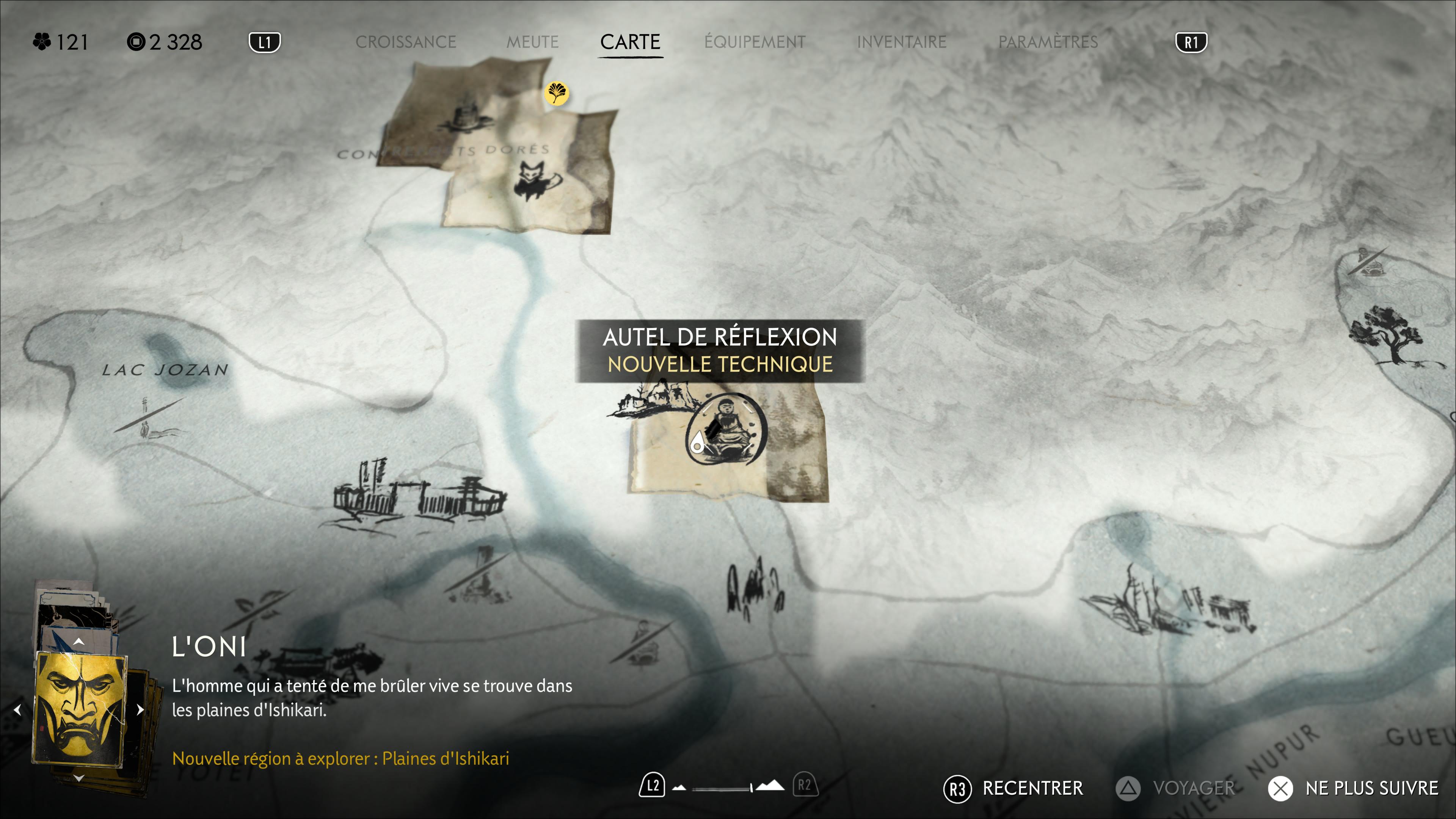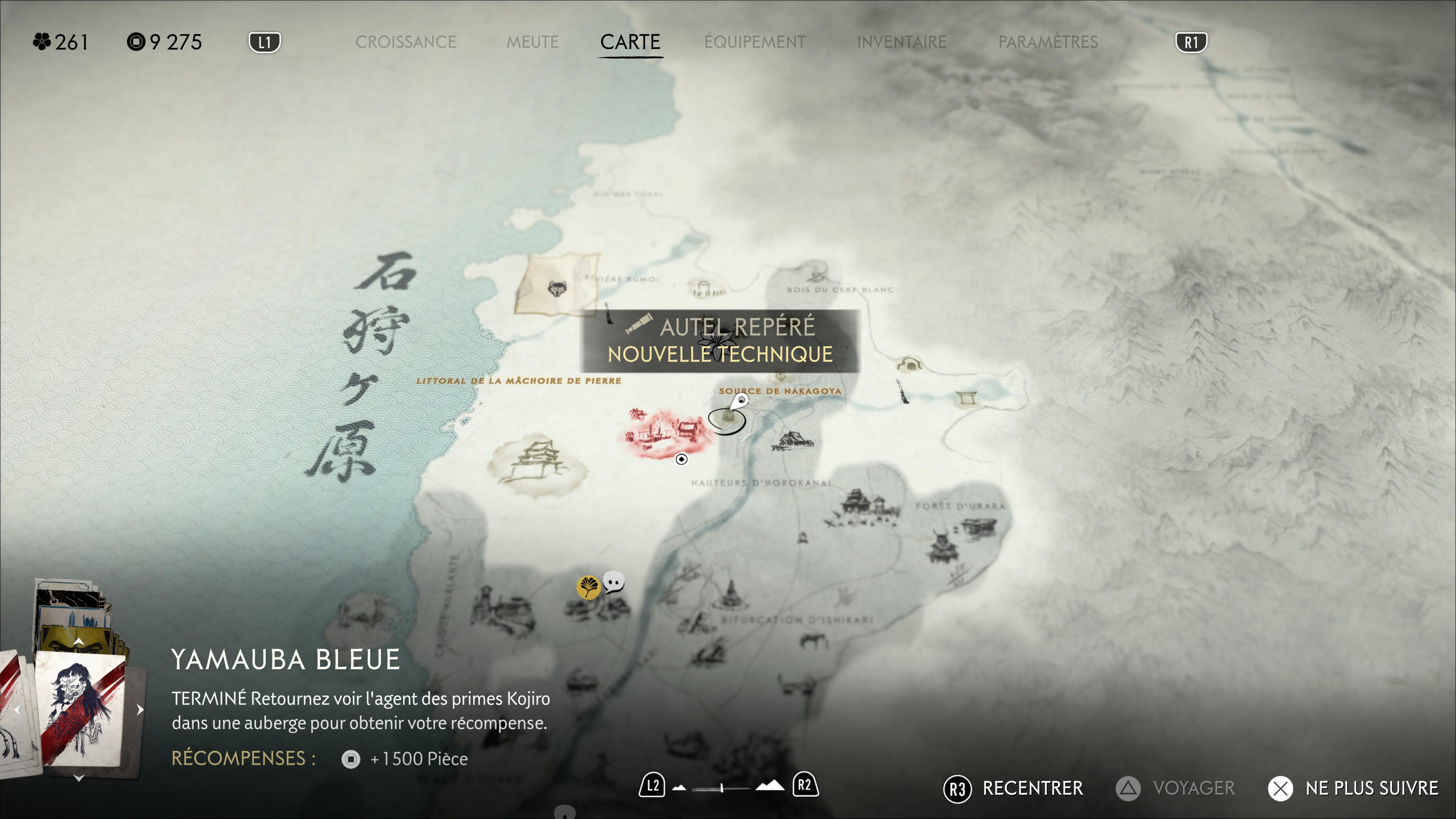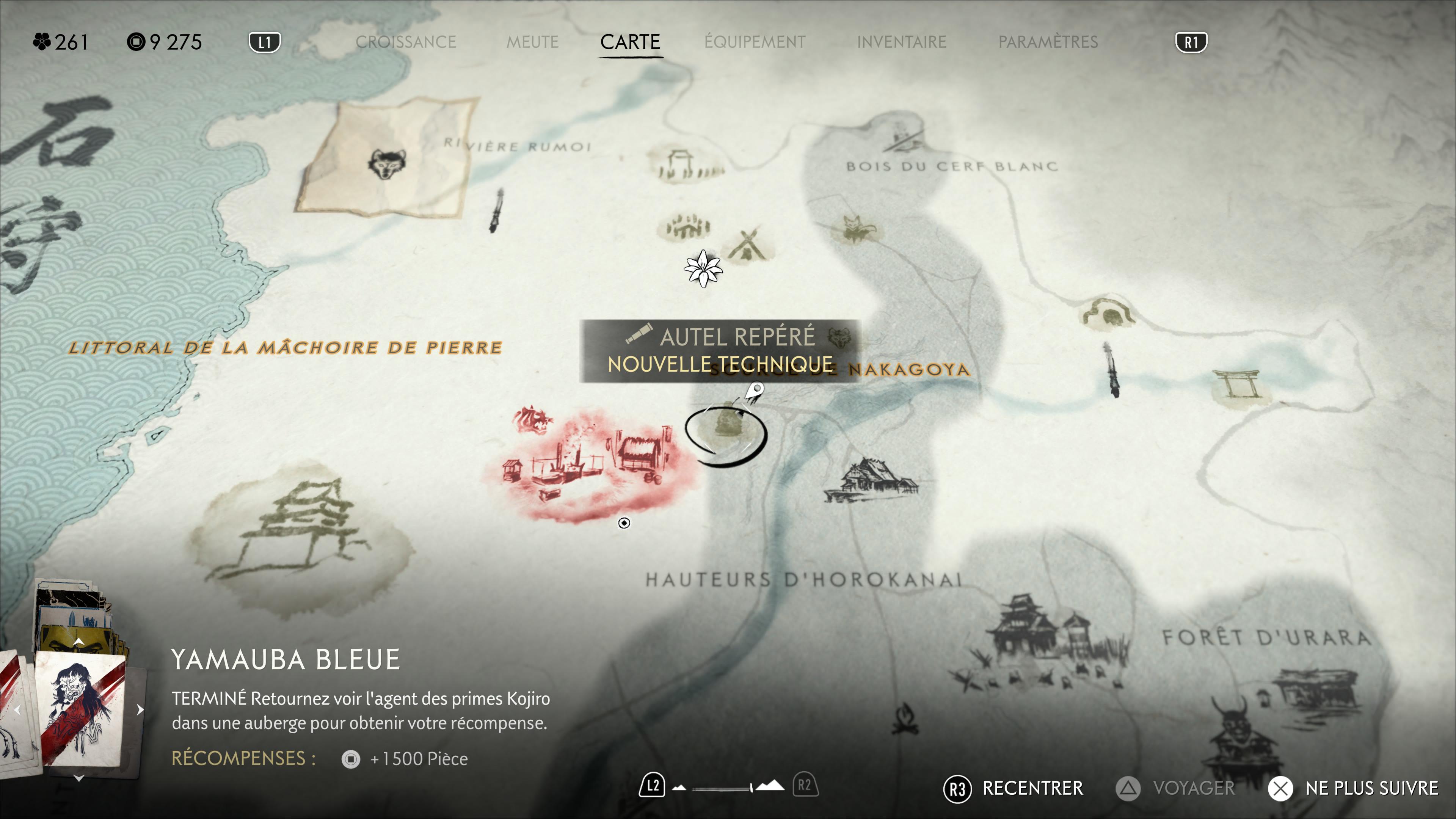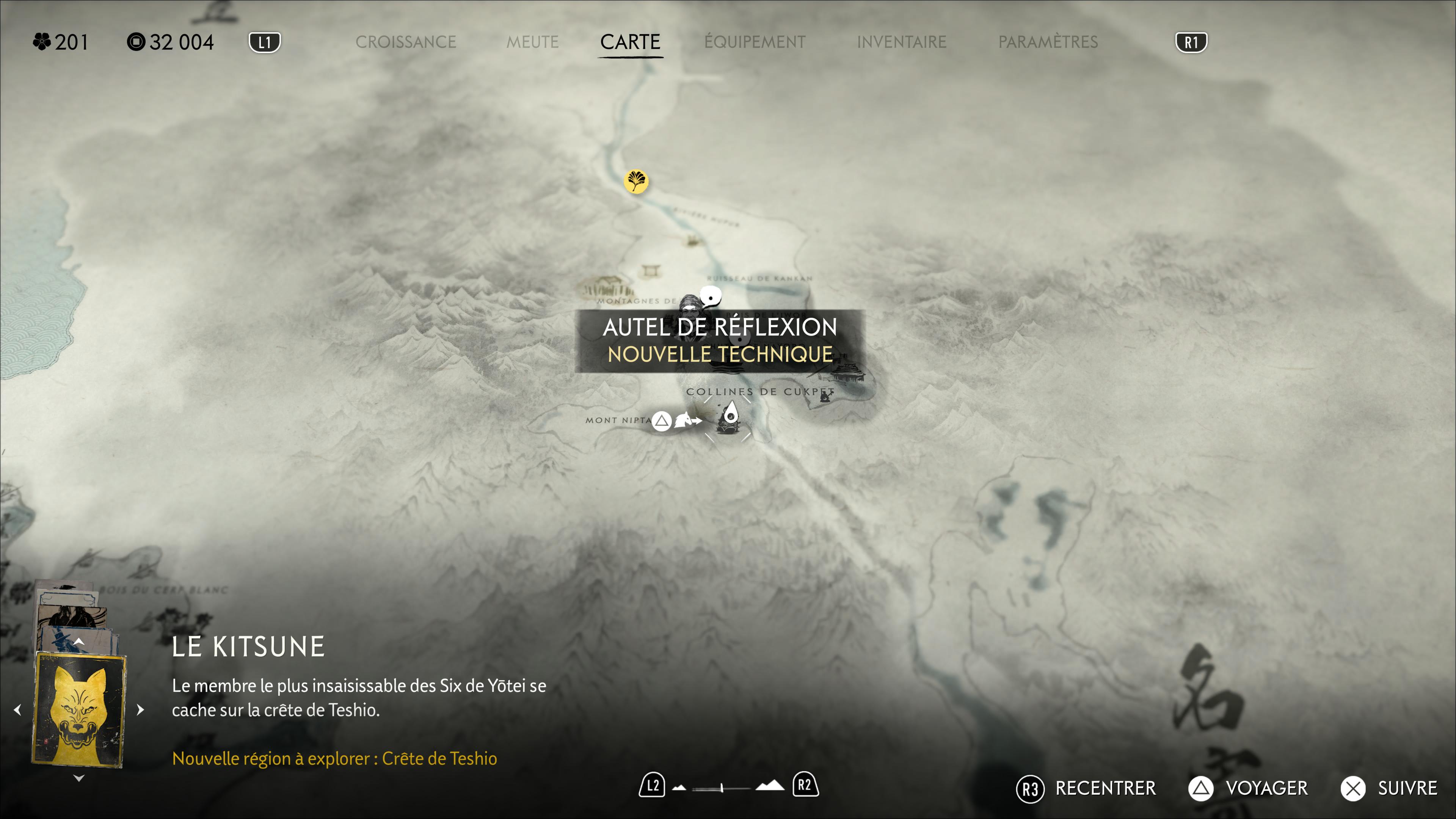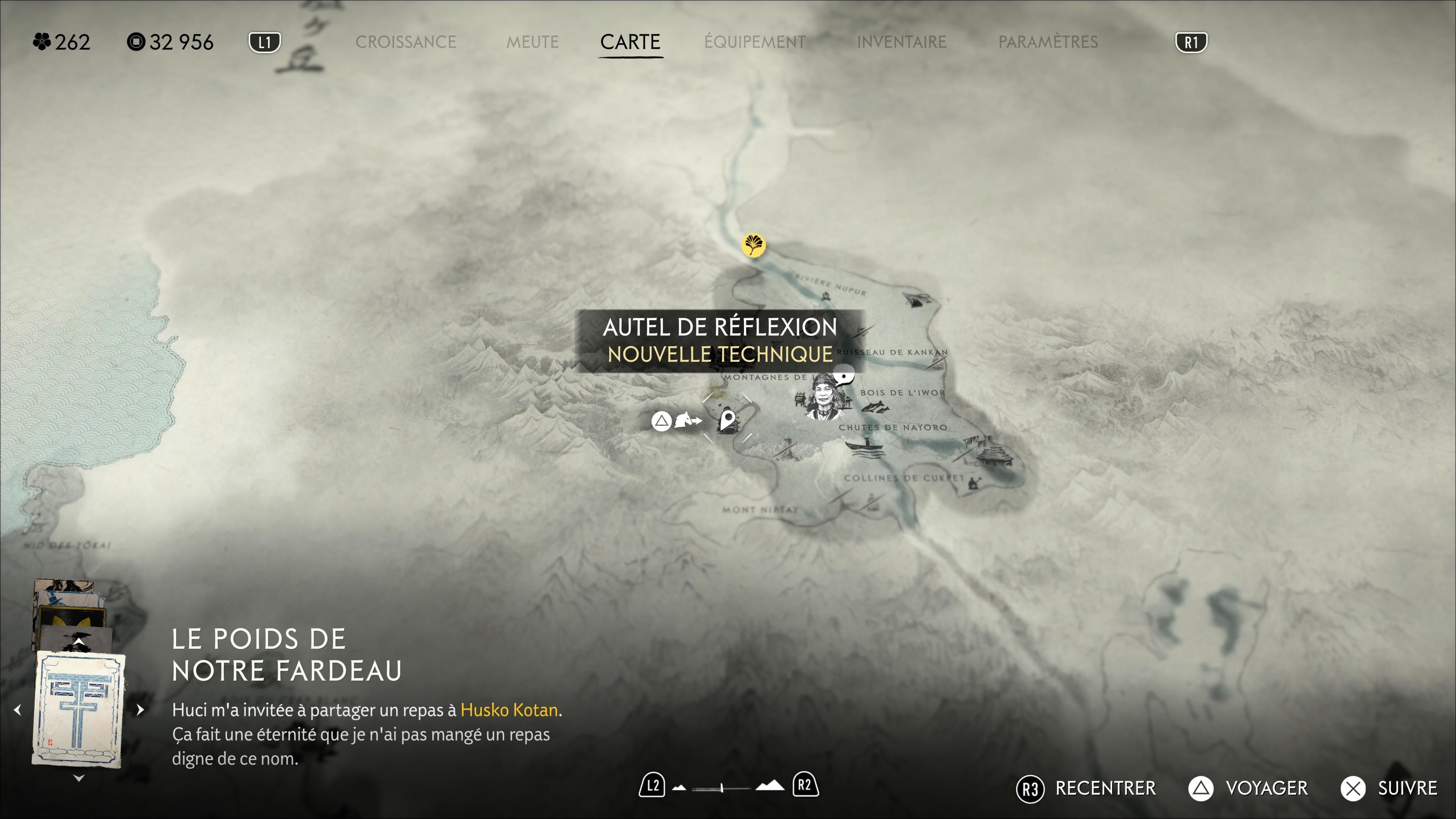 Cachés derrière une cascade, érigés au sommet d’une colline, ou bien en récompense d’un camp des Six de Yōtei libéré, les autels de réflexion sont nombreux et très utiles. À chaque fois que vous vous inclinez devant en glissant votre doigt vers le bas du pavé tactile de la DualSense, vous avez la possibilité de débloquer une compétence de votre choix.