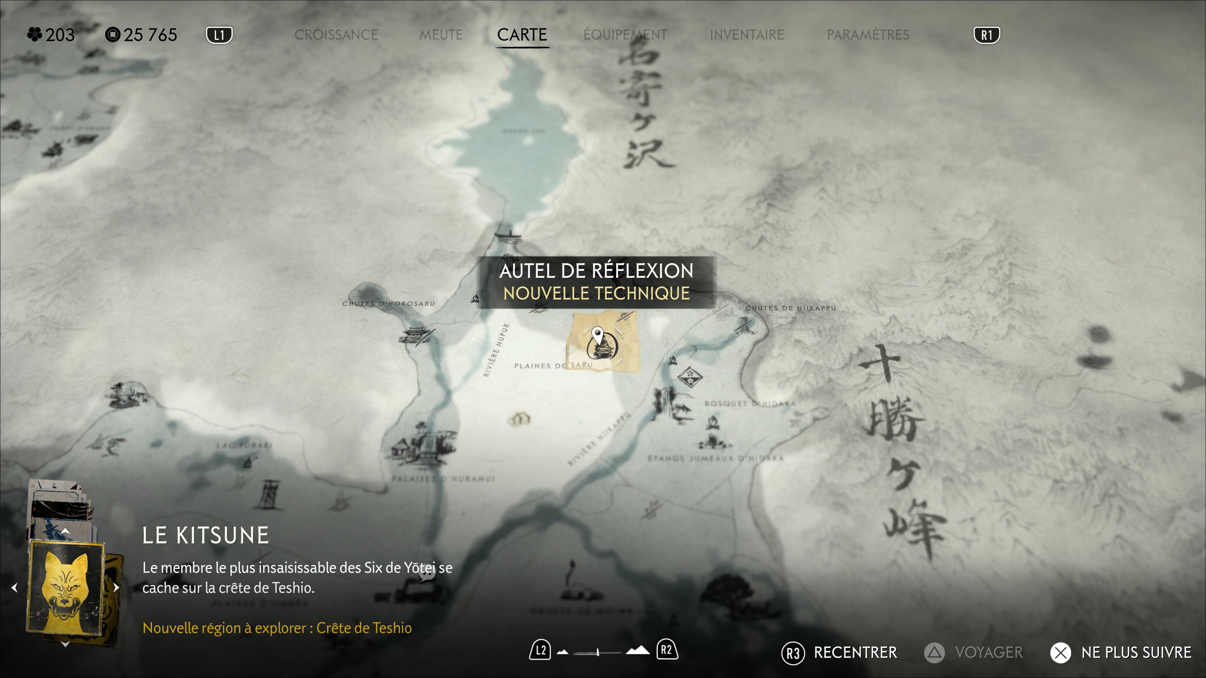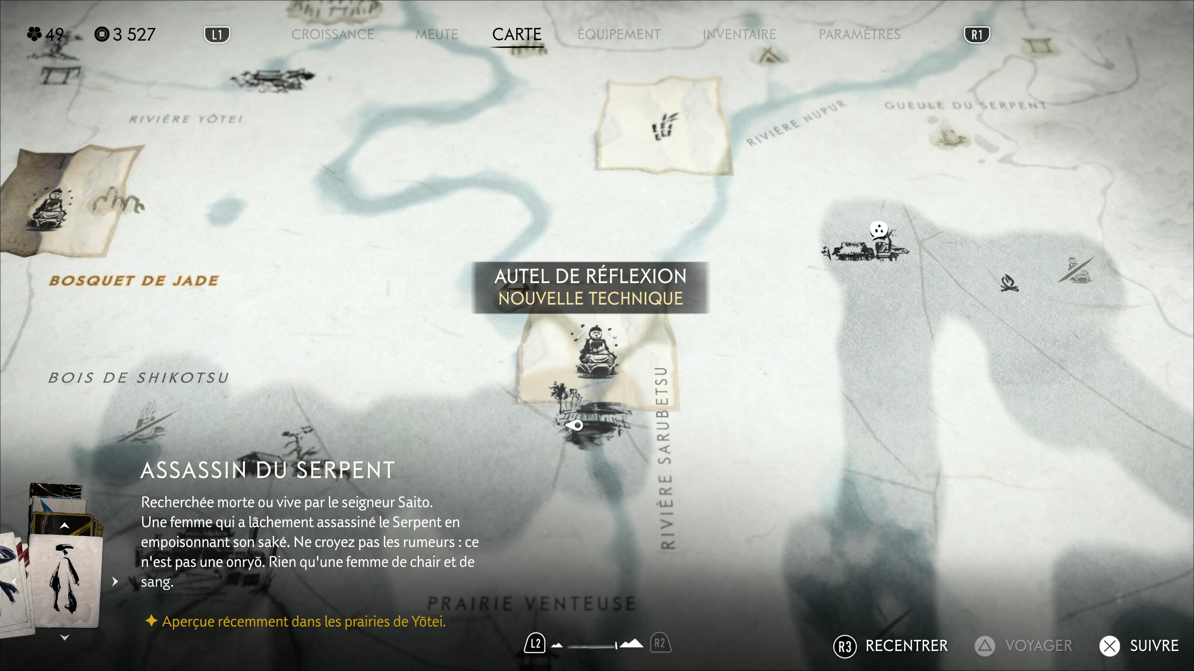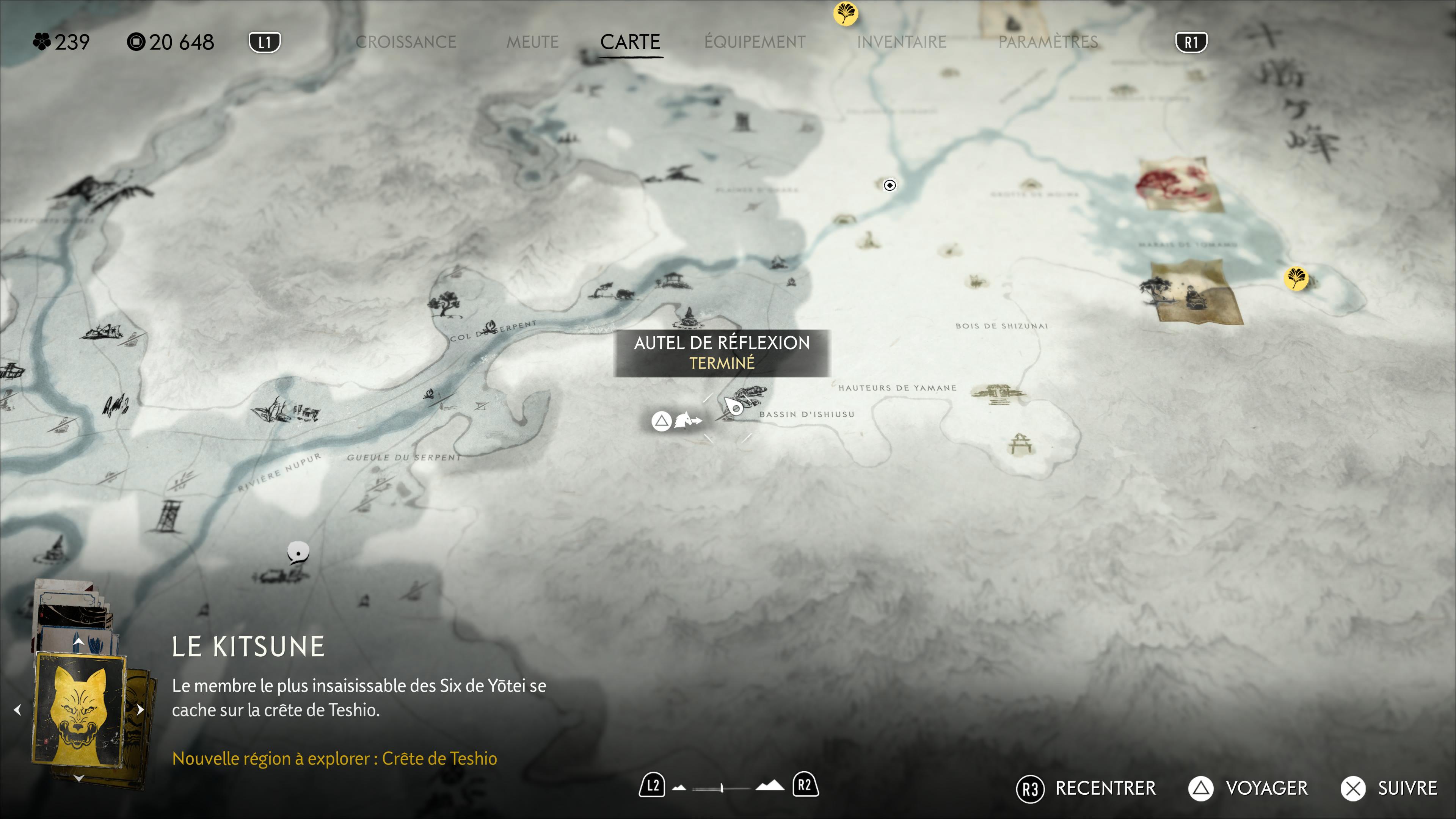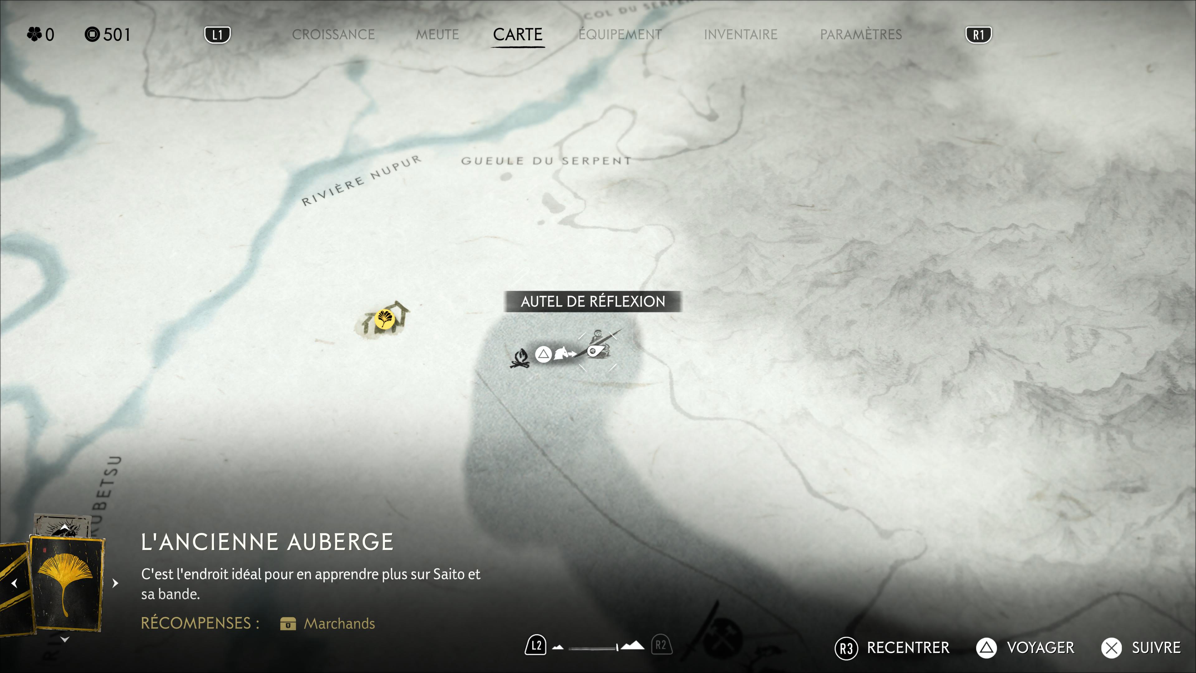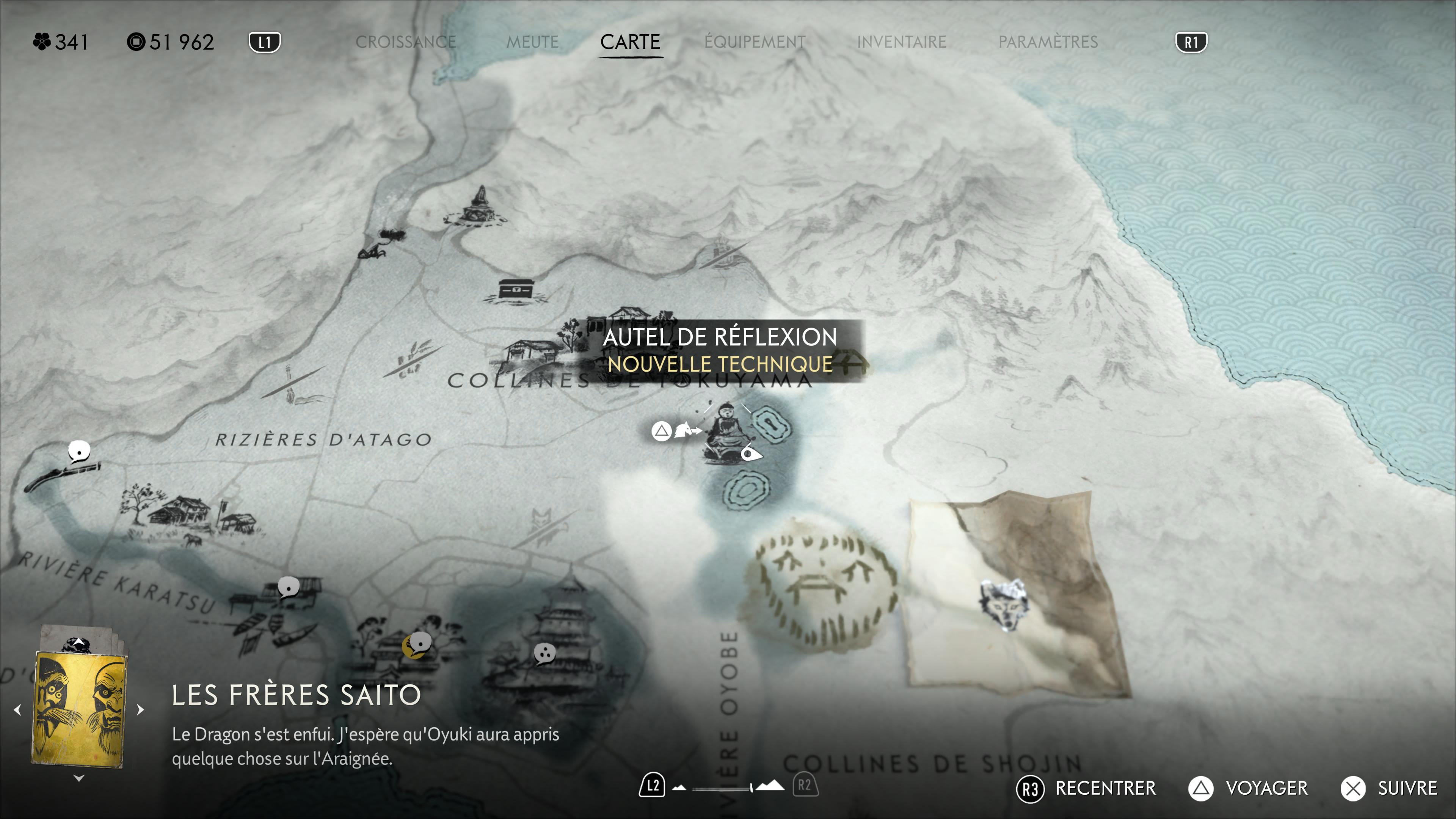 Cachés derrière une cascade, érigés au sommet d’une colline, ou bien en récompense d’un camp des Six de Yōtei libéré, les autels de réflexion sont nombreux et très utiles. À chaque fois que vous vous inclinez devant en glissant votre doigt vers le bas du pavé tactile de la DualSense, vous avez la possibilité de débloquer une compétence de votre choix.