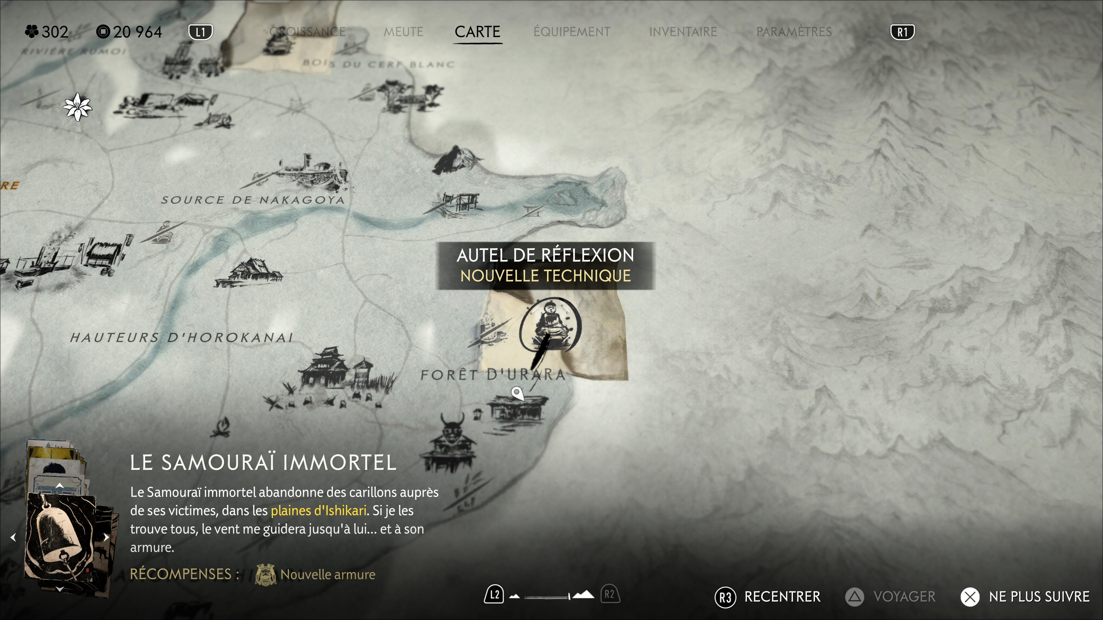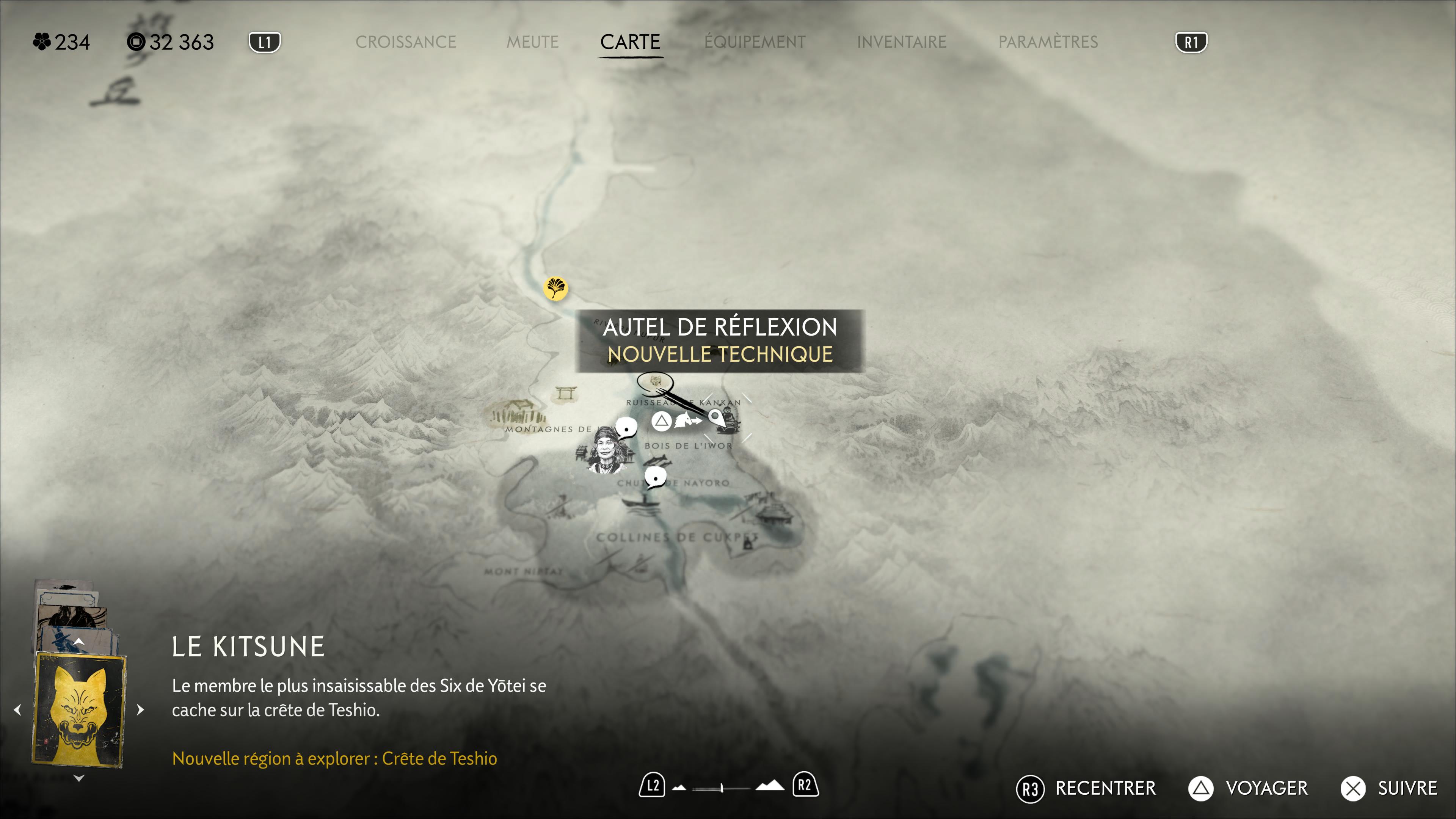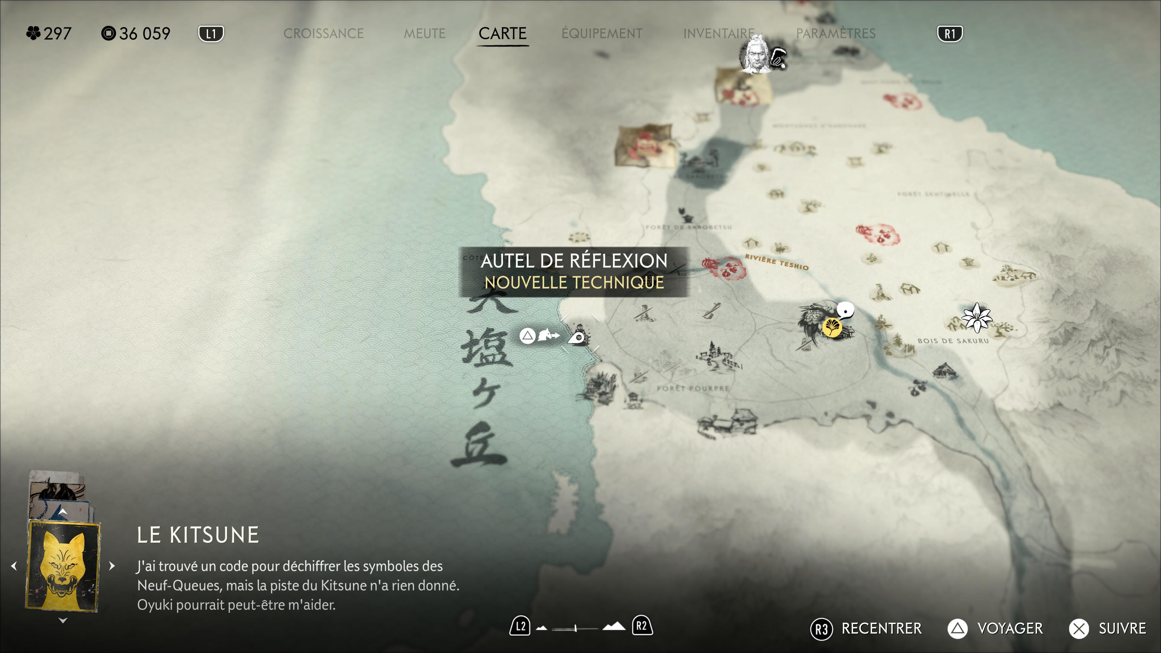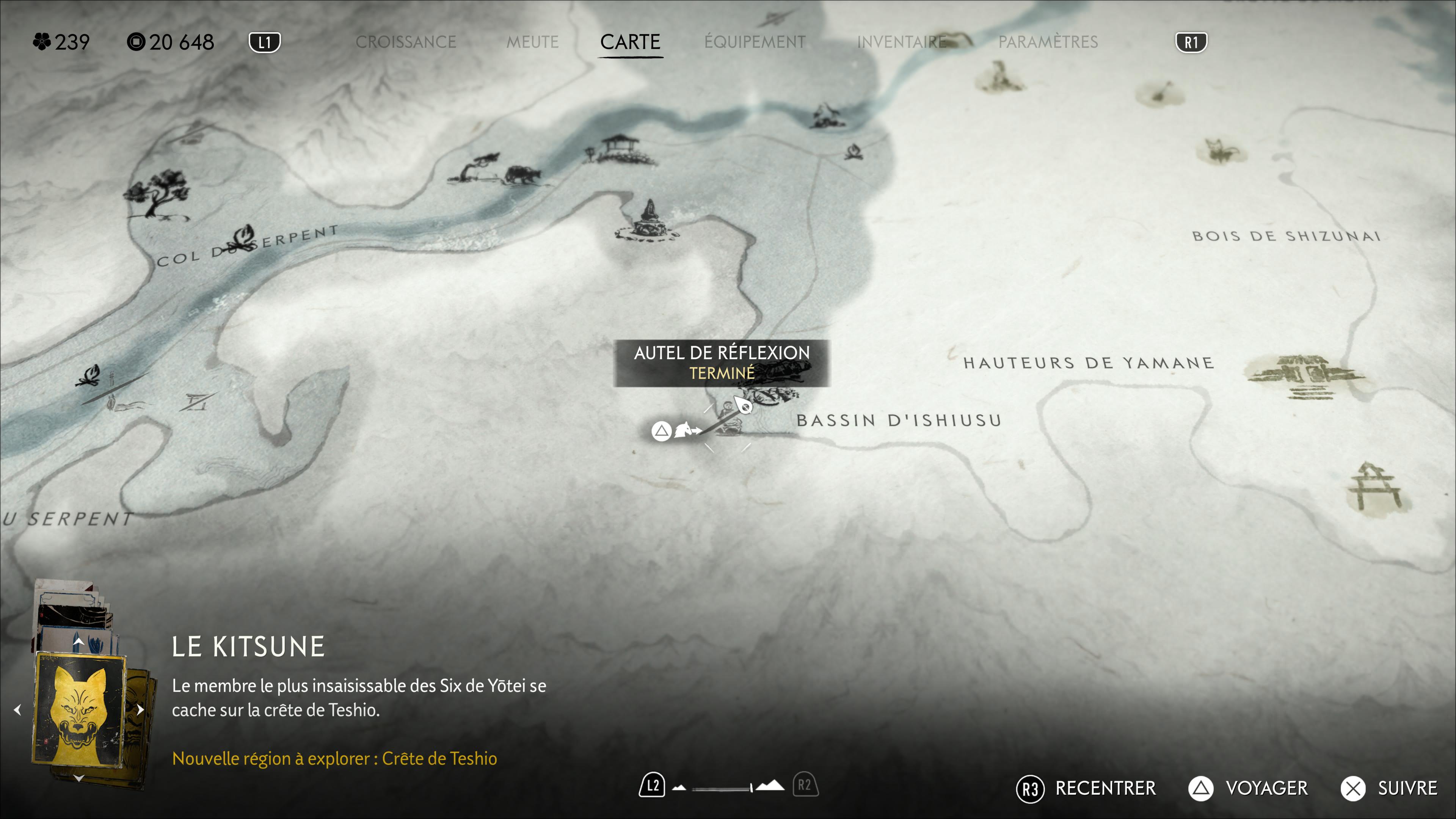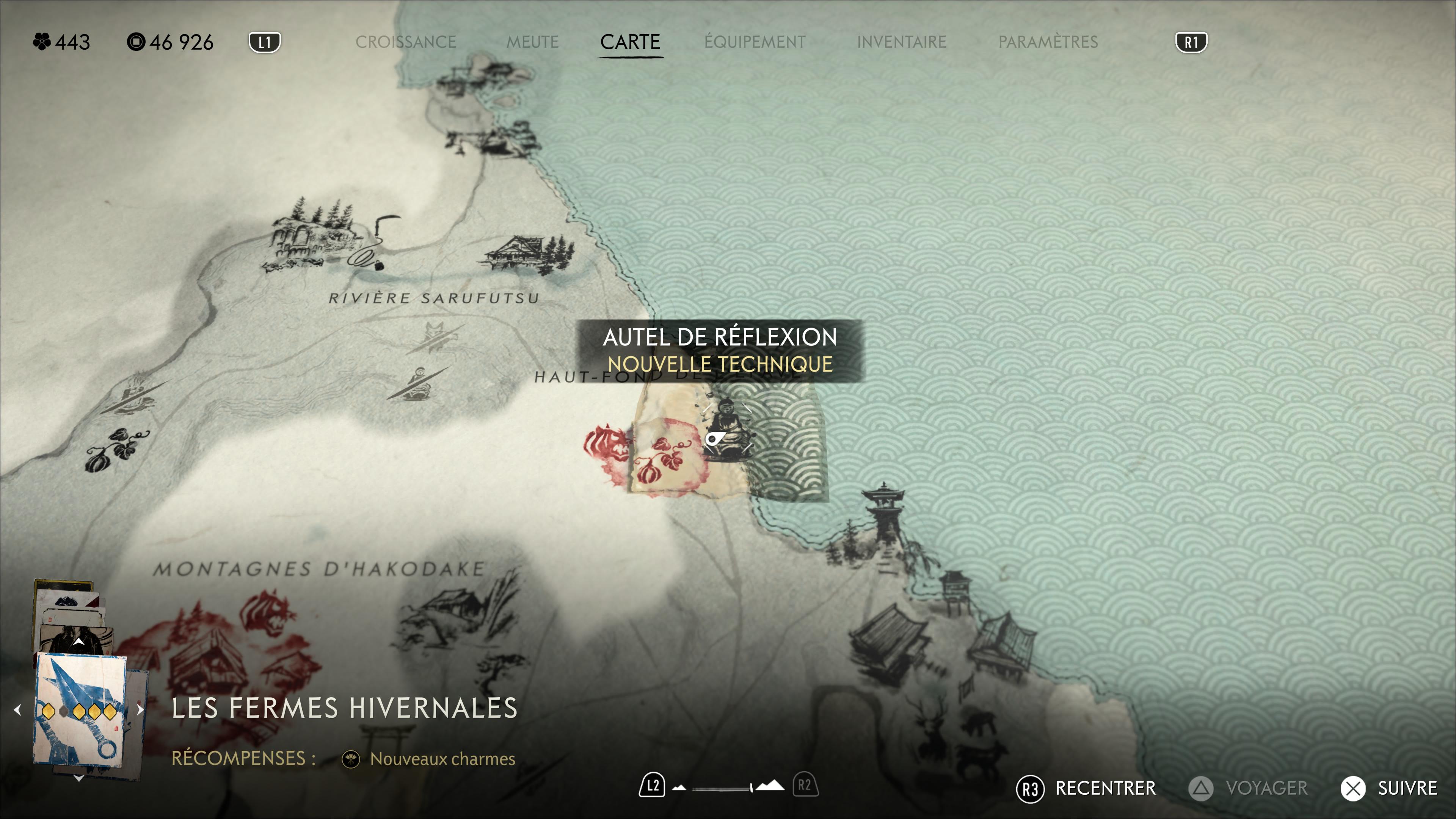 Cachés derrière une cascade, érigés au sommet d’une colline, ou bien en récompense d’un camp des Six de Yōtei libéré, les autels de réflexion sont nombreux et très utiles. À chaque fois que vous vous inclinez devant en glissant votre doigt vers le bas du pavé tactile de la DualSense, vous avez la possibilité de débloquer une compétence de votre choix.