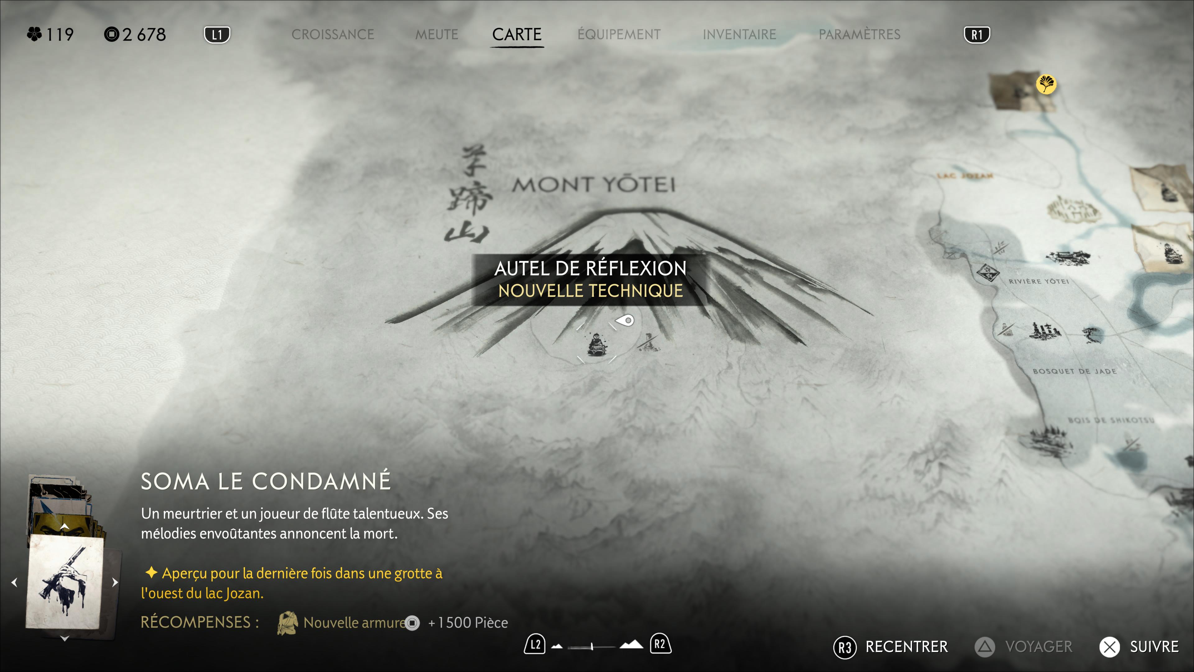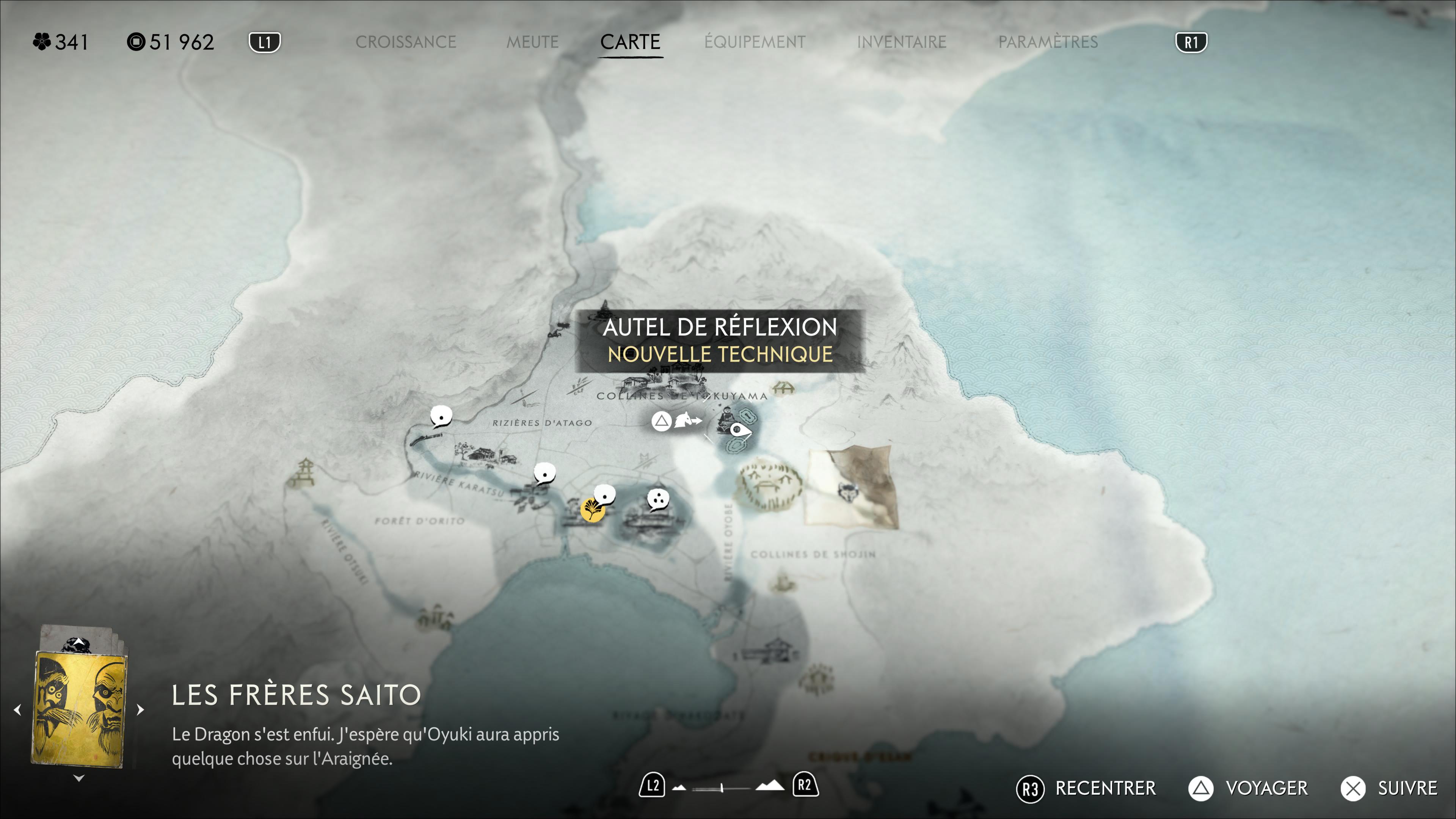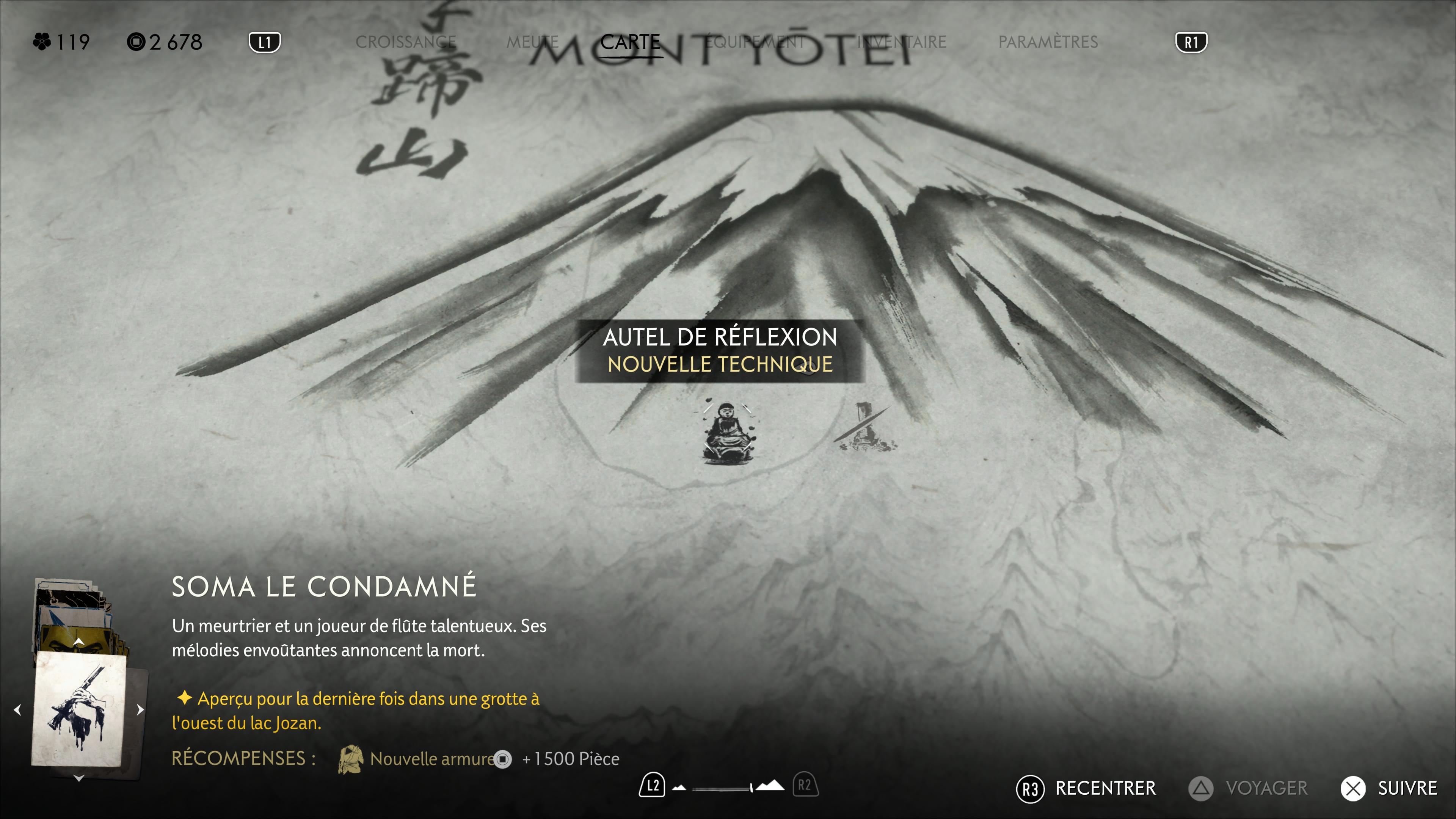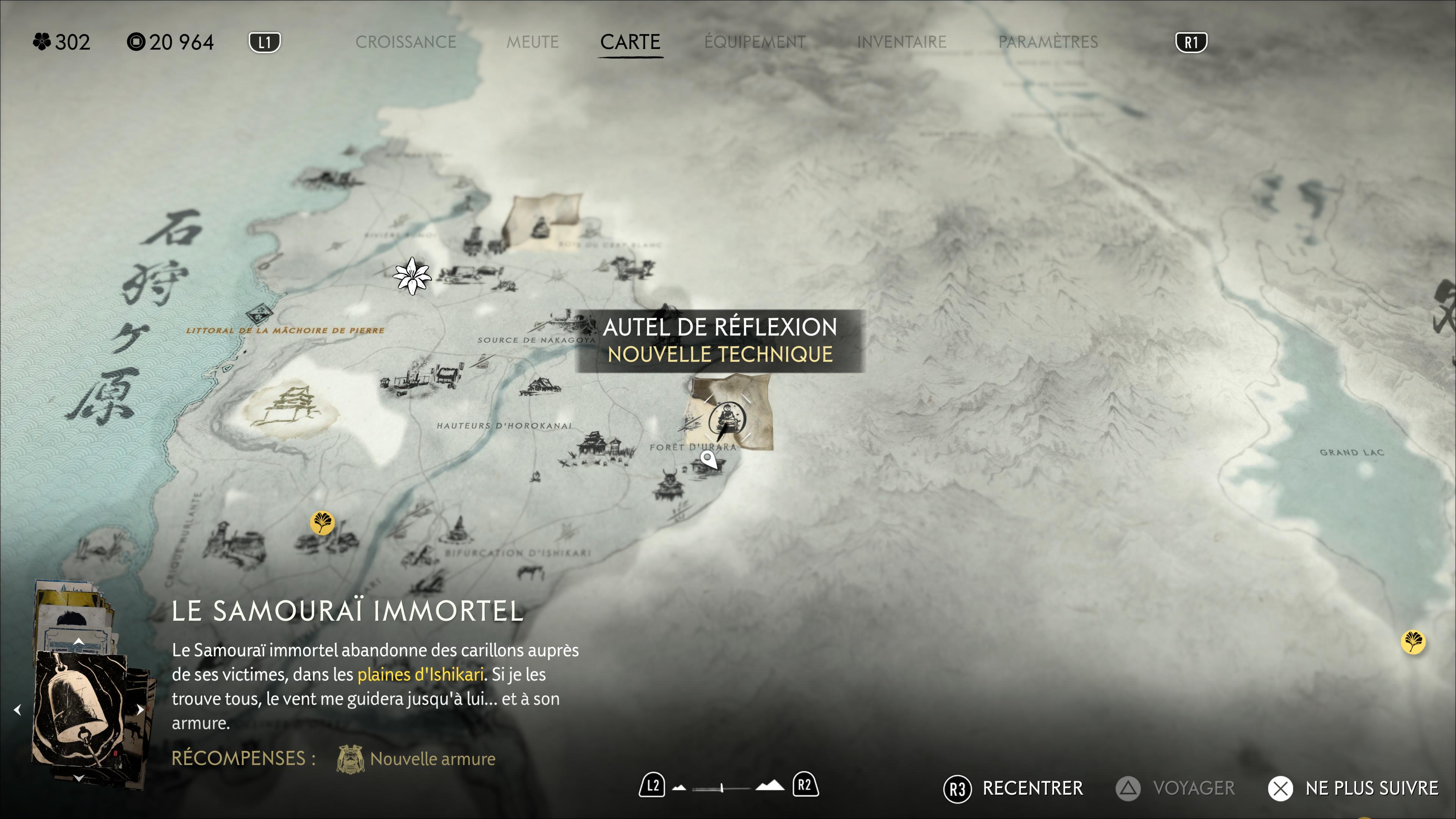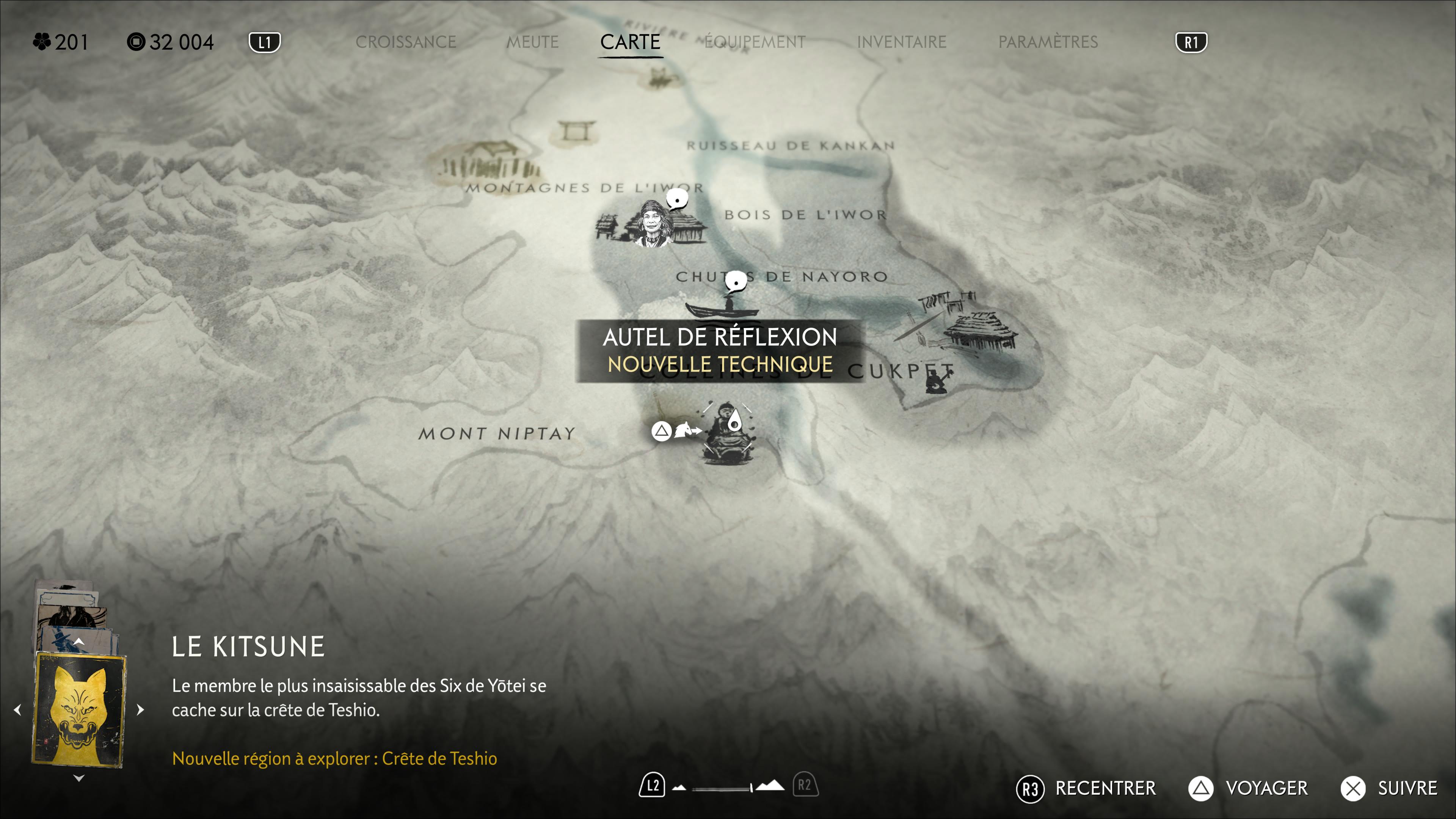Cachés derrière une cascade, érigés au sommet d’une colline, ou bien en récompense d’un camp des Six de Yōtei libéré, les autels de réflexion sont nombreux et très utiles. À chaque fois que vous vous inclinez devant en glissant votre doigt vers le bas du pavé tactile de la DualSense, vous avez la possibilité de débloquer une compétence de votre choix.