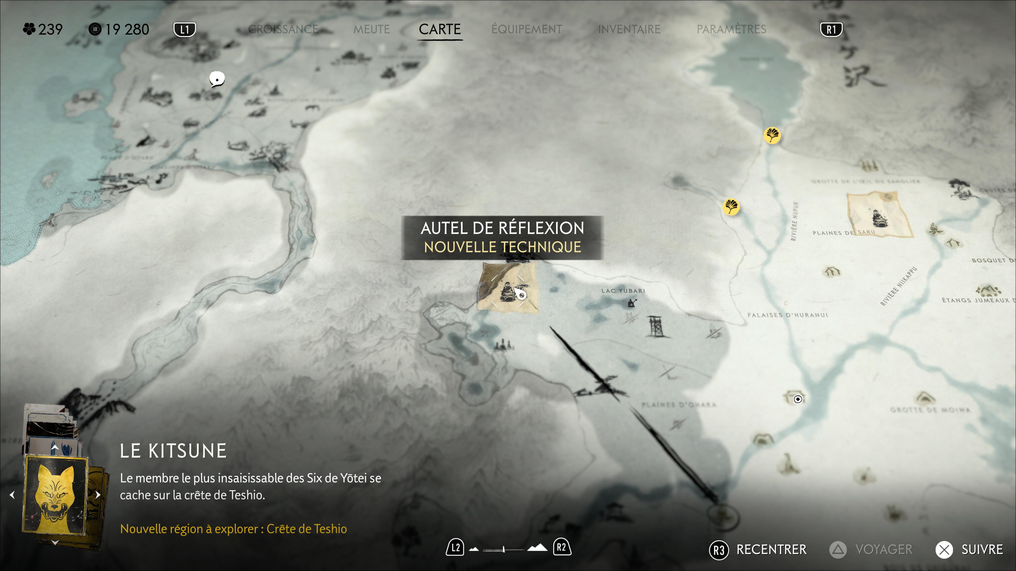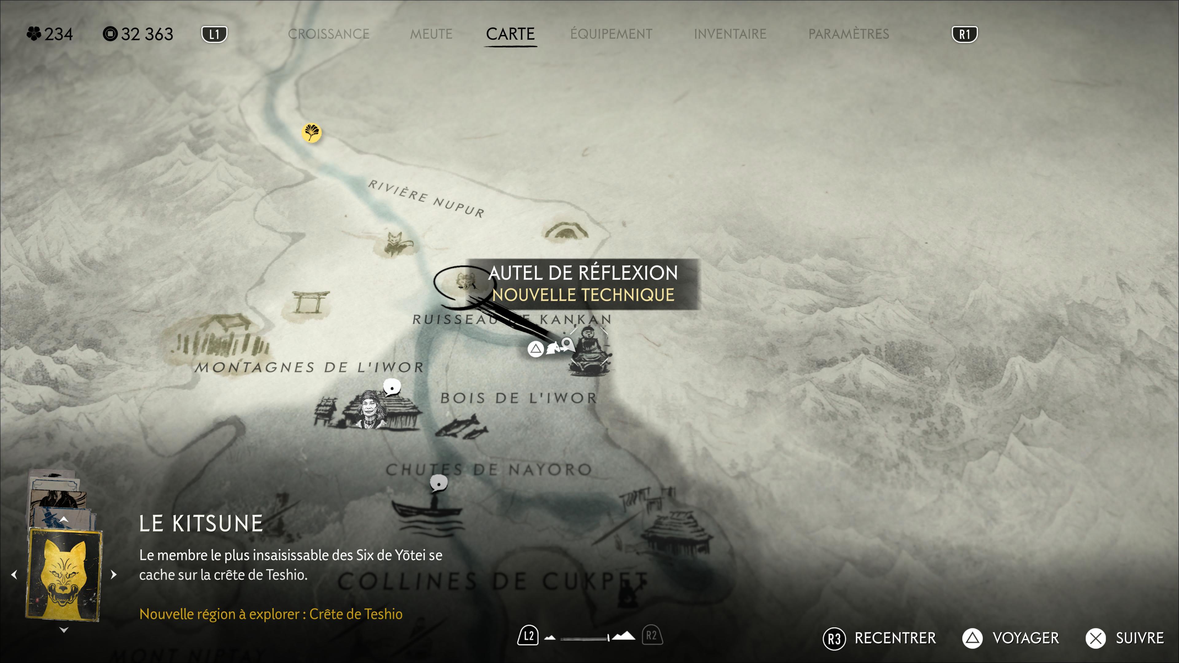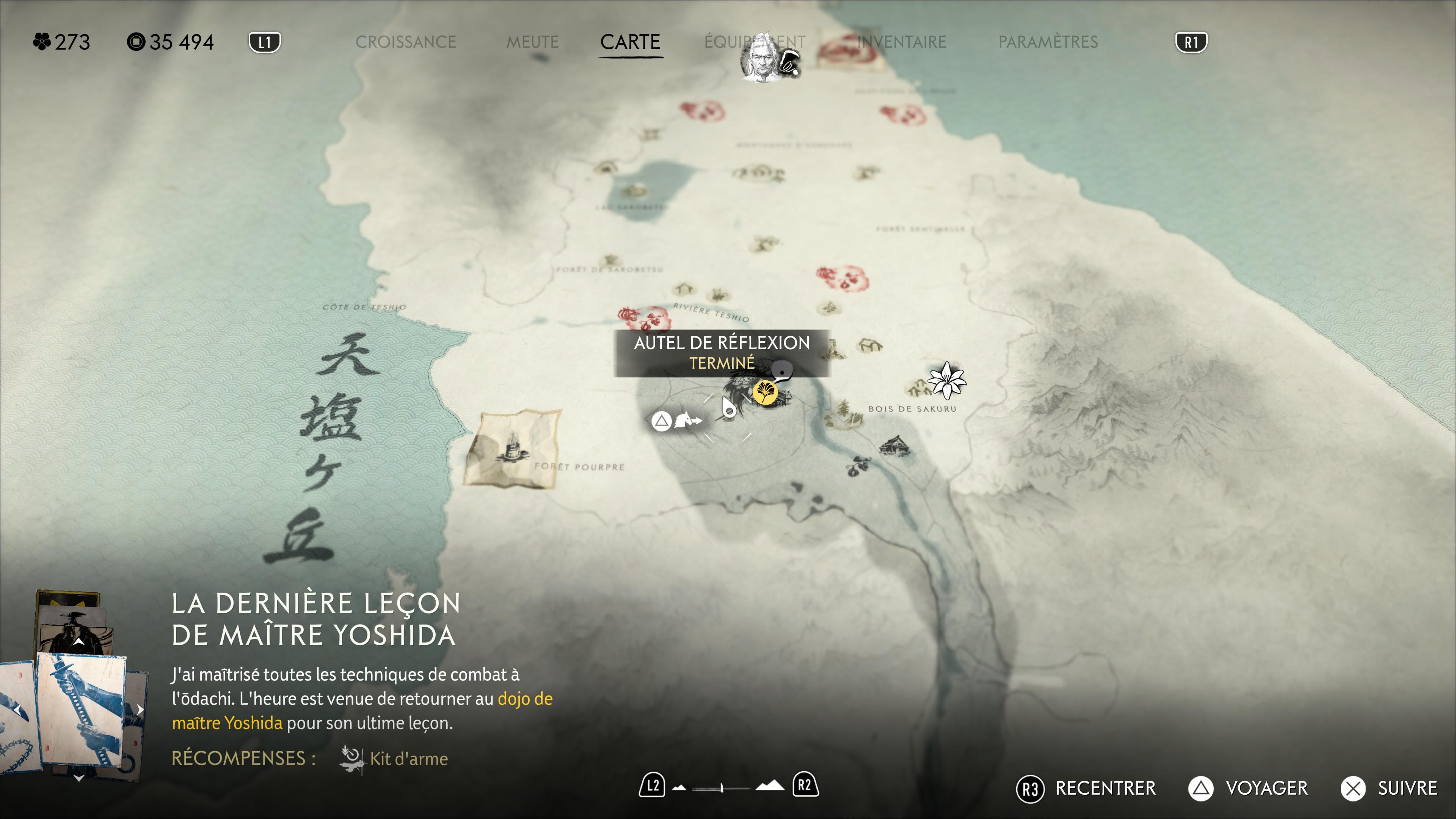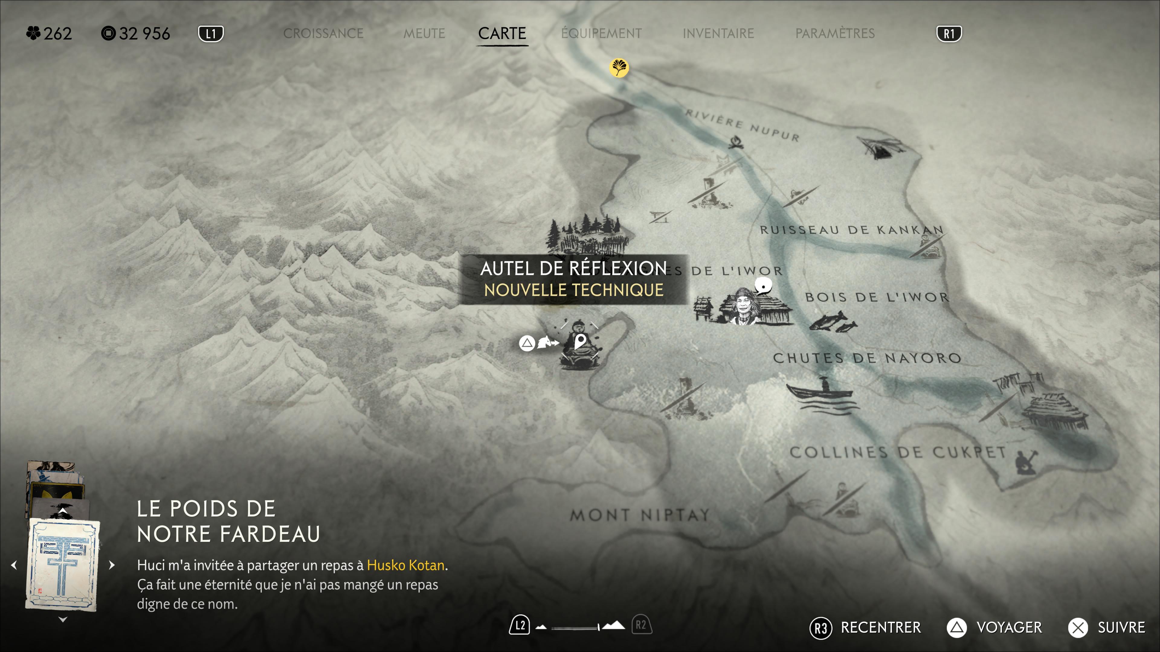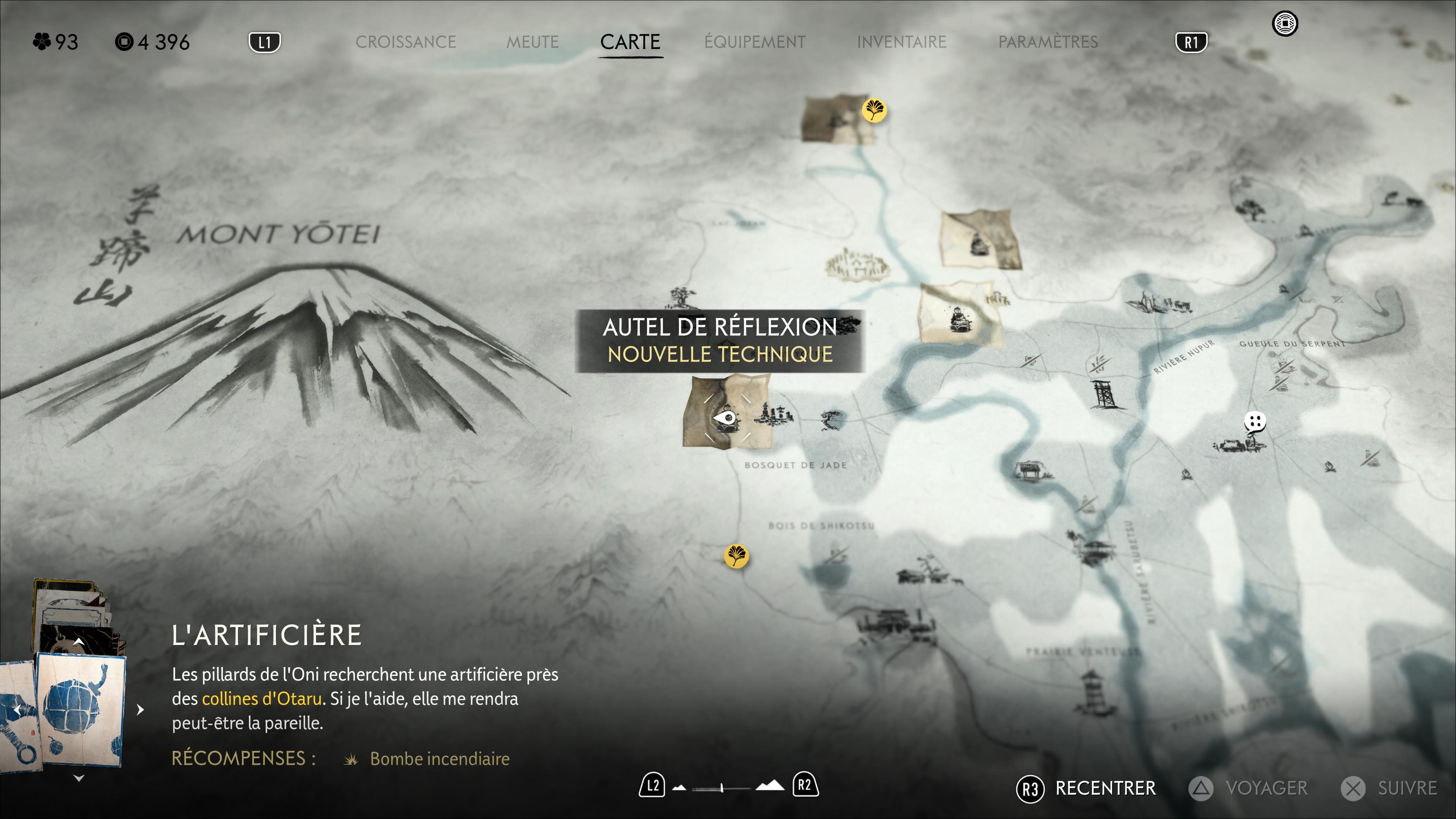 Cachés derrière une cascade, érigés au sommet d’une colline, ou bien en récompense d’un camp des Six de Yōtei libéré, les autels de réflexion sont nombreux et très utiles. À chaque fois que vous vous inclinez devant en glissant votre doigt vers le bas du pavé tactile de la DualSense, vous avez la possibilité de débloquer une compétence de votre choix.