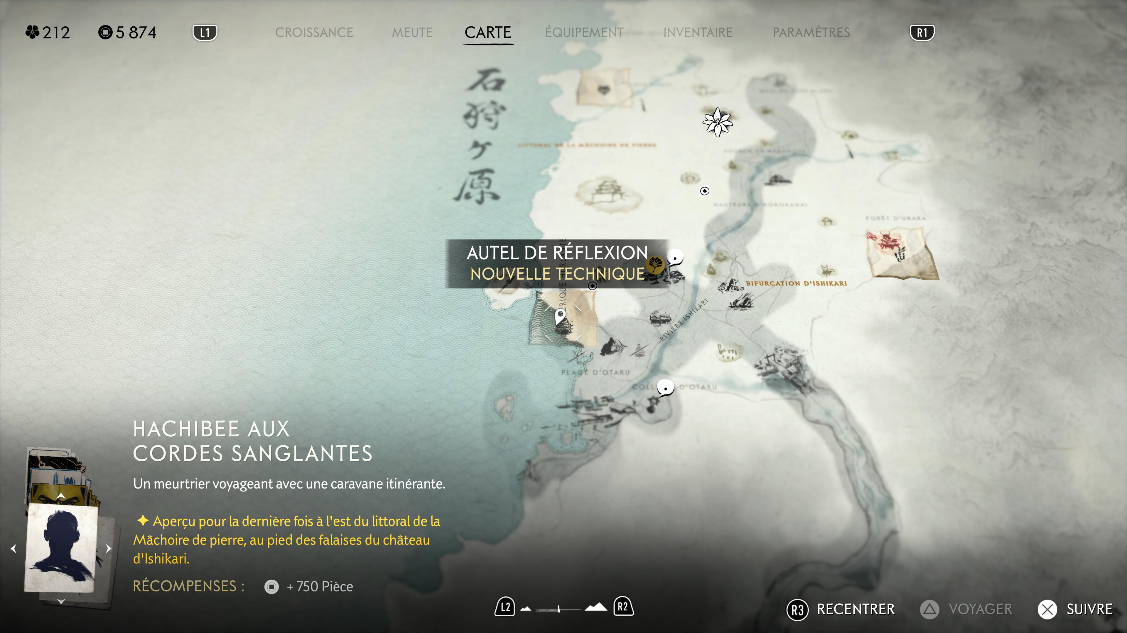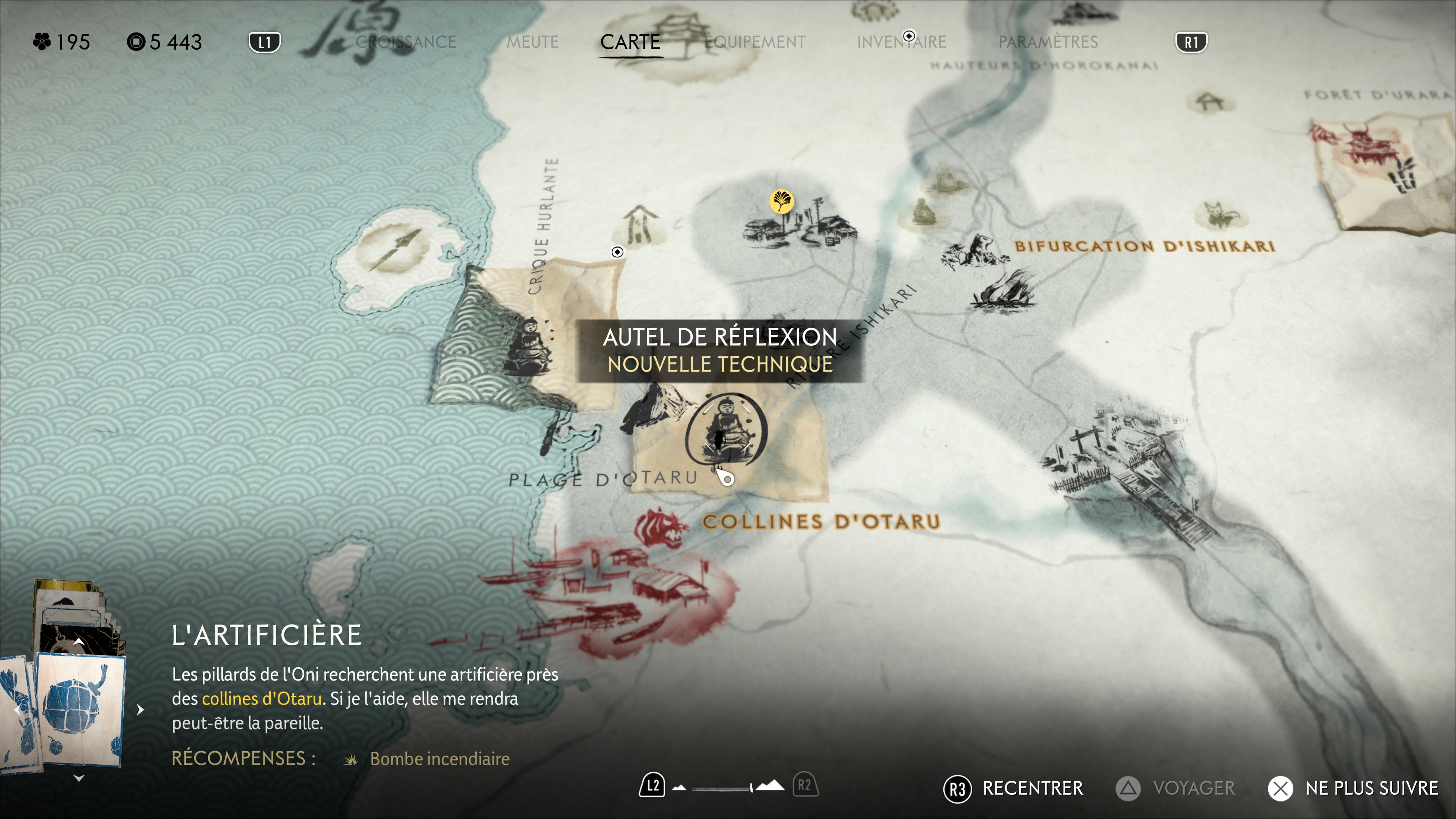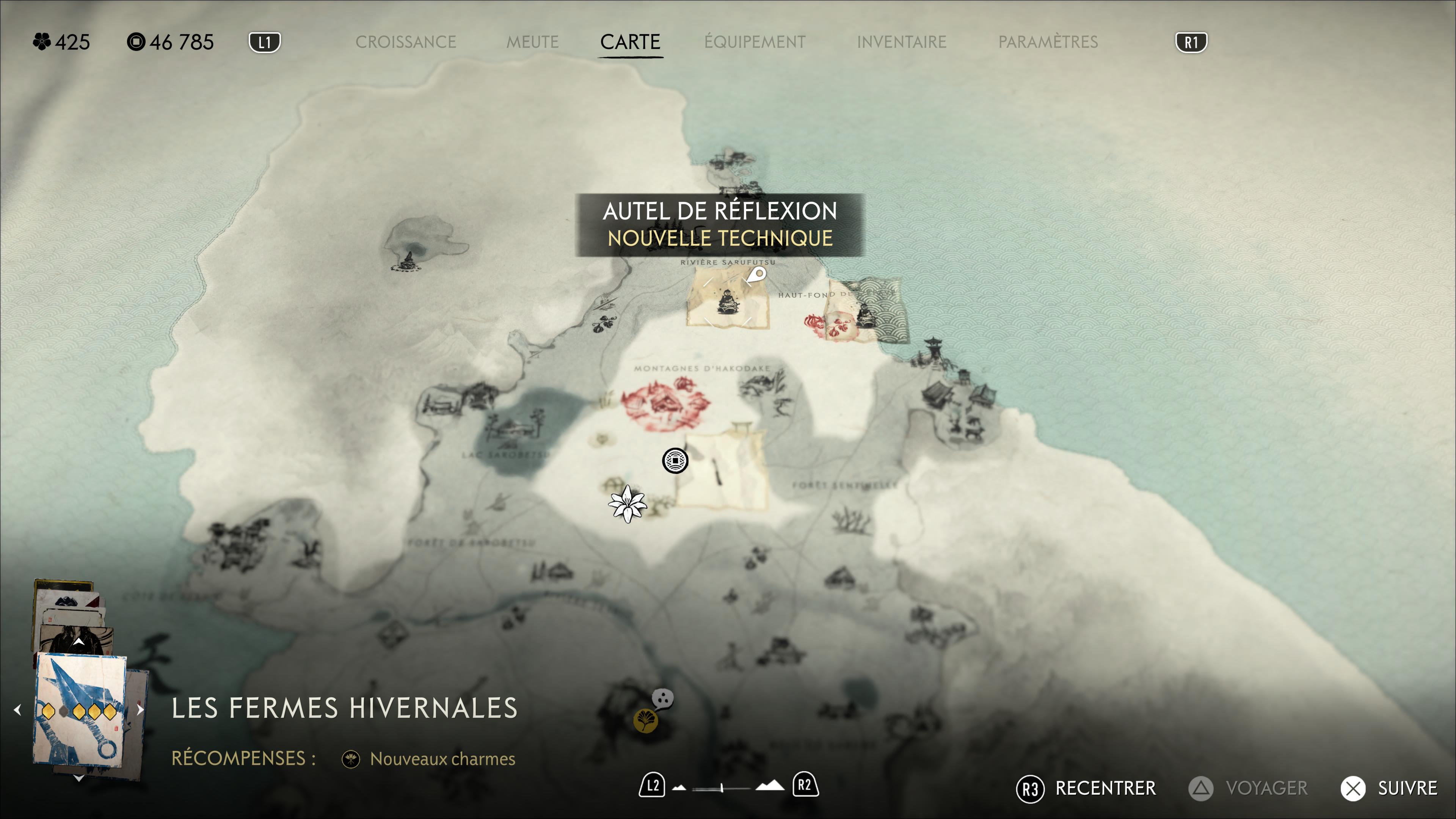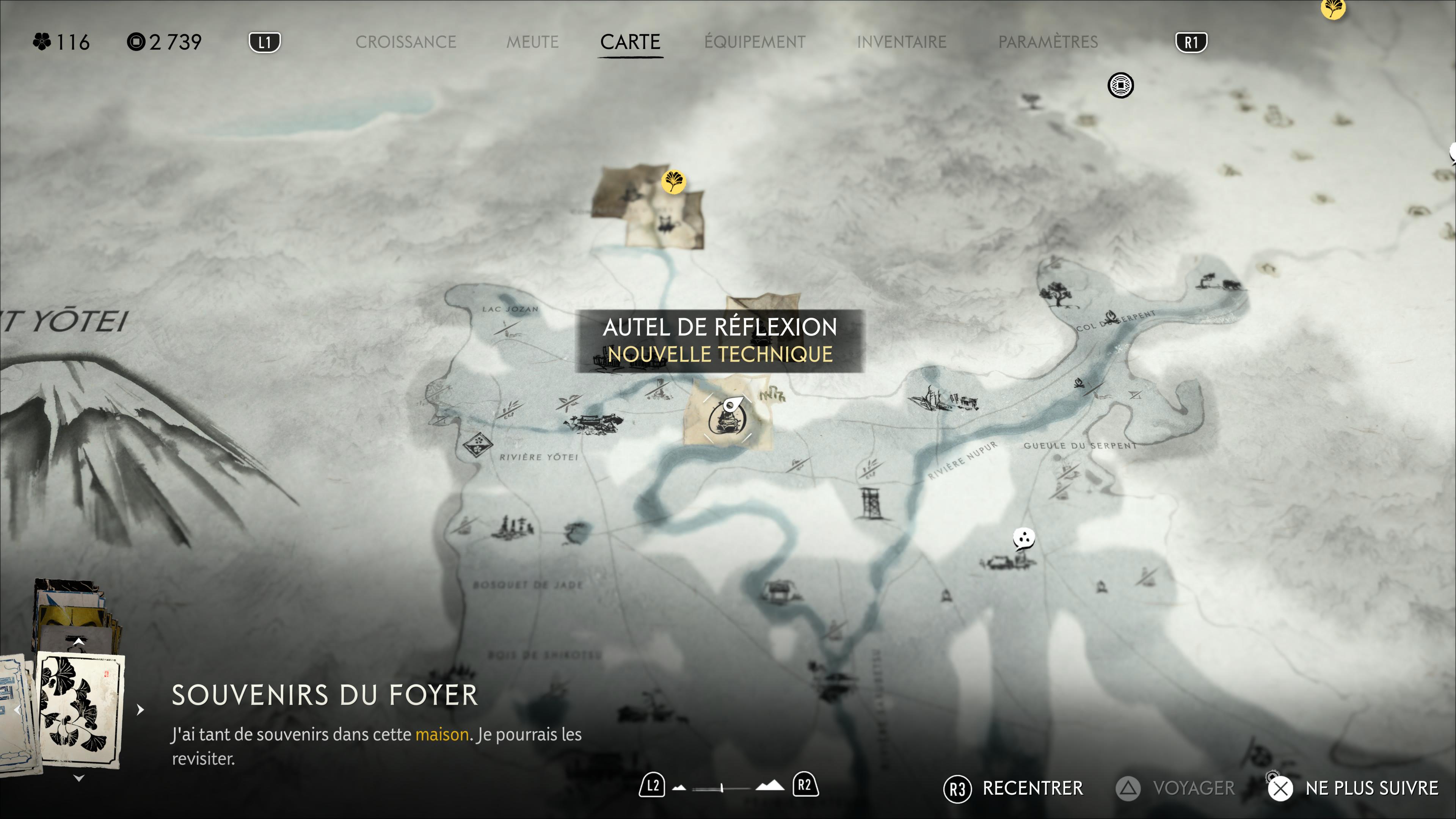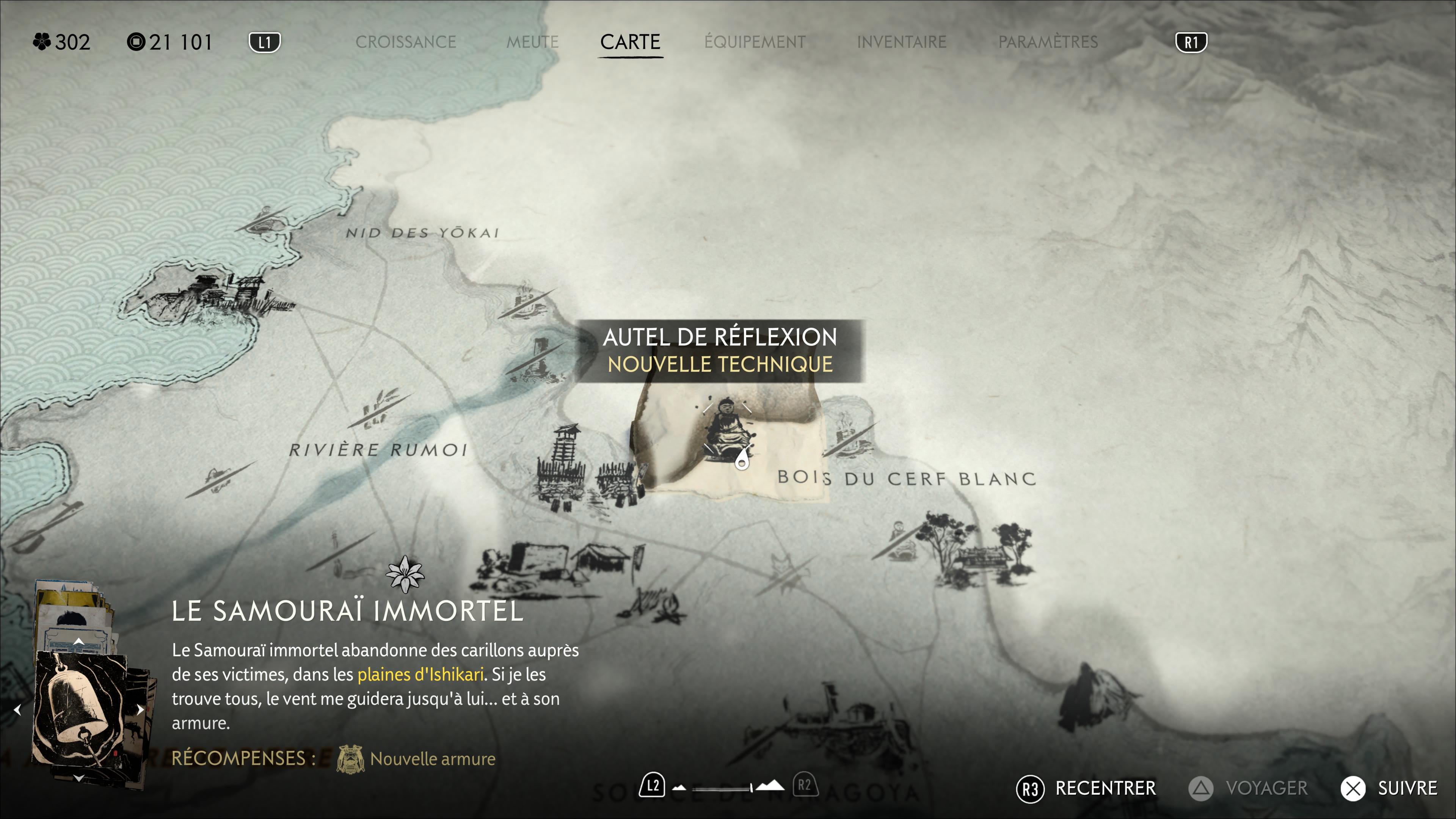 Cachés derrière une cascade, érigés au sommet d’une colline, ou bien en récompense d’un camp des Six de Yōtei libéré, les autels de réflexion sont nombreux et très utiles. À chaque fois que vous vous inclinez devant en glissant votre doigt vers le bas du pavé tactile de la DualSense, vous avez la possibilité de débloquer une compétence de votre choix.