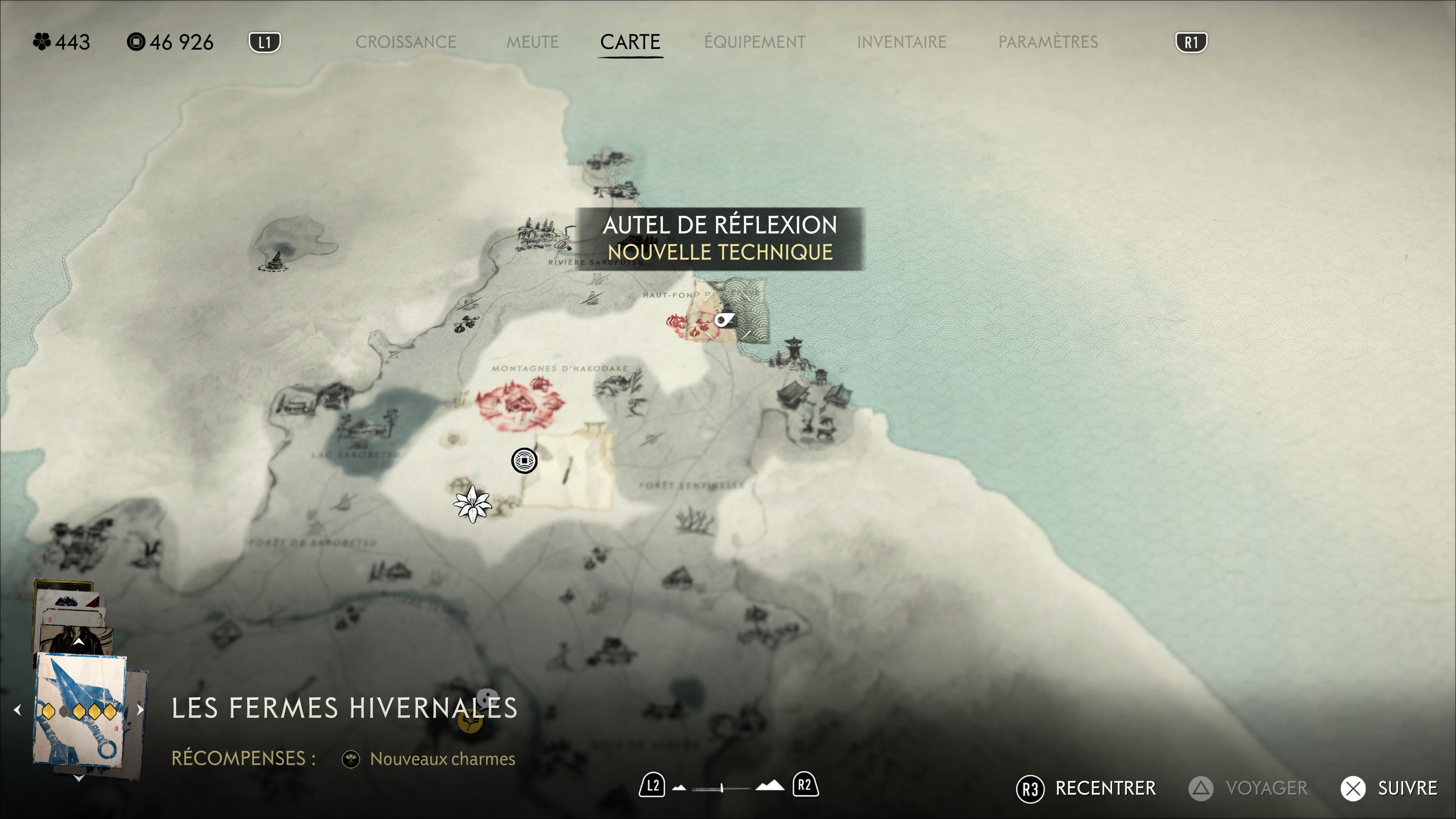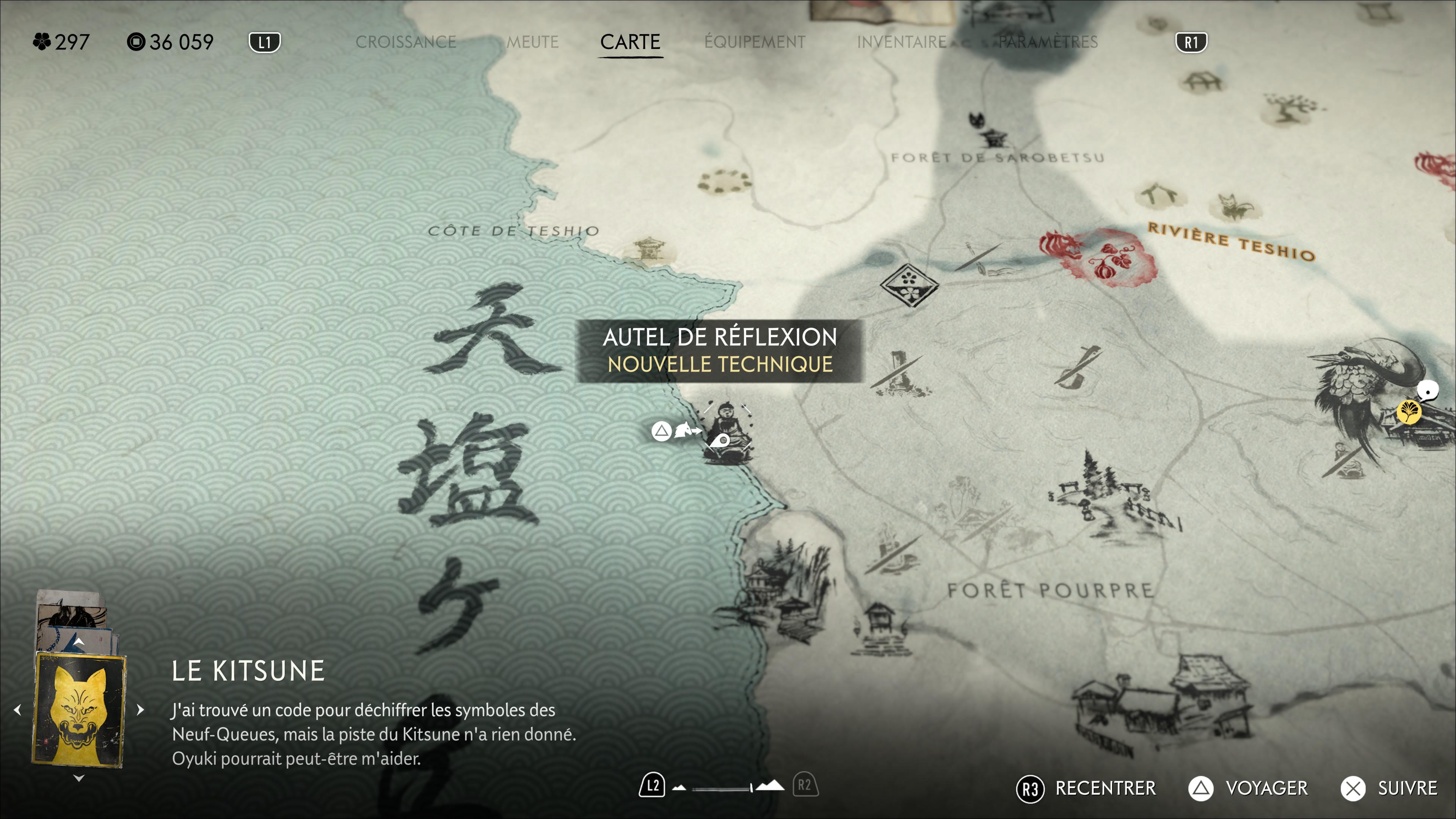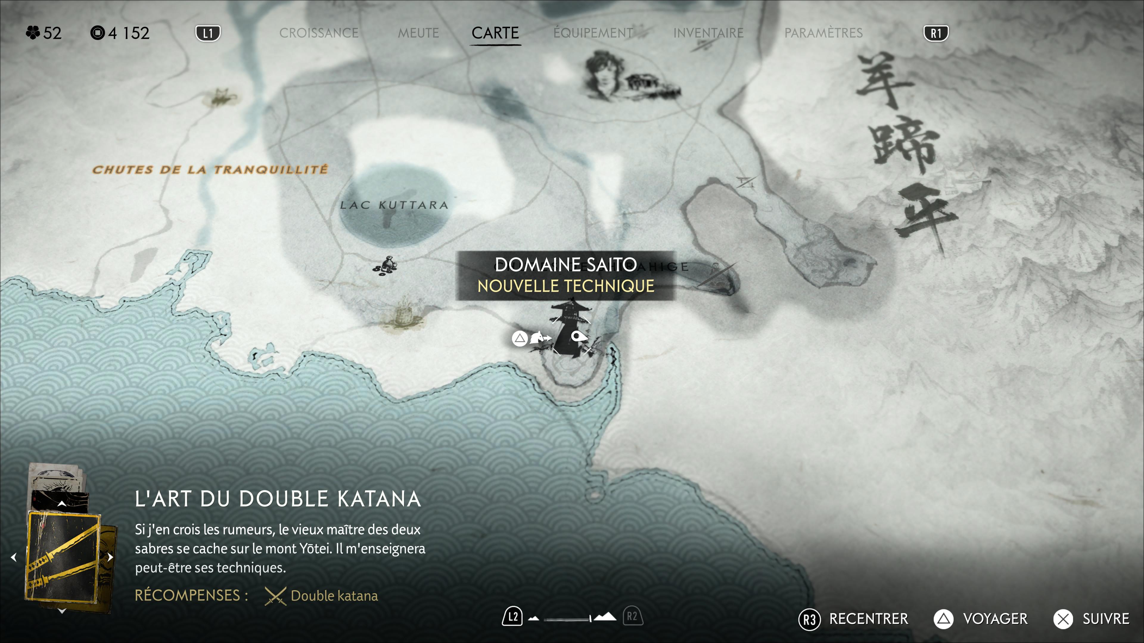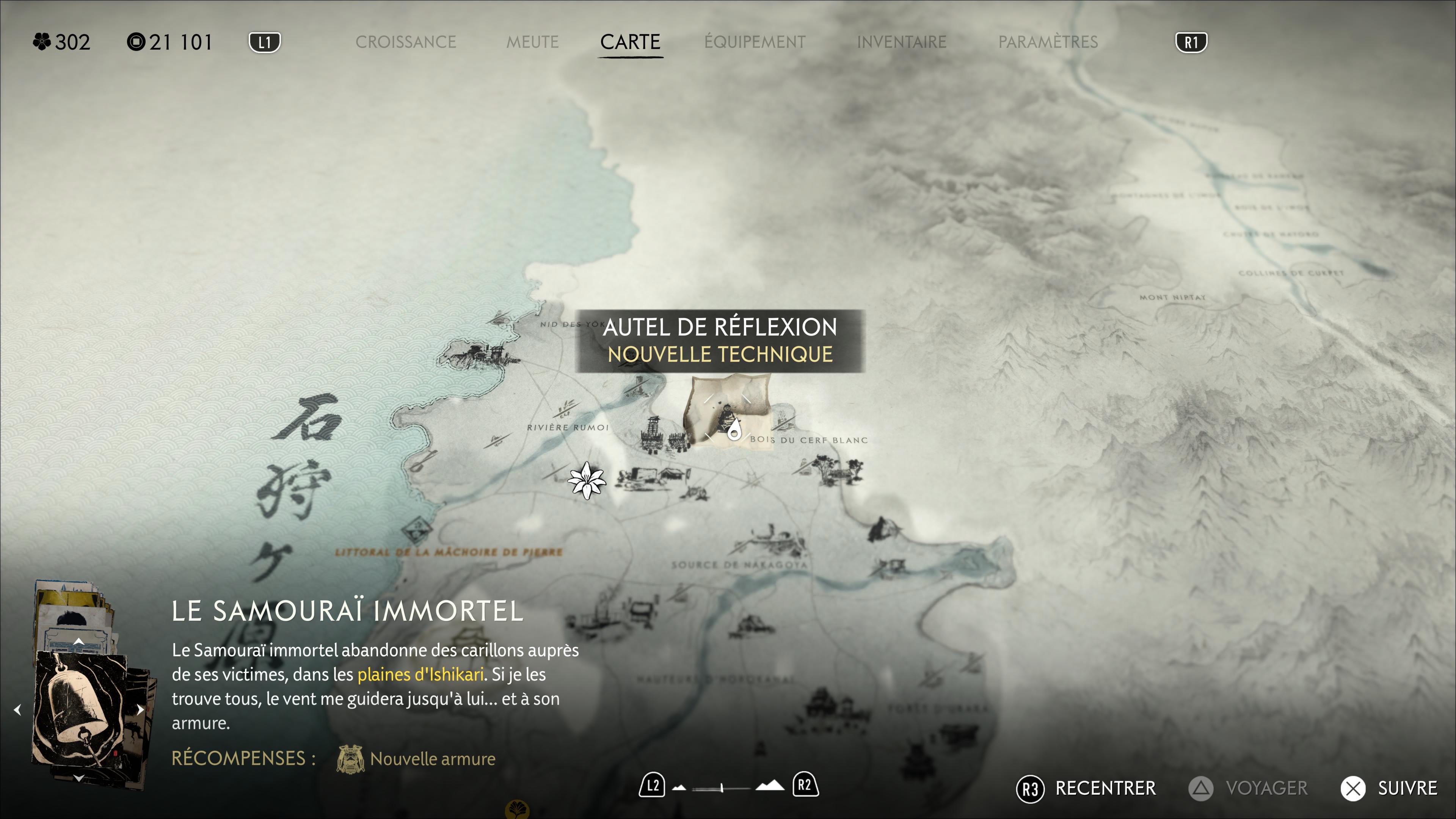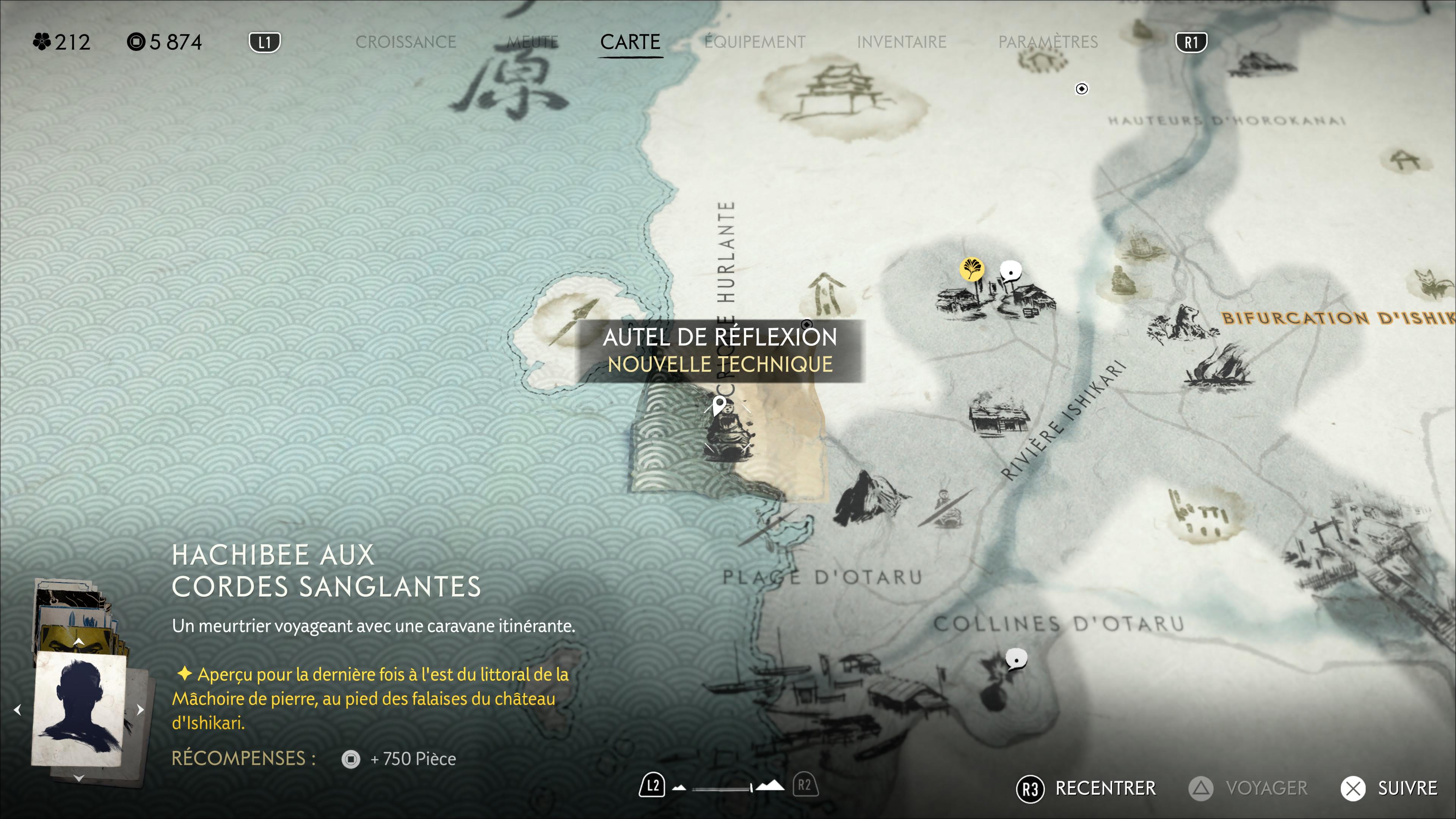 Cachés derrière une cascade, érigés au sommet d’une colline, ou bien en récompense d’un camp des Six de Yōtei libéré, les autels de réflexion sont nombreux et très utiles. À chaque fois que vous vous inclinez devant en glissant votre doigt vers le bas du pavé tactile de la DualSense, vous avez la possibilité de débloquer une compétence de votre choix.