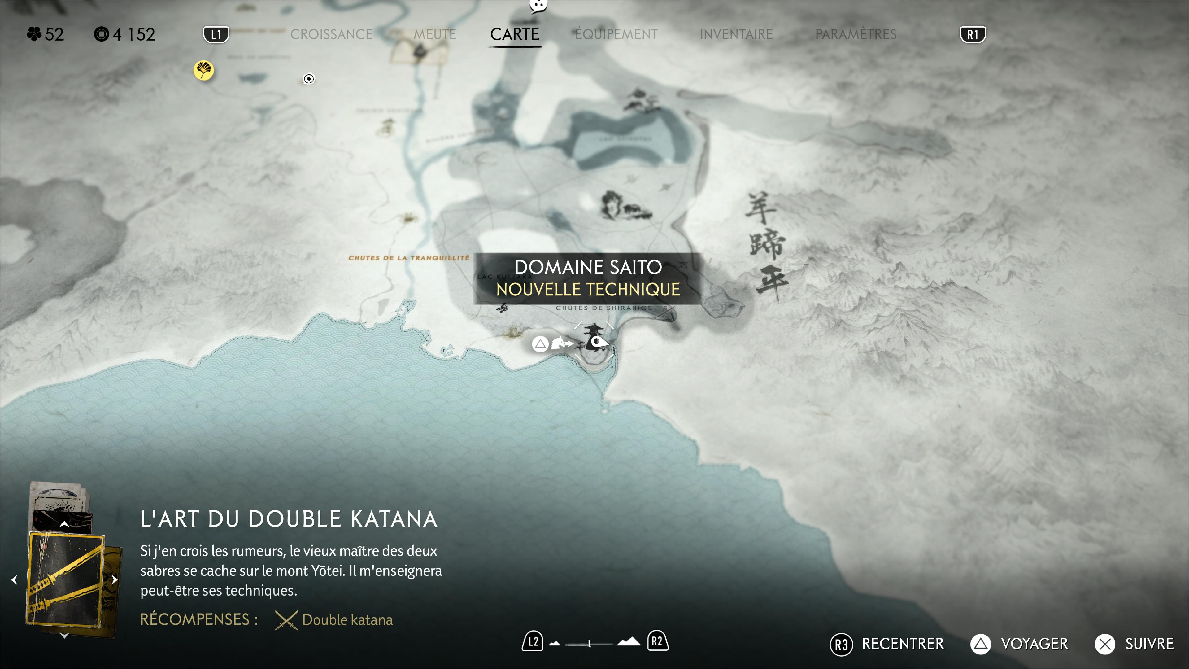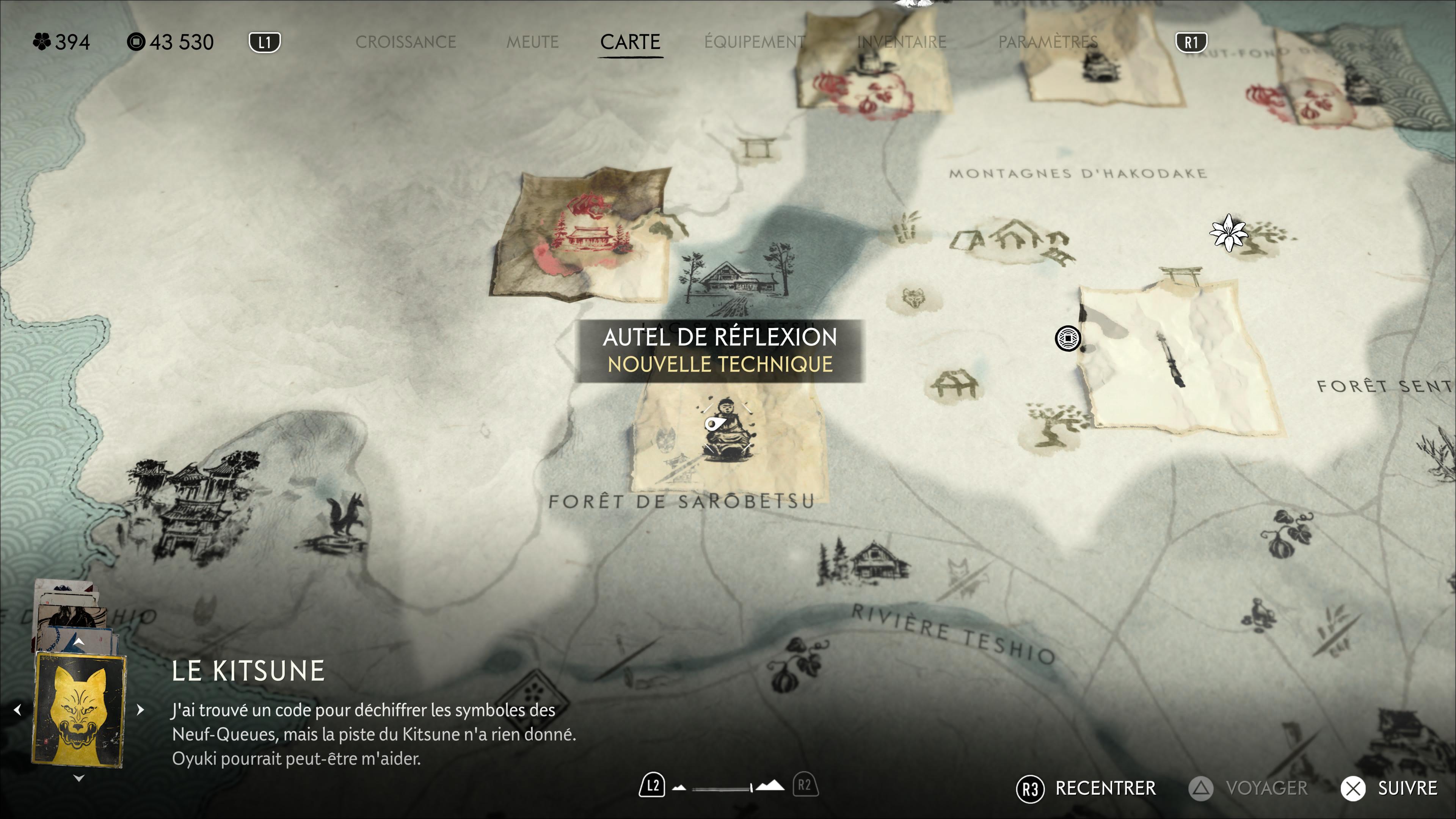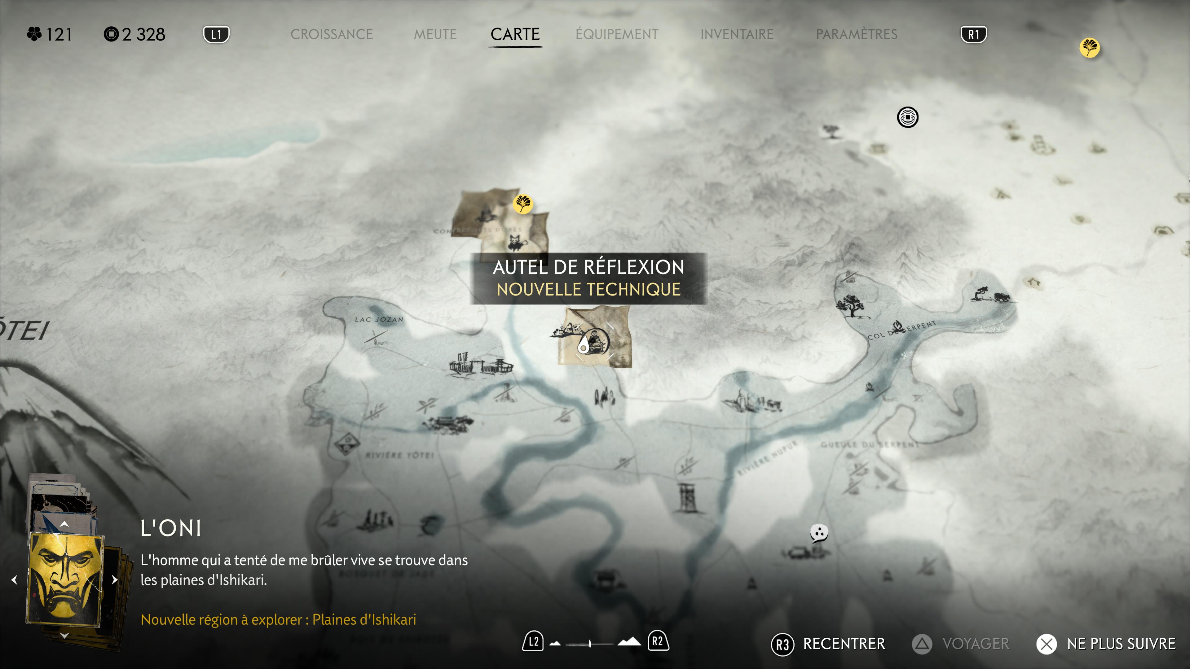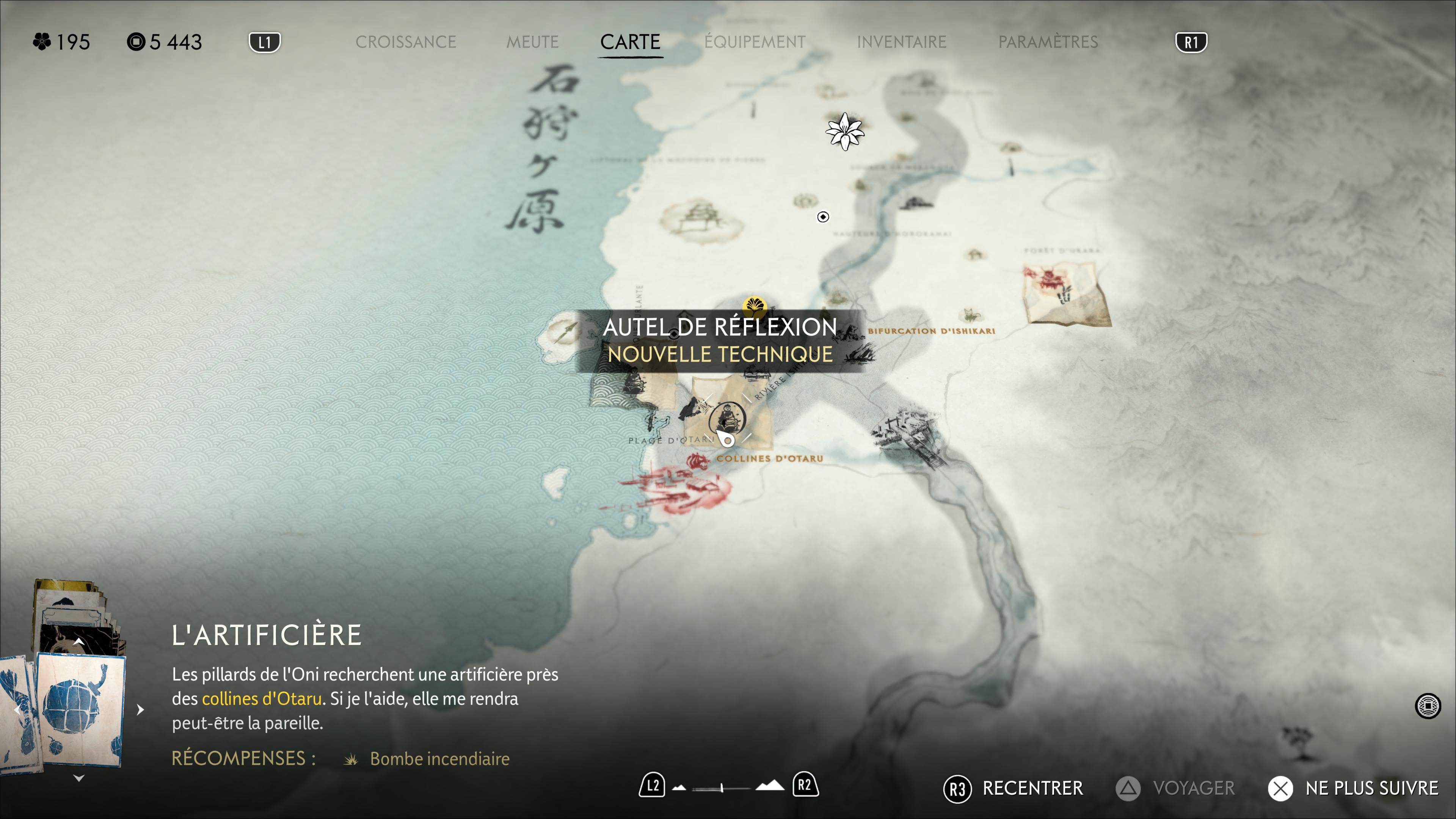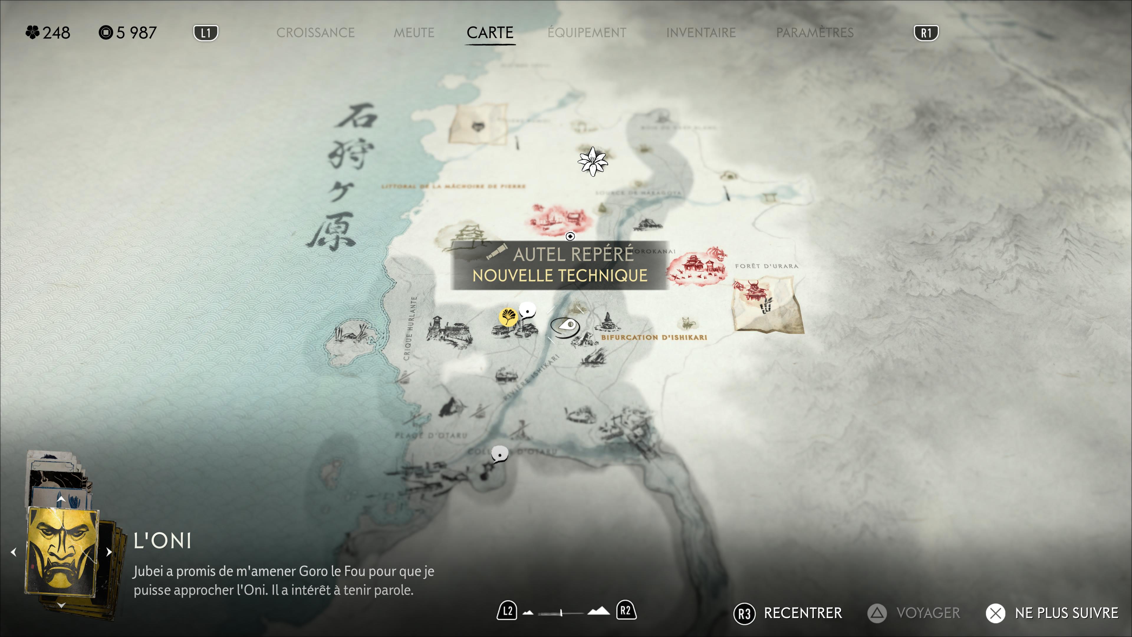 Cachés derrière une cascade, érigés au sommet d’une colline, ou bien en récompense d’un camp des Six de Yōtei libéré, les autels de réflexion sont nombreux et très utiles. À chaque fois que vous vous inclinez devant en glissant votre doigt vers le bas du pavé tactile de la DualSense, vous avez la possibilité de débloquer une compétence de votre choix.