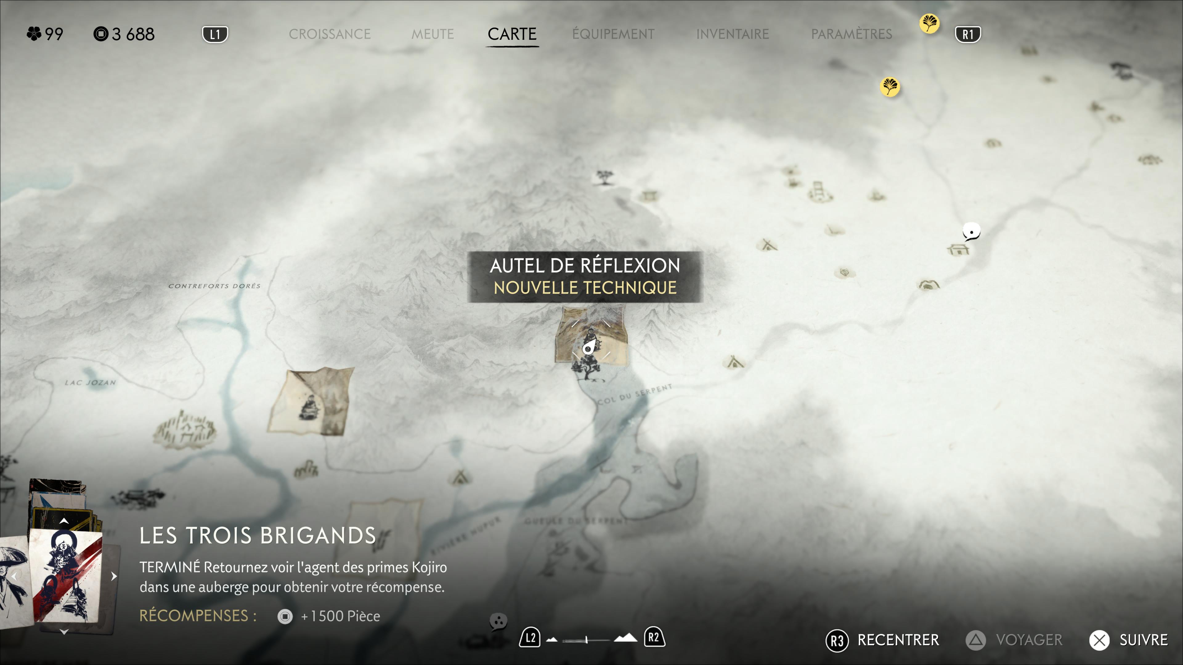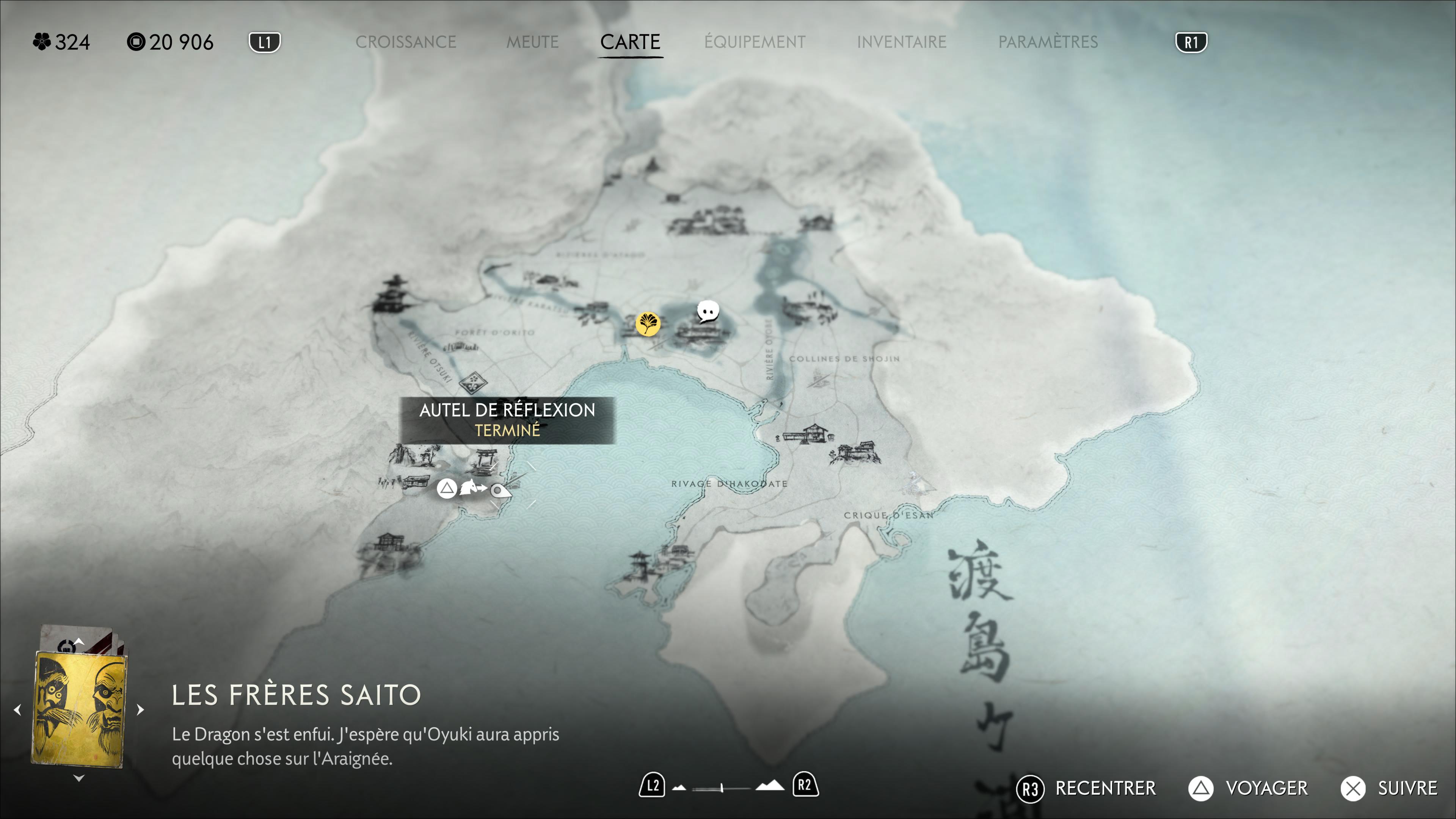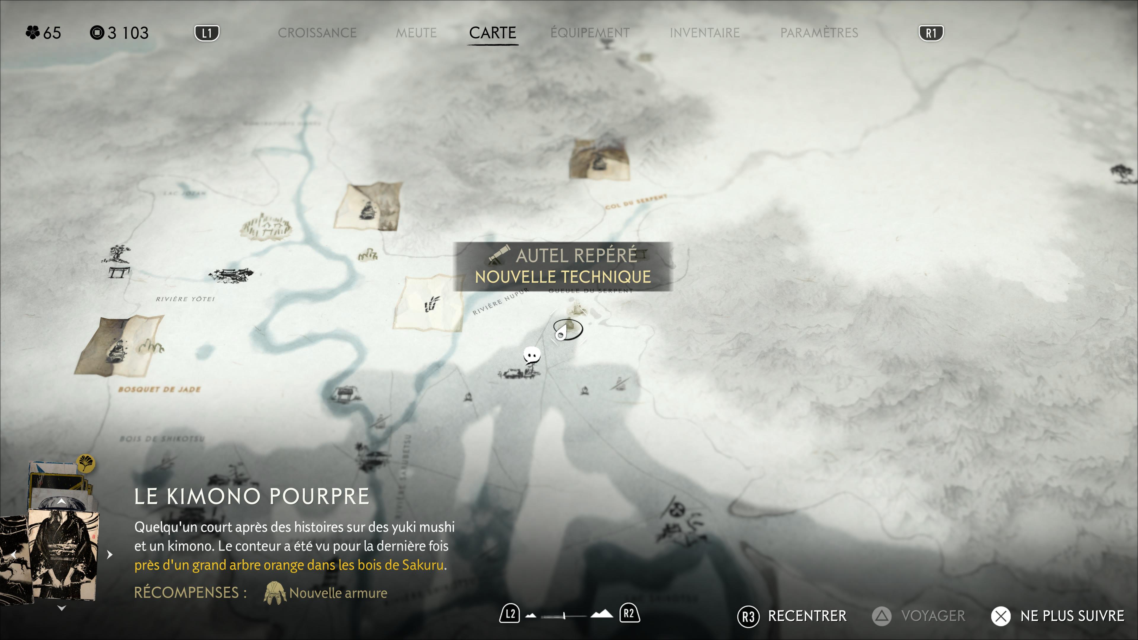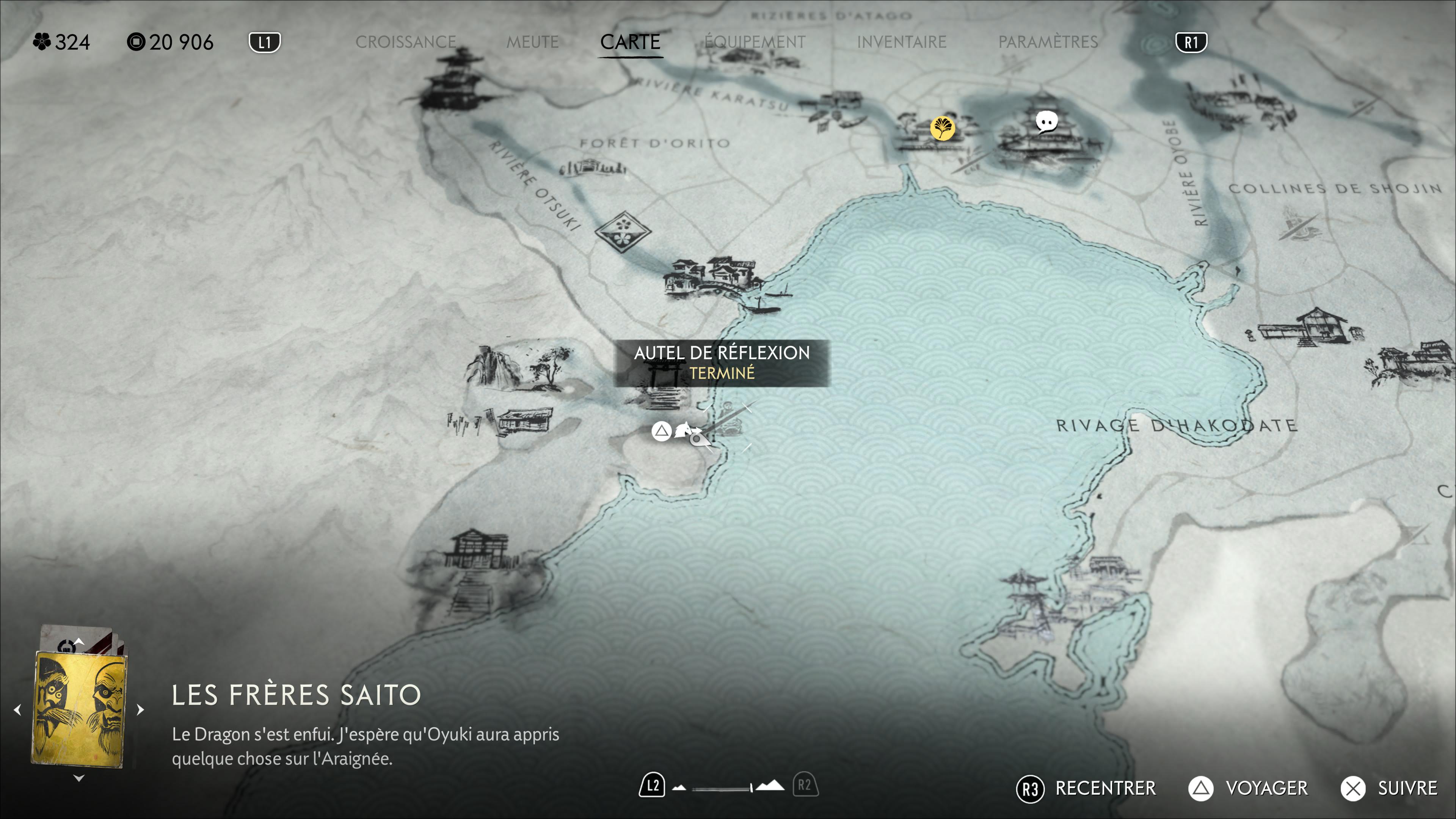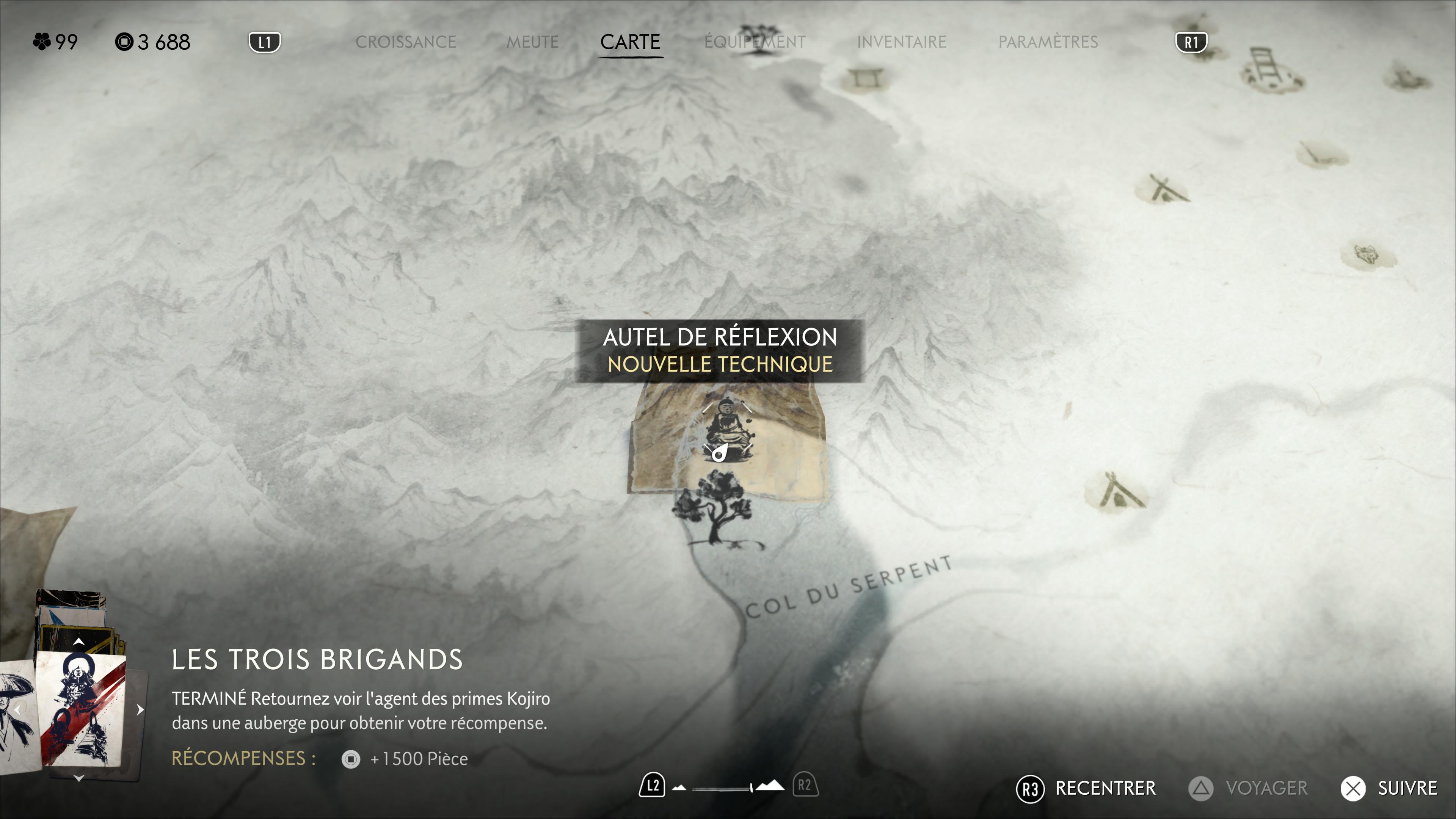 Cachés derrière une cascade, érigés au sommet d’une colline, ou bien en récompense d’un camp des Six de Yōtei libéré, les autels de réflexion sont nombreux et très utiles. À chaque fois que vous vous inclinez devant en glissant votre doigt vers le bas du pavé tactile de la DualSense, vous avez la possibilité de débloquer une compétence de votre choix.