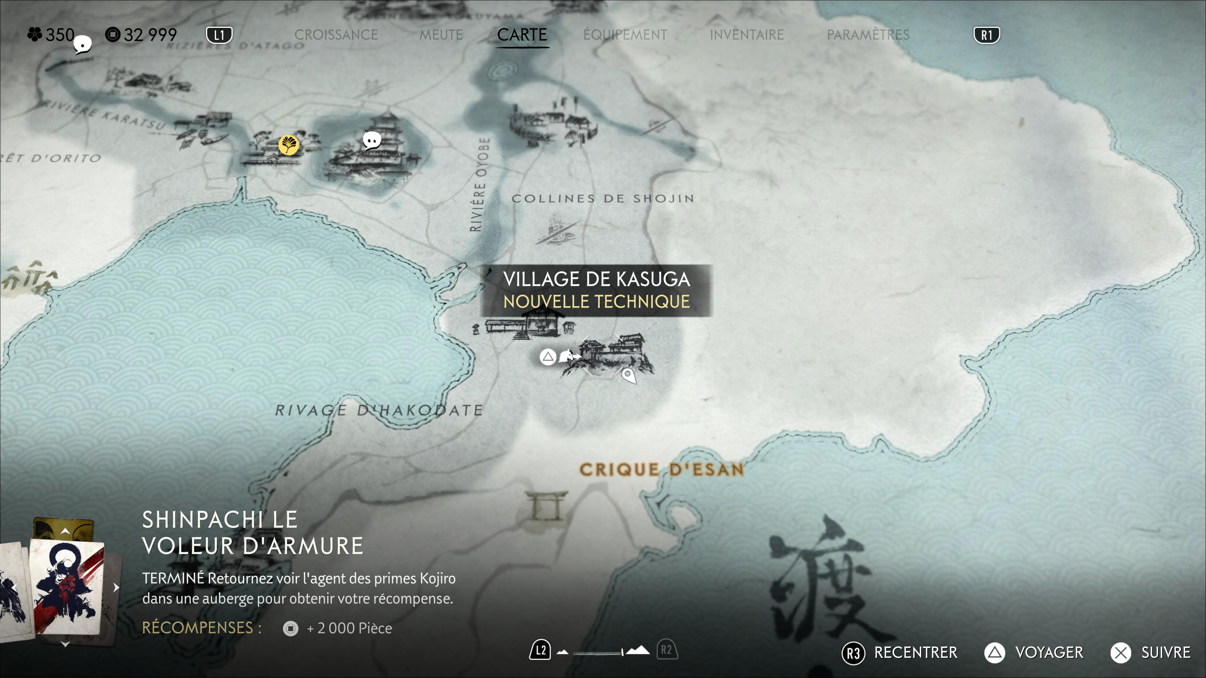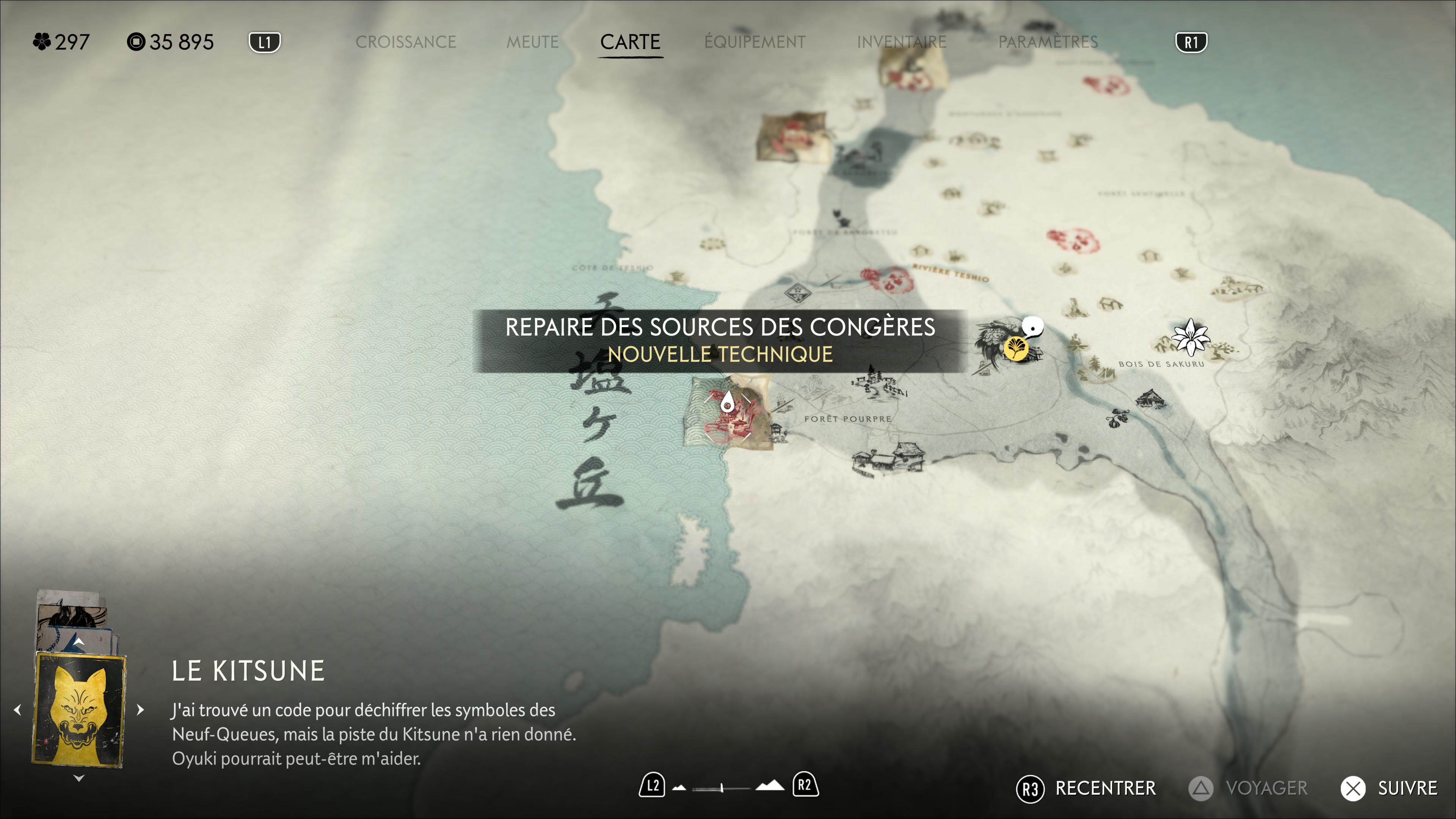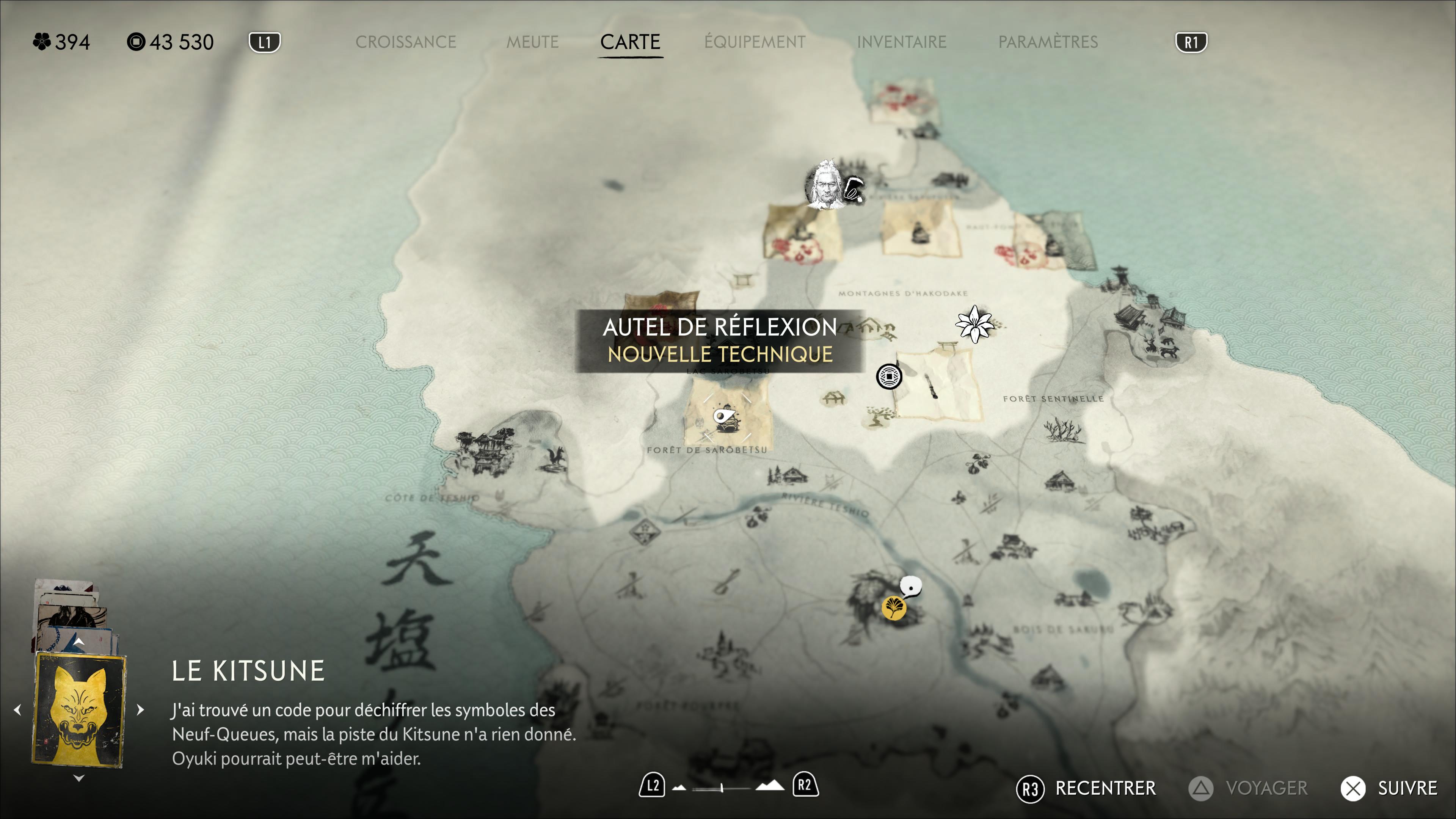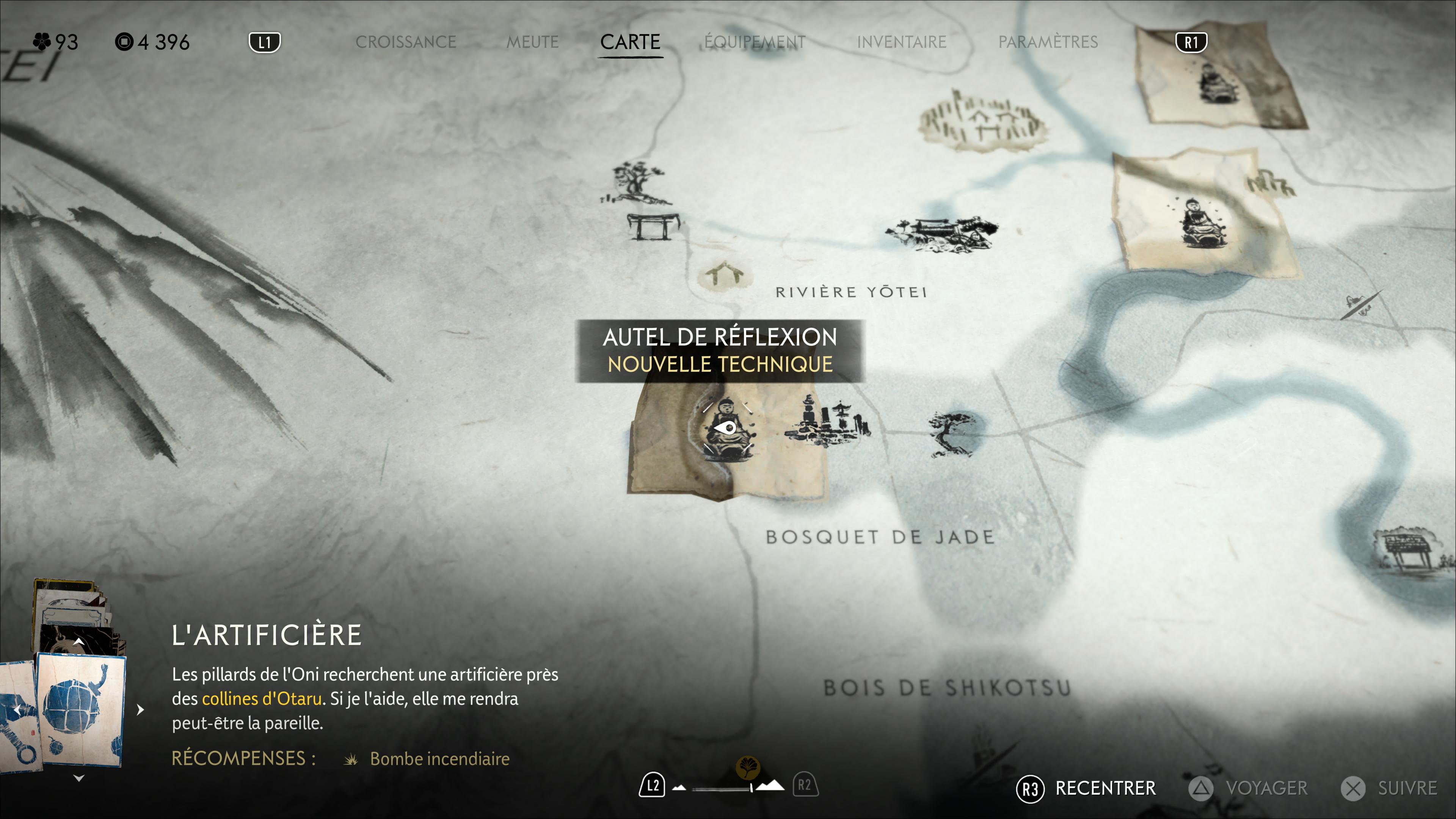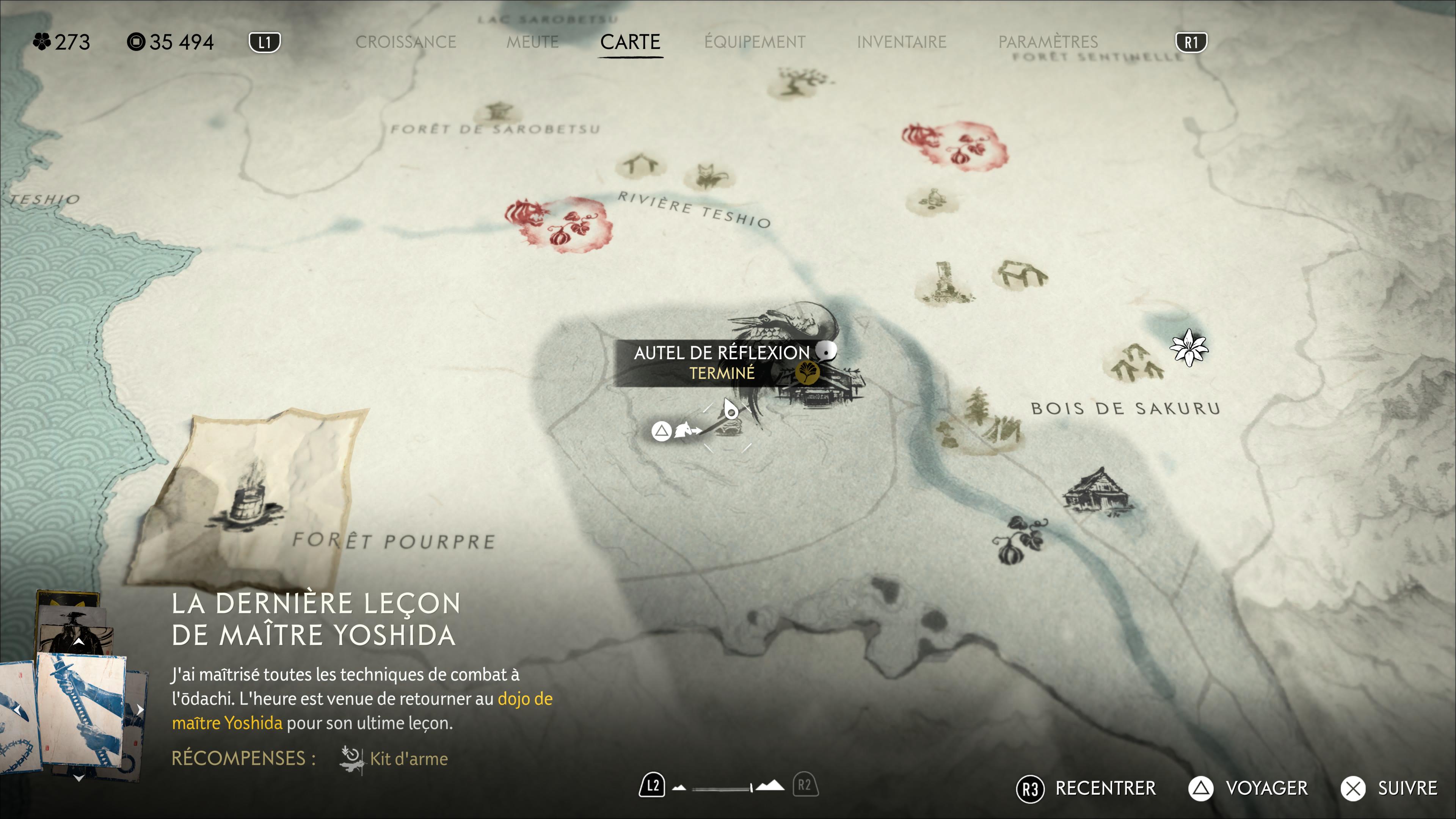 Cachés derrière une cascade, érigés au sommet d’une colline, ou bien en récompense d’un camp des Six de Yōtei libéré, les autels de réflexion sont nombreux et très utiles. À chaque fois que vous vous inclinez devant en glissant votre doigt vers le bas du pavé tactile de la DualSense, vous avez la possibilité de débloquer une compétence de votre choix.
