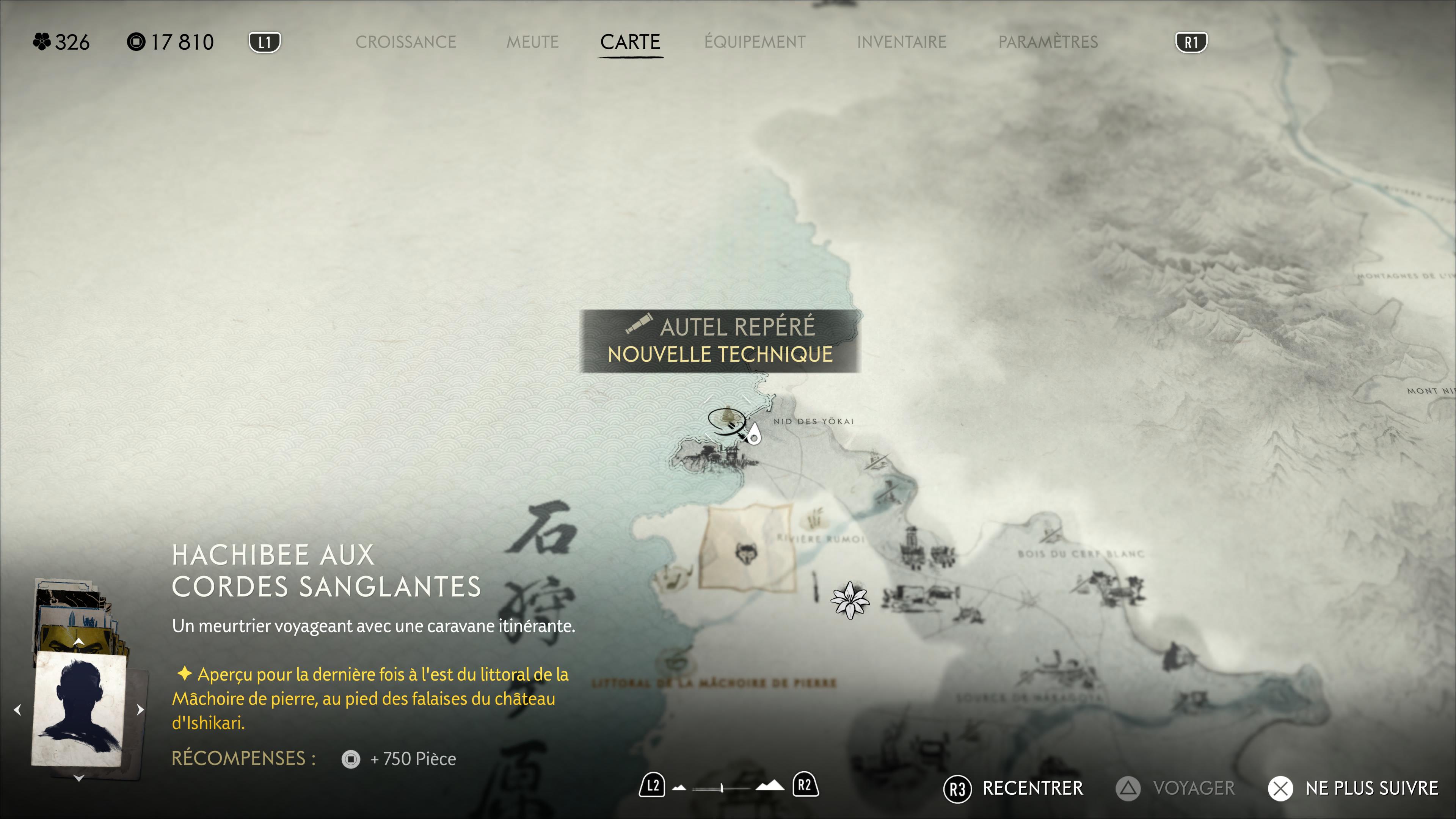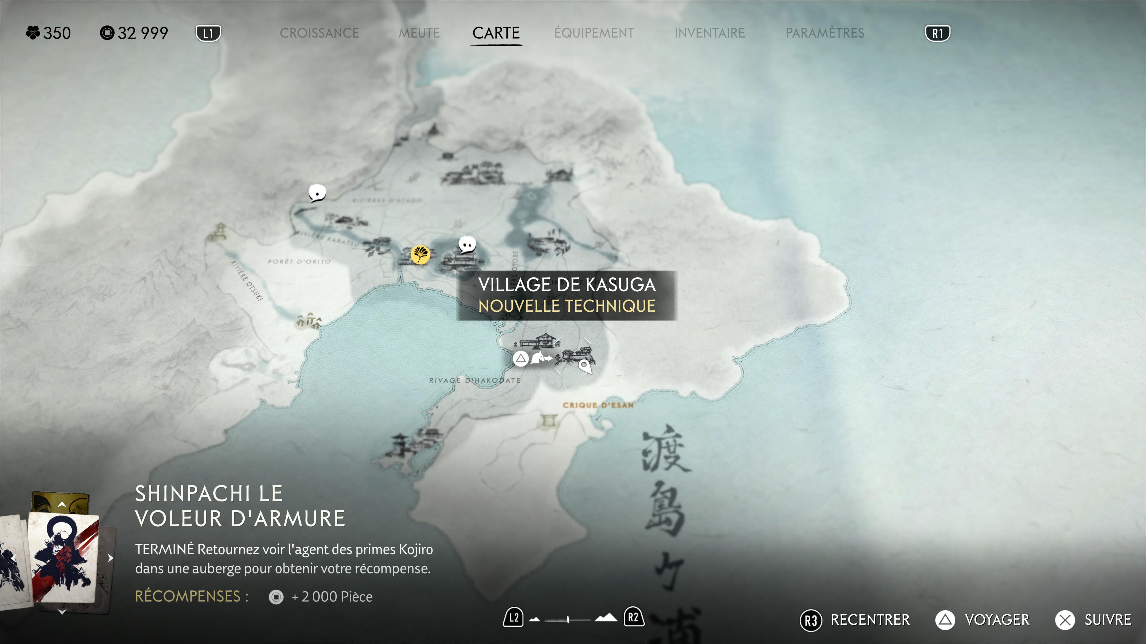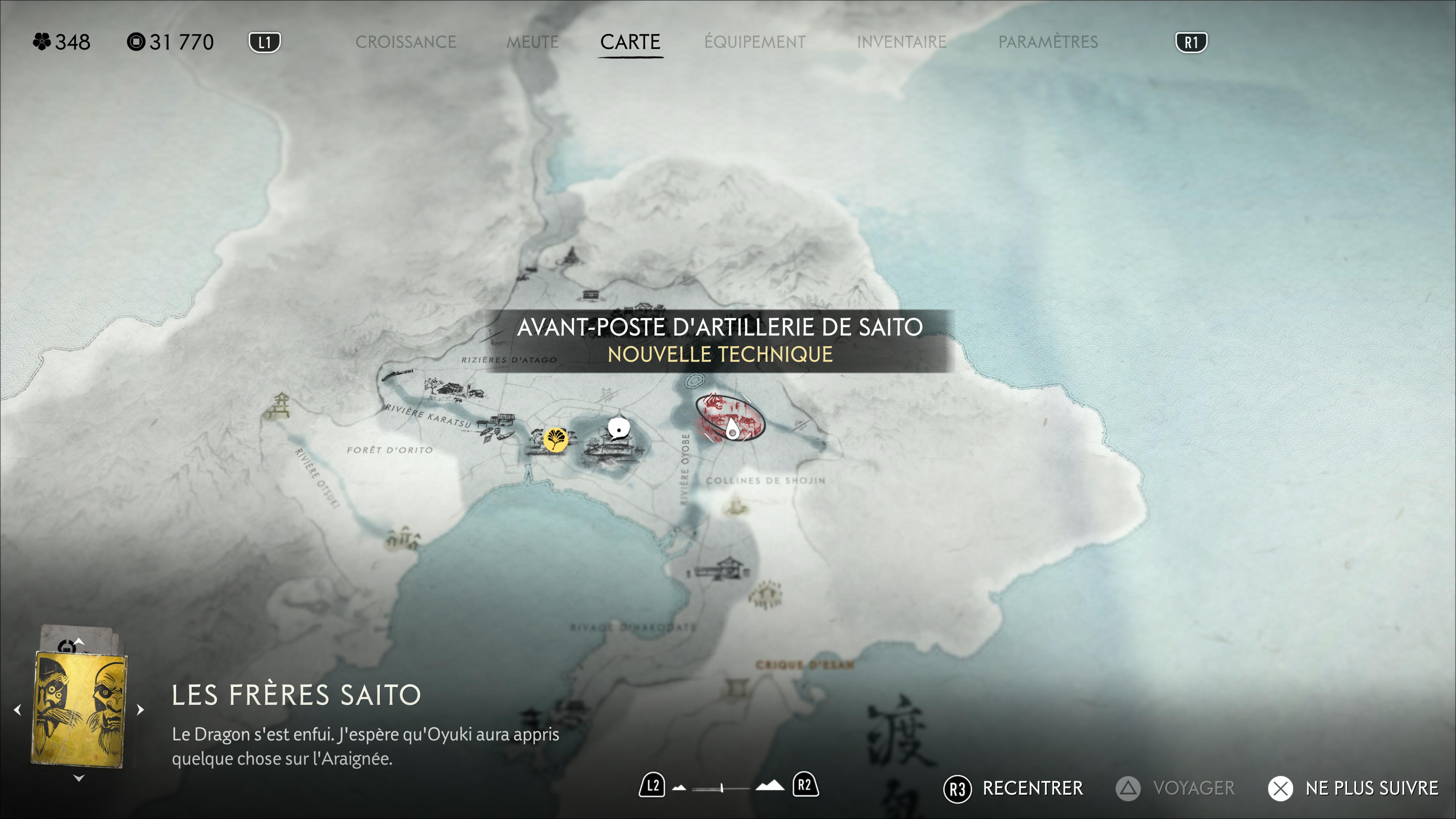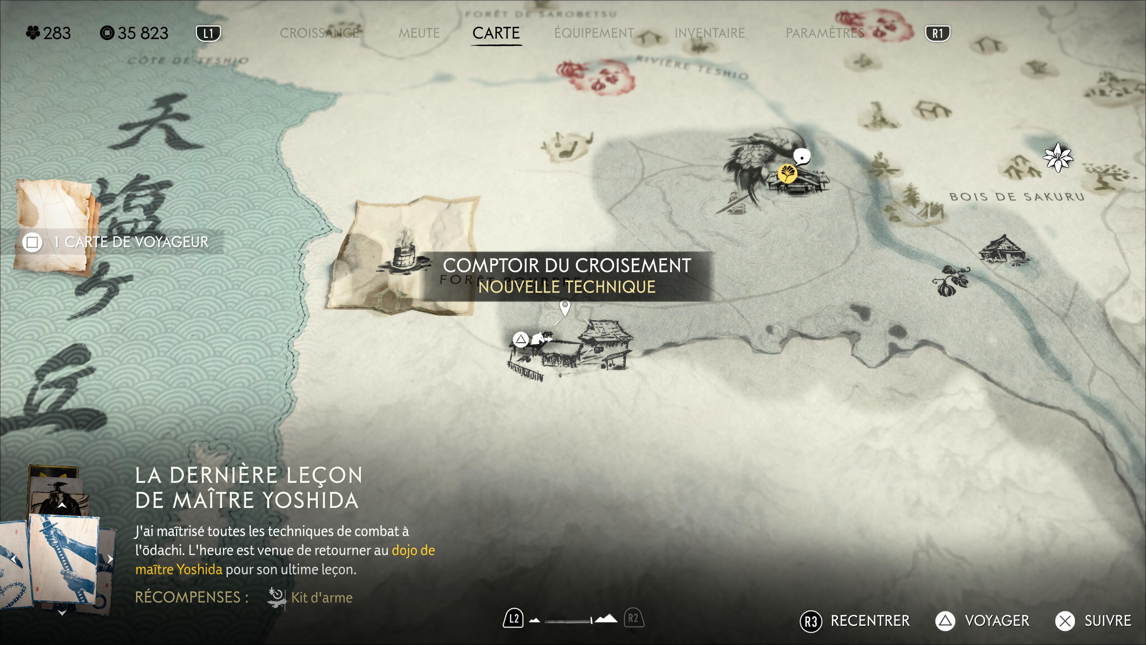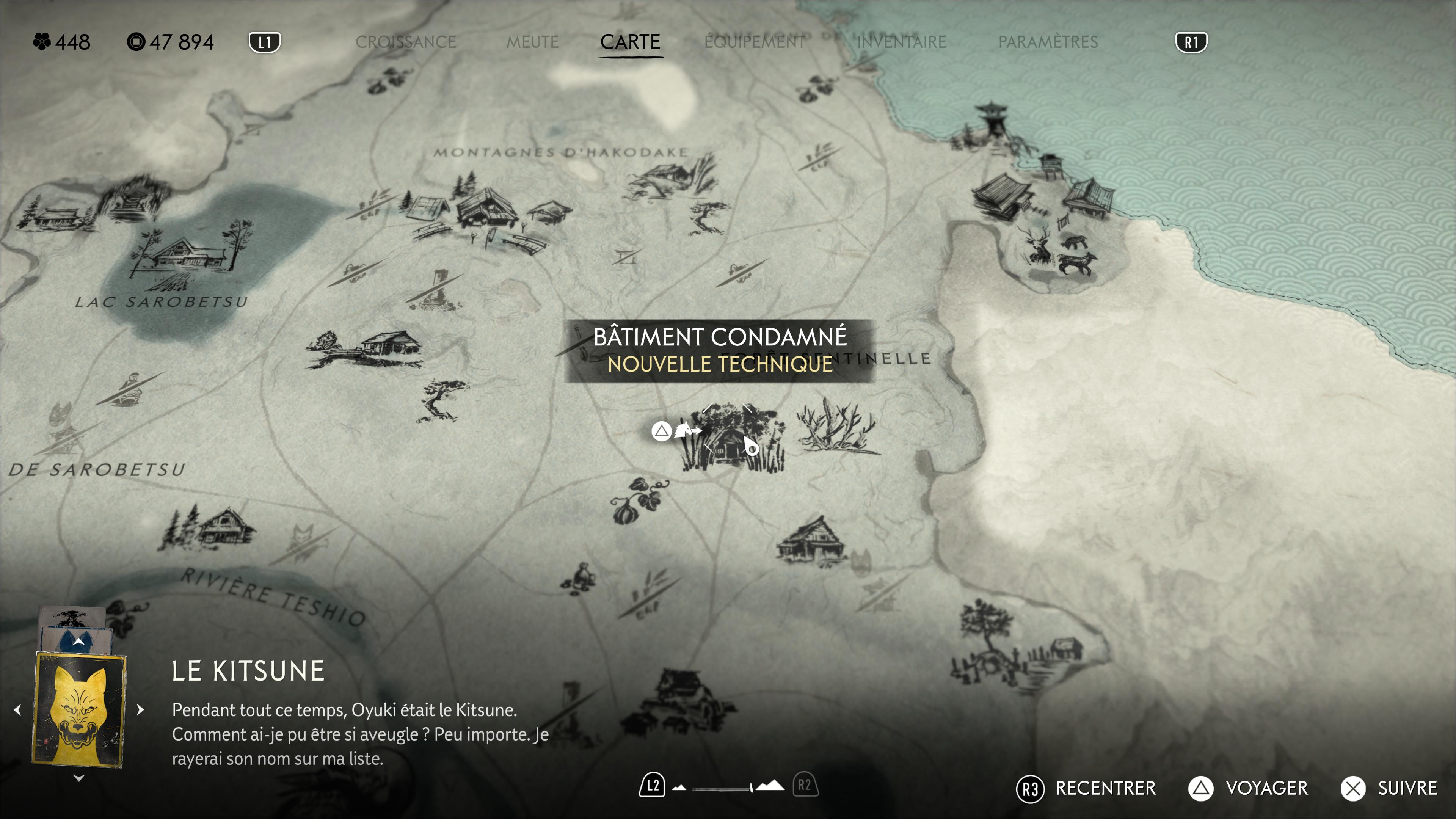 Cachés derrière une cascade, érigés au sommet d’une colline, ou bien en récompense d’un camp des Six de Yōtei libéré, les autels de réflexion sont nombreux et très utiles. À chaque fois que vous vous inclinez devant en glissant votre doigt vers le bas du pavé tactile de la DualSense, vous avez la possibilité de débloquer une compétence de votre choix.