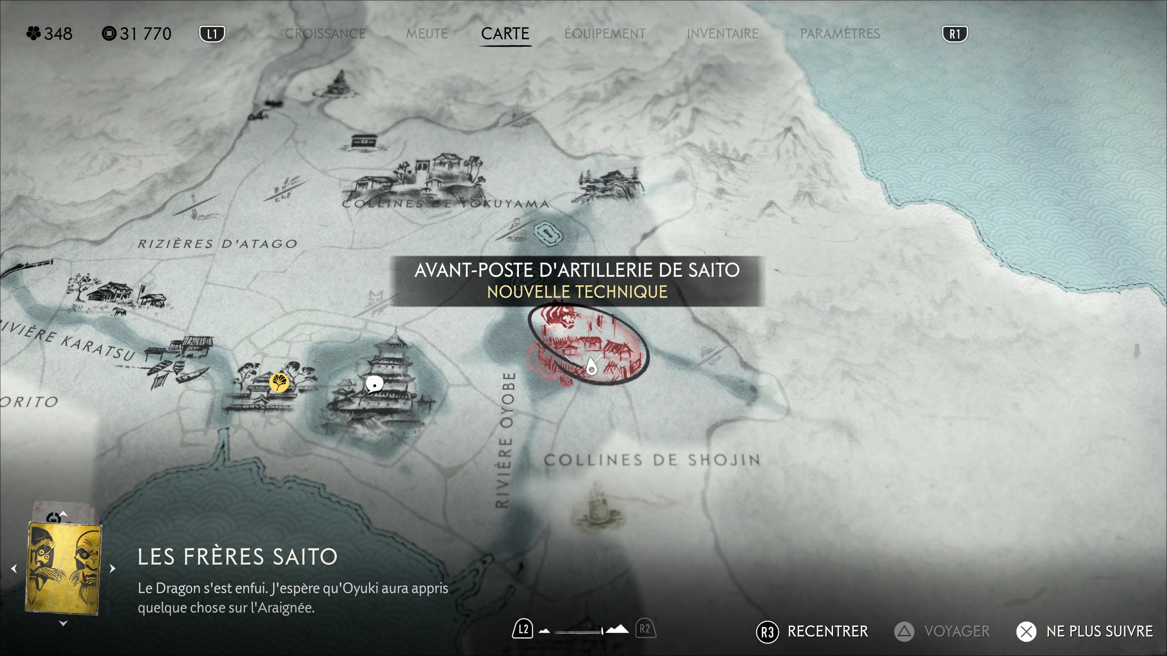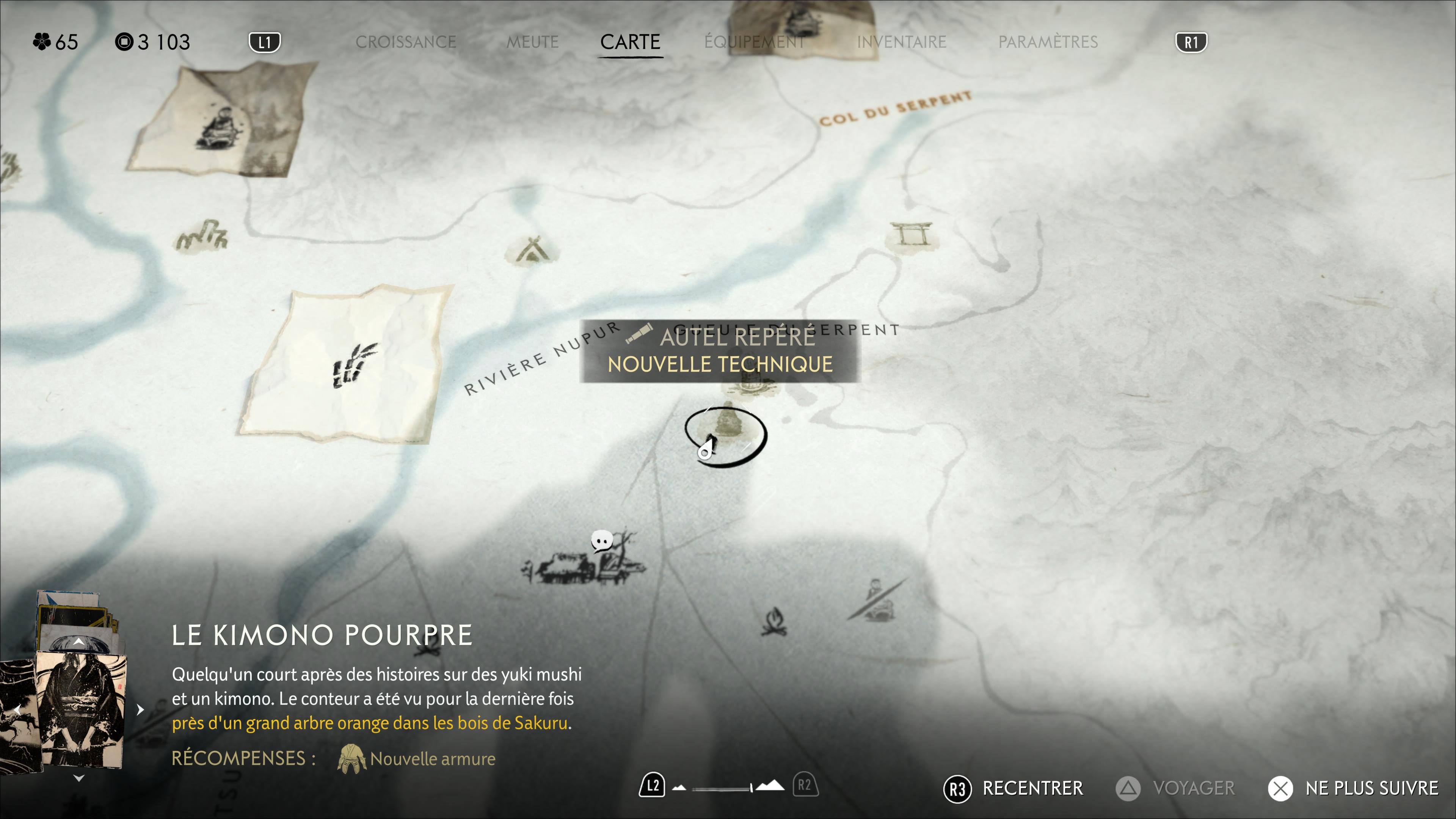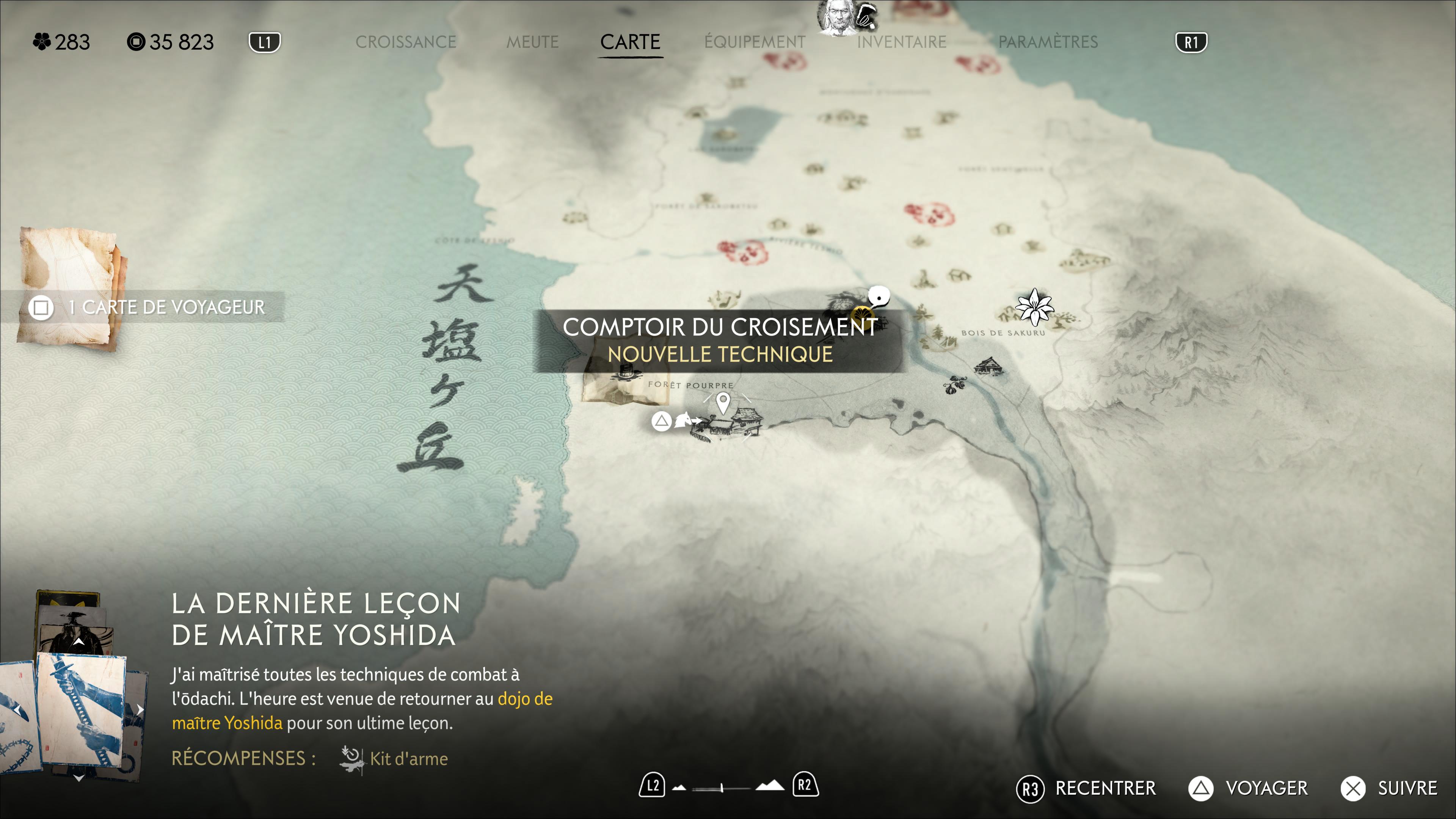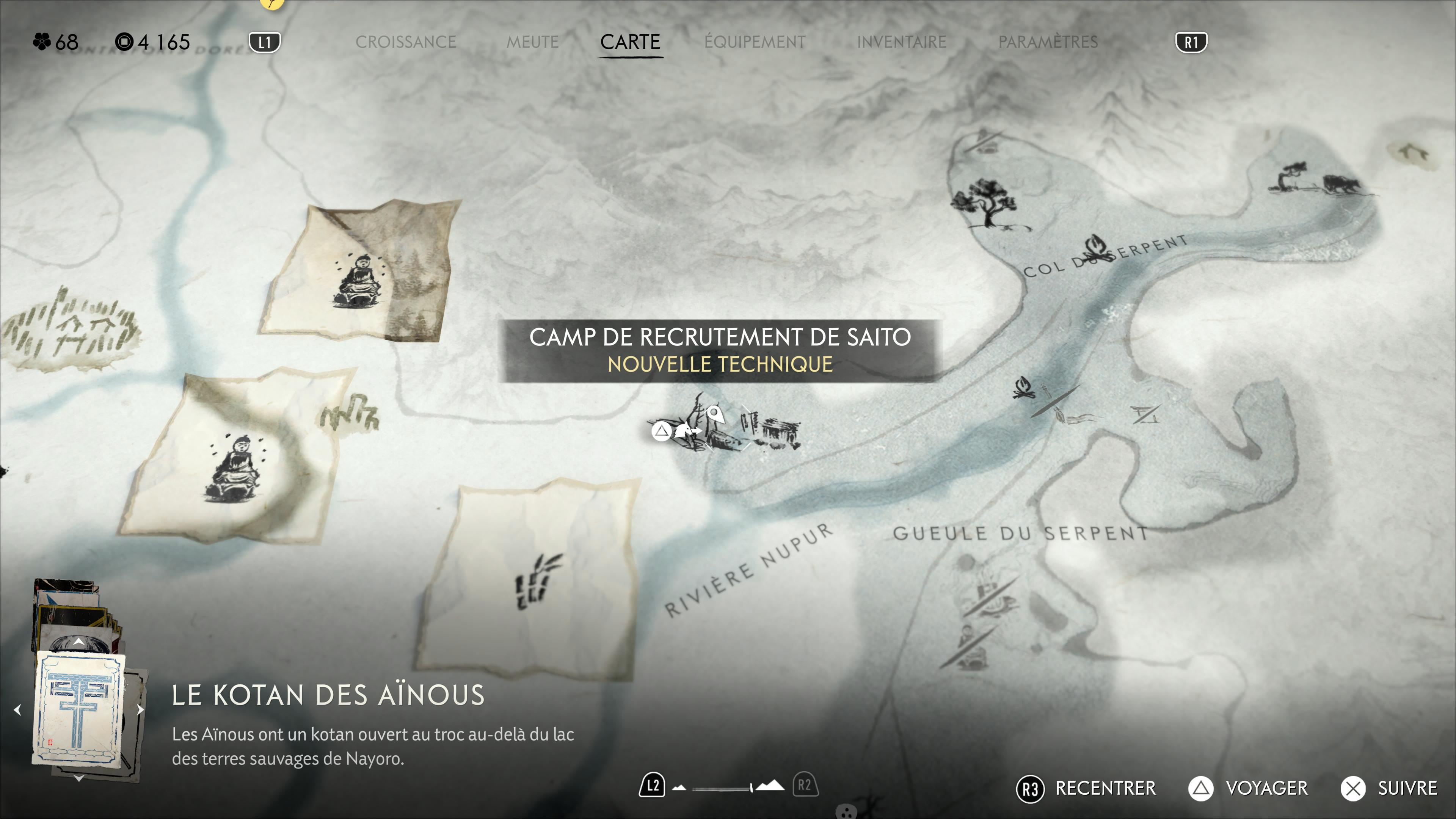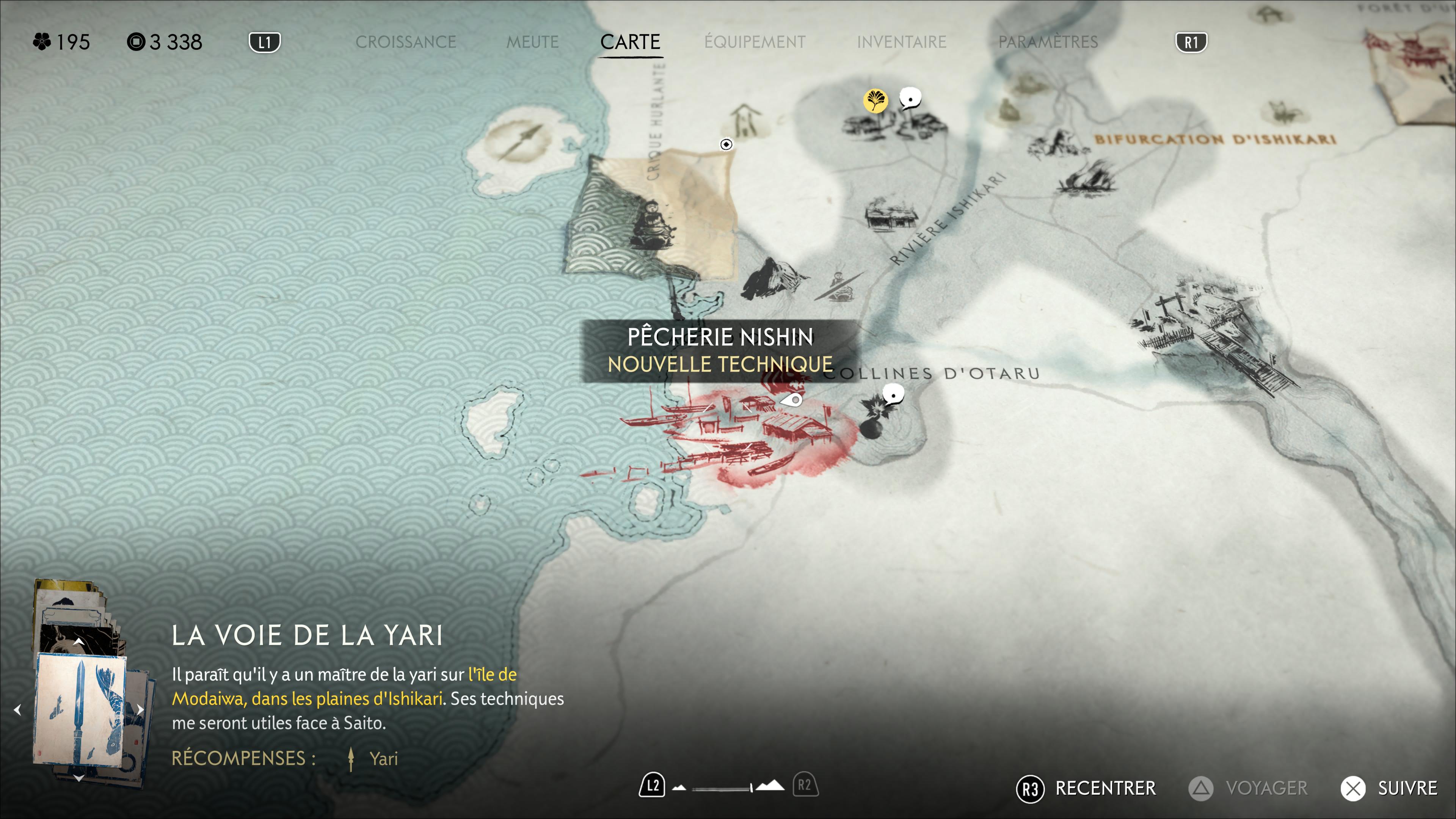 Cachés derrière une cascade, érigés au sommet d’une colline, ou bien en récompense d’un camp des Six de Yōtei libéré, les autels de réflexion sont nombreux et très utiles. À chaque fois que vous vous inclinez devant en glissant votre doigt vers le bas du pavé tactile de la DualSense, vous avez la possibilité de débloquer une compétence de votre choix.