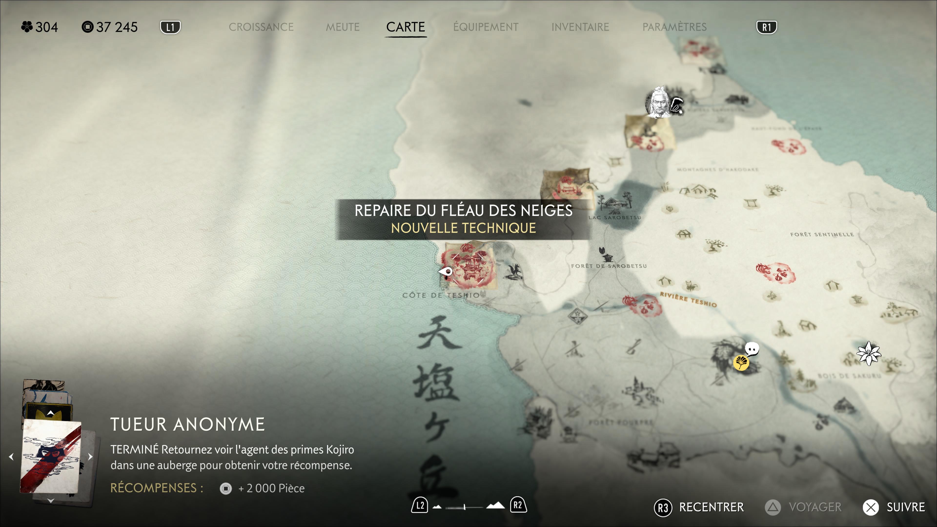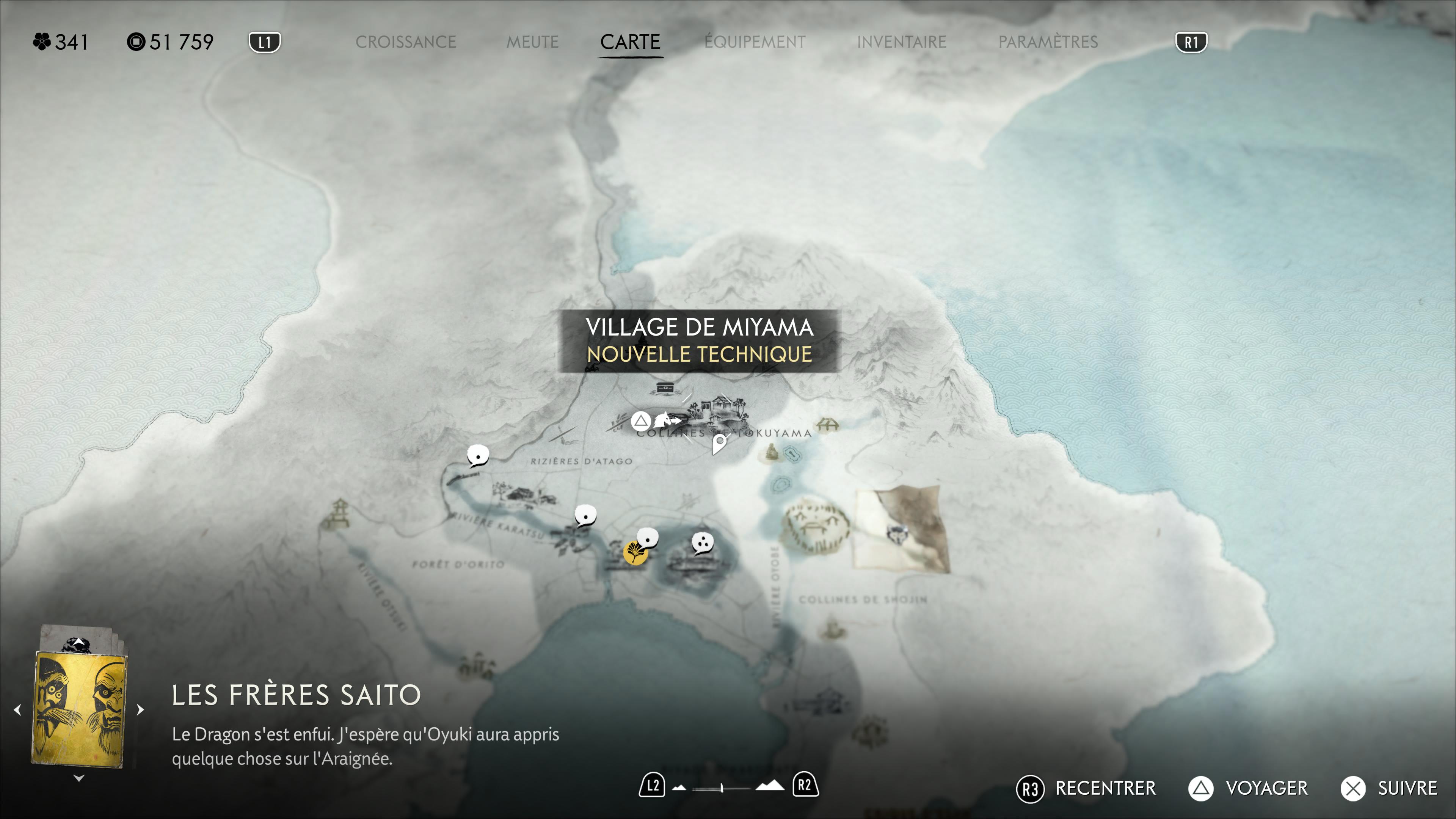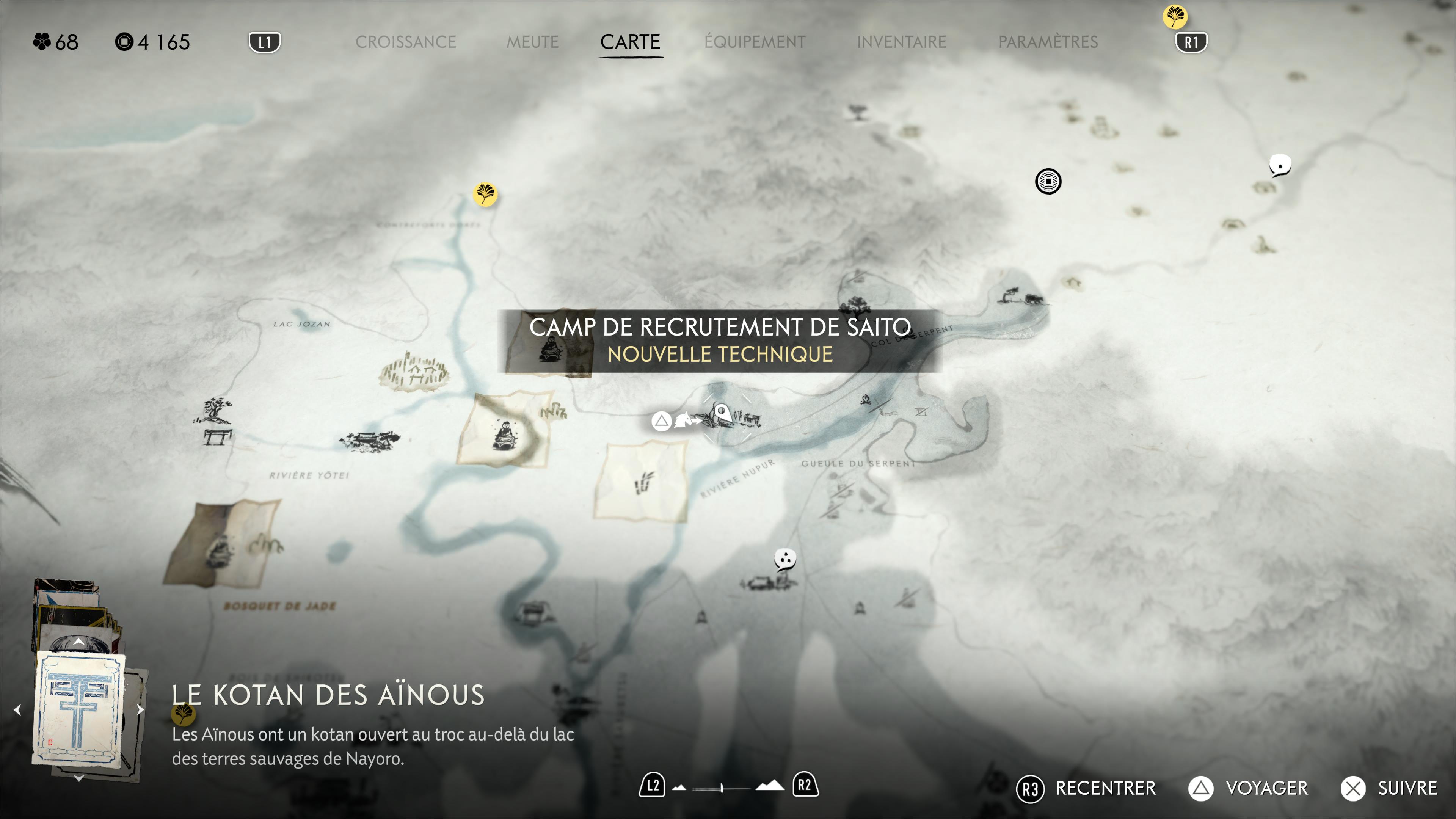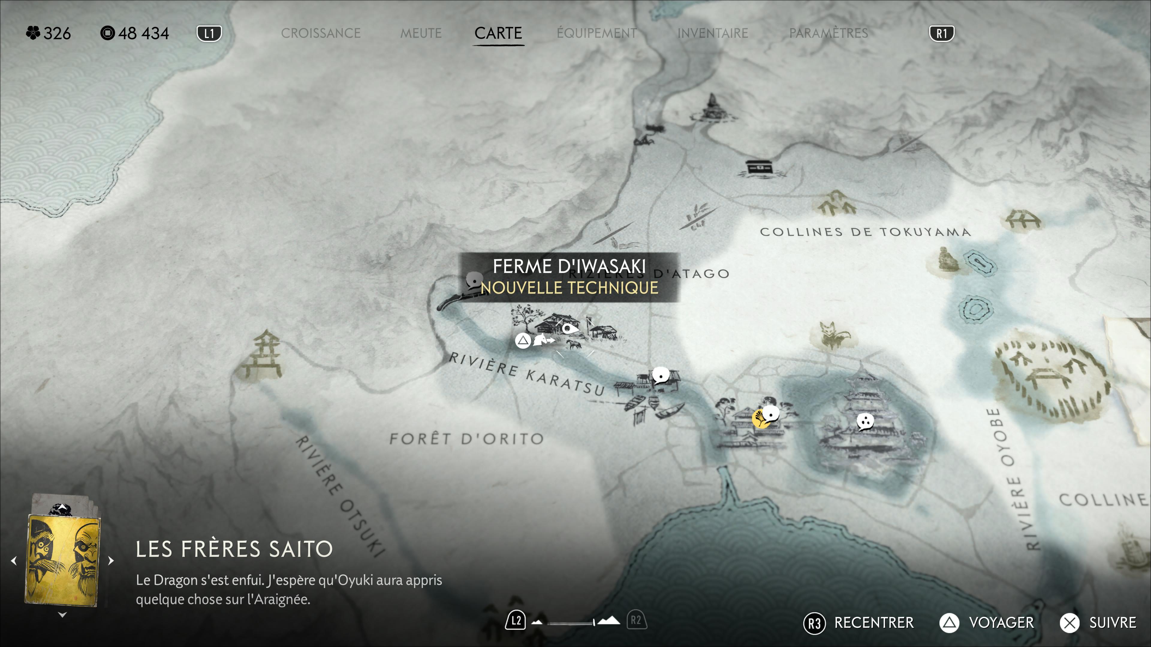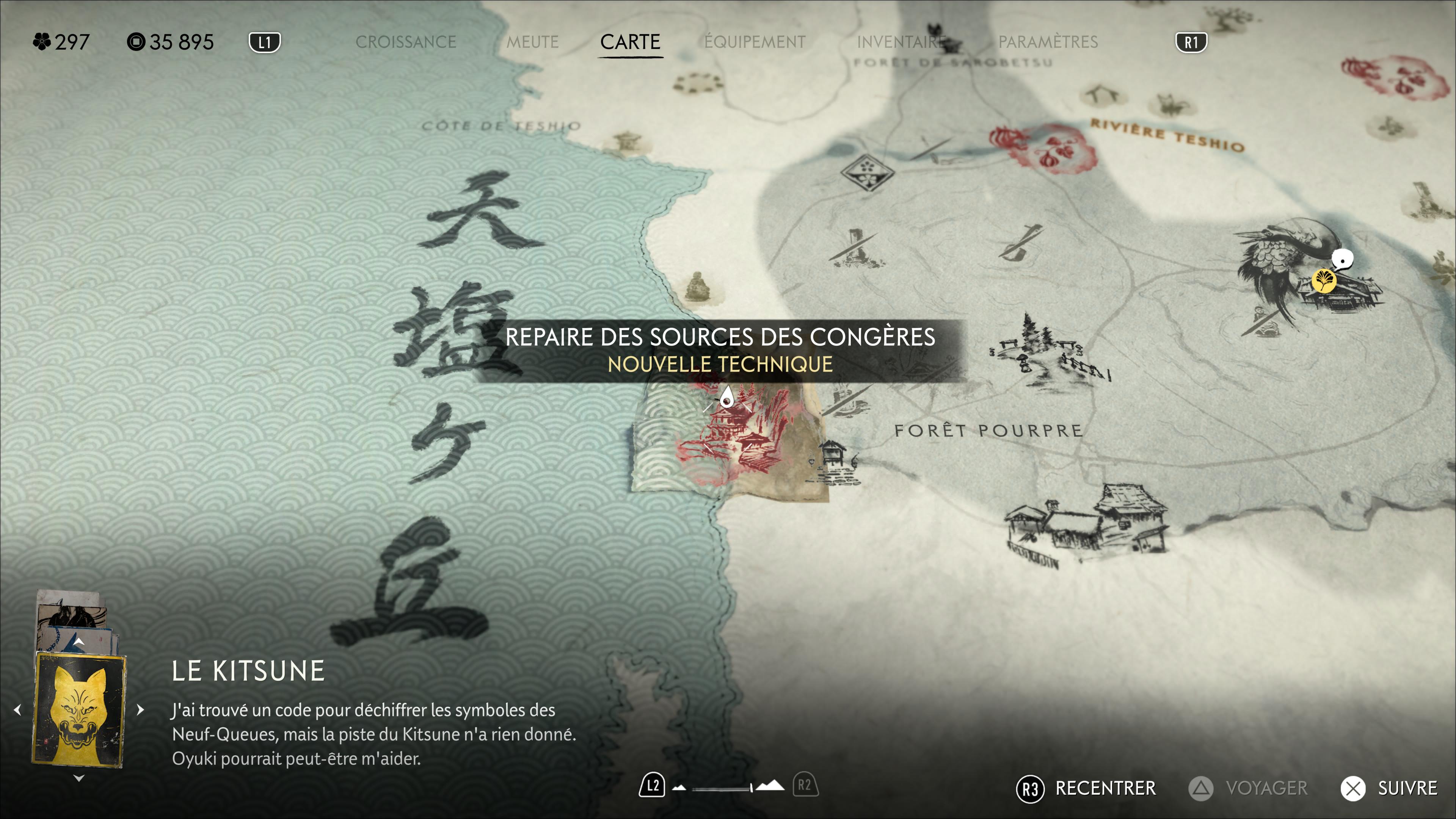 Cachés derrière une cascade, érigés au sommet d’une colline, ou bien en récompense d’un camp des Six de Yōtei libéré, les autels de réflexion sont nombreux et très utiles. À chaque fois que vous vous inclinez devant en glissant votre doigt vers le bas du pavé tactile de la DualSense, vous avez la possibilité de débloquer une compétence de votre choix.