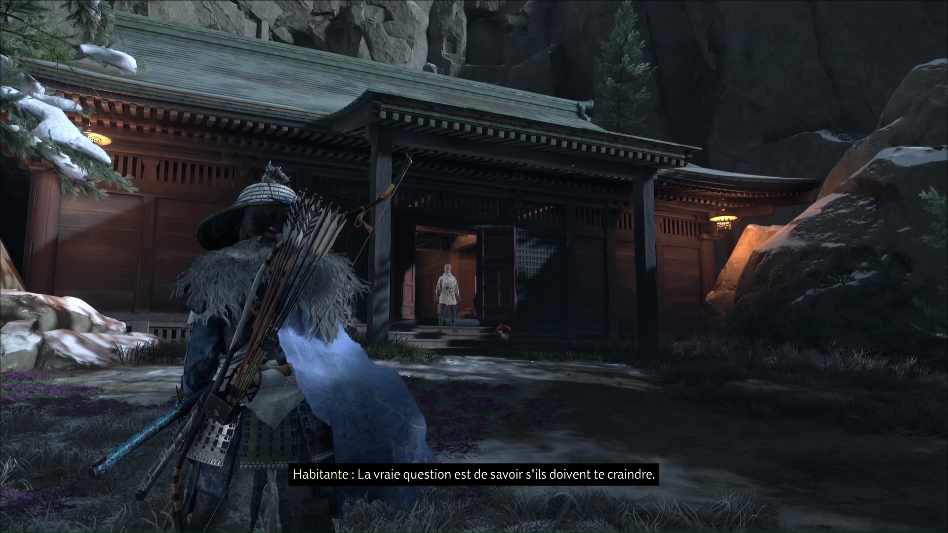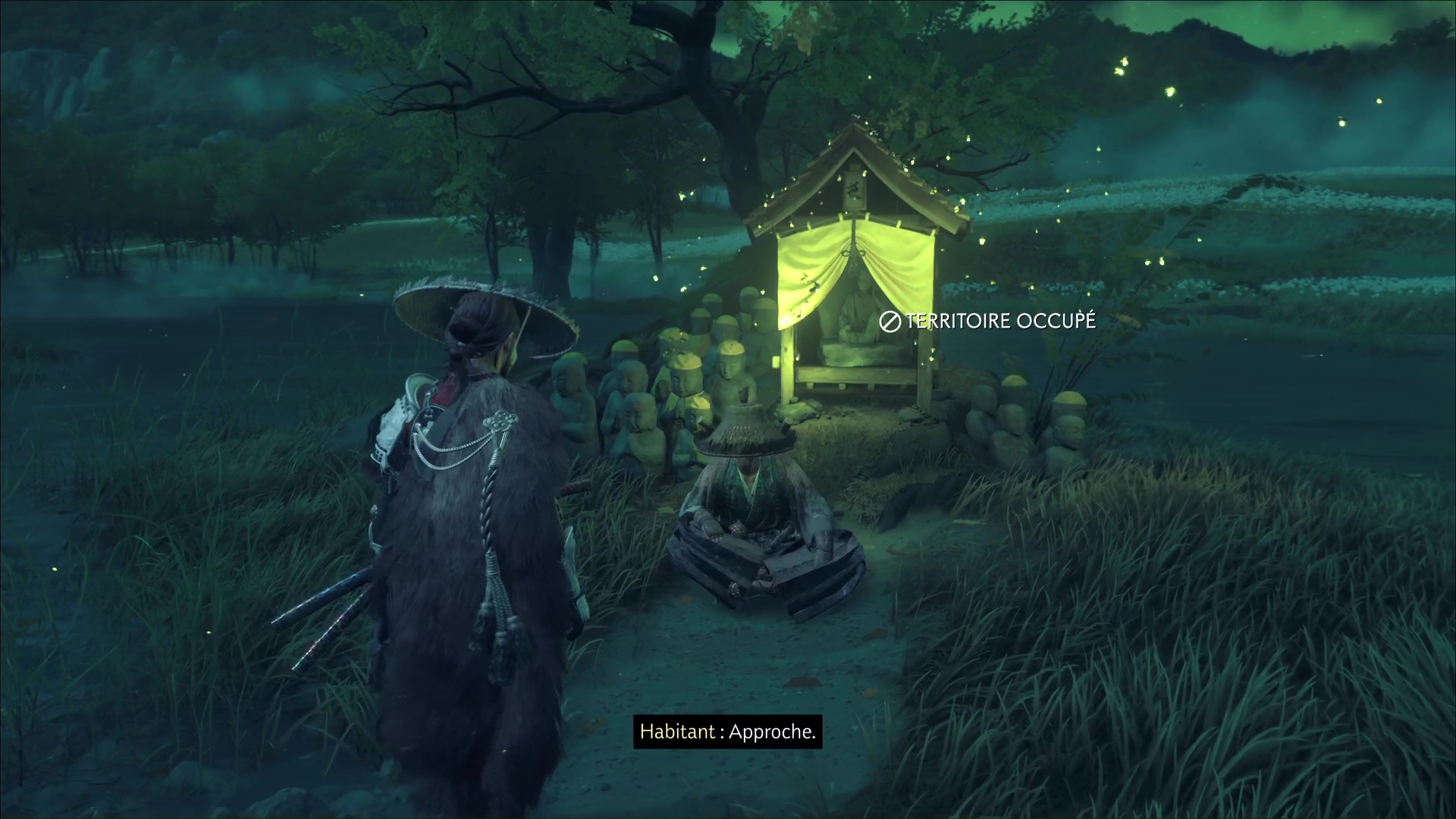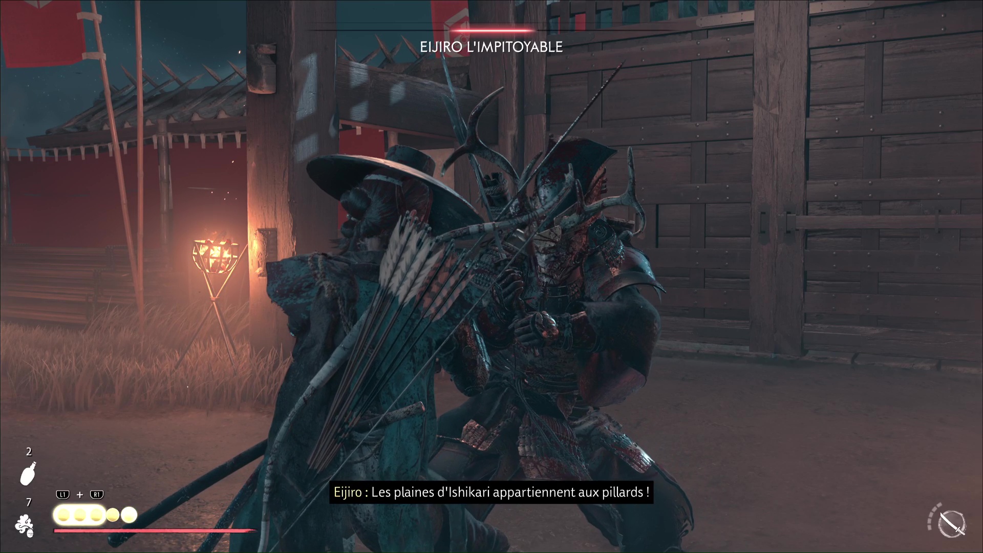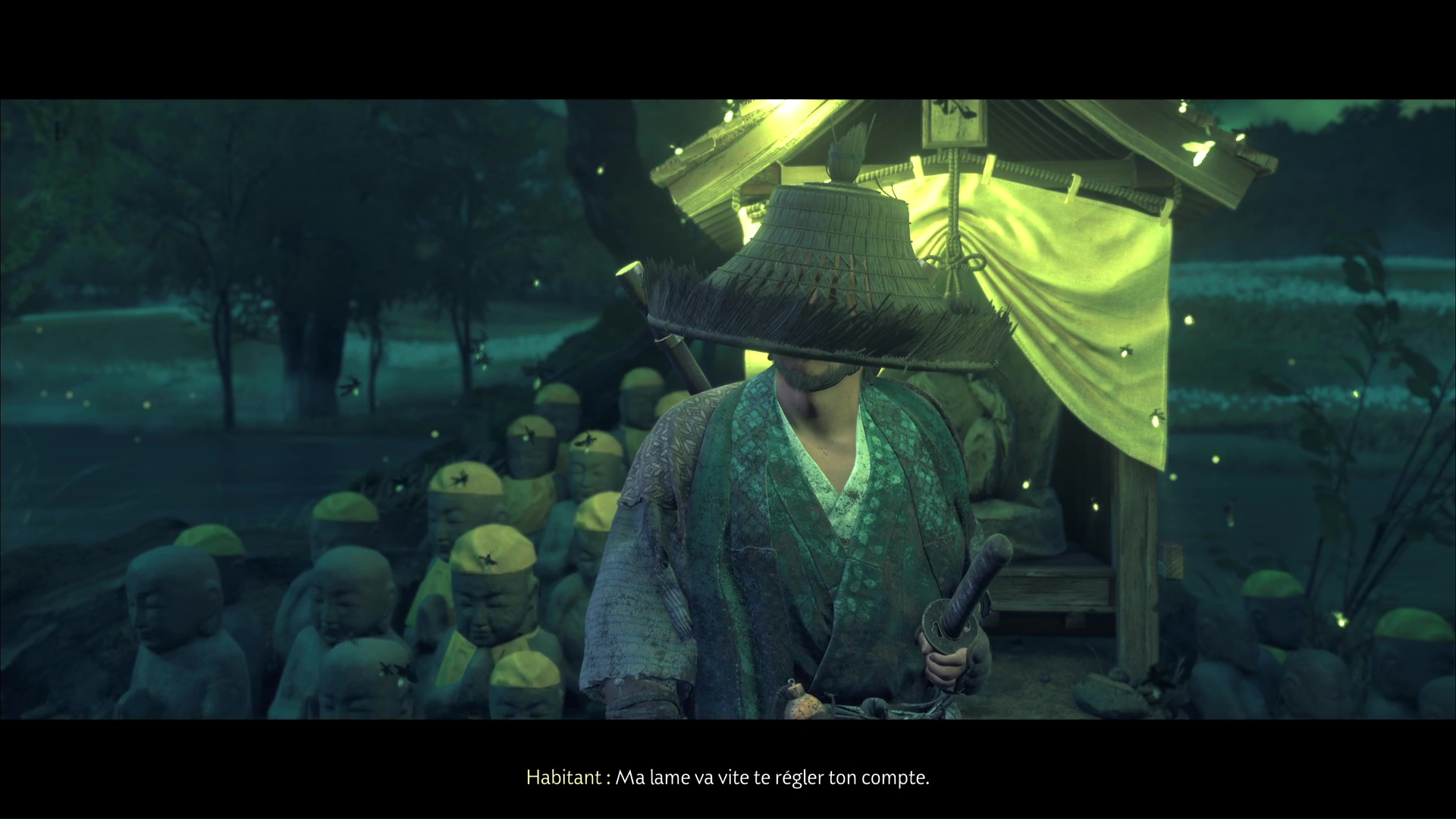 Parlez-lui et vous comprendrez assez rapidement qu’il veut se mesurer à vous. Acceptez le duel. L’adversaire n’est pas spécialement dangereux, mais il se bat notamment avec une double faucille, donc attention à des enchaînements rapides. Une fois le ronin terrassé, vous pouvez priez et récupérez le point de compétence.