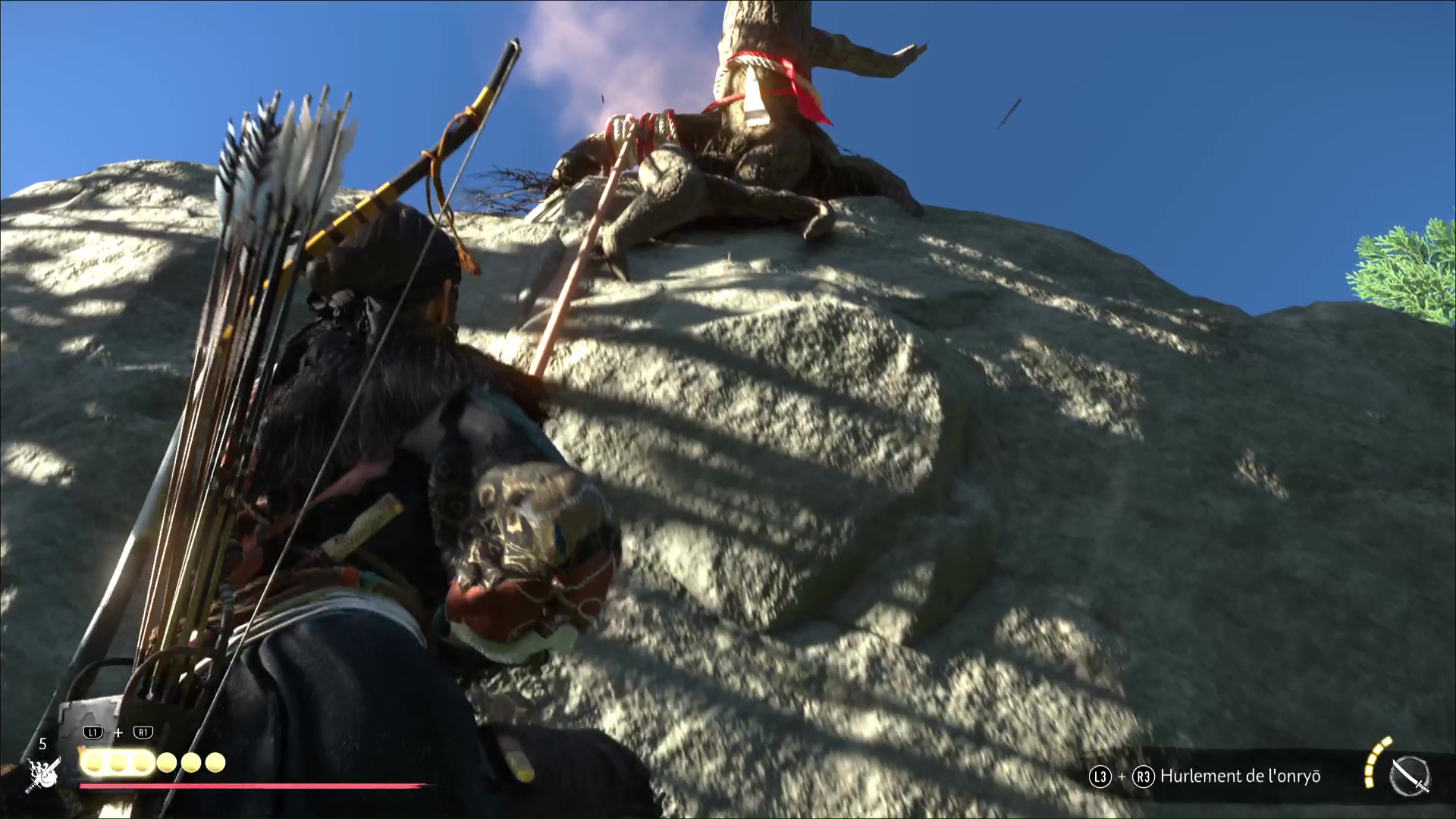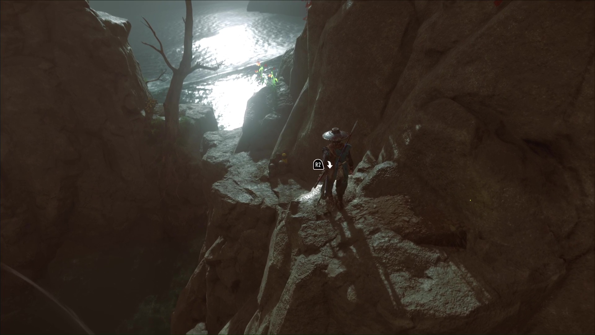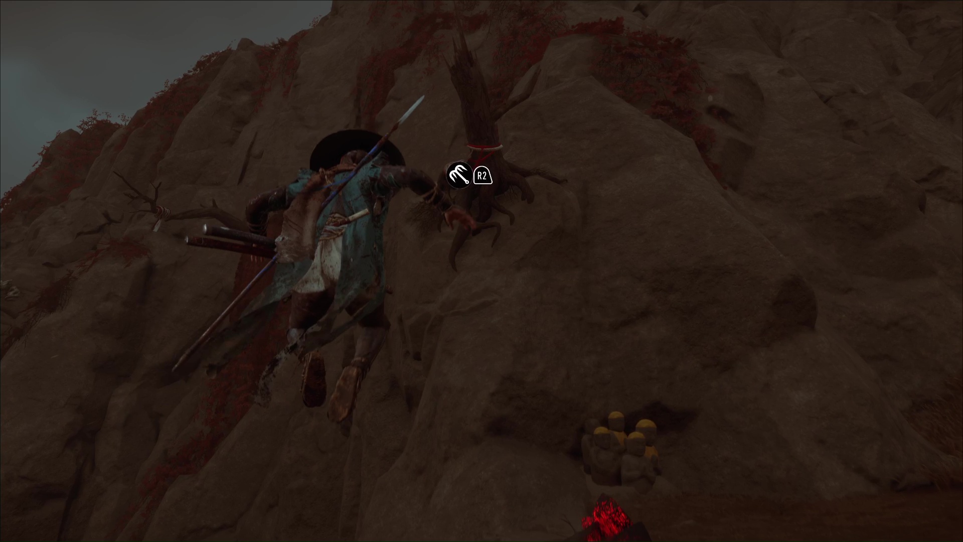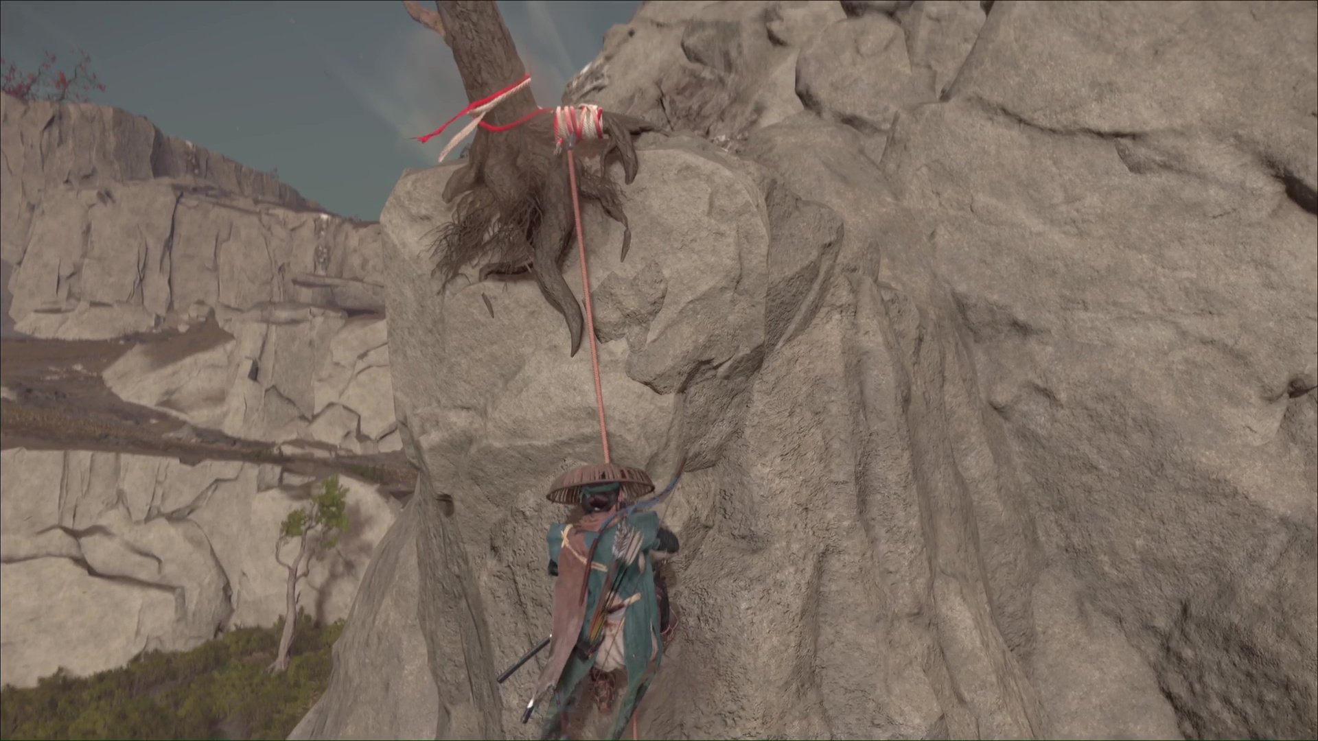 Commencez par chercher un rocher sur lequel vous pouvez monter, et au sommet duquel repose un cadavre. En haut, tournez la tête pour voir que vous pouvez vous accrocher au grappin à une branche. Faites-le pour rejoindre les prises en face.
