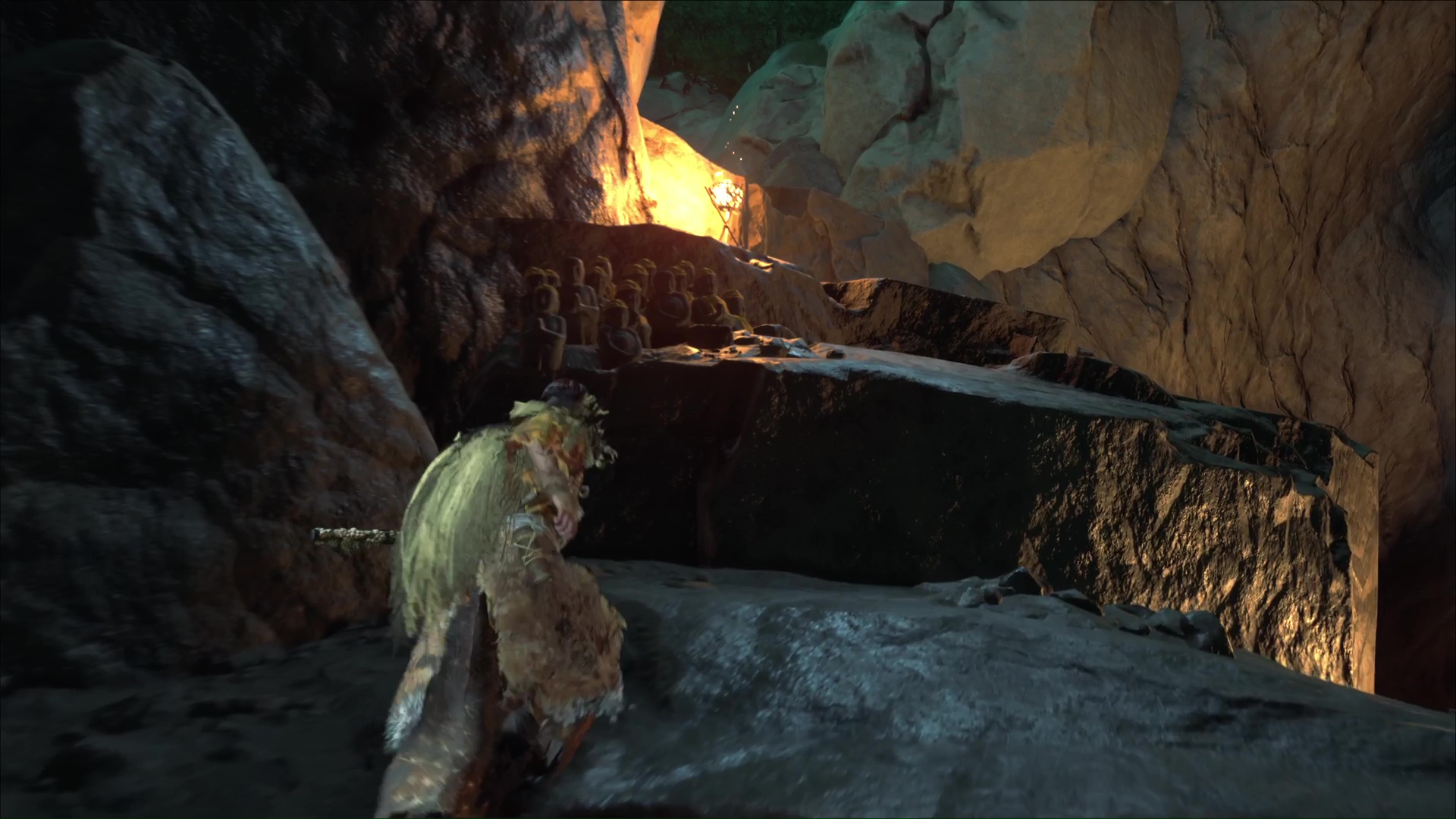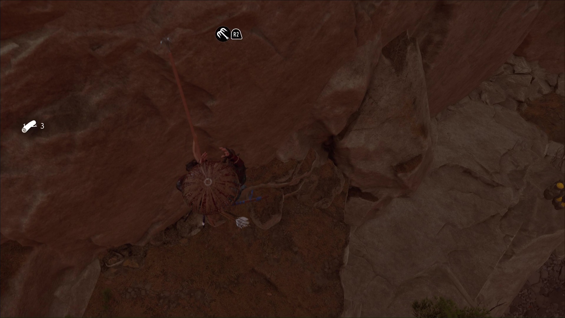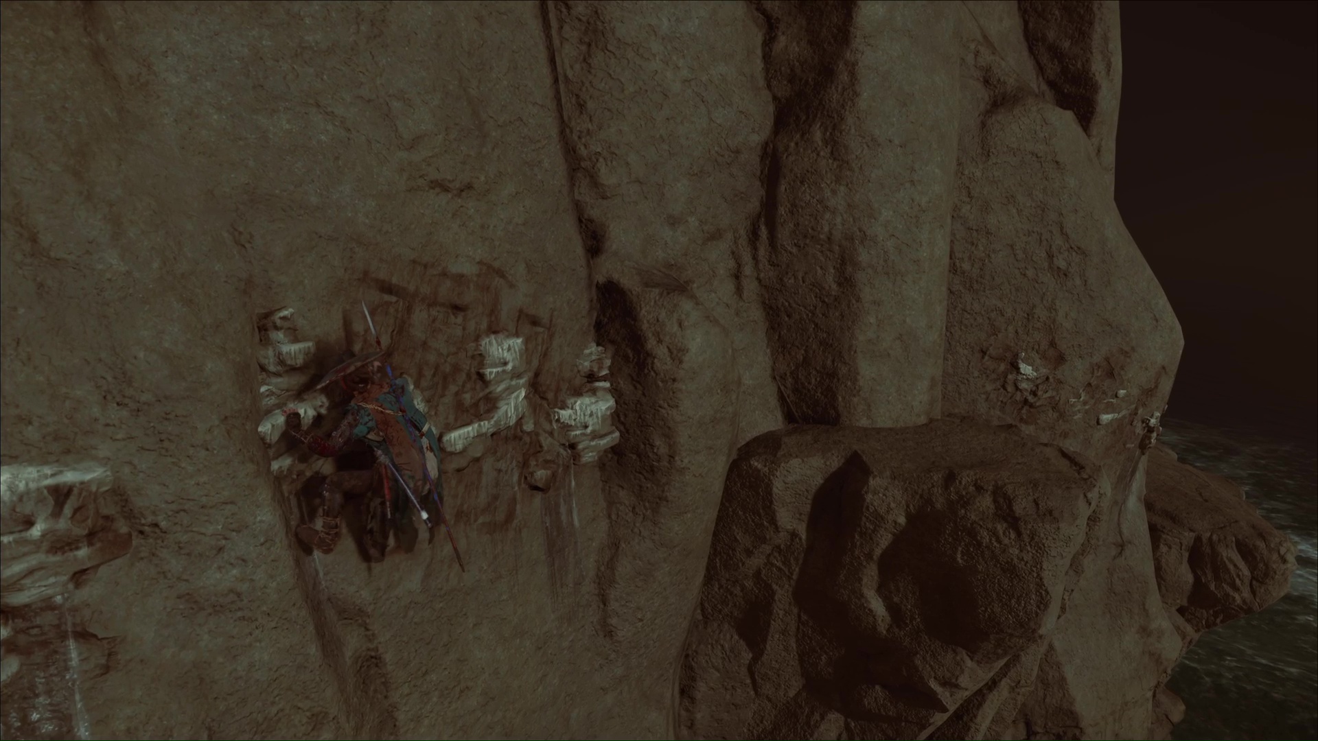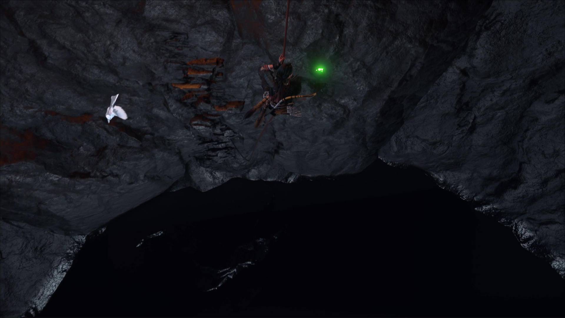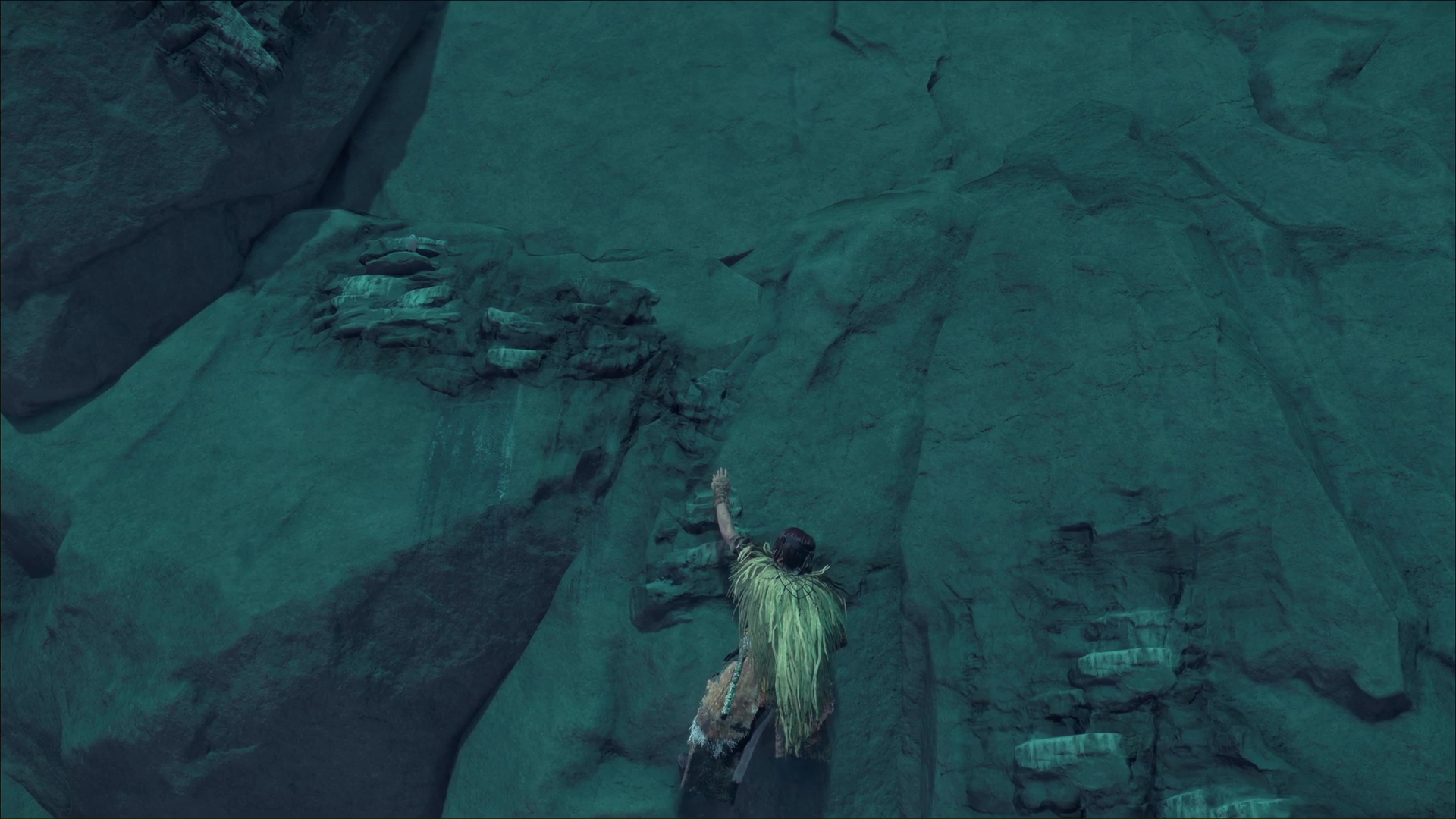 Derrière ces sculptures se trouve un mur à détruire avec votre grappin. Faites-le et passez de l’autre côté. escaladez ensuite des prises rocheuses jusqu’à revenir à l’air libre.