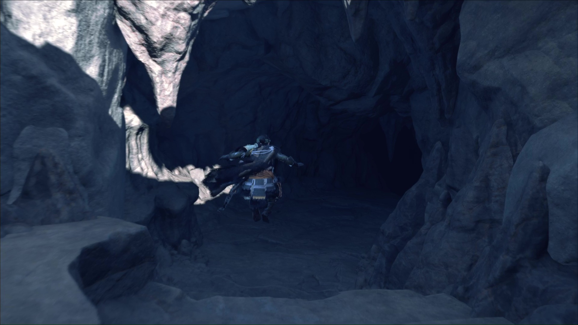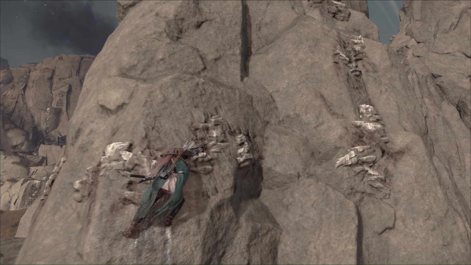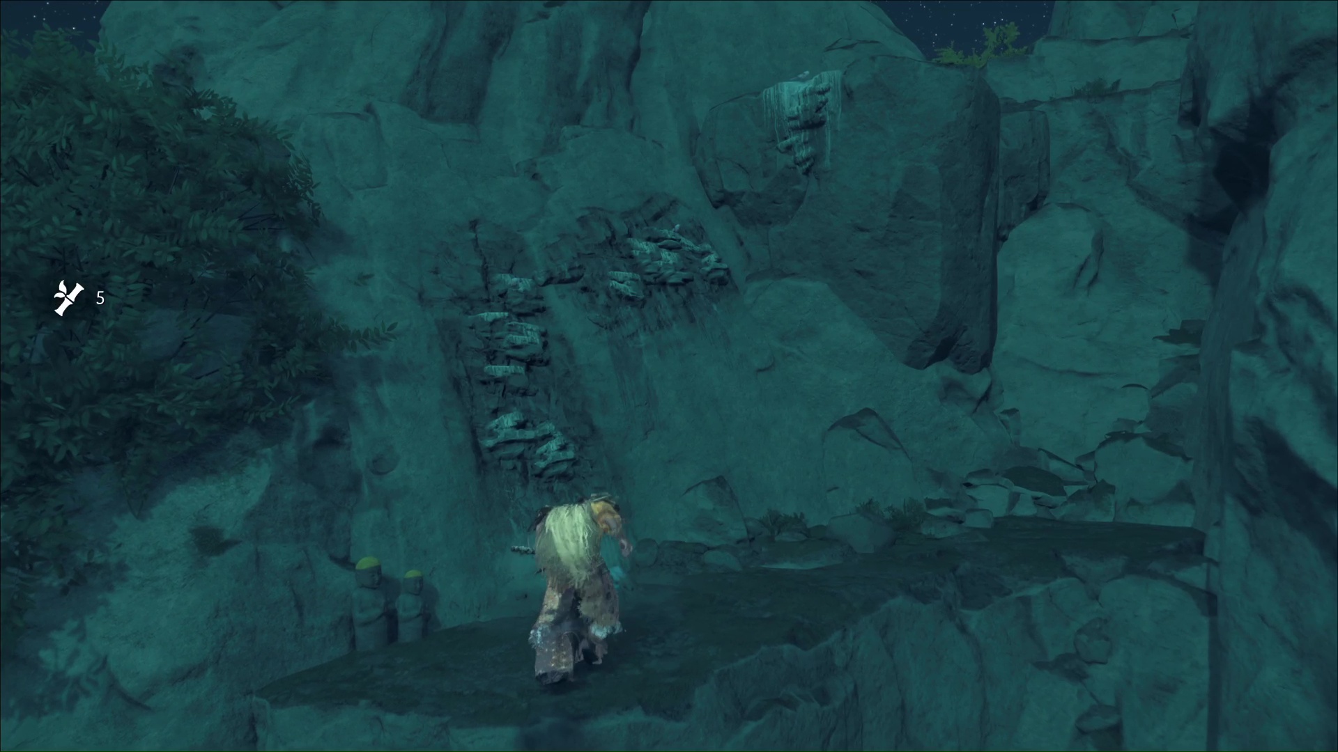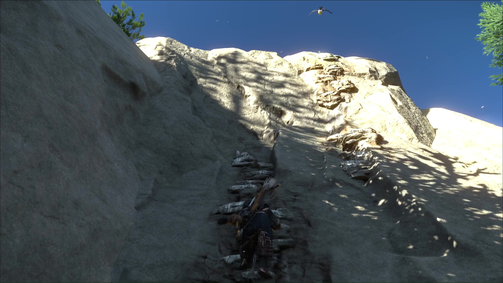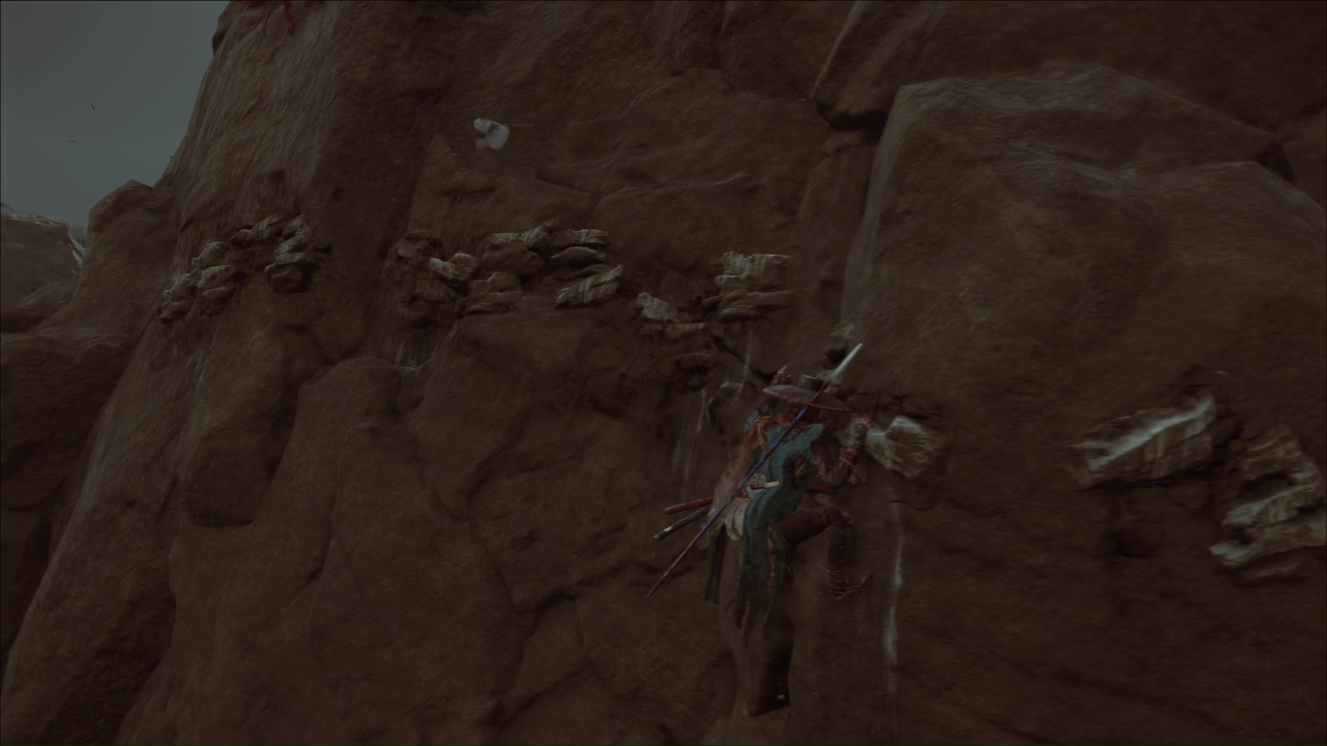 Derrière ces sculptures se trouve un mur à détruire avec votre grappin. Faites-le et passez de l’autre côté. escaladez ensuite des prises rocheuses jusqu’à revenir à l’air libre.