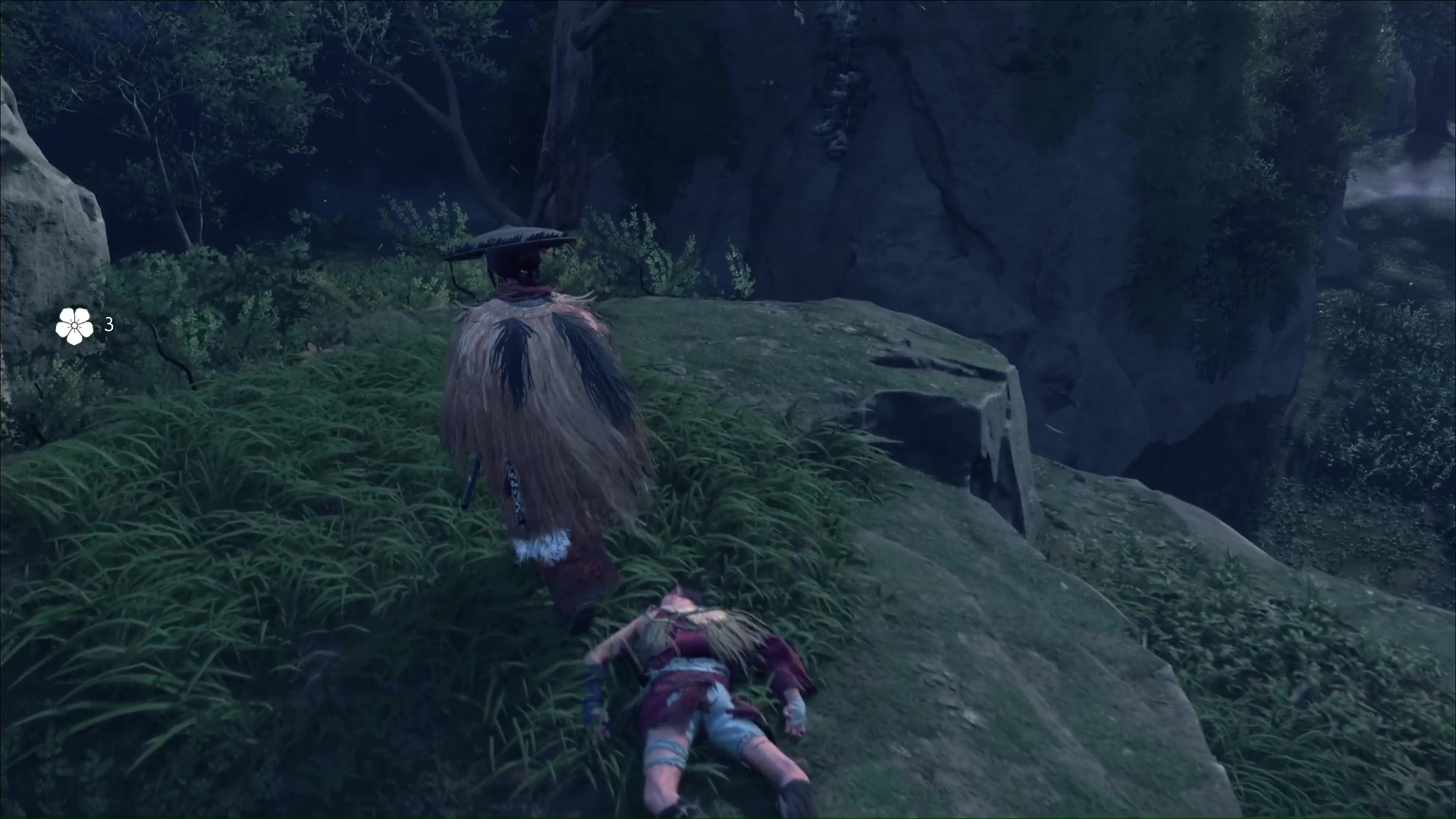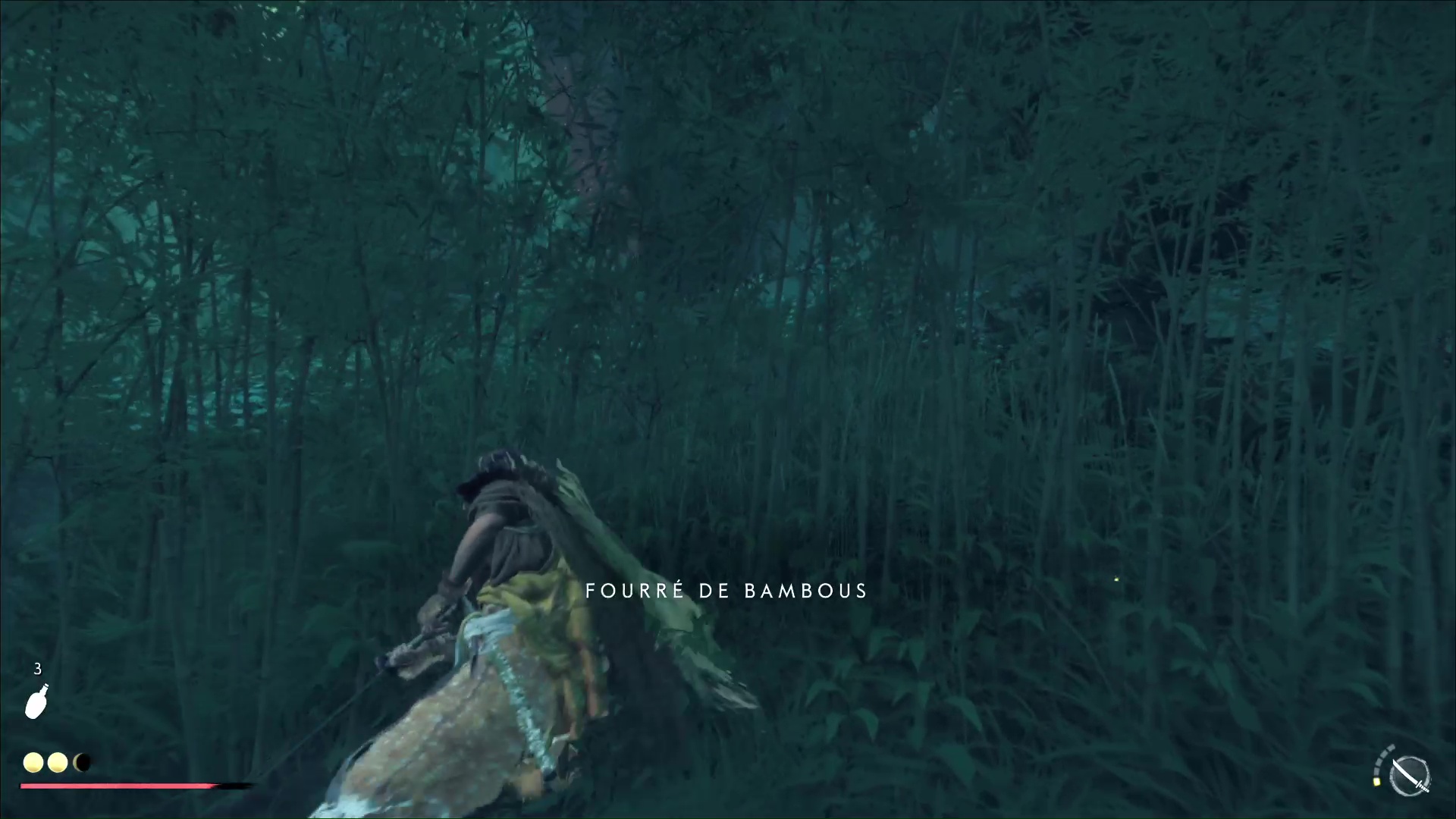 Découpez les bambous, progressez dans la zone en éliminant les ennemis si besoin. Repérez ensuite les petites sculptures près d’un tronc auquel vous pouvez vous grappiner. Descendez par là et suivez le parcours de plateforme.