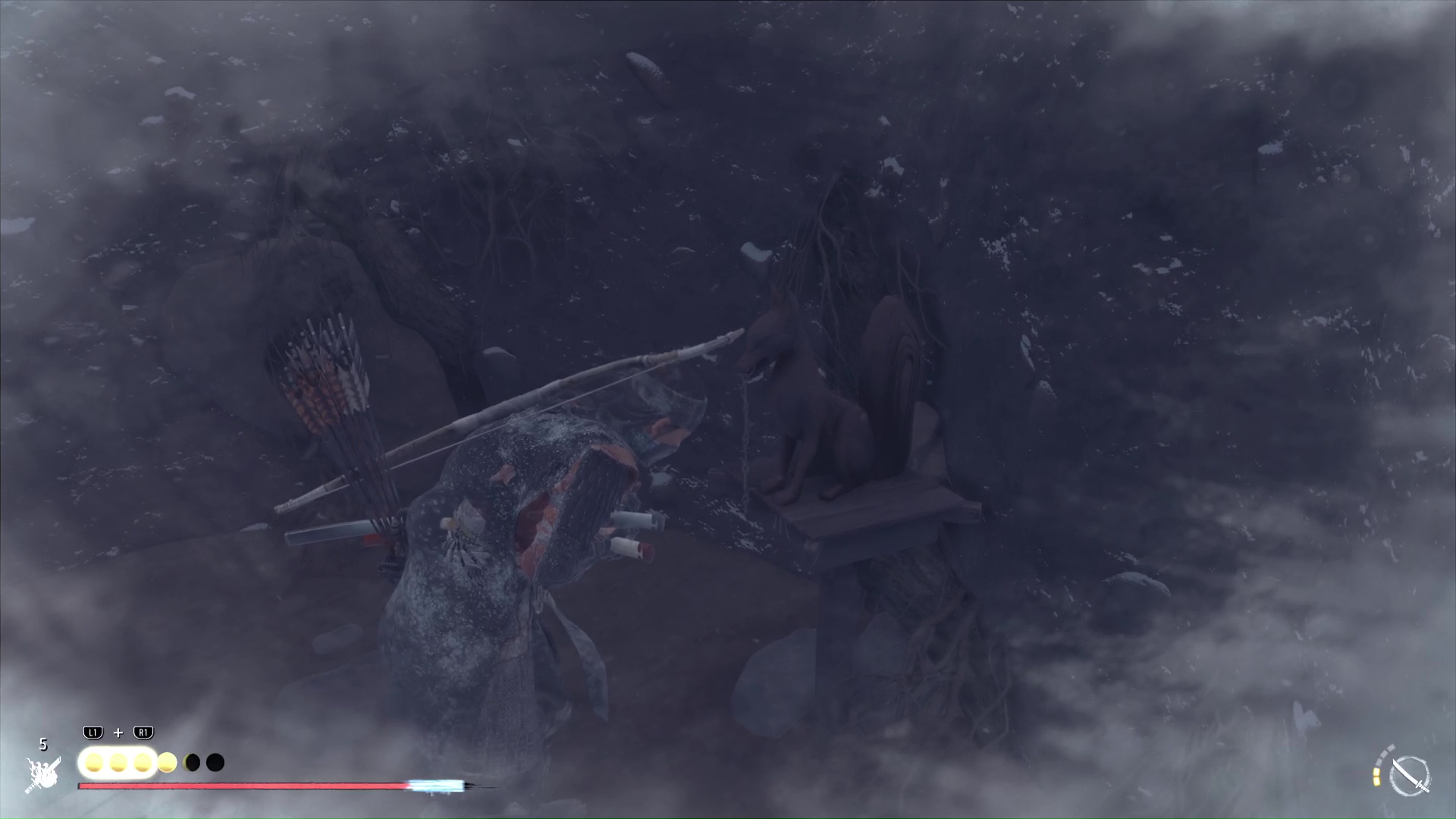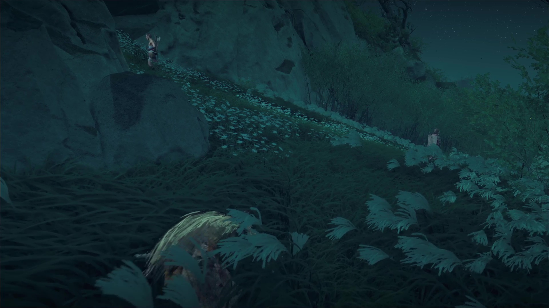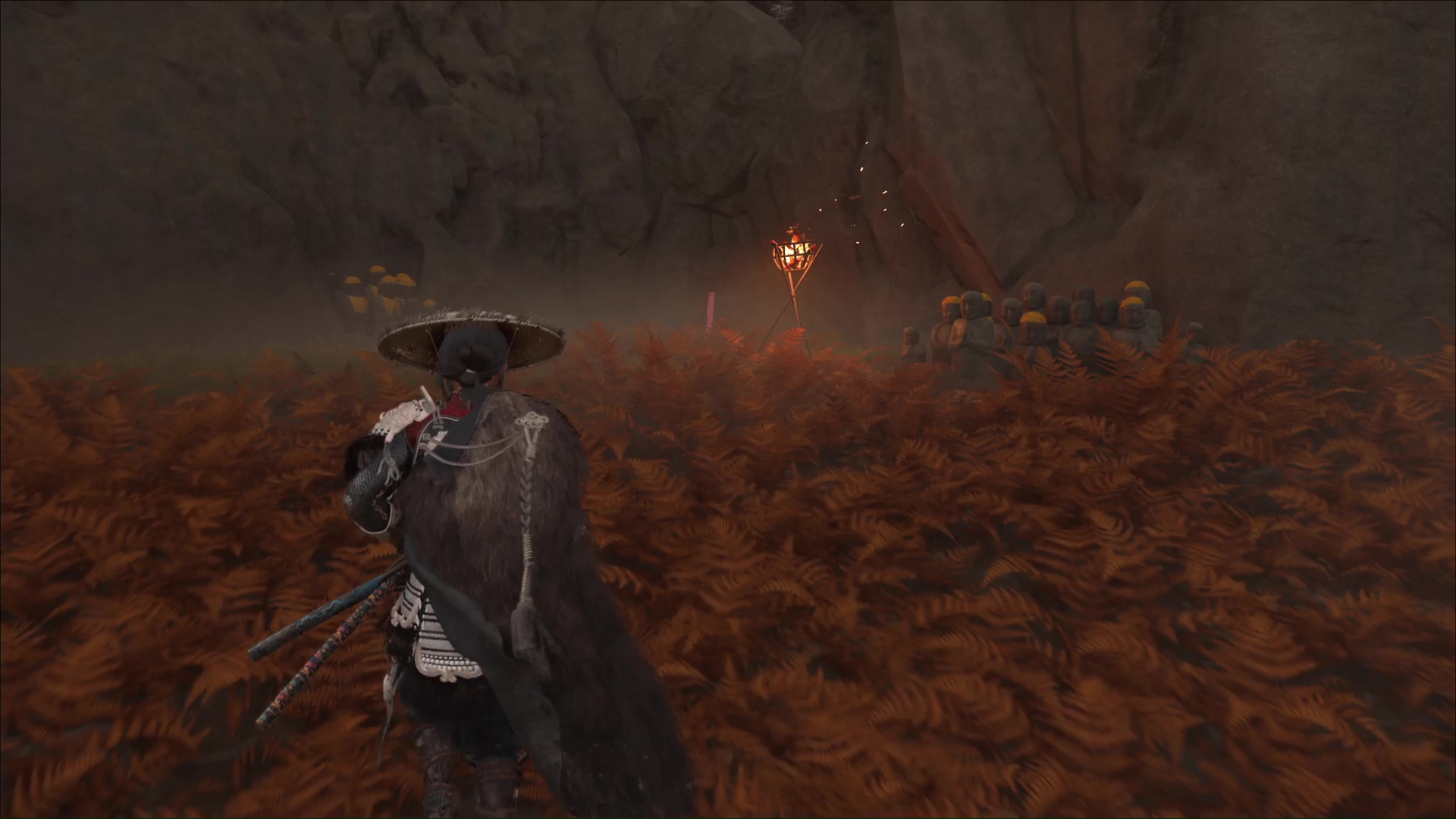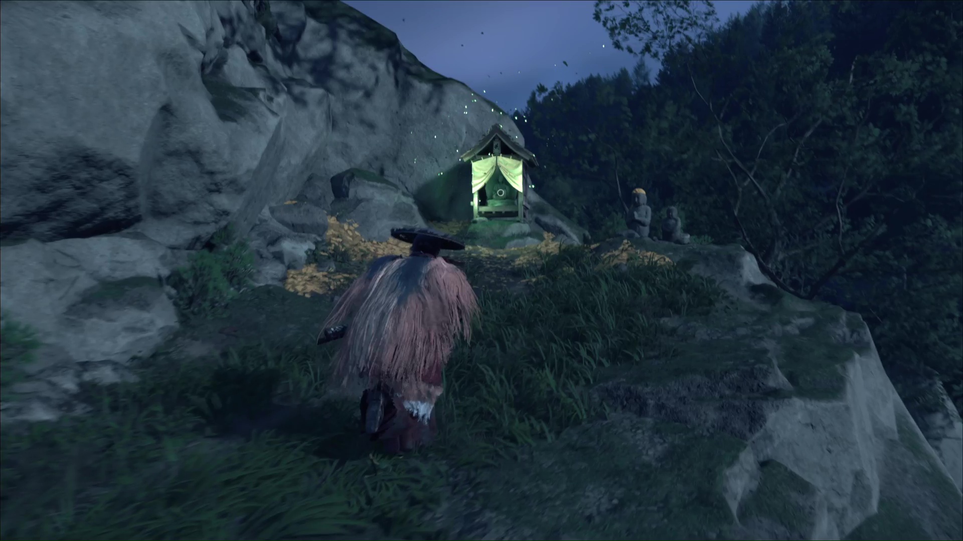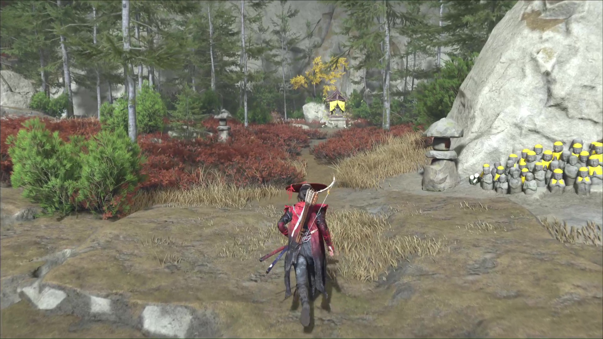 Vers le nord de la région des Prairies de Yōtei, un autel de réflexion se cache dans des fourrés. Cherchez les petites sculptures pour vous indiquer le chemin.