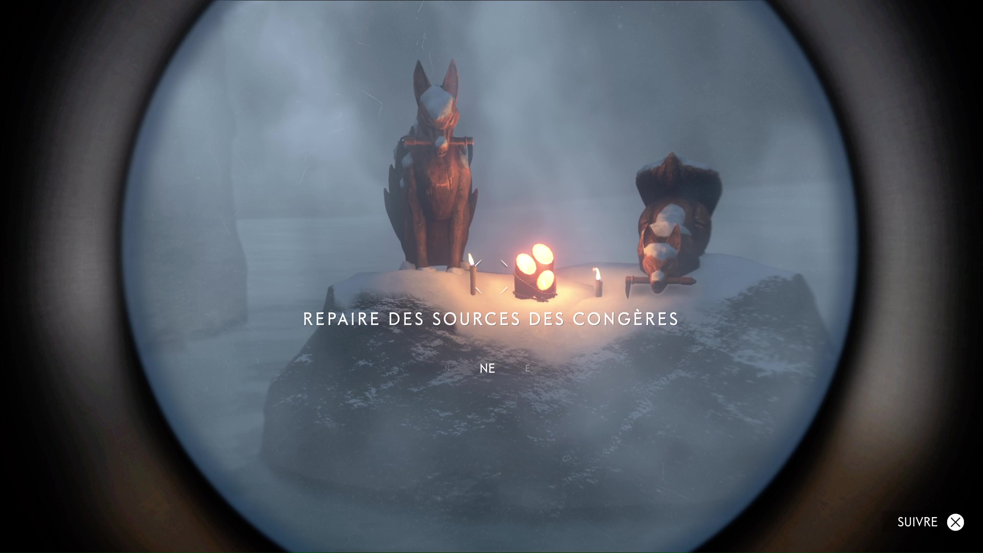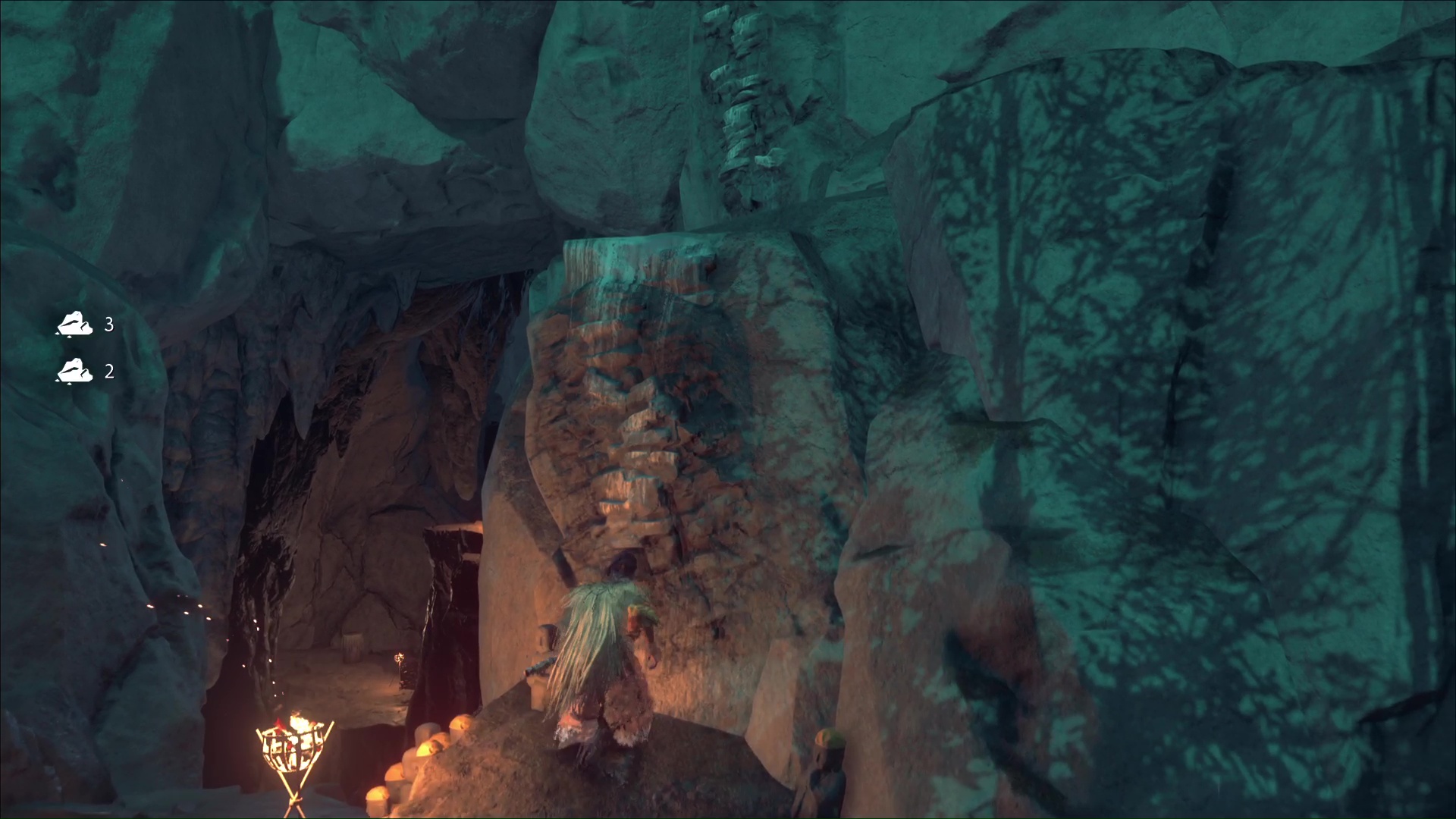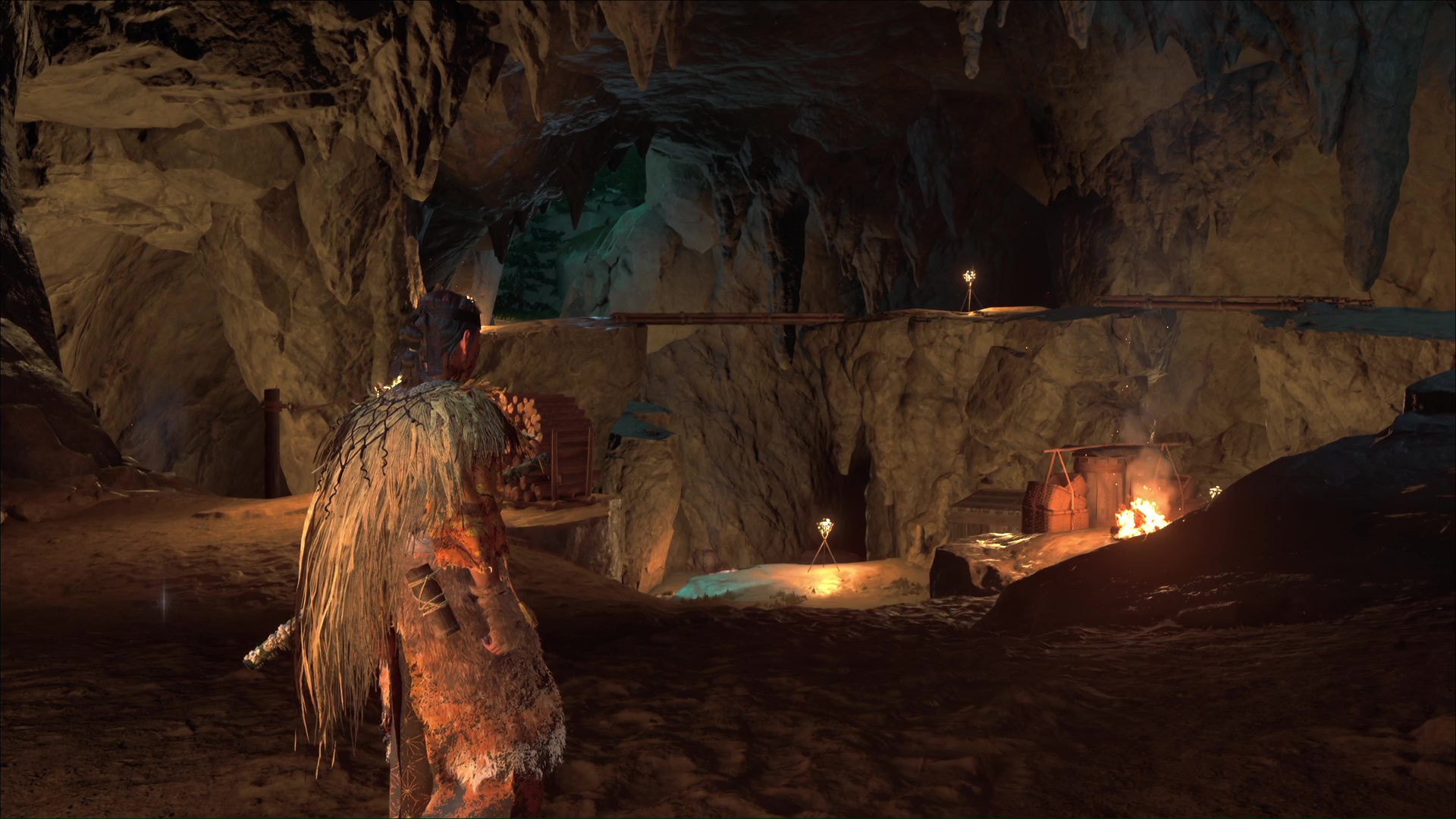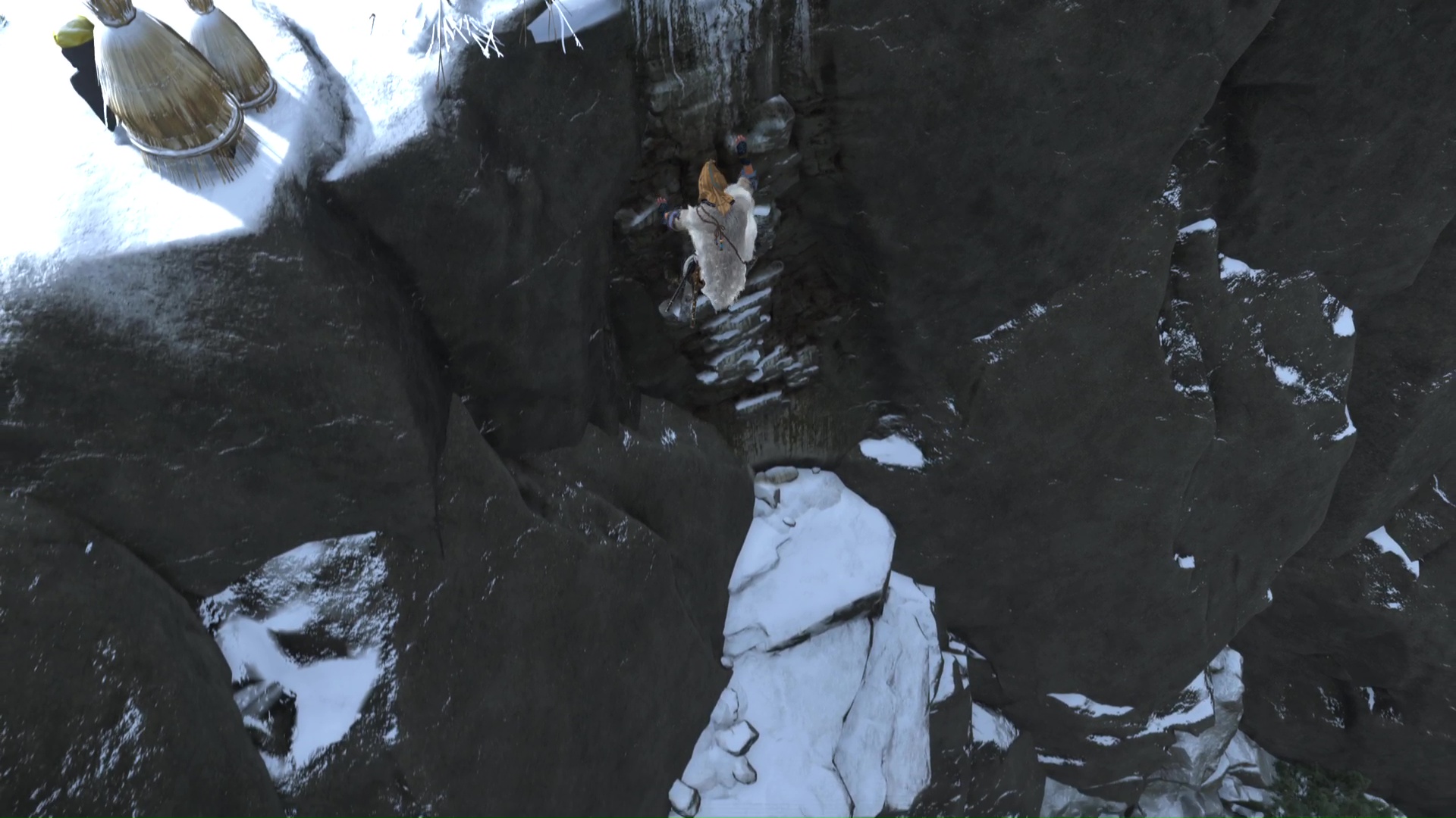 Allez près du grand foyer pour vous réchauffer, puis allez voir les deux statues tout près. Tournez le regard de la statue de gauche vers la droite, et le regard de la statue de droite vers la gauche. Vous libérerez ainsi une corde vous permettant d’aller en face. Montez ensuite quelques parois rocheuses et hissez-vous.