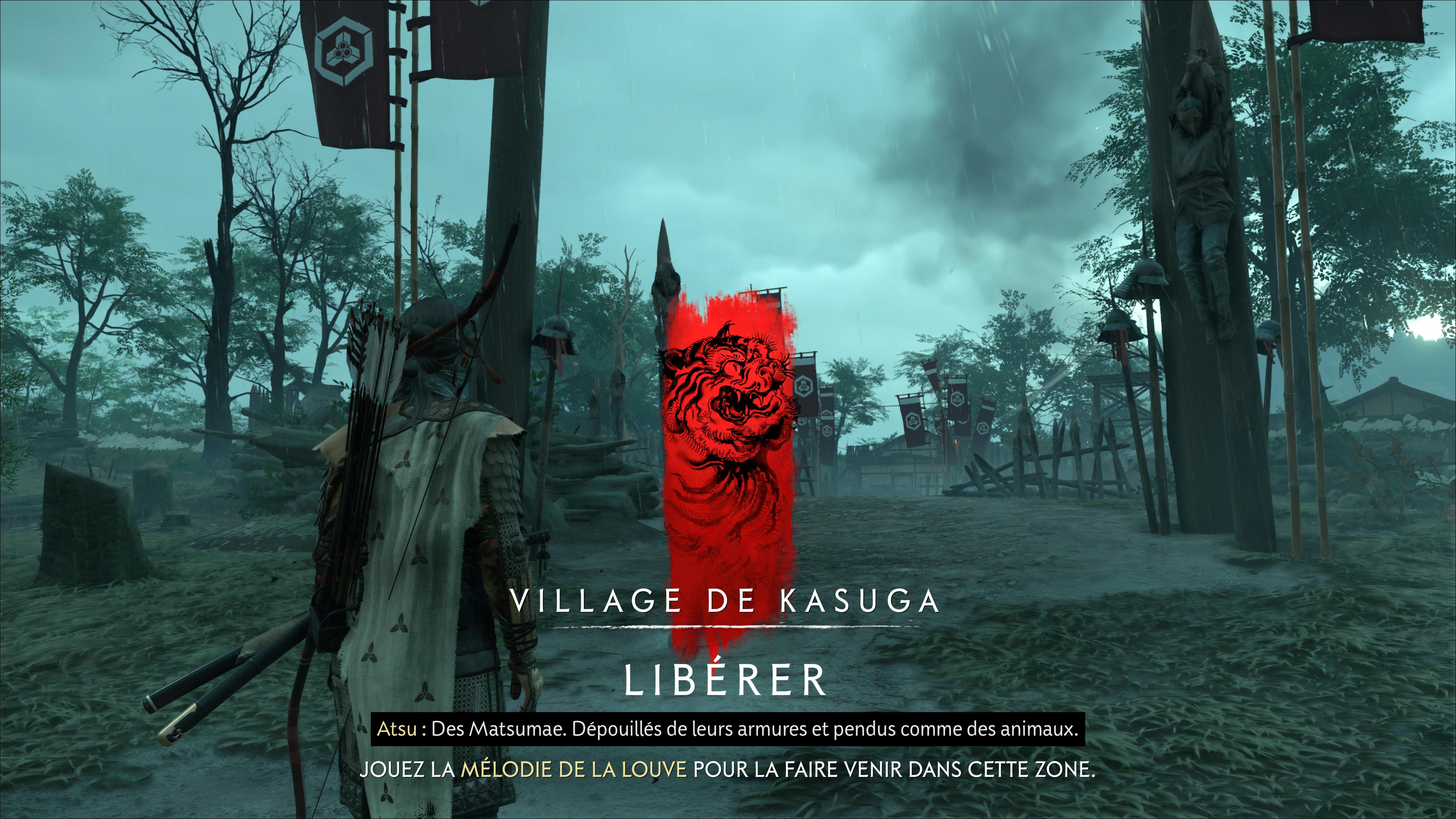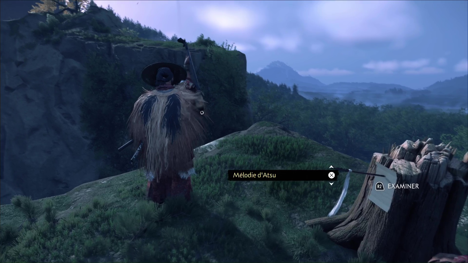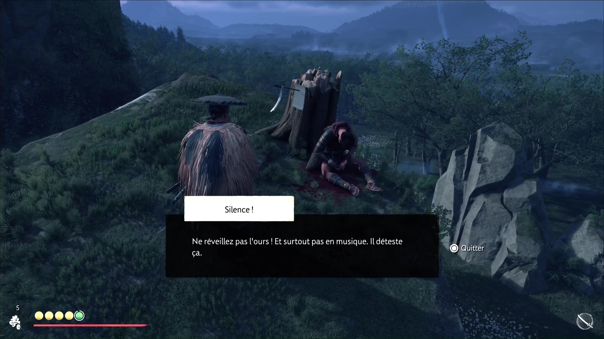 Faites ensuite le tour du rocher pour arriver à un tronc couché faisant le pont vers un autre cadavre. Examinez le papier cloué à une souche qui défend quiconque de jouer de la musique. Justement, sortez-votre shamisen et jouez une mélodie.