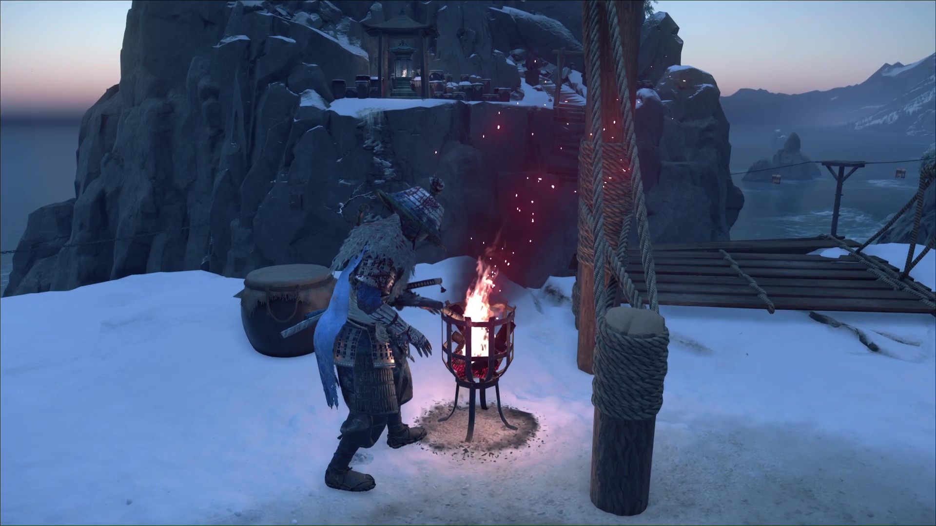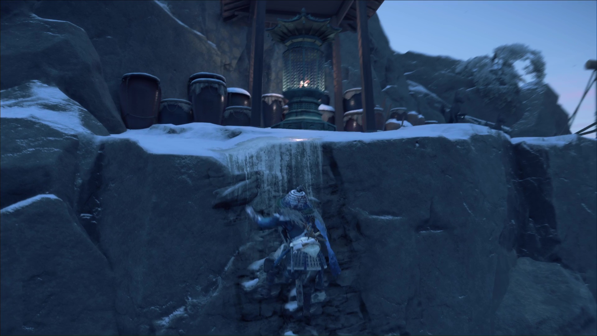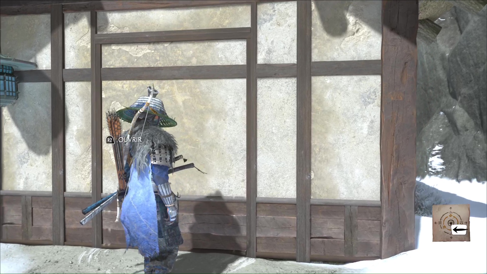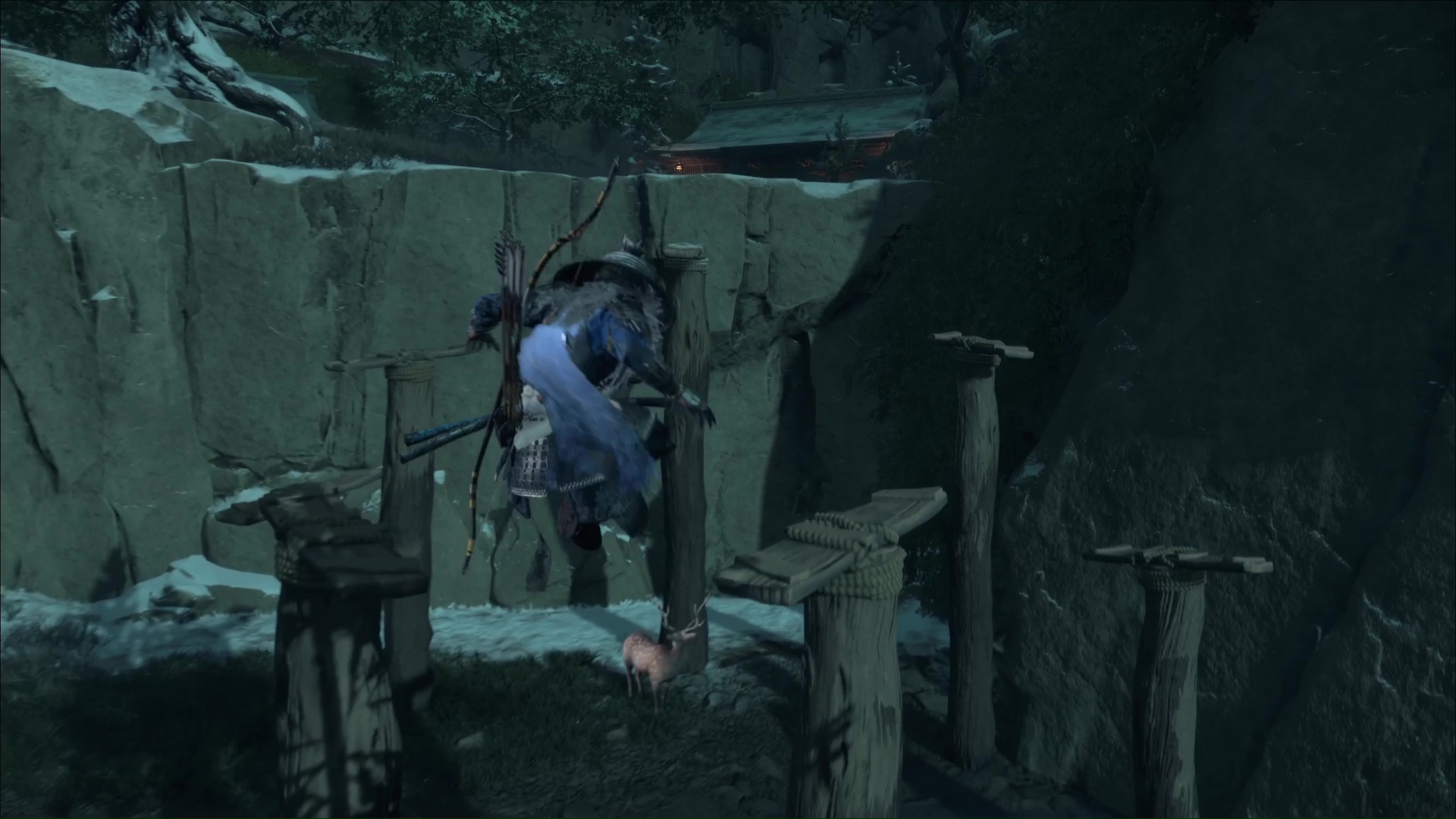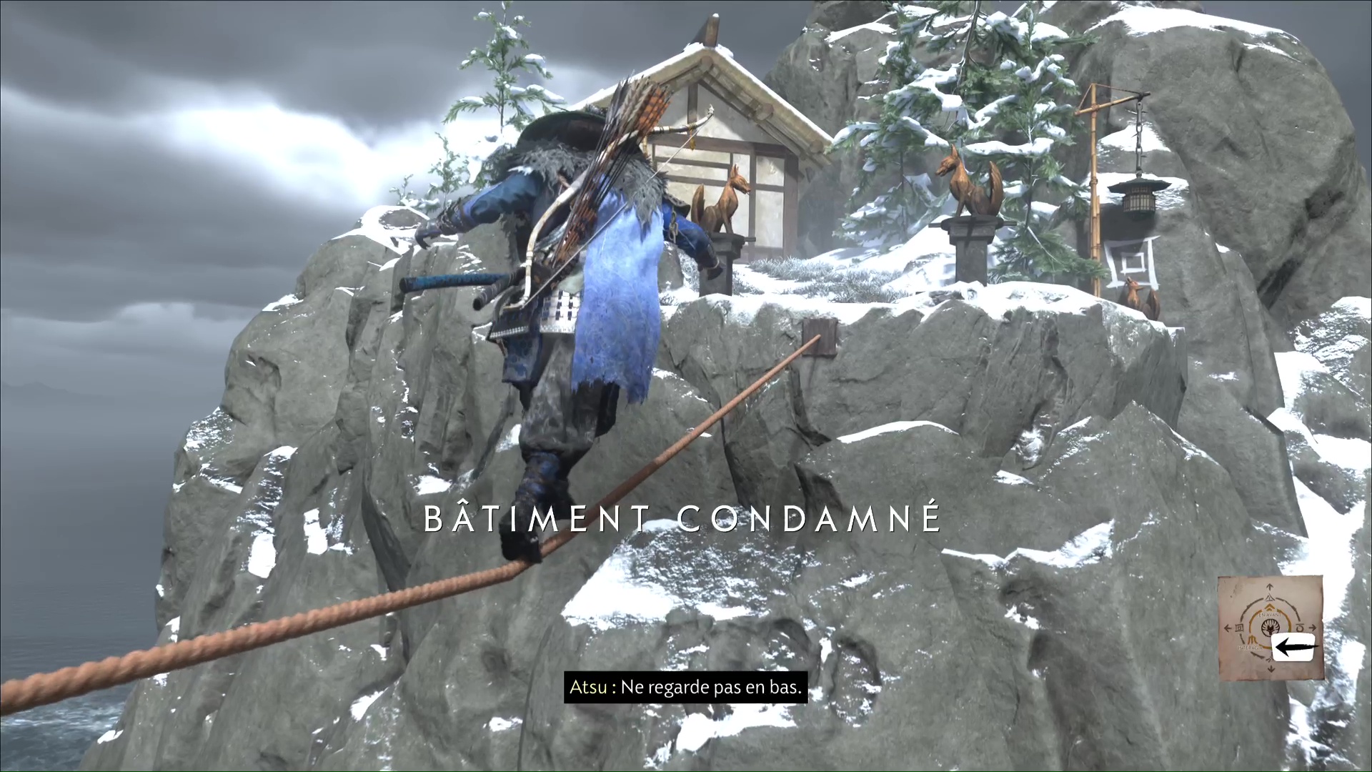 Au bout de quelques instants, un ronin se présente et se plaint d’avoir été réveillé. Après quelques échanges, la conversation se termine. Redescendez grâce aux prises situées juste sous vos pieds.
