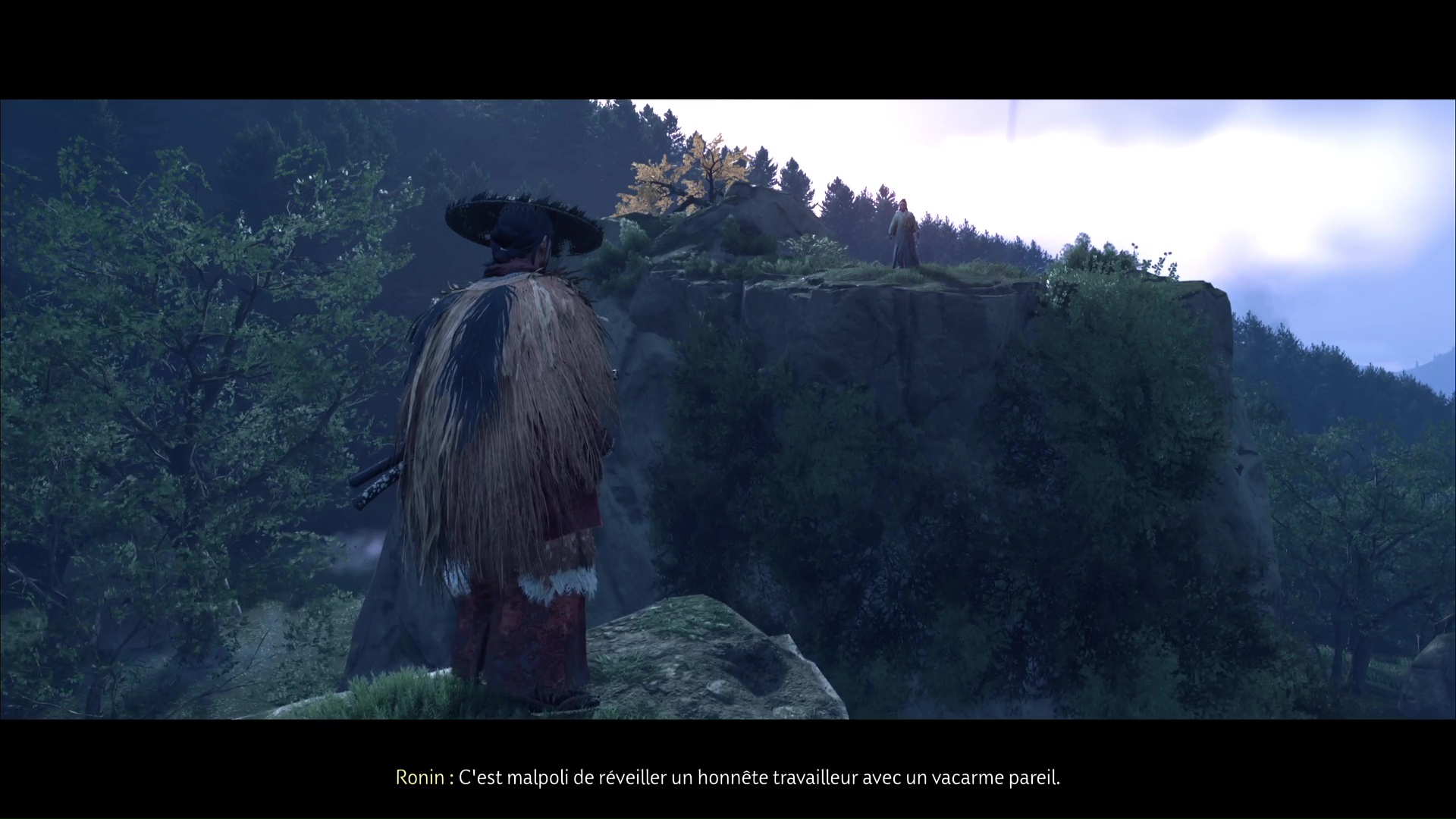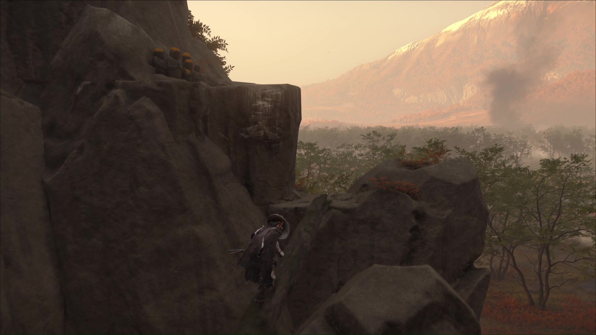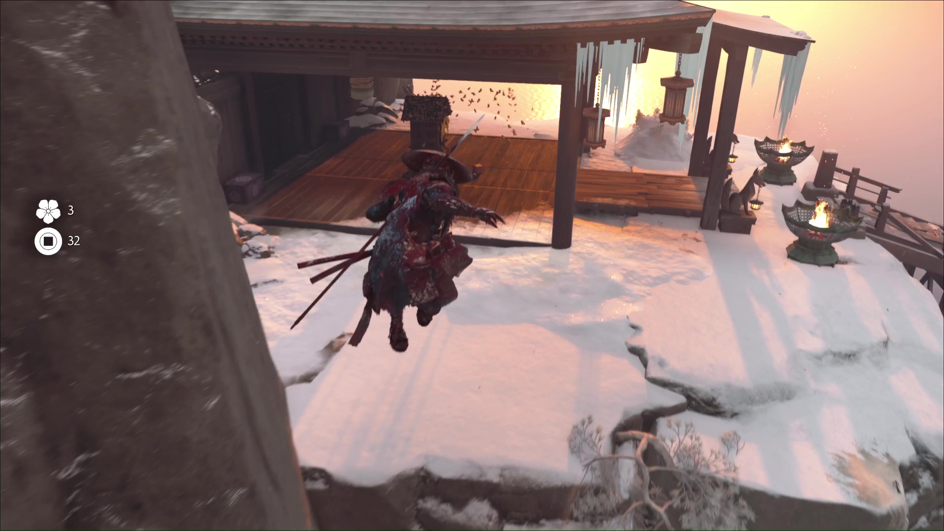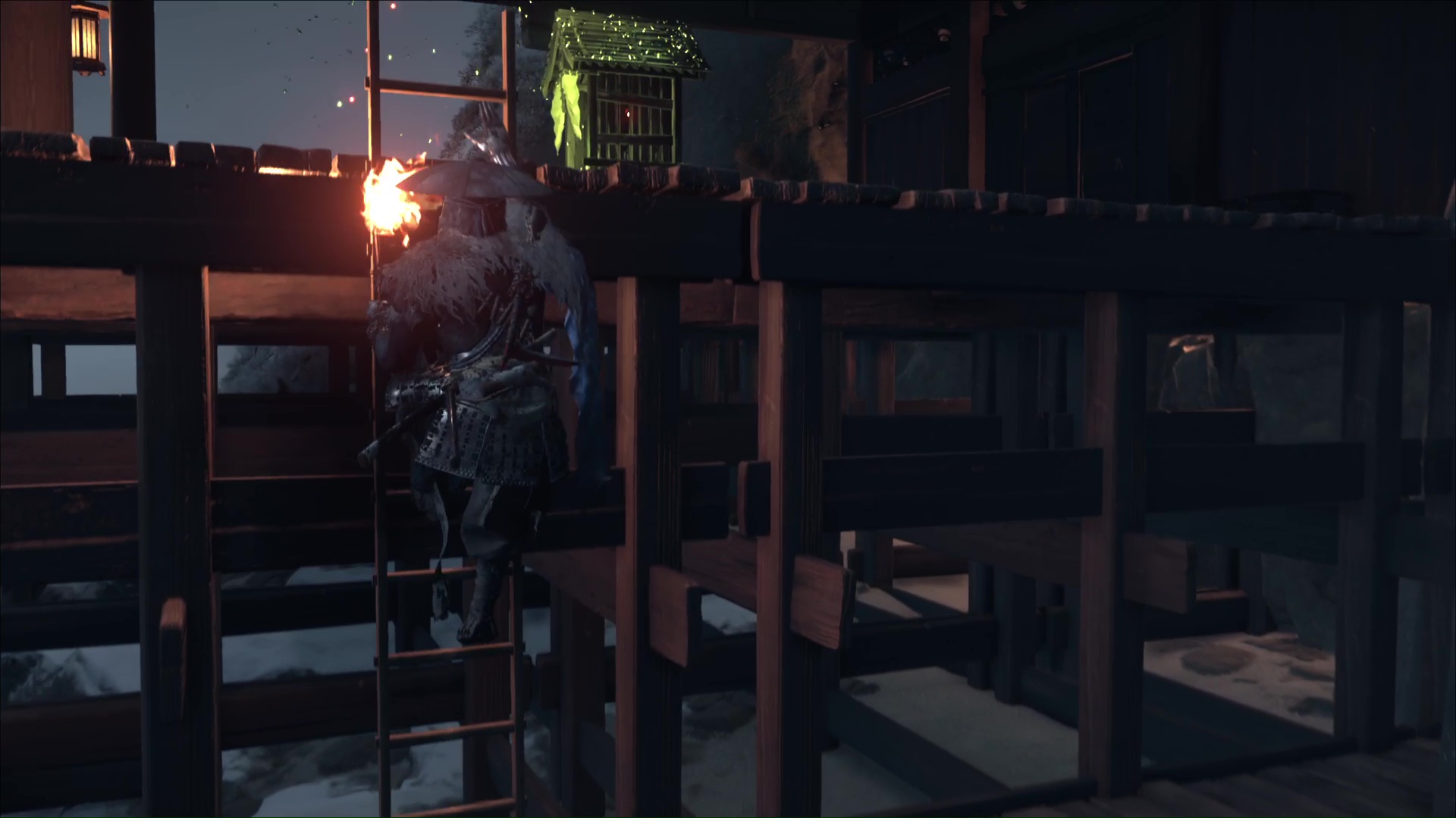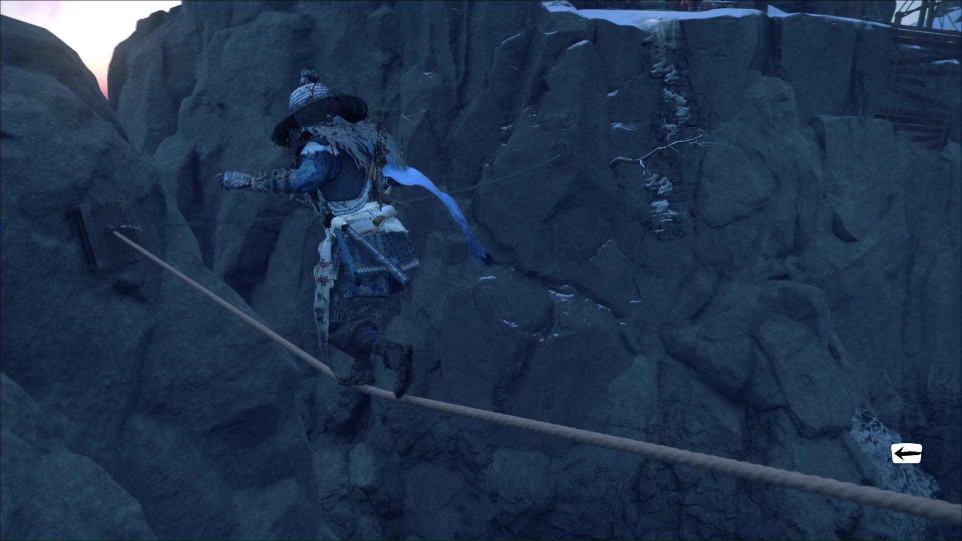 Au bout de quelques instants, un ronin se présente et se plaint d’avoir été réveillé. Après quelques échanges, la conversation se termine. Redescendez grâce aux prises situées juste sous vos pieds.
