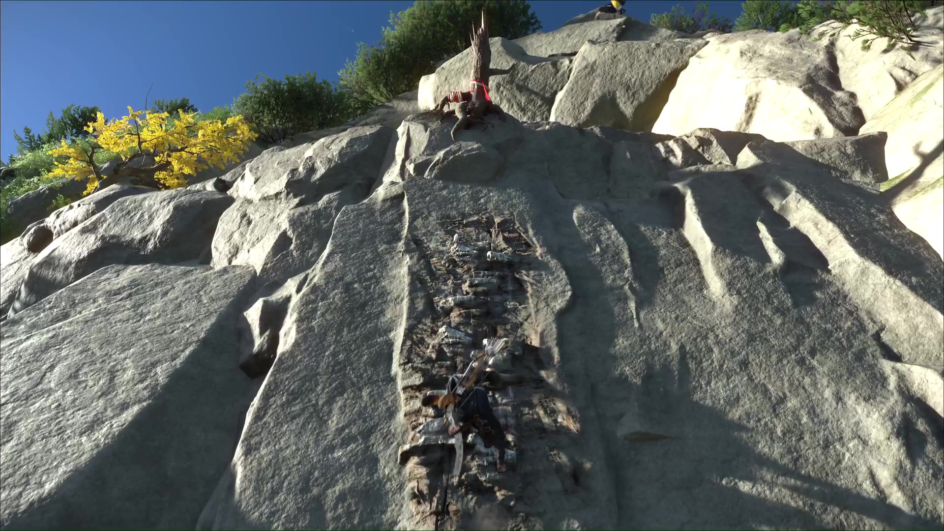 Aux premières sculptures, partez sur la droite et suivez le chemin que d’autres sculptures indiquent. Vous finirez alors par arriver au pied d’une paroi rocheuse d’où ressort des prises d’escalade.