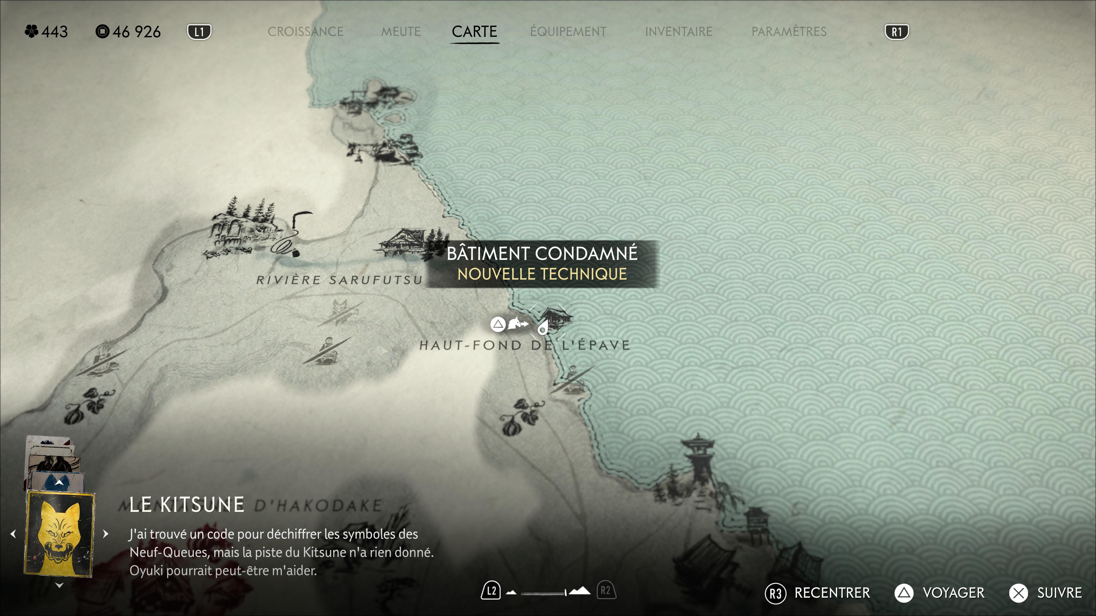 Quelques pas au nord de l’autel de réflexion précédent, et toujours dans la zone du Haut-fond de l’épave donc, un bâtiment est isolé. Grâce aux statues de renard situés devant, vous ouvrirez un passage. Tournez le regard de la statue de gauche vers la droite, et le regard de la statue de droite vers la gauche, et la corde apparaîtra.