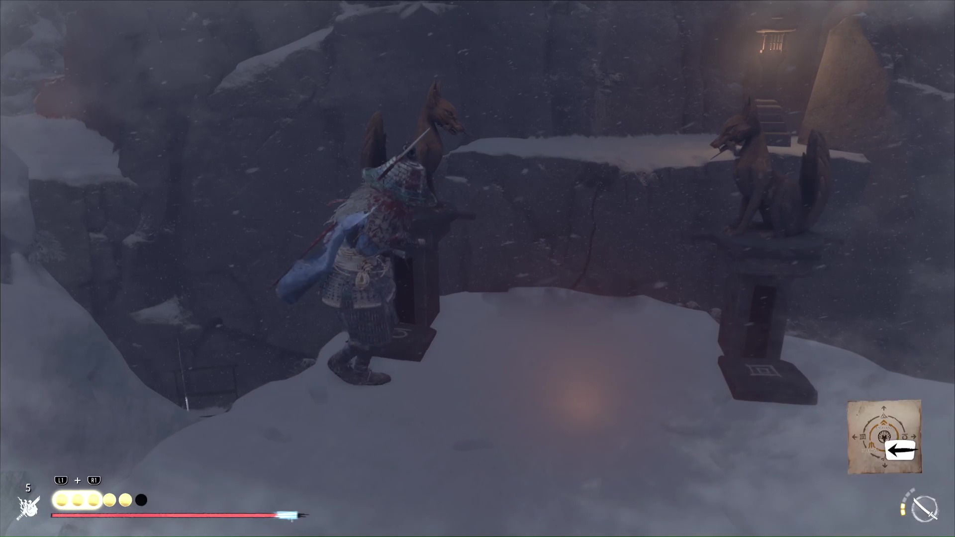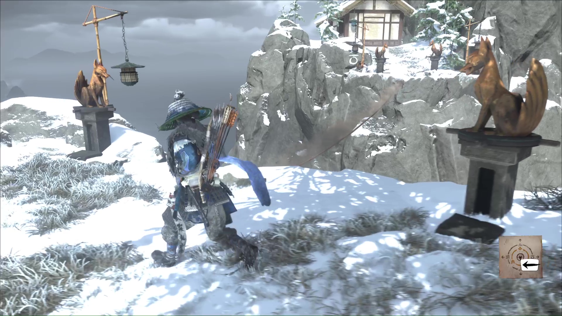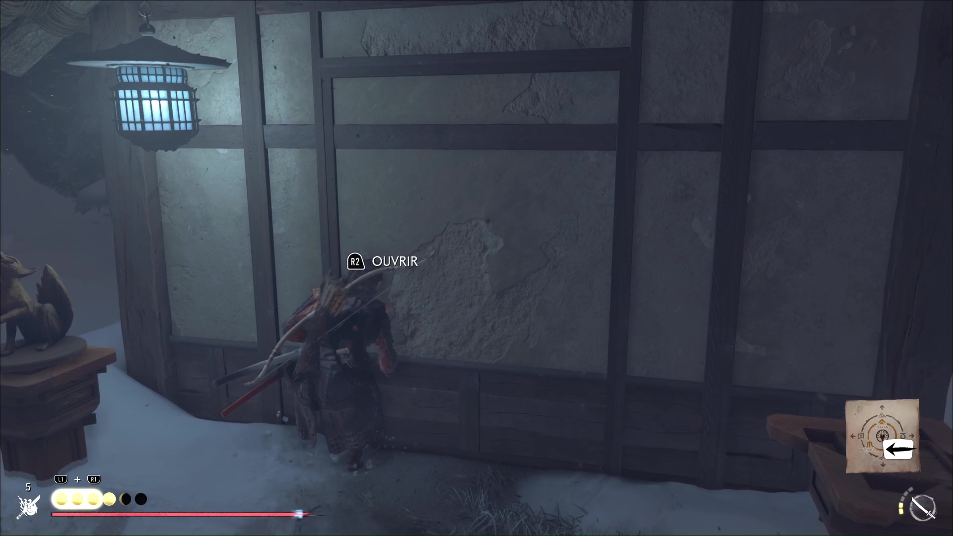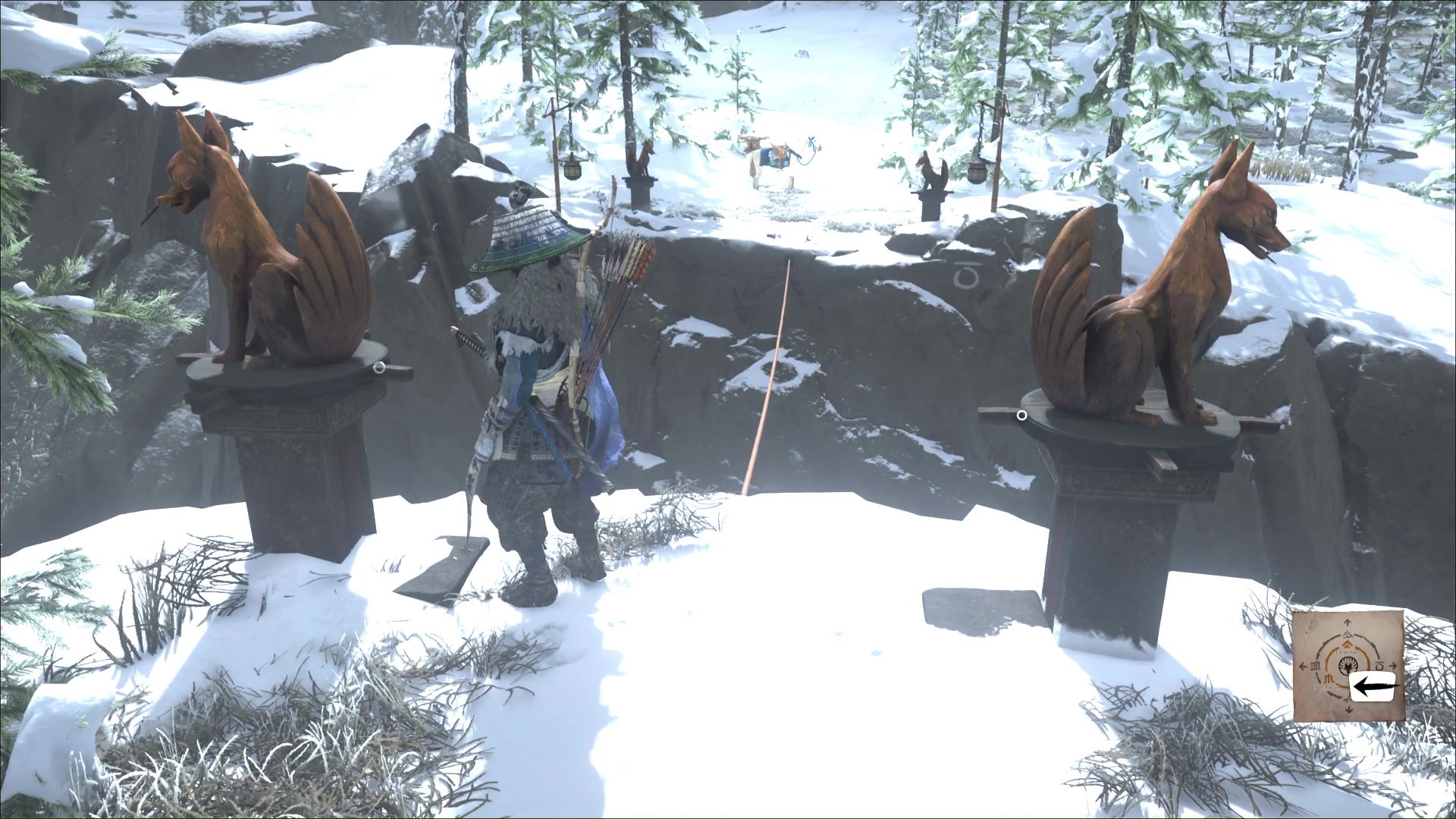 Allez sur la gauche, coupez les bambous fragiles et allez récupérez la statuette de renard. Ramenez-la sur son socle devant le bâtiment condamné puis passez à travers la porte secrète.
