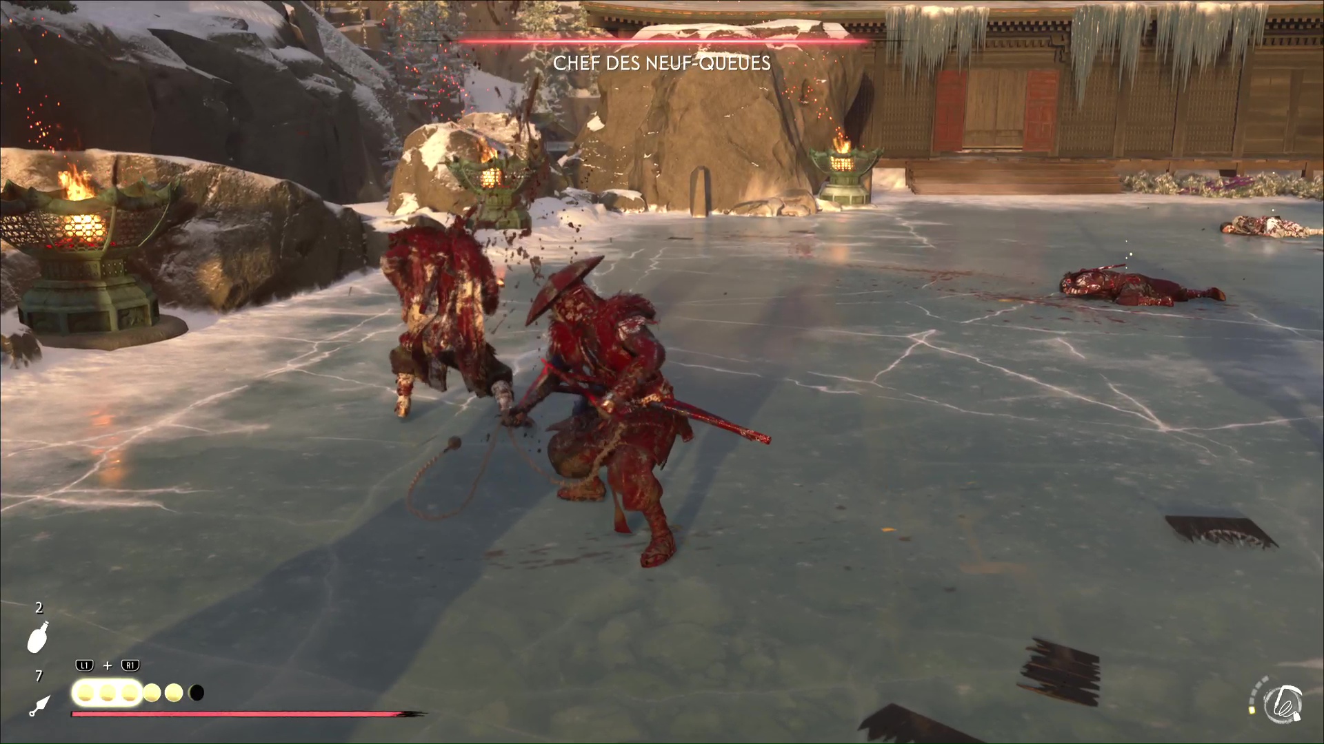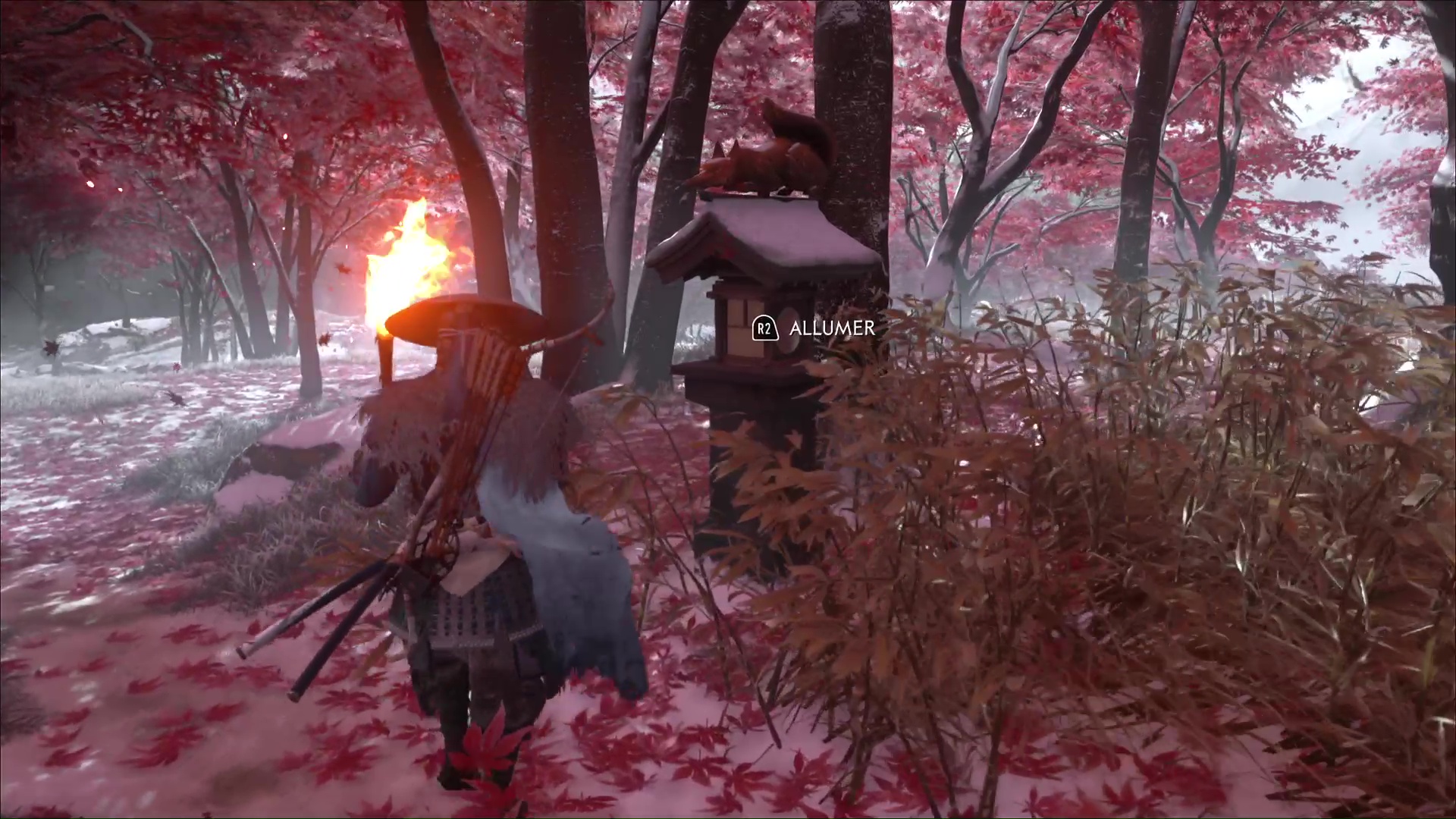 Sur place, éliminez les Neuf-Queues présents et préparez-vous à réussir une petite énigme. Saisissez-vous d’une torche auprès du petit braséro puis allez allumer deux lanternes avec la statue de renard en position couchée.