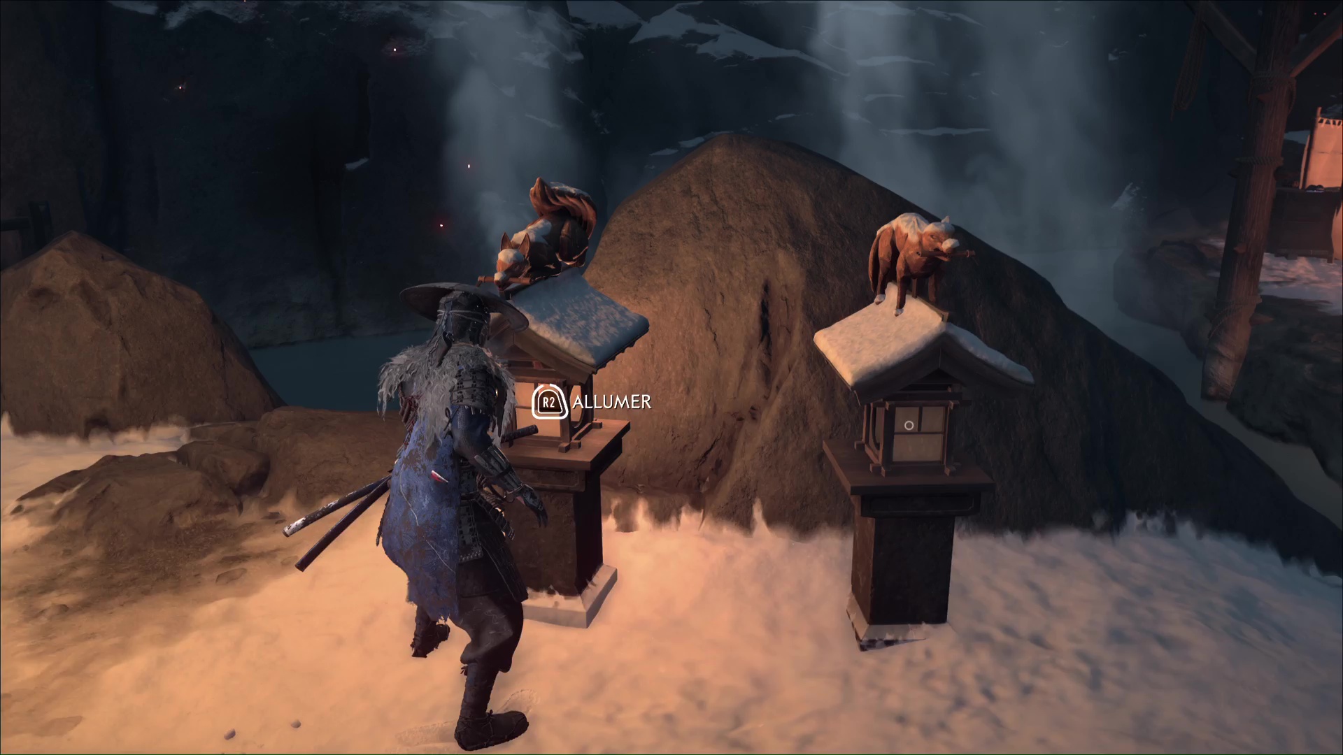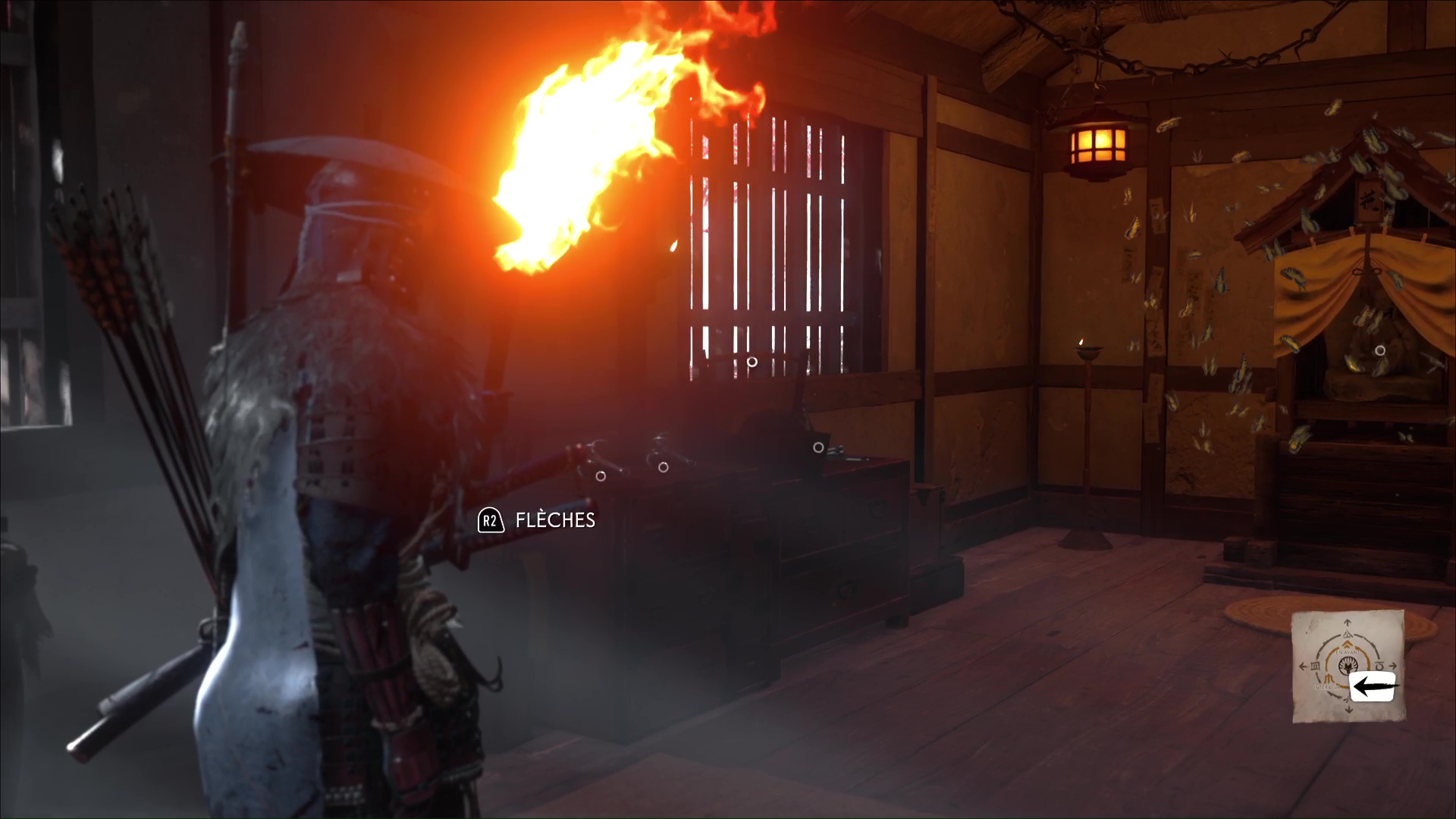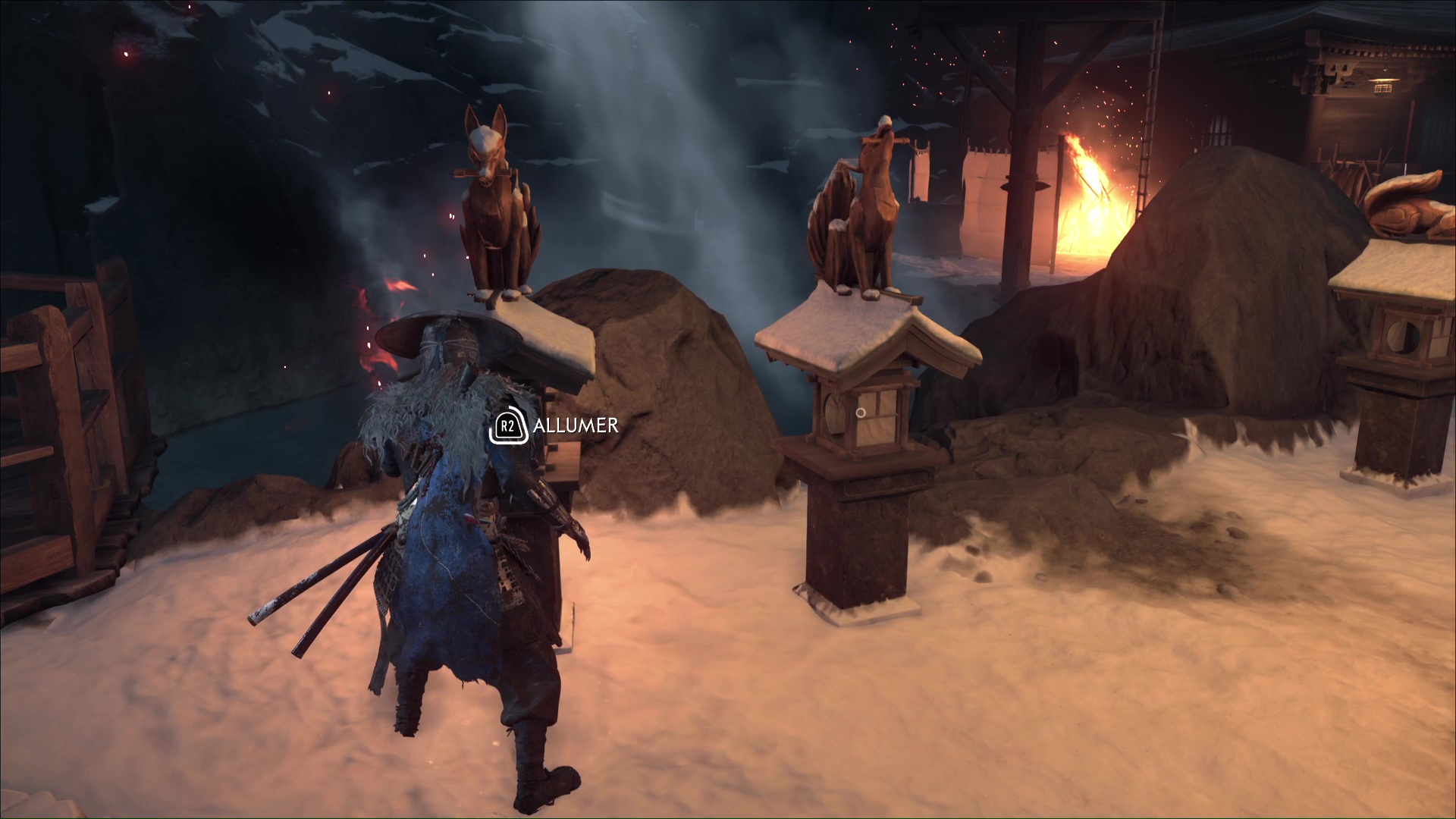 Une fois que tout le monde est mort au repaire, il reste une petite énigme à réussir afin d’atteindre l’autel. au fond de la zone, il y a des lanternes de renard à allumer. Prenez une torche dans le braséro et remarquez les deux statues qu’il faut éclairer.