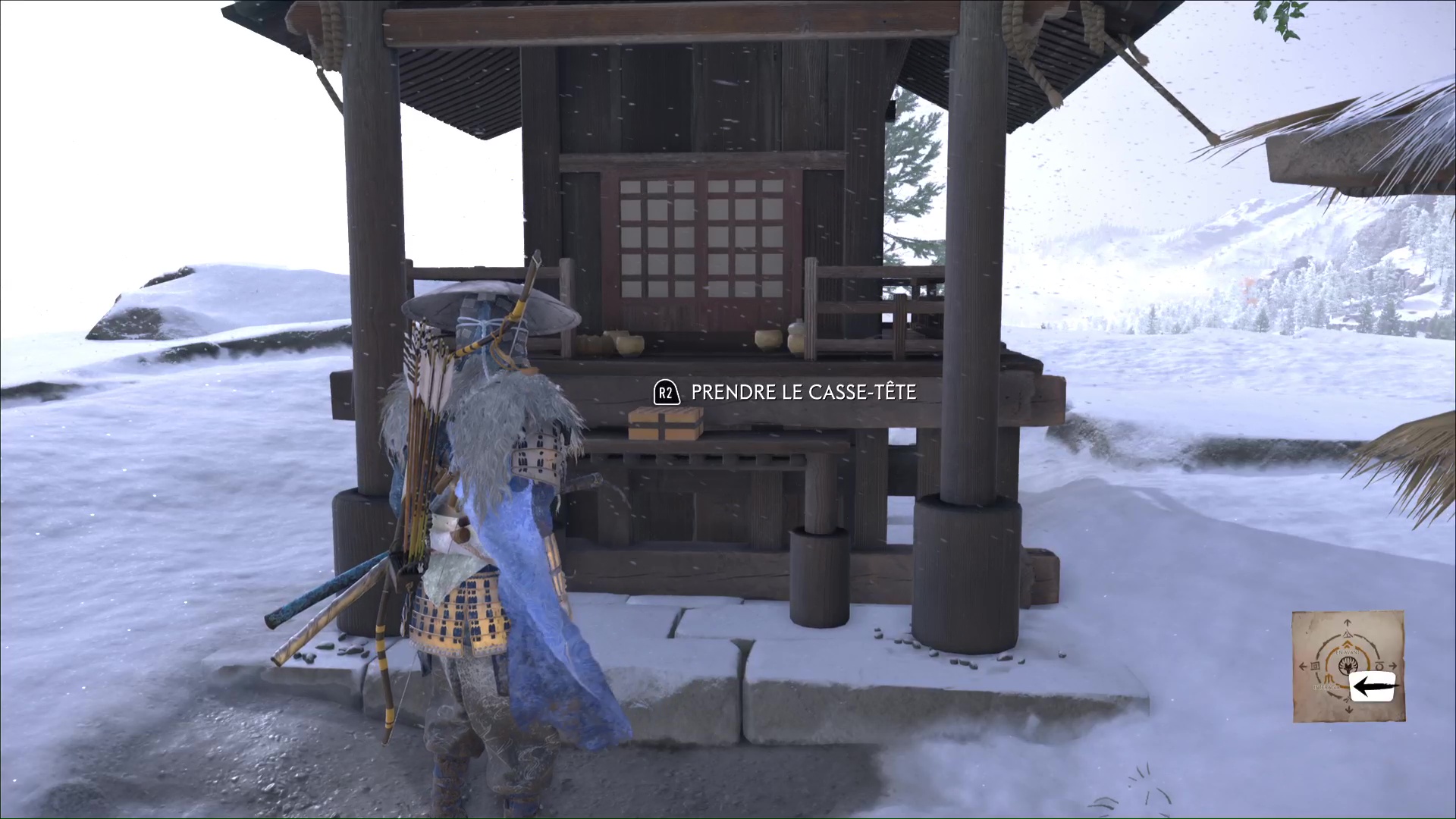 Rendez-vous à la Côte de Teshio, une zone isolée à l’ouest de la région, là où se trouve l’entrée du Repaire du fléau des neiges. Tout près de ce repaire, et au bord de la côte, vous tomberez sur un Autel du Kitsune. La boîte singulière repose dessus.