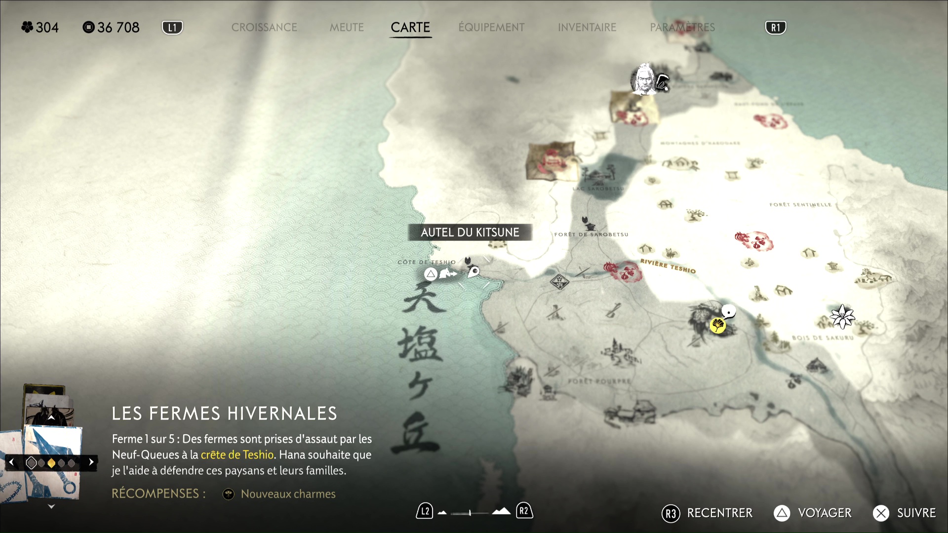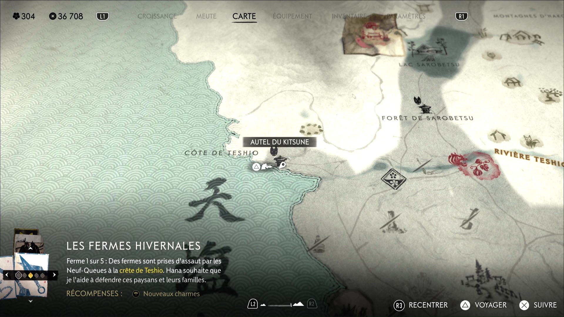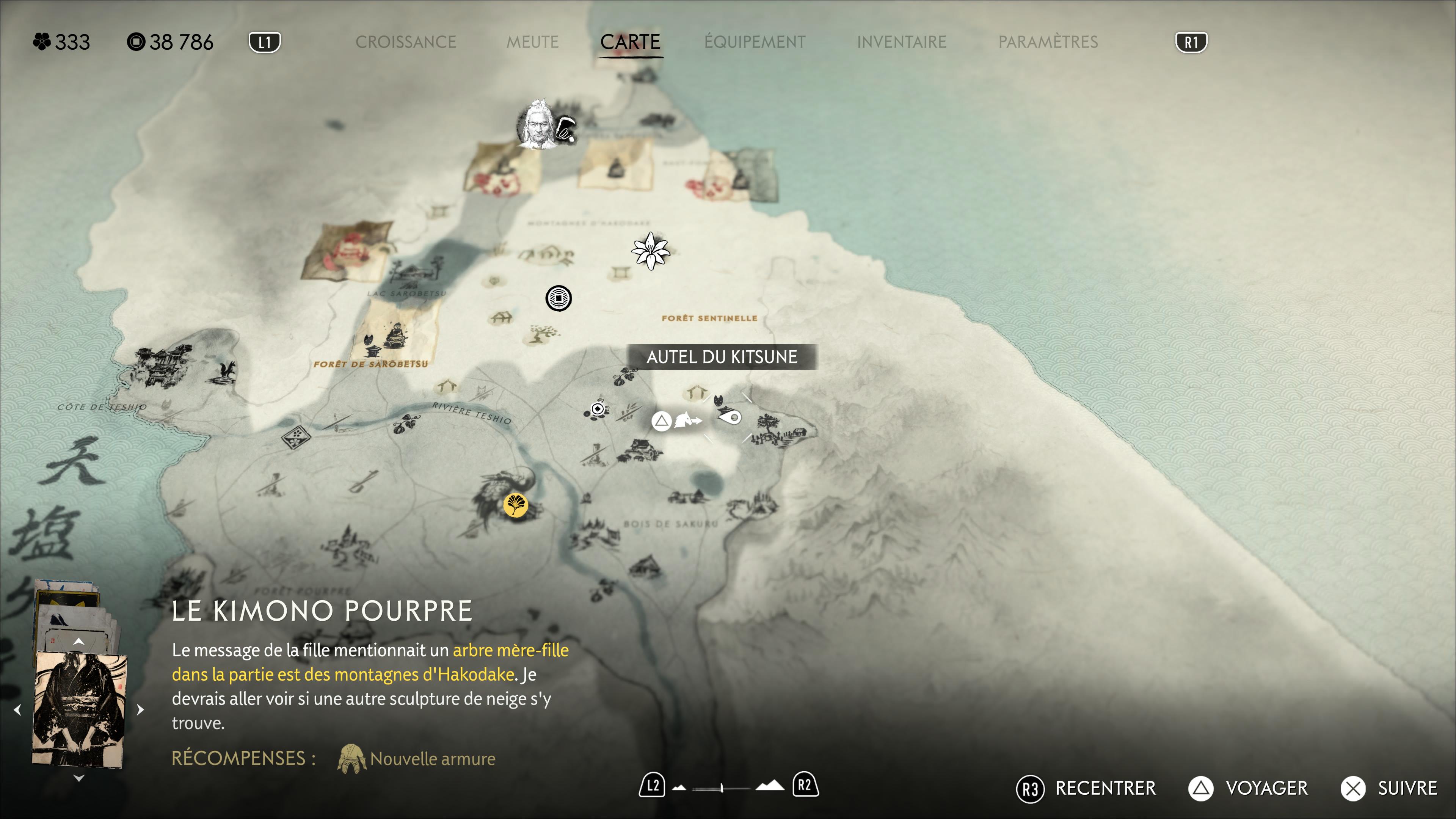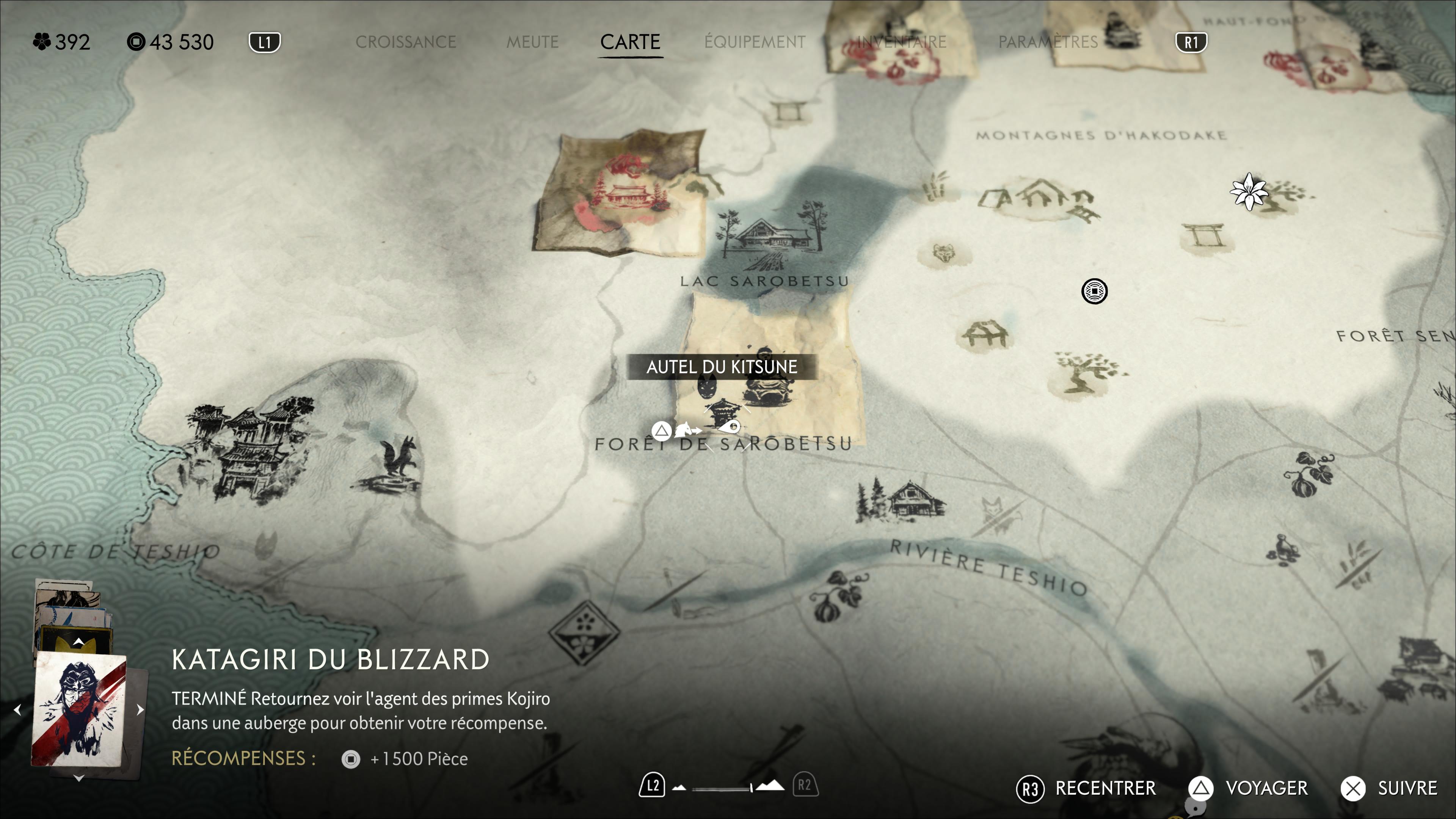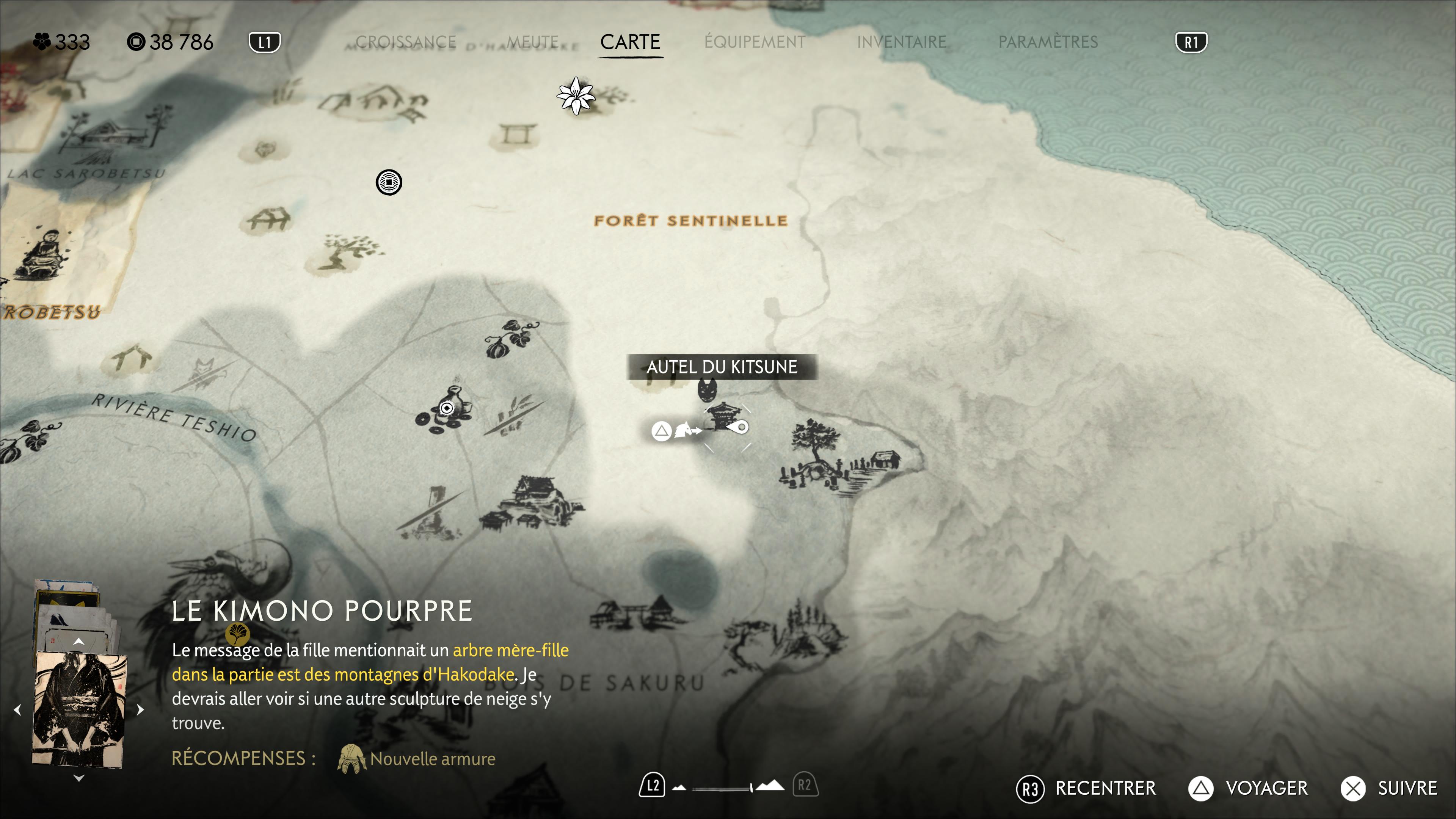 Ouvrez votre carte vers l’ouest de la région pour apercevoir la zone Forêt de Sarobetsu. Dirigez-vous pile au centre de l’inscription de la zone sur la map pour tomber sur l’Autel du Kitsune sur lequel est posée la boîte.
