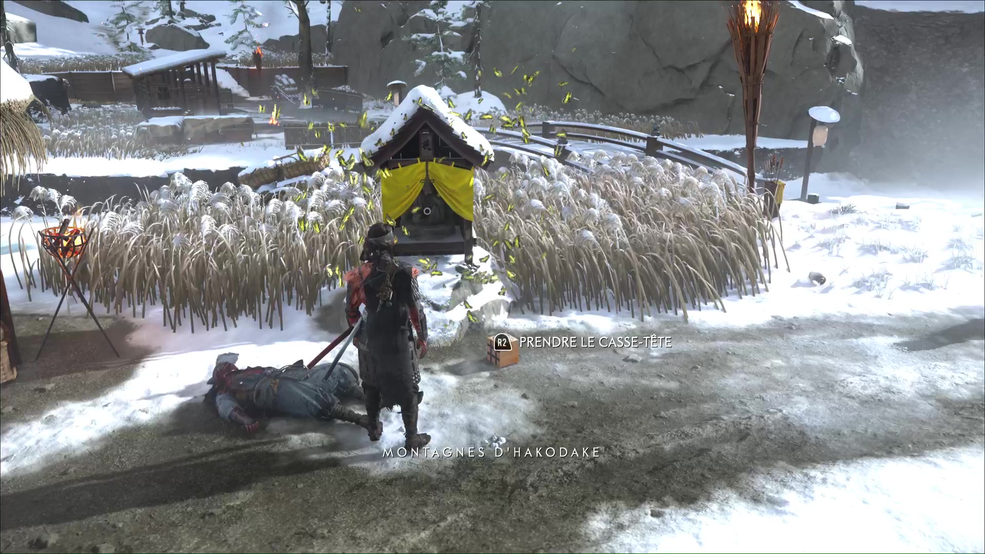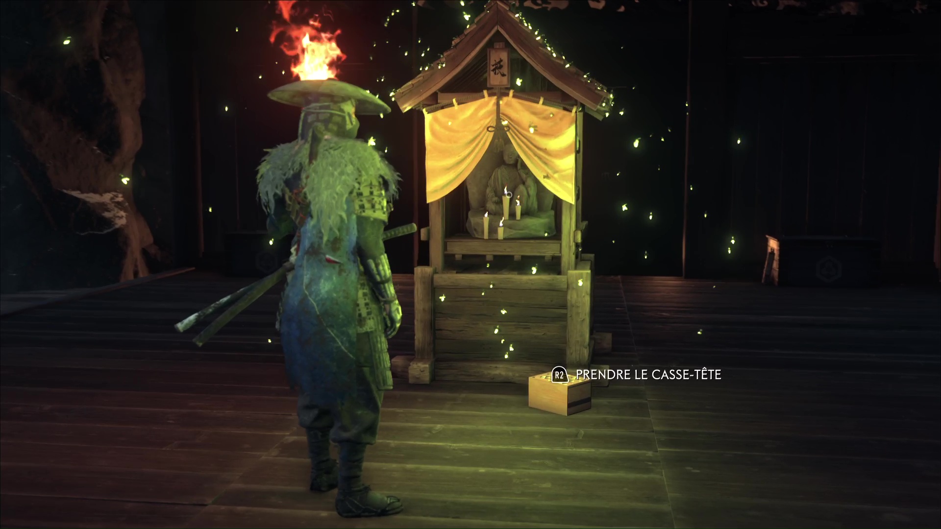 Une fois que le repère est vidé, il reste une petite énigme à réussir pour arriver au bout du repaire. Au fond de la zone, il y a des lanternes de renard à allumer. Prenez une torche dans le braséro et remarquez les deux statues qu’il faut éclairer.