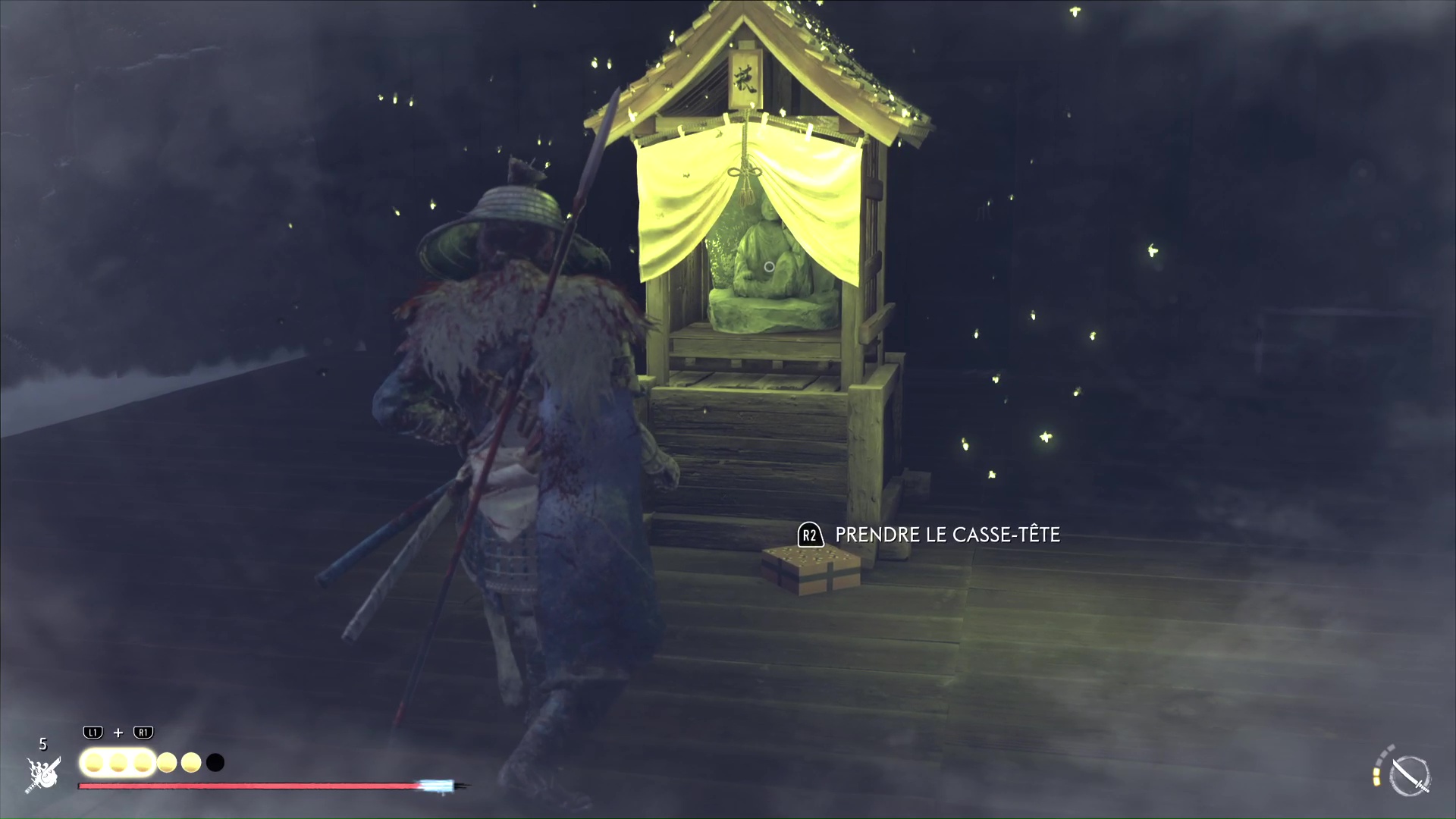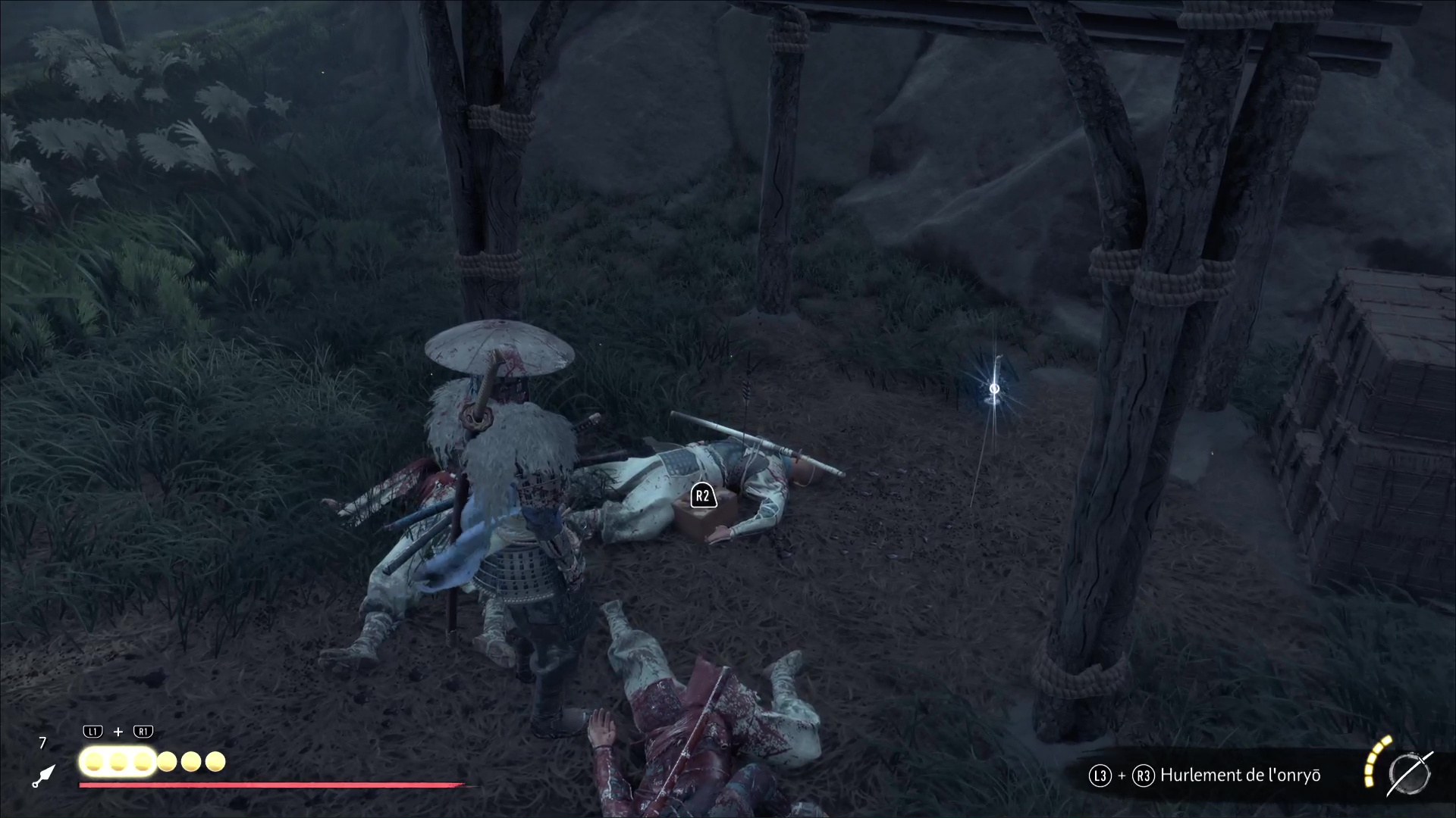 Outre les ennemis à tuer, vous aurez aussi à illuminer des lanternes de renard pour progresser. Dans la première et la deuxième partie du camp, la torche et la lanterne à allumer se trouveront à gauche du pont brisé, lorsque vous lui faites face.