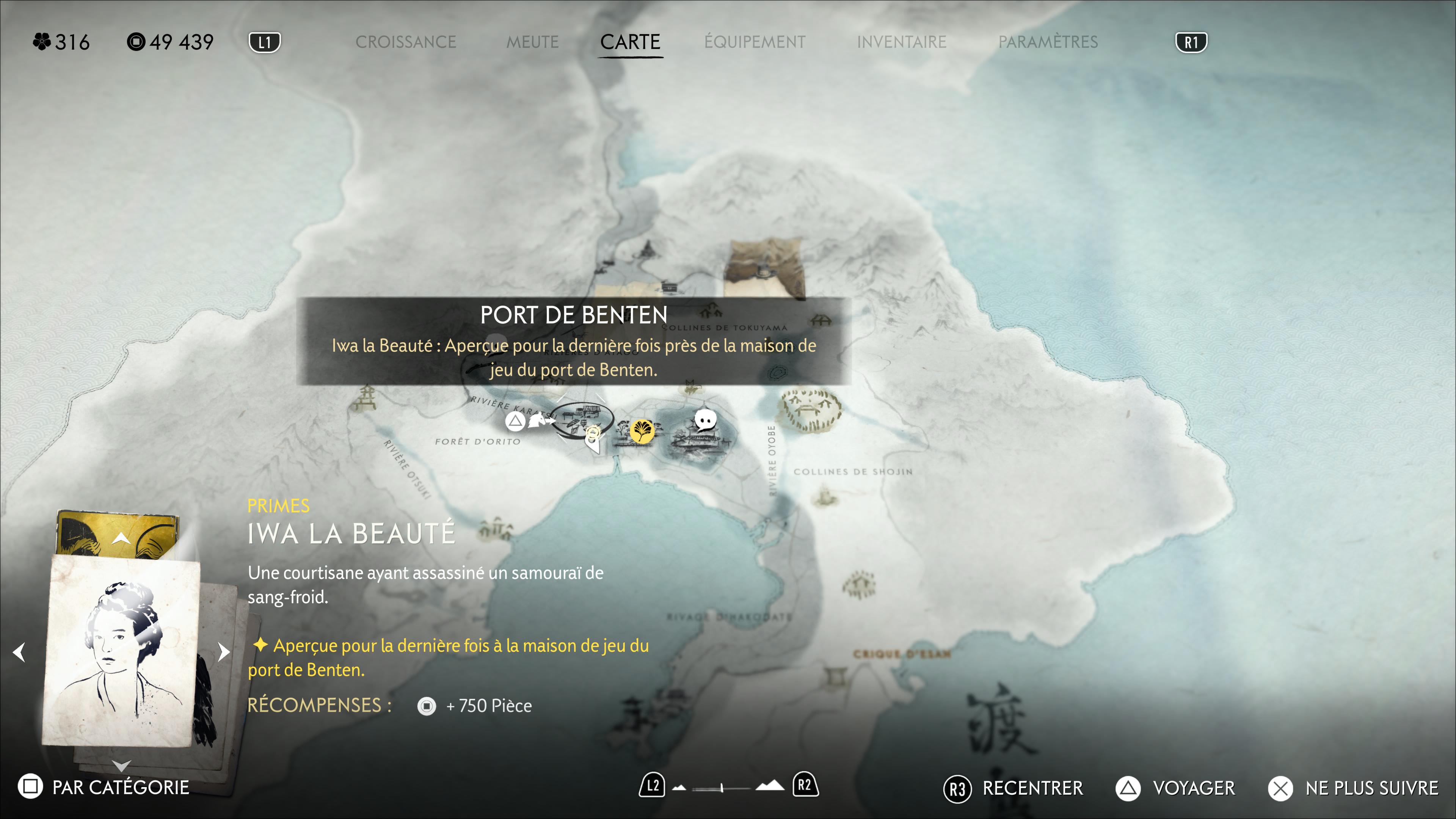 Voilà un profil de cible encore jamais rencontré jusqu’ici. Une courtisane a assassiné un samouraï et est donc désormais recherchée. Vous allez devoir vous aventurer vers la maison de jeu du Port de Benten, à l’ouest des Résidences des Matsumae. Vous trouverez la maison de jeu sur la place où se trouve l’armurier Ginji.