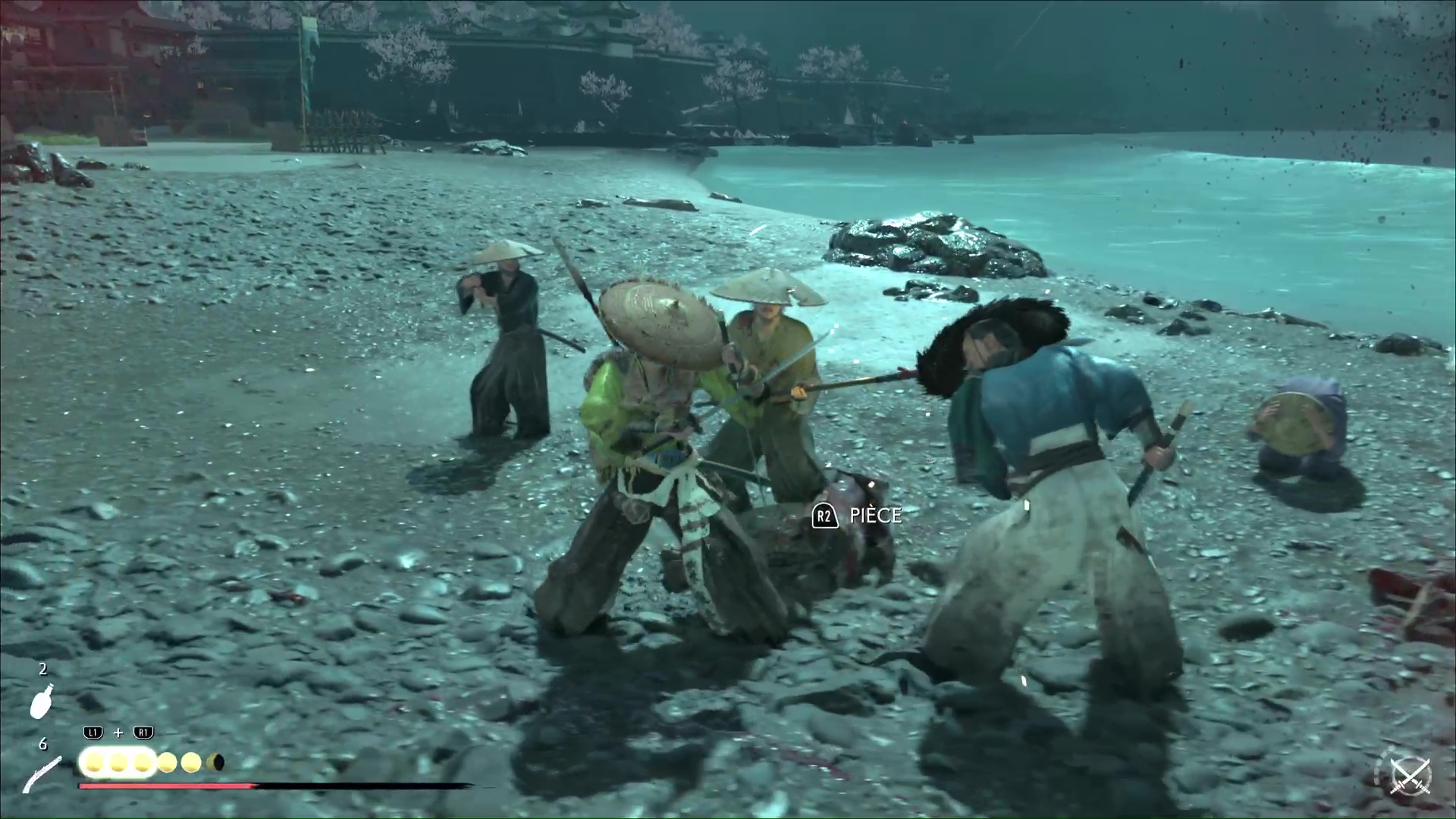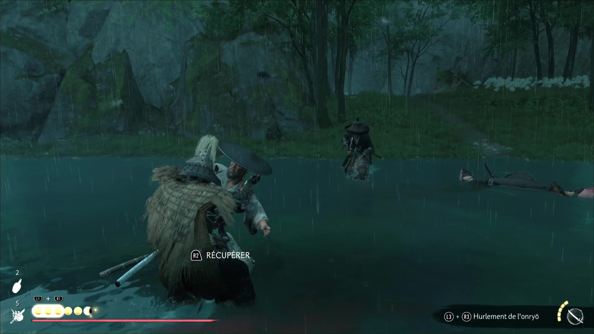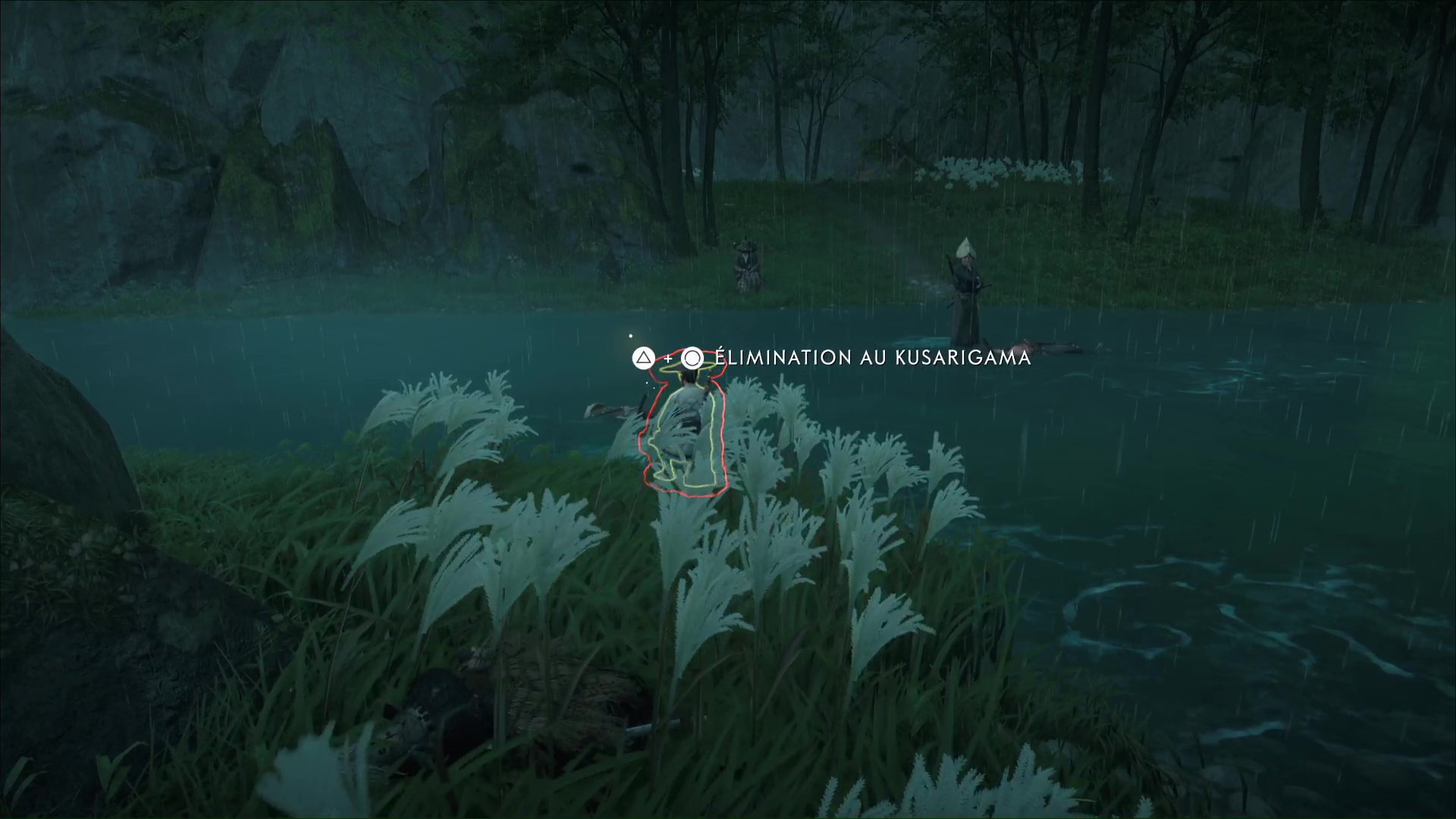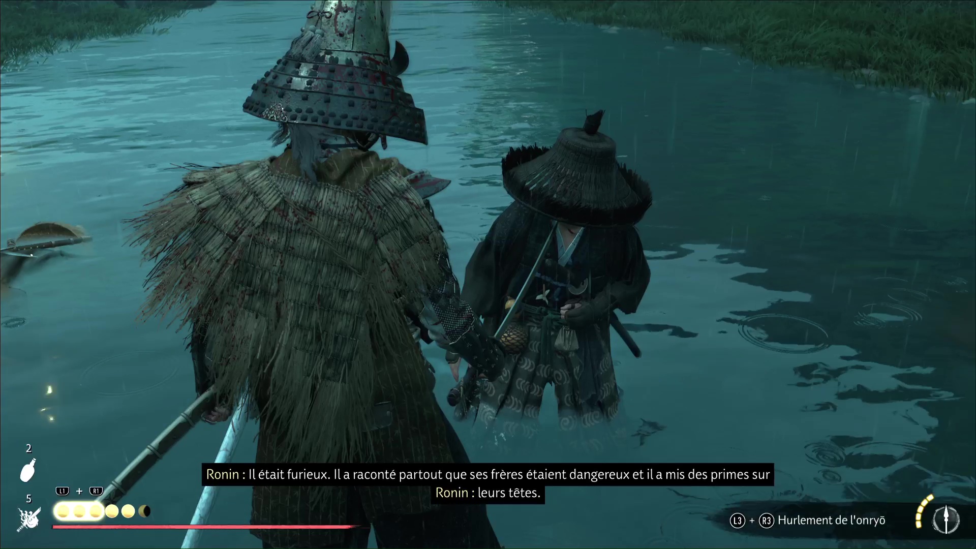 Progressez encore un peu pour arriver à une rivière avec trois ronin dans les parages. Difficile de tous les éliminer d’un coup, donc exécutez un premier ennemi puis débarrassez-vous des deux autres, désormais alertés. Le dernier ennemi en vie sera interrogé par Atsu pour en savoir plus sur le Dernier Frère.