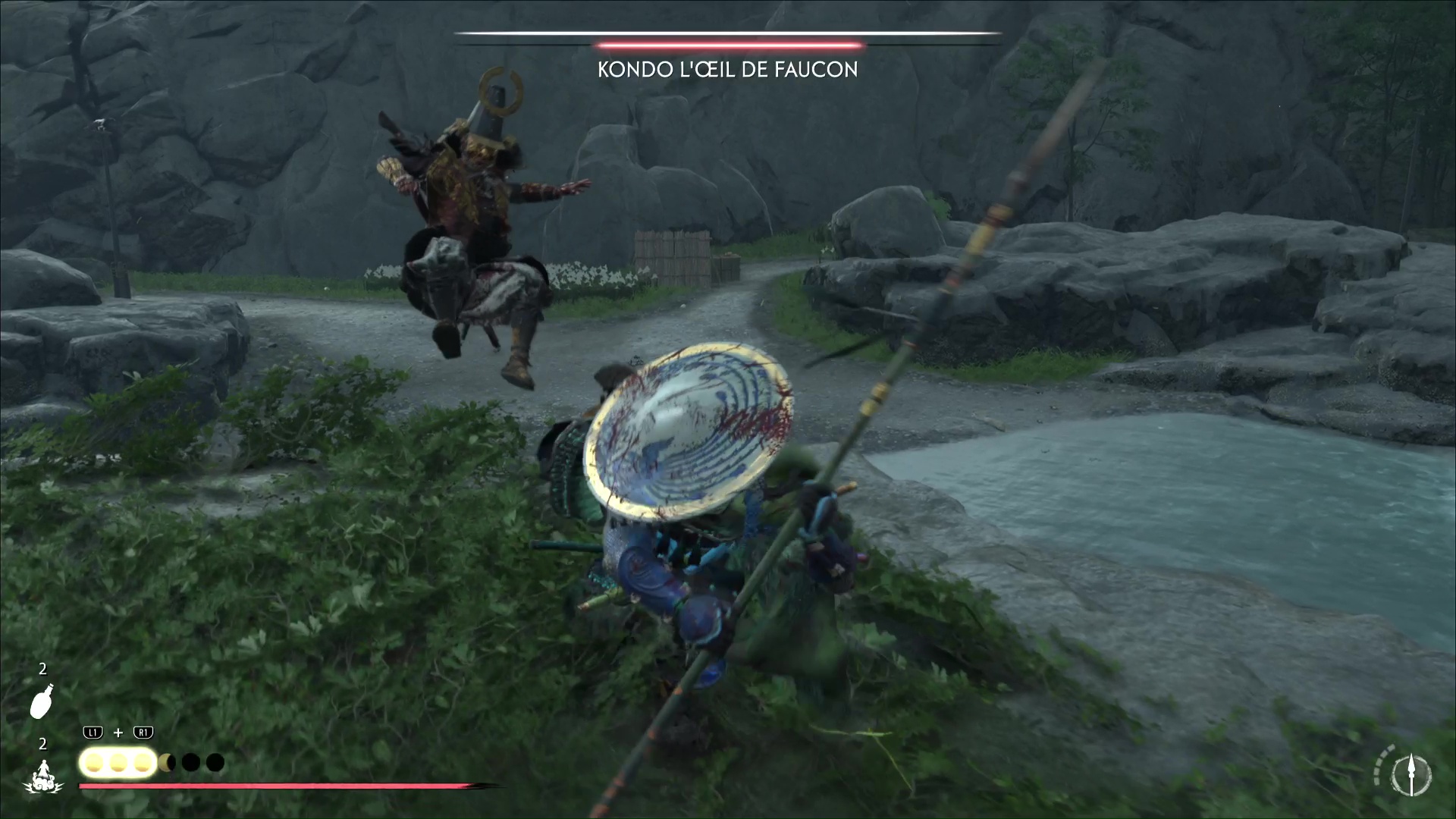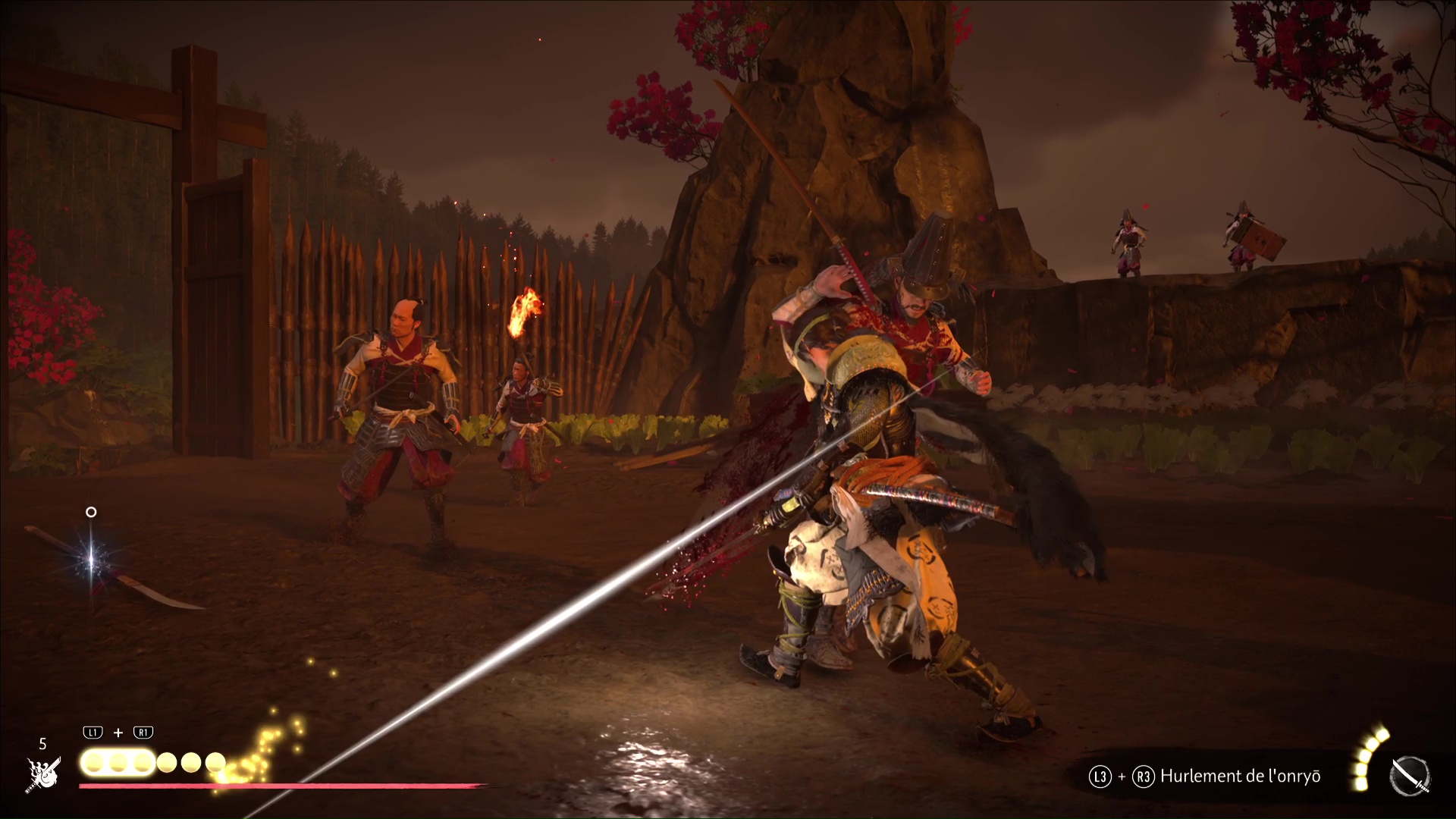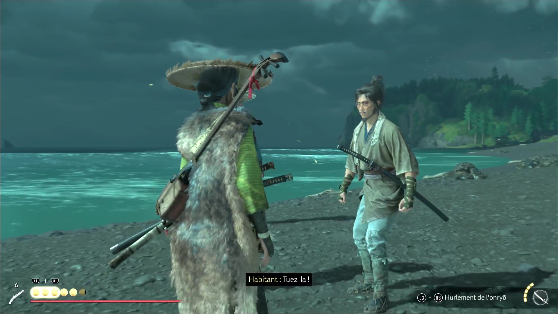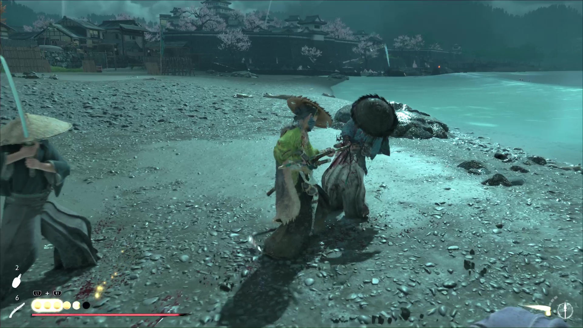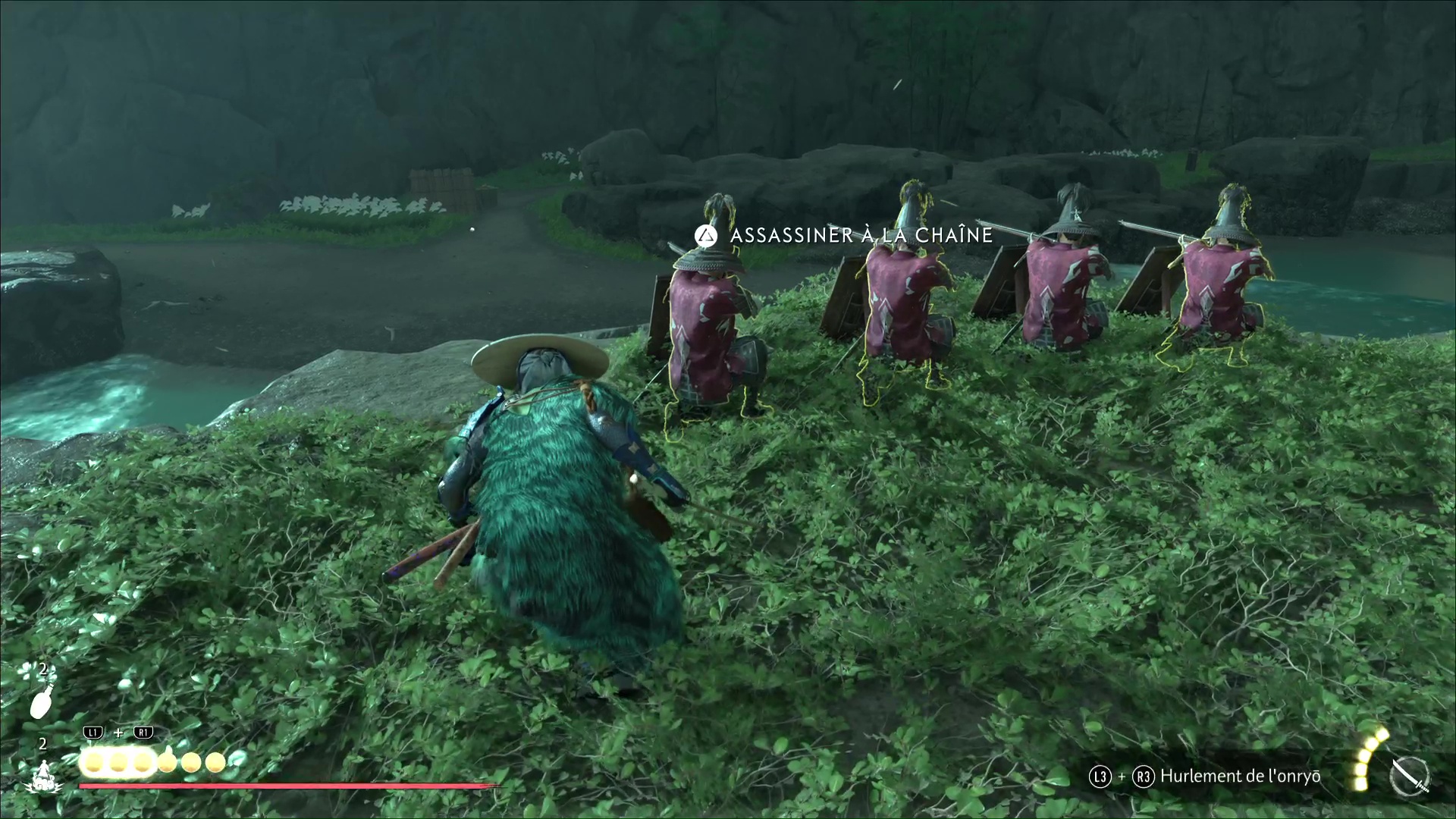 Progressez encore un peu pour arriver à une rivière avec trois ronin dans les parages. Difficile de tous les éliminer d’un coup, donc exécutez un premier ennemi puis débarrassez-vous des deux autres, désormais alertés. Le dernier ennemi en vie sera interrogé par Atsu pour en savoir plus sur le Dernier Frère.